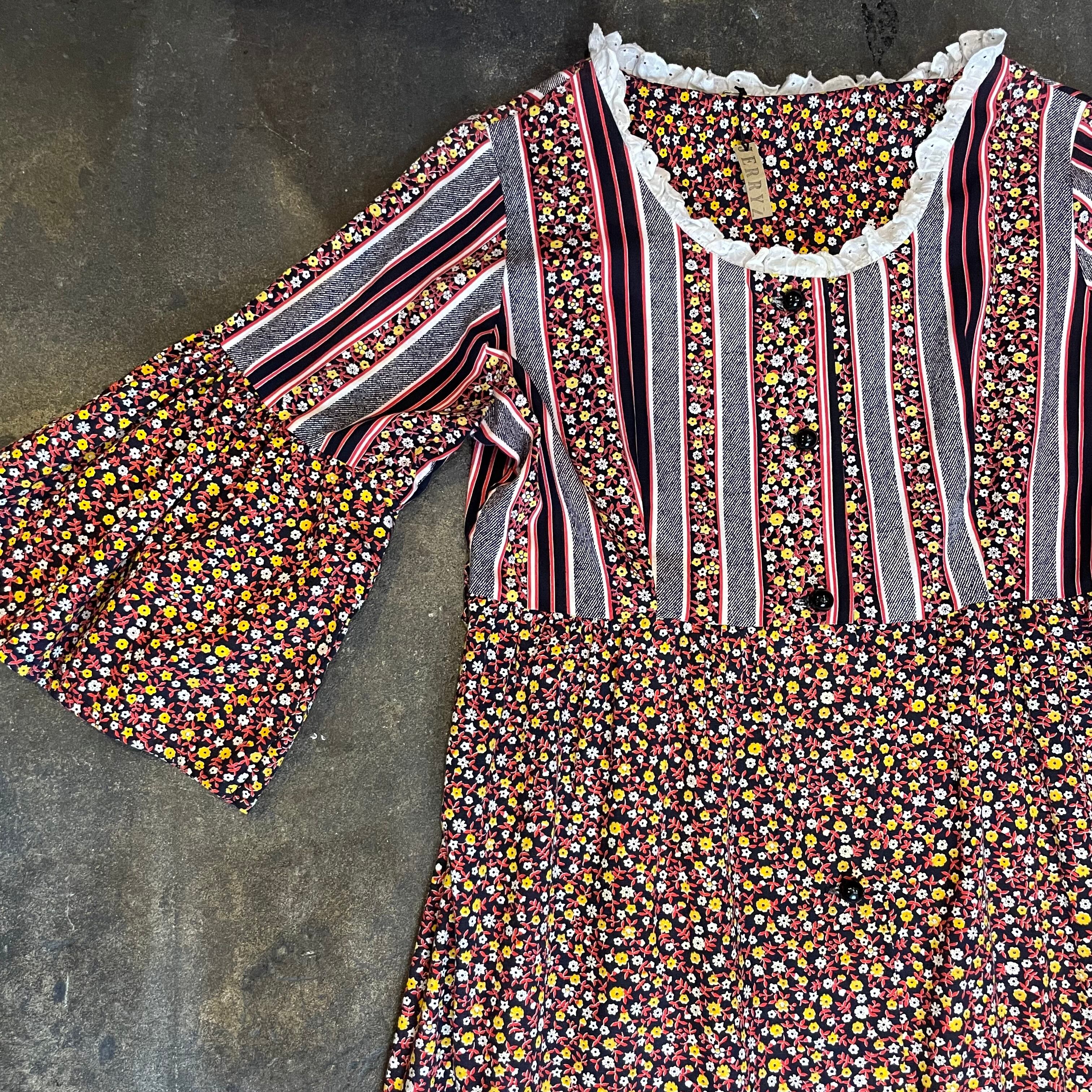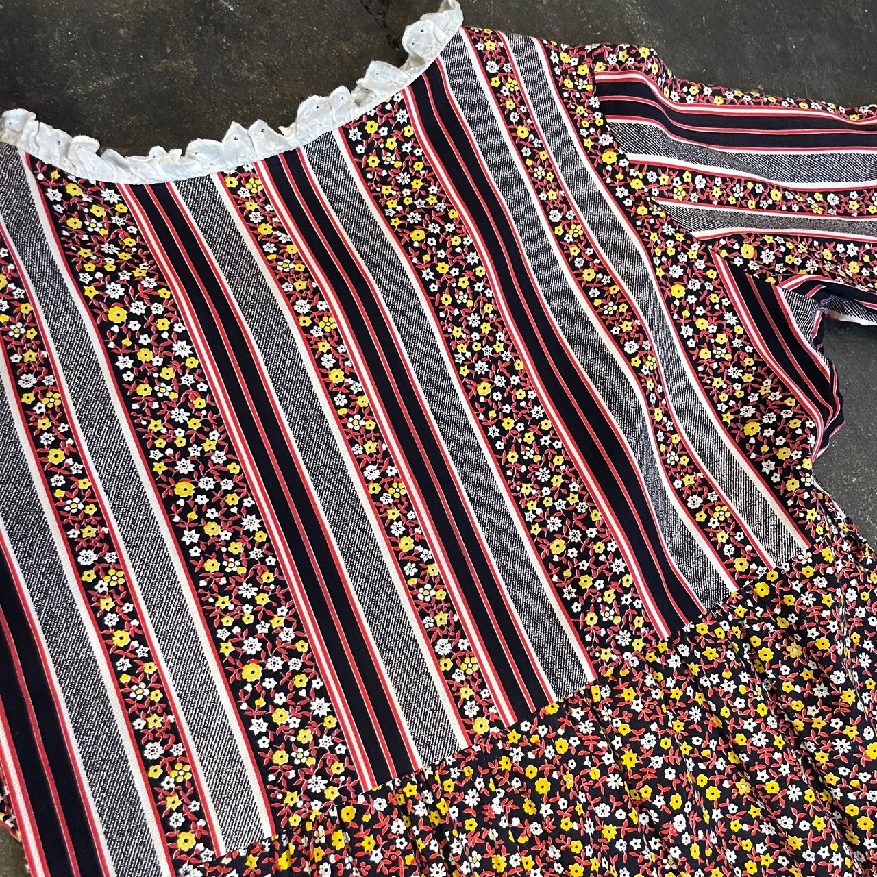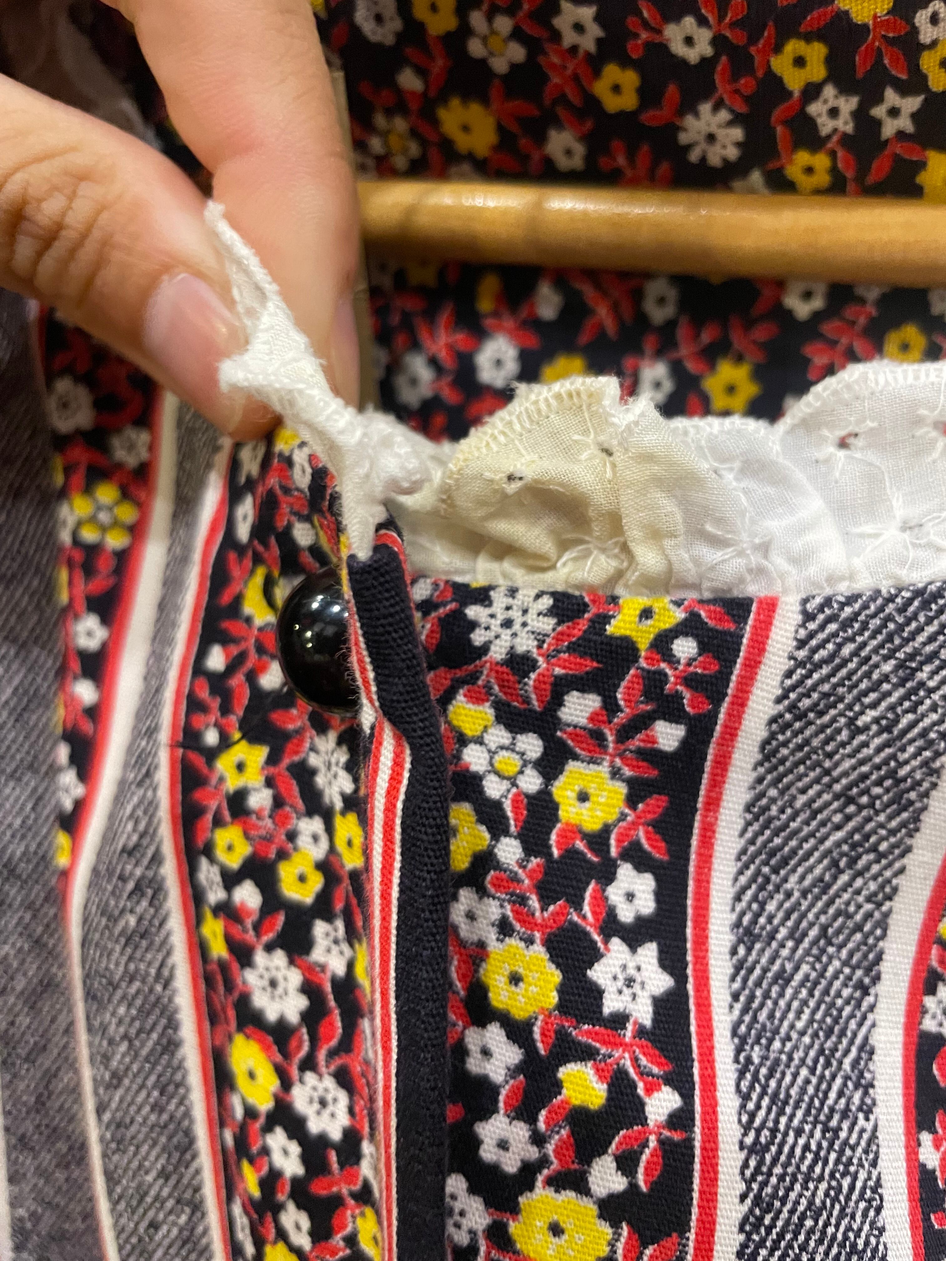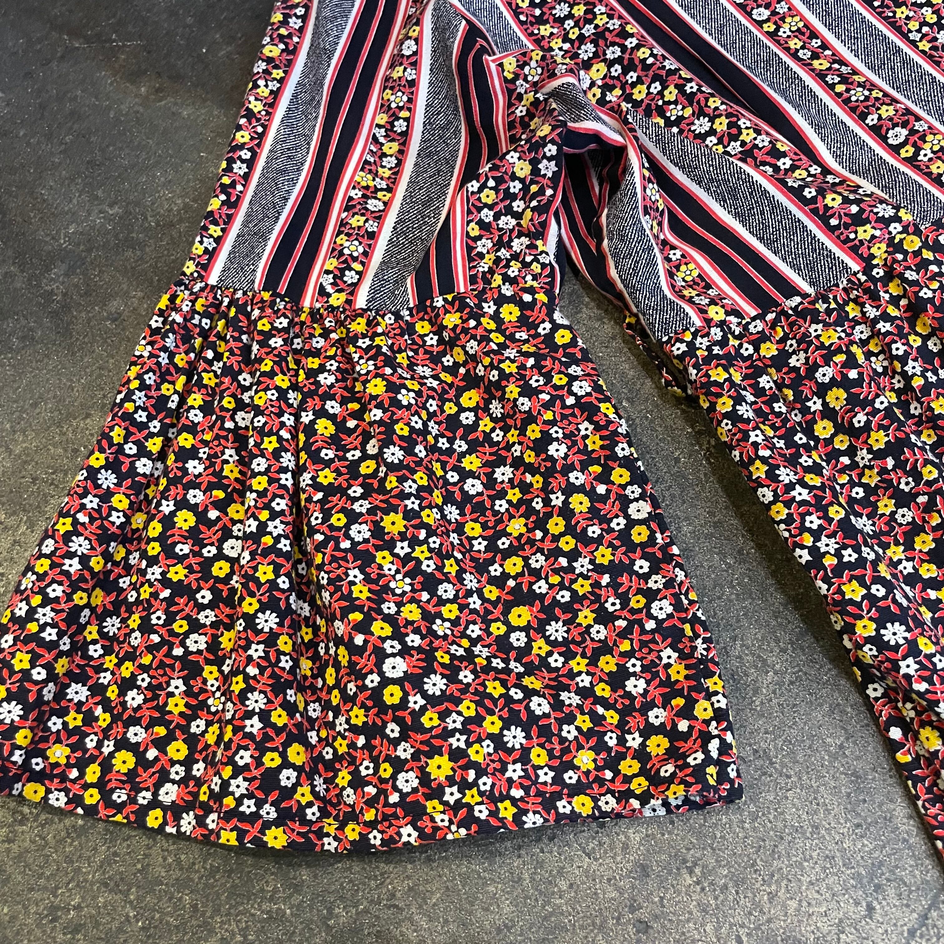 暗めのネイビー地に小花柄とストライプの切り替えがとてもかわいい70年代頃のワンピースです。