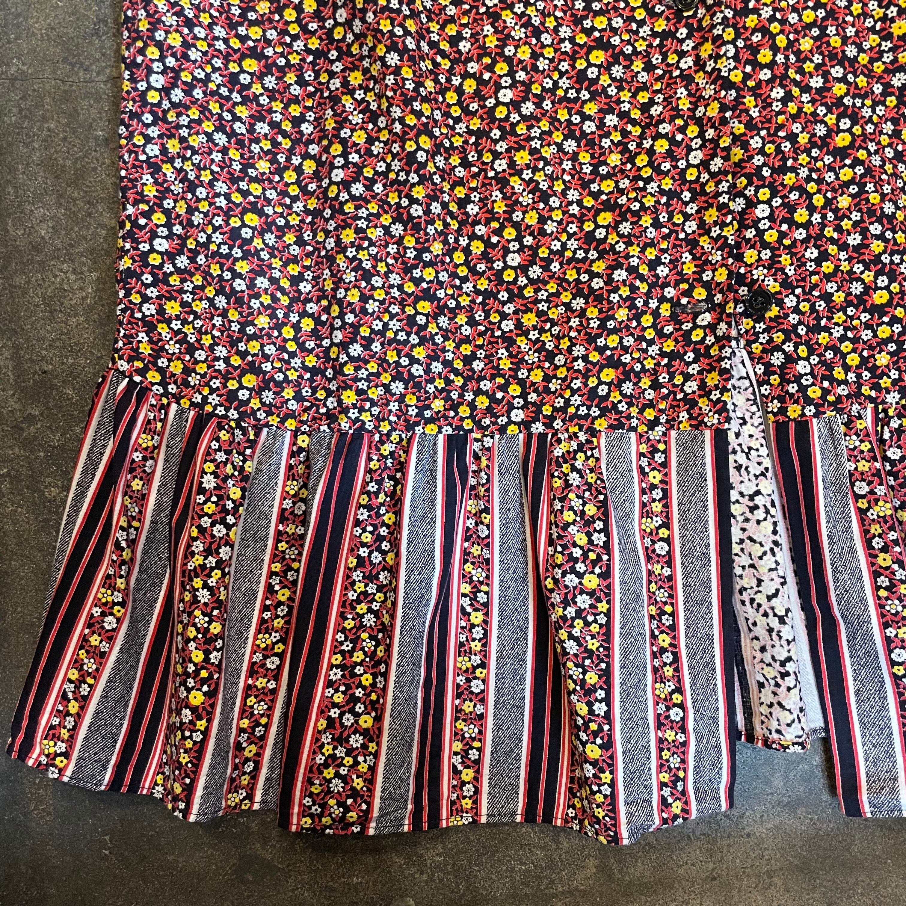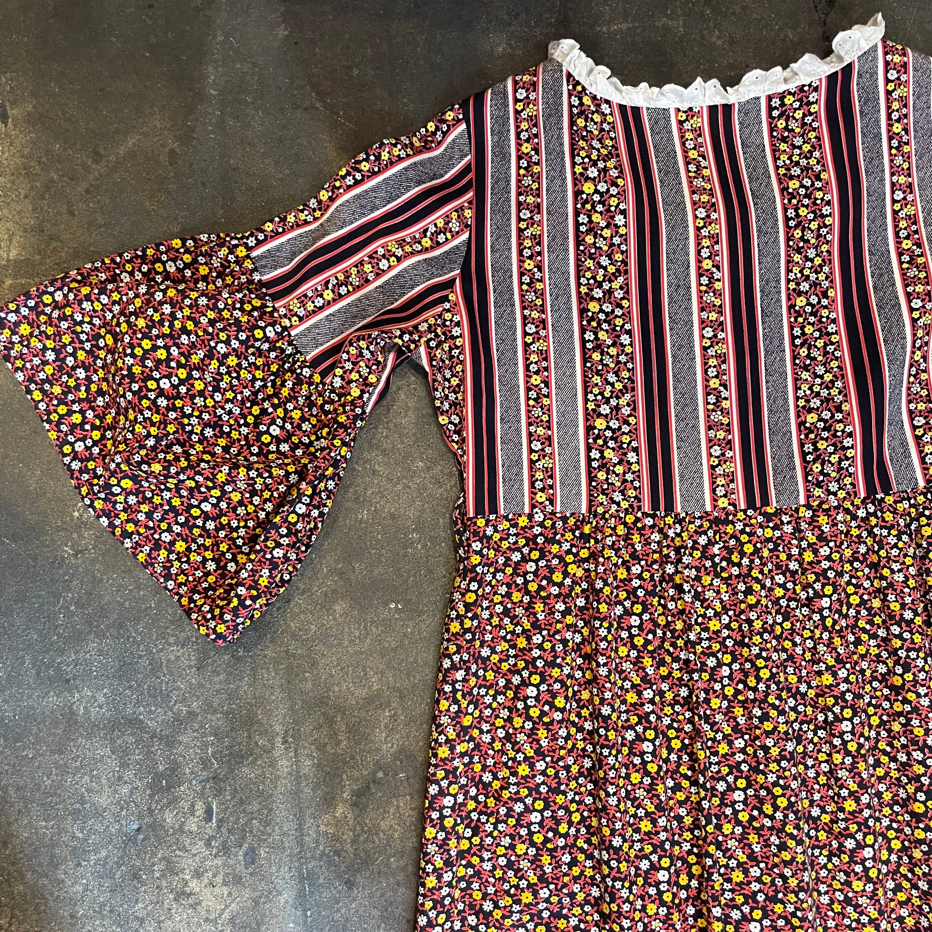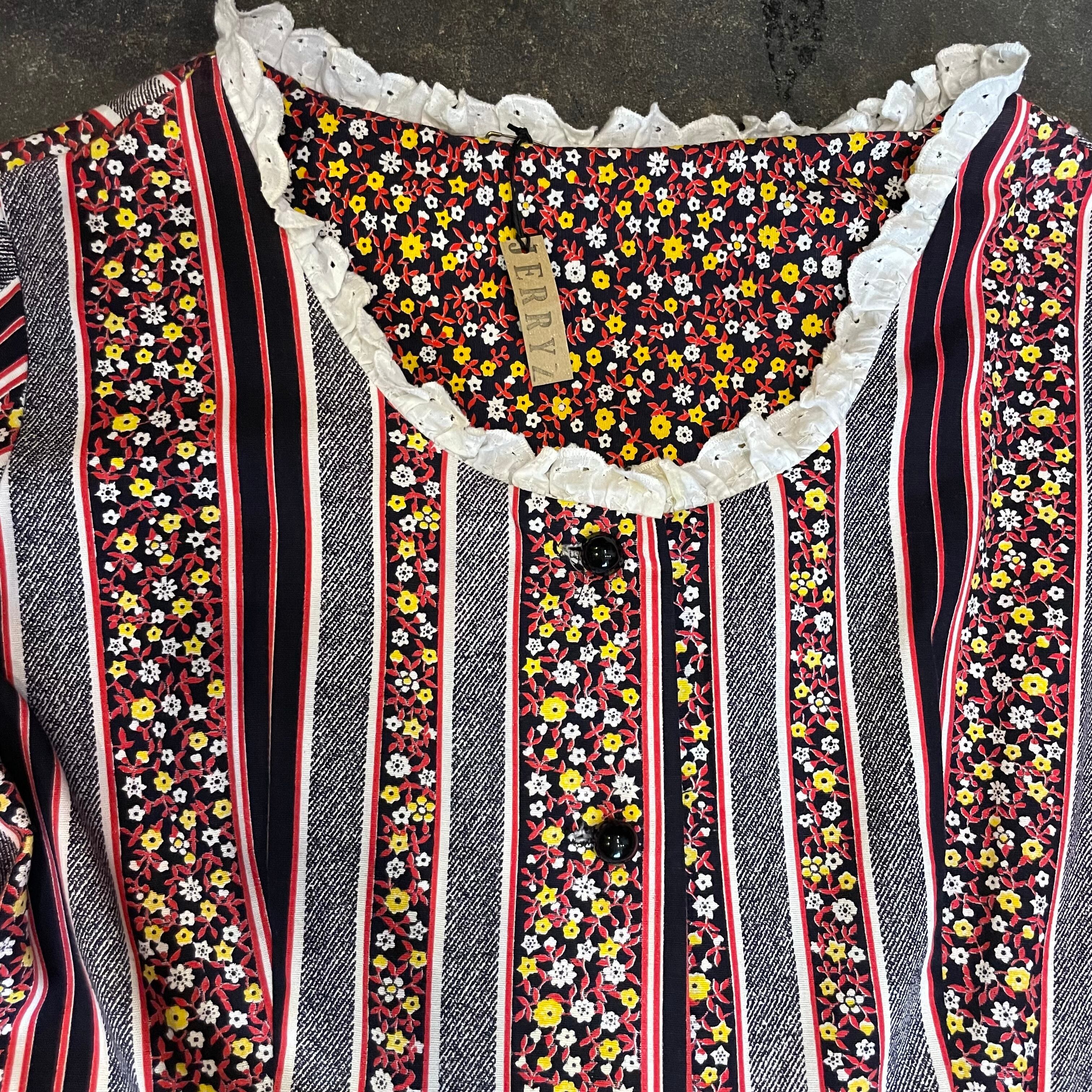 暗めのネイビー地に小花柄とストライプの切り替えがとてもかわいい70年代頃のワンピースです。
