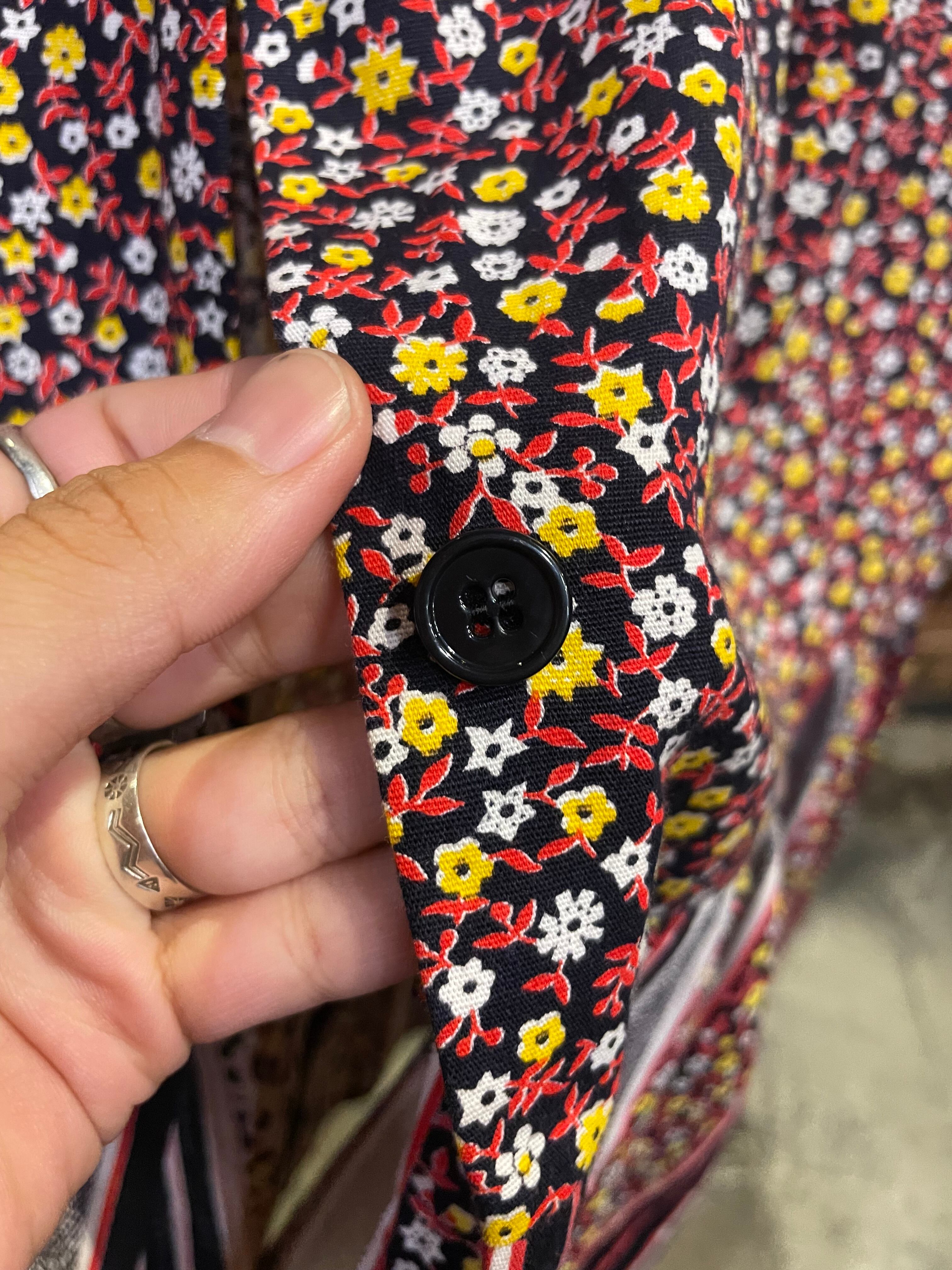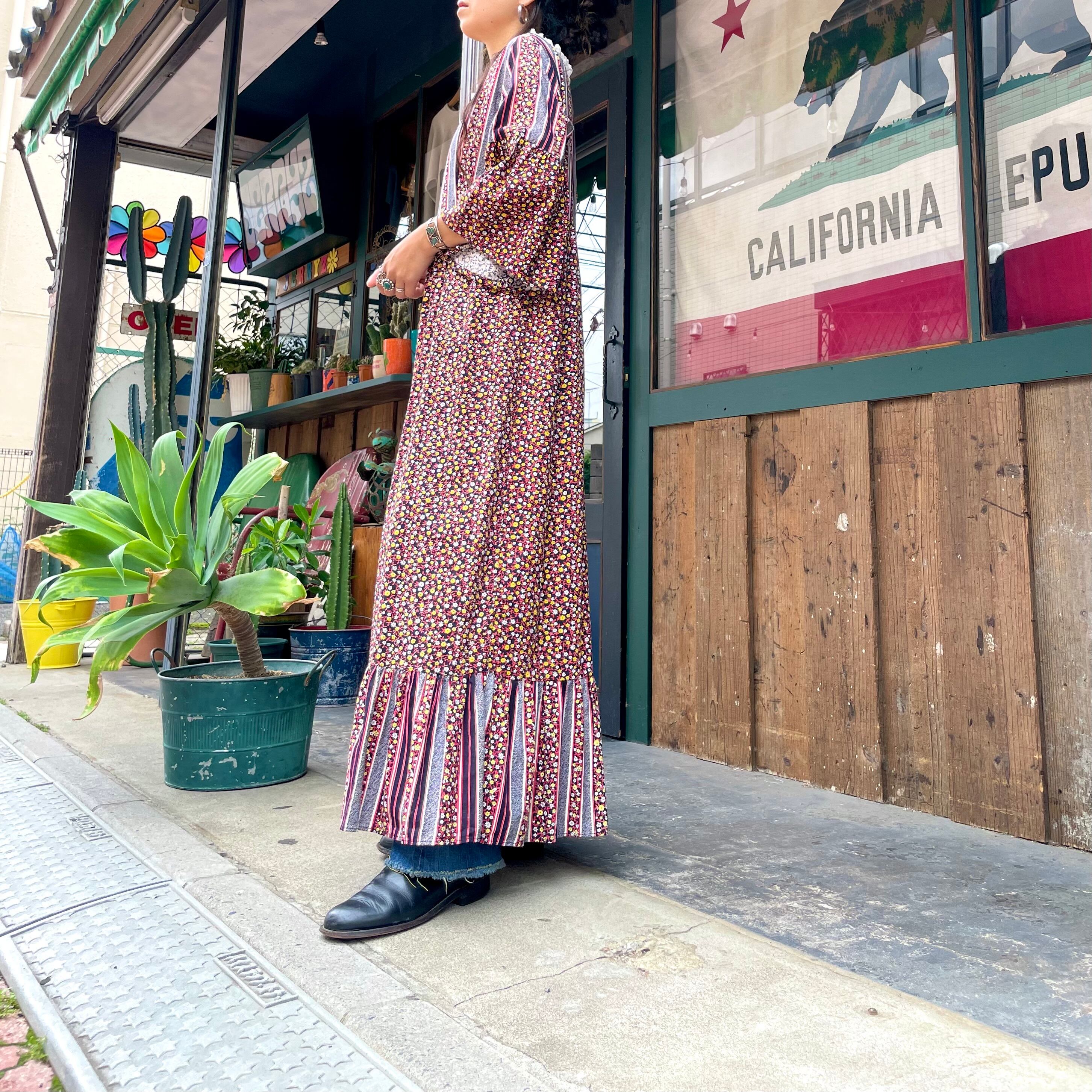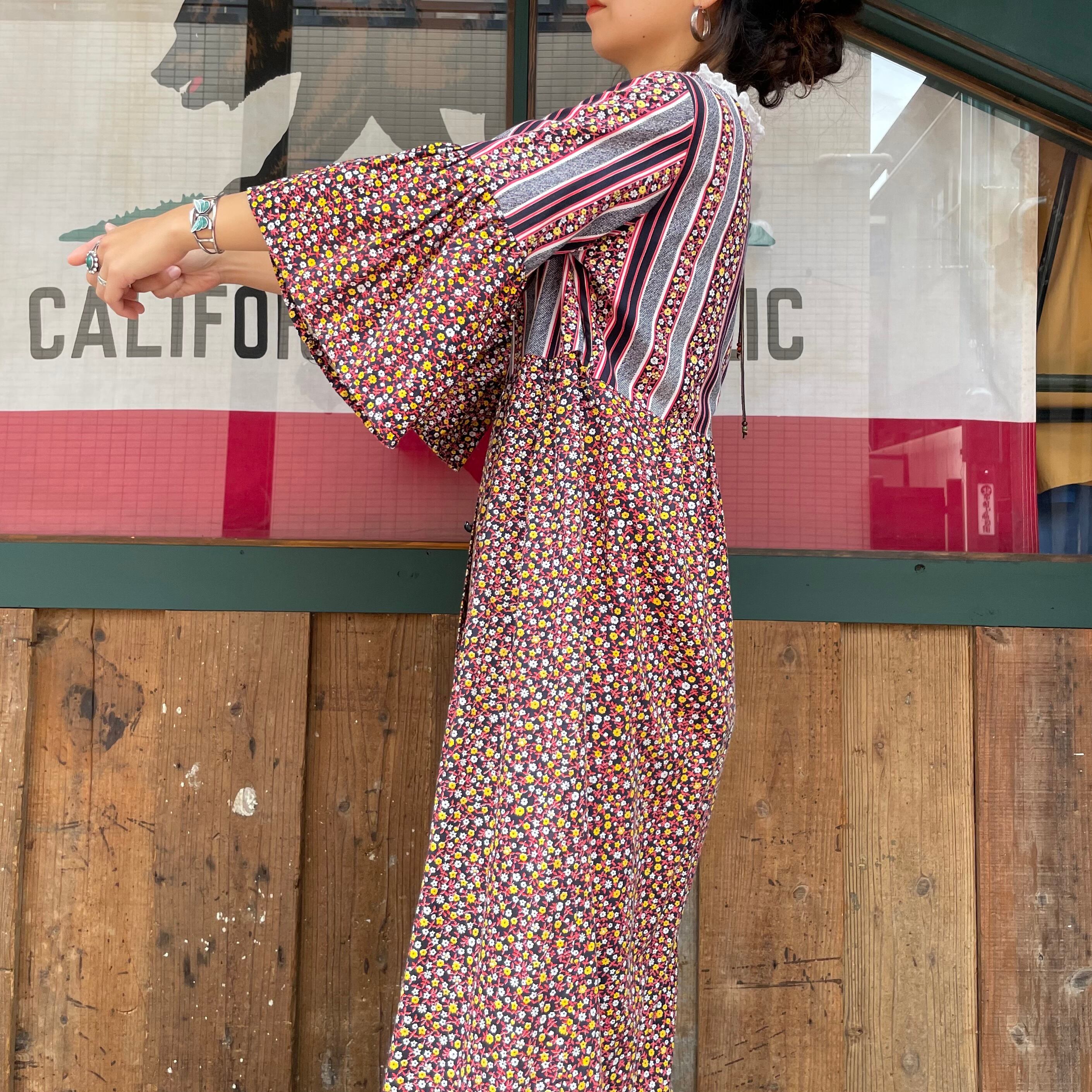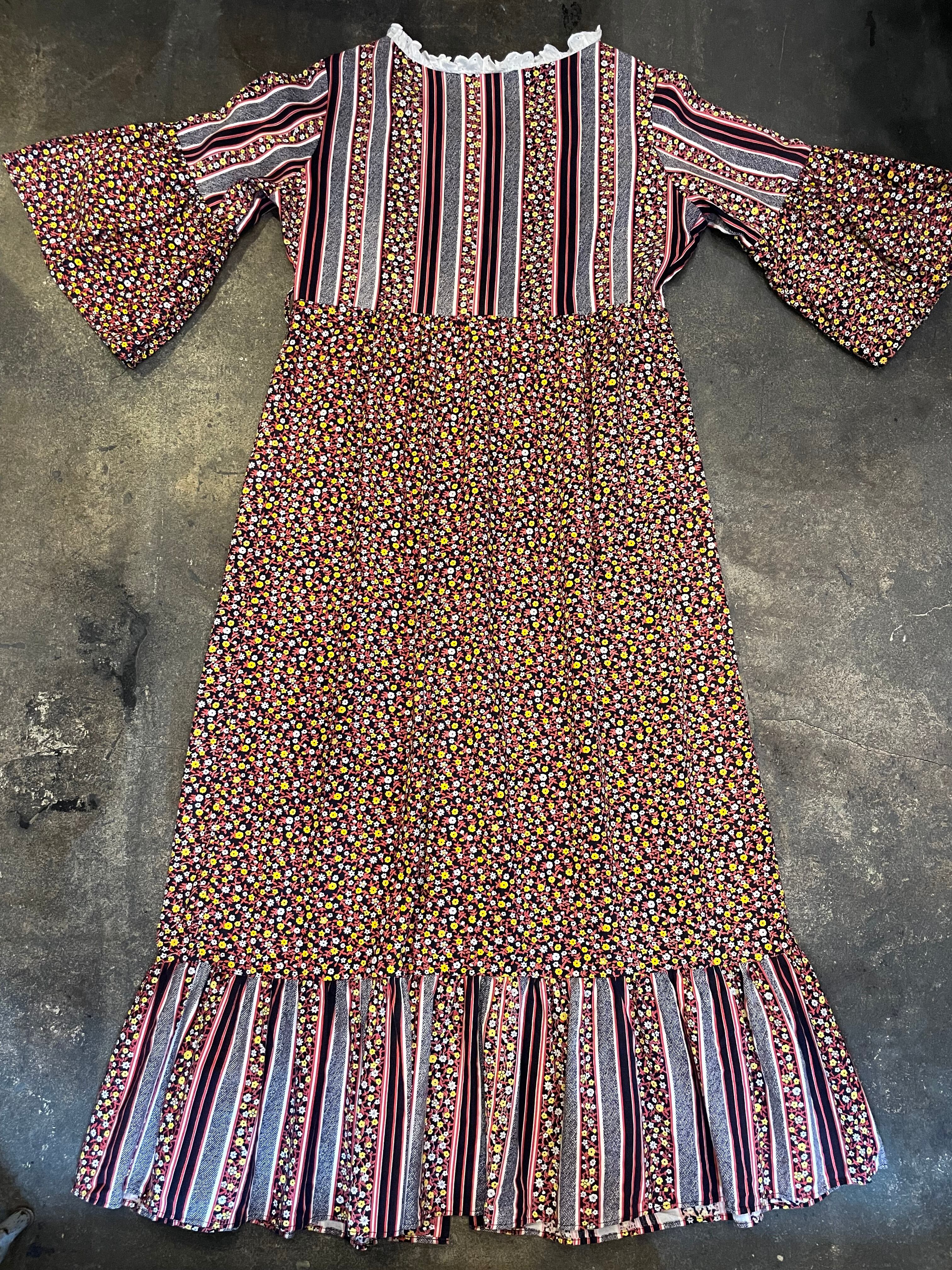 暗めのネイビー地に小花柄とストライプの切り替えがとてもかわいい70年代頃のワンピースです。