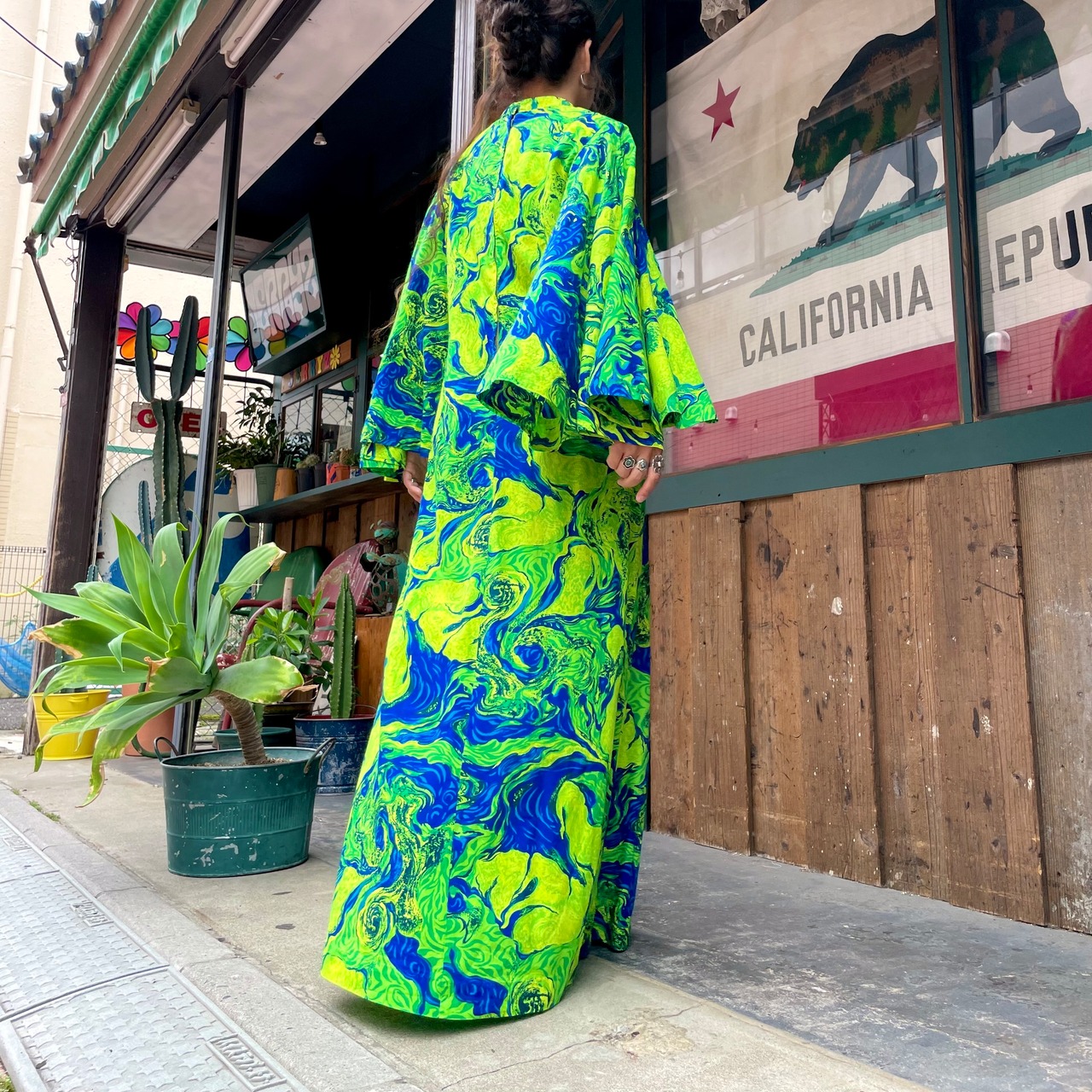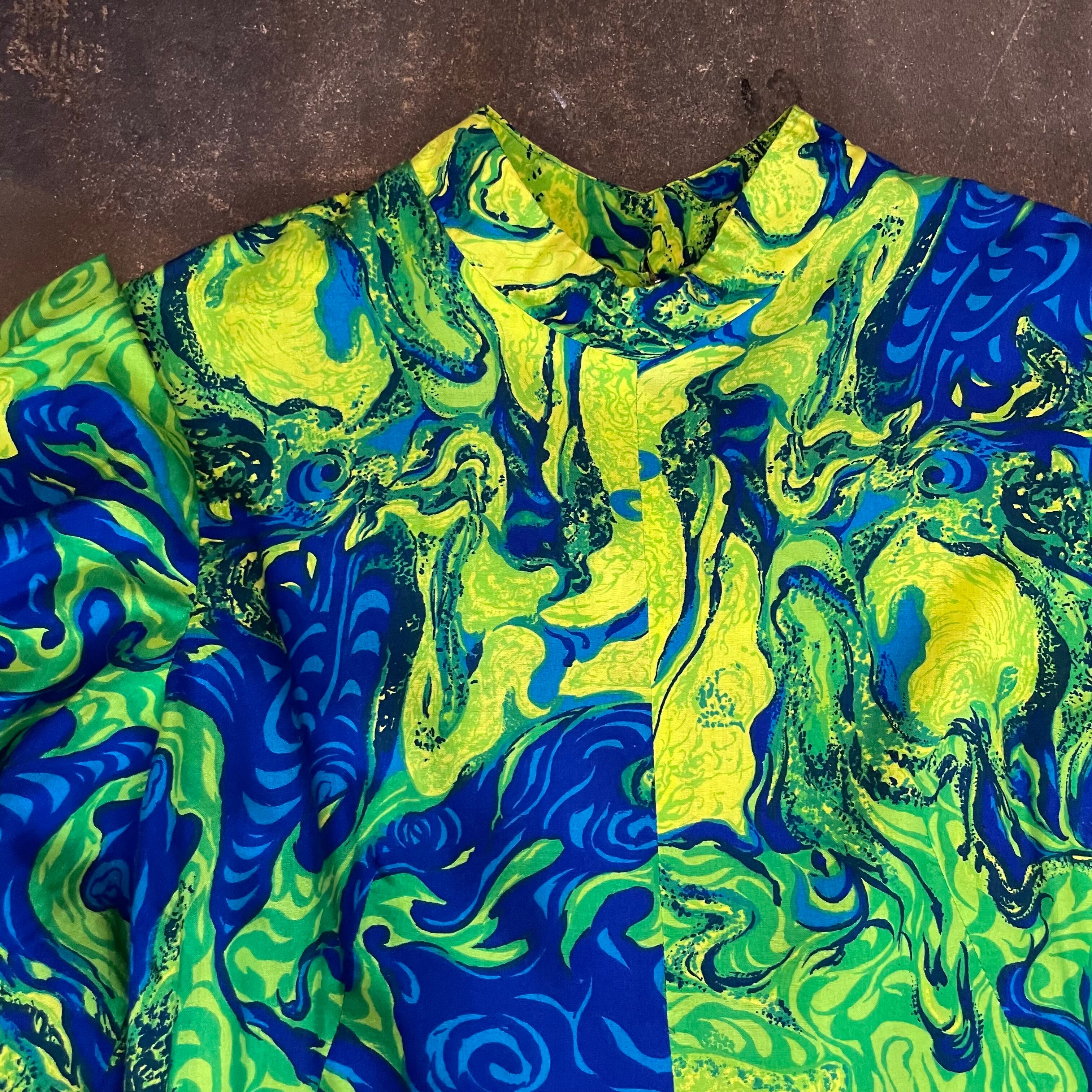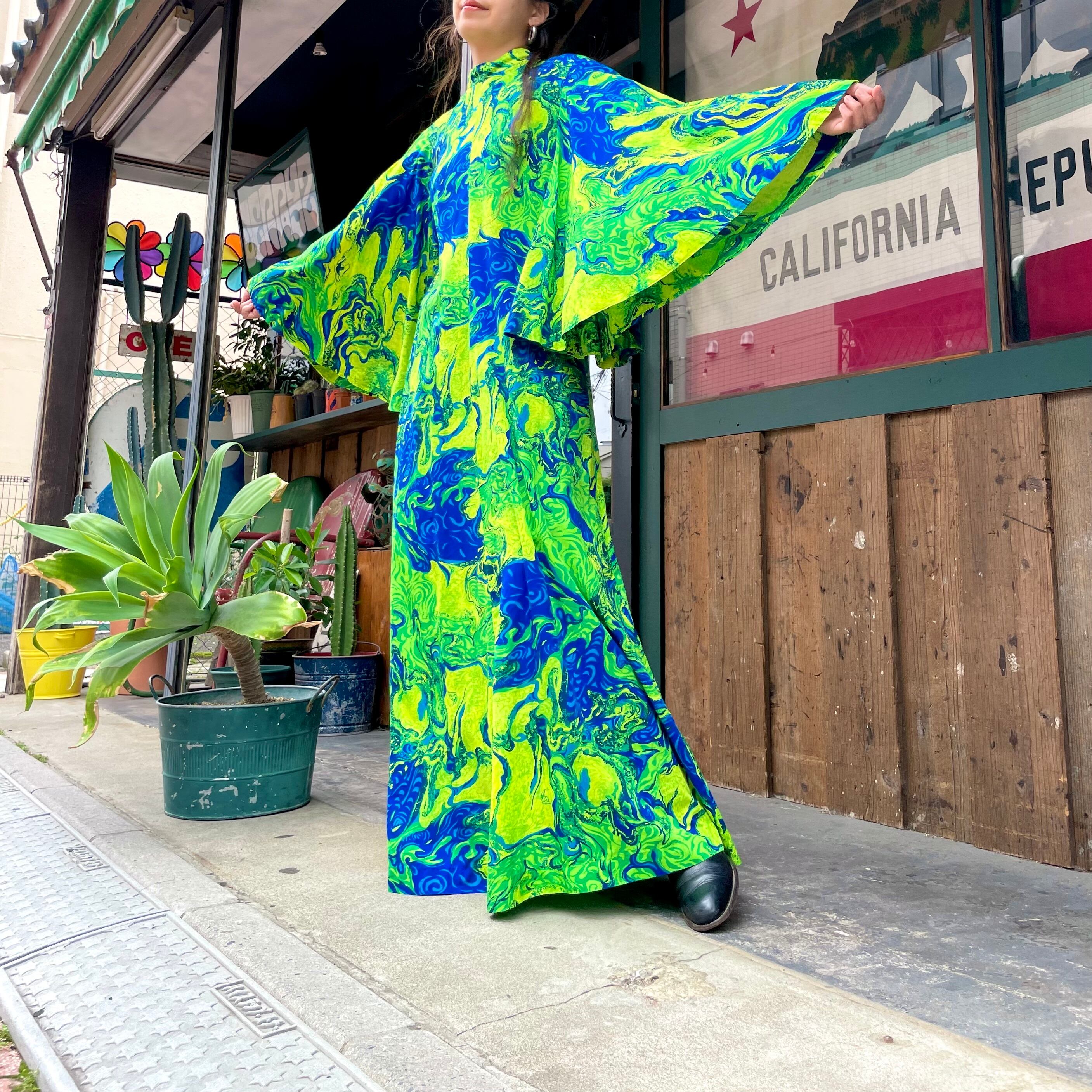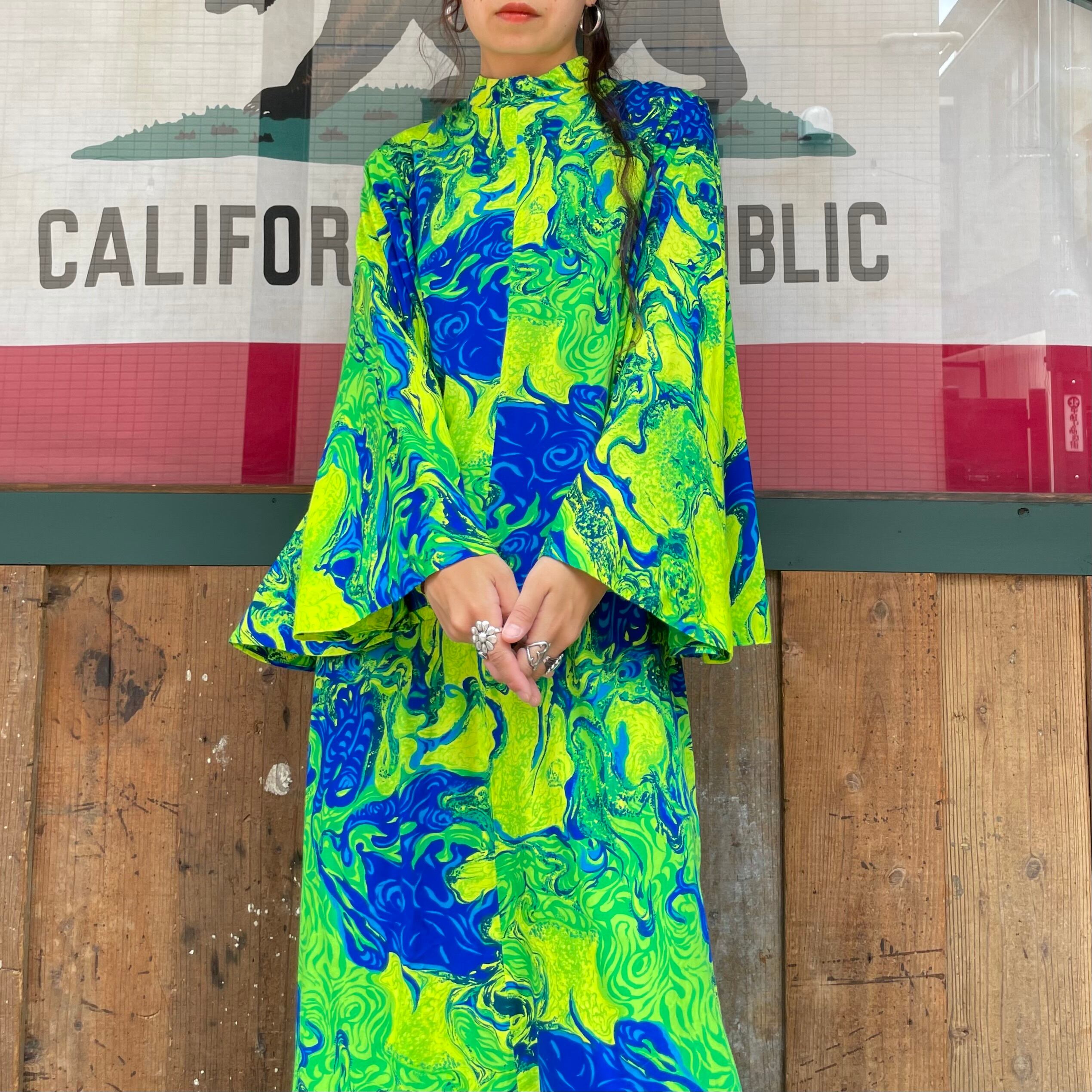ほとばしるエネルギーを感じるような、サイケデリックなマーブル柄がとてもかっこいい60〜70年代頃のワンピースです。