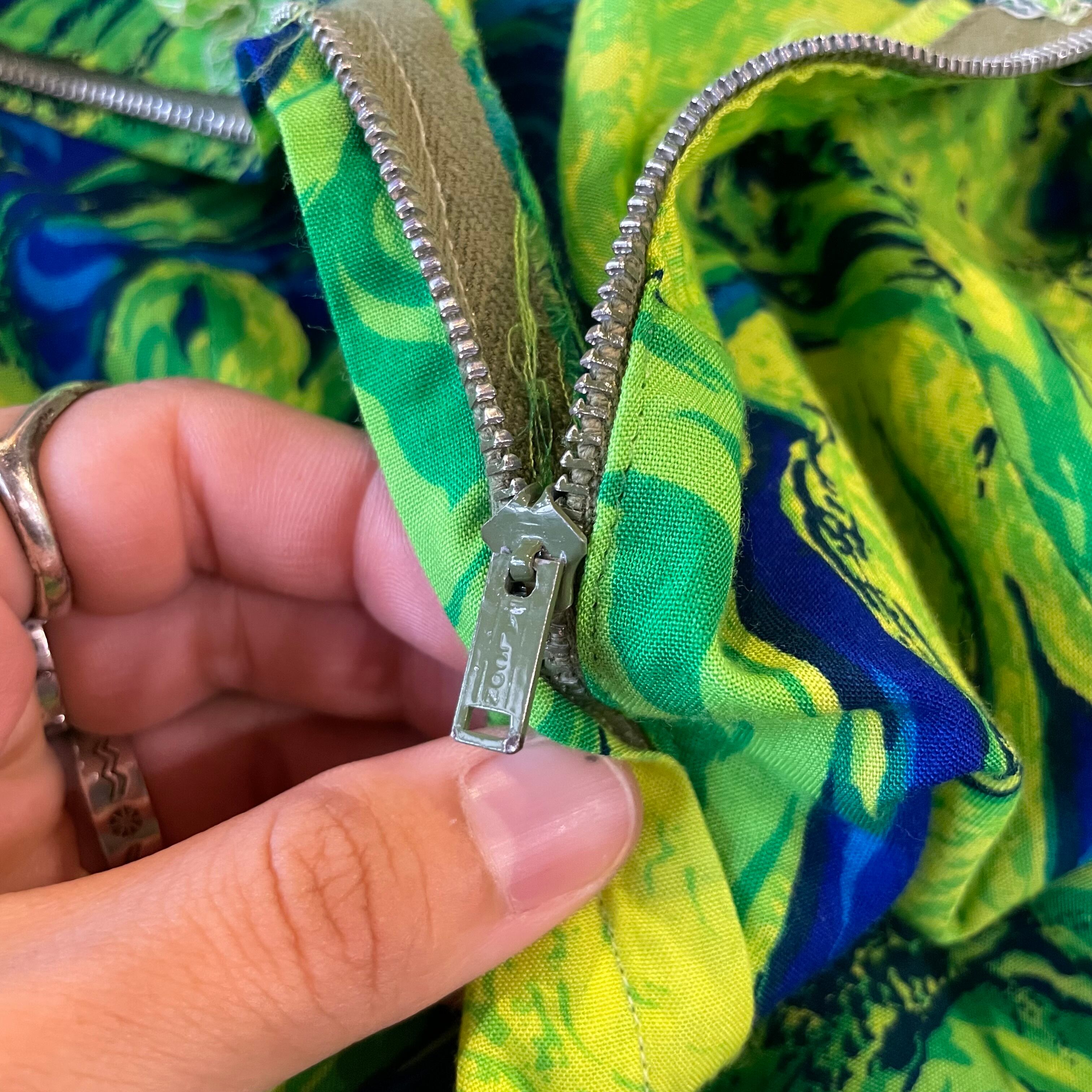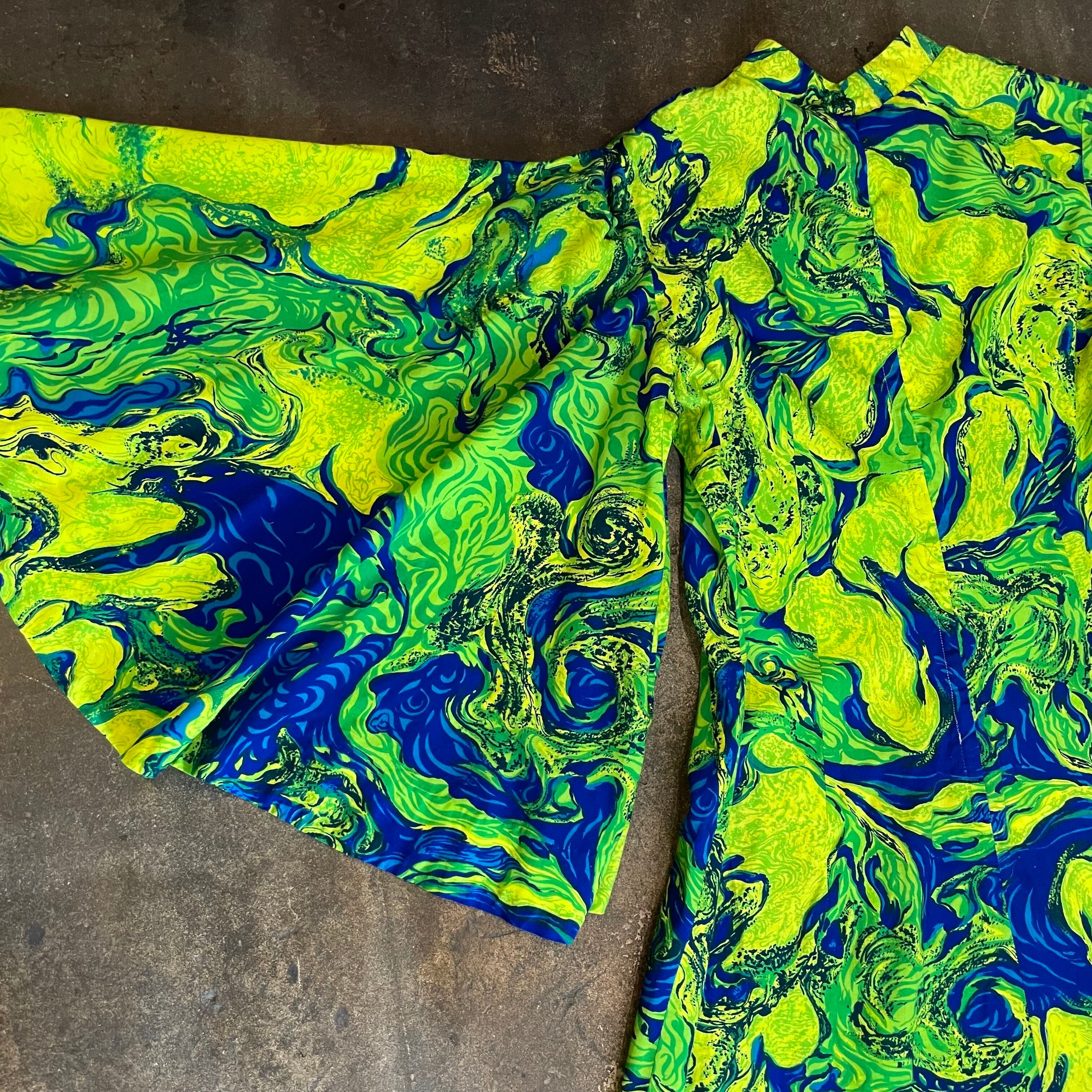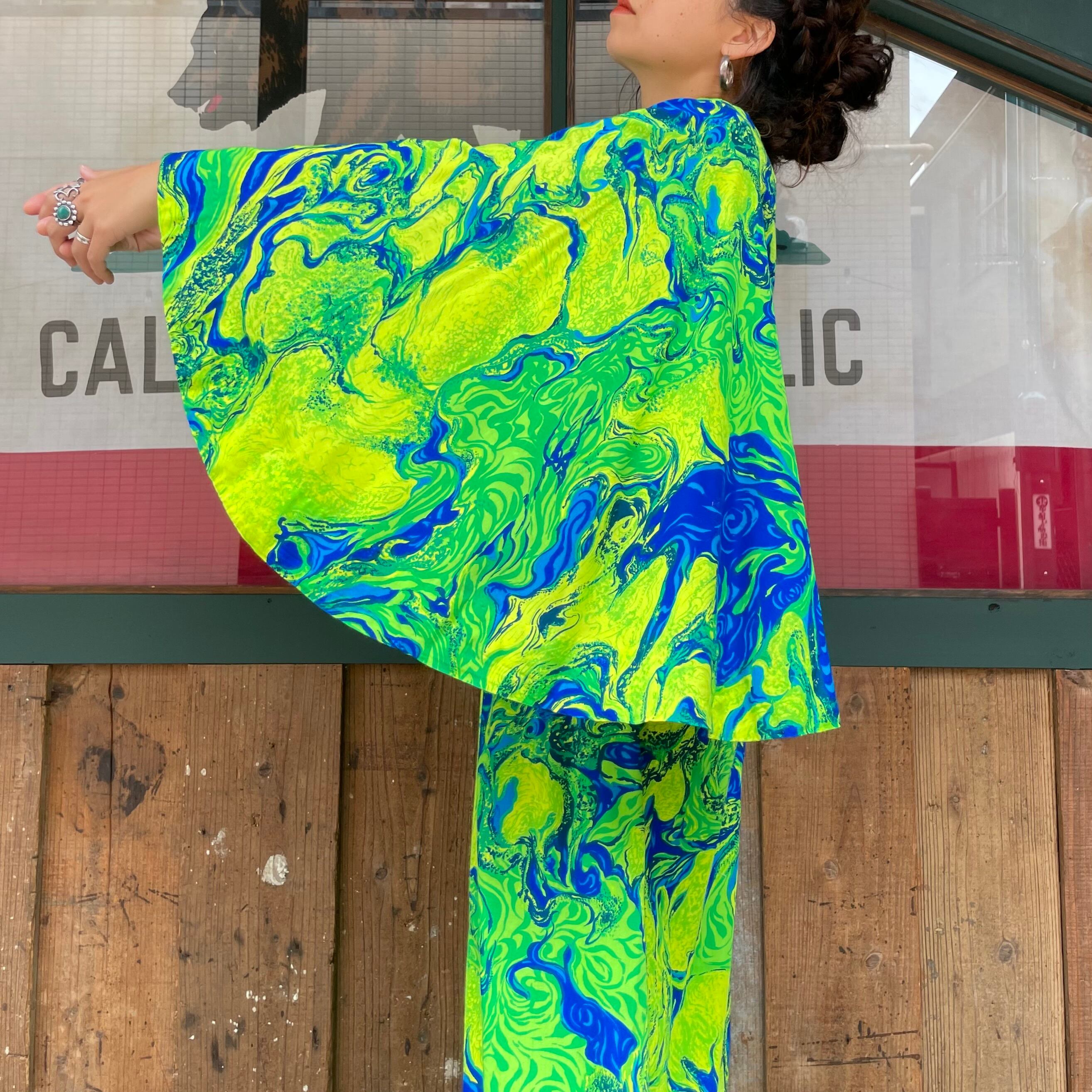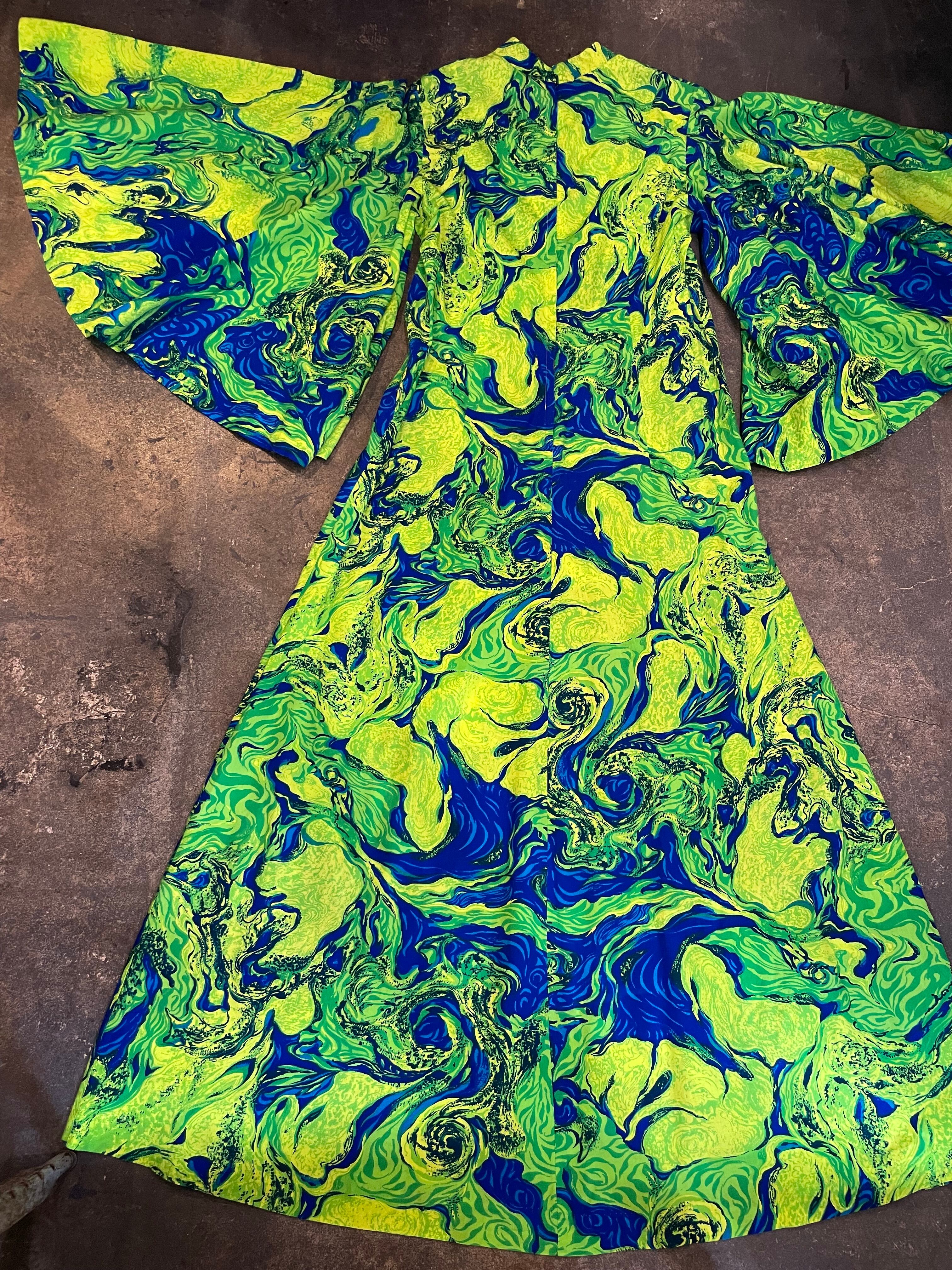 ほとばしるエネルギーを感じるような、サイケデリックなマーブル柄がとてもかっこいい60〜70年代頃のワンピースです。