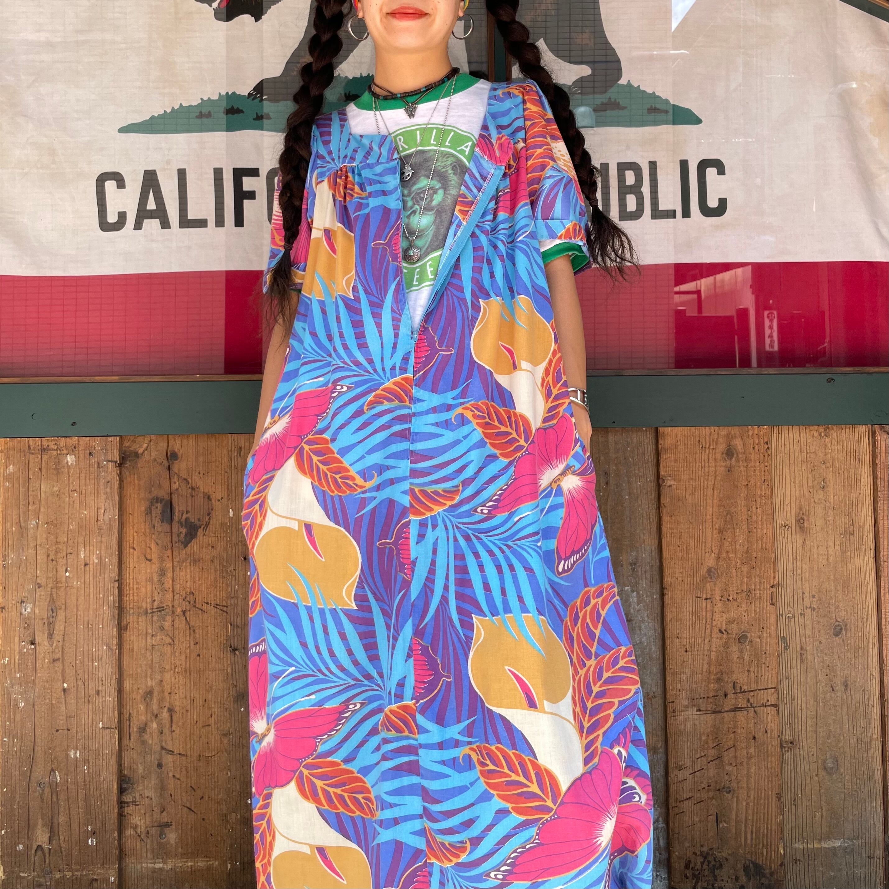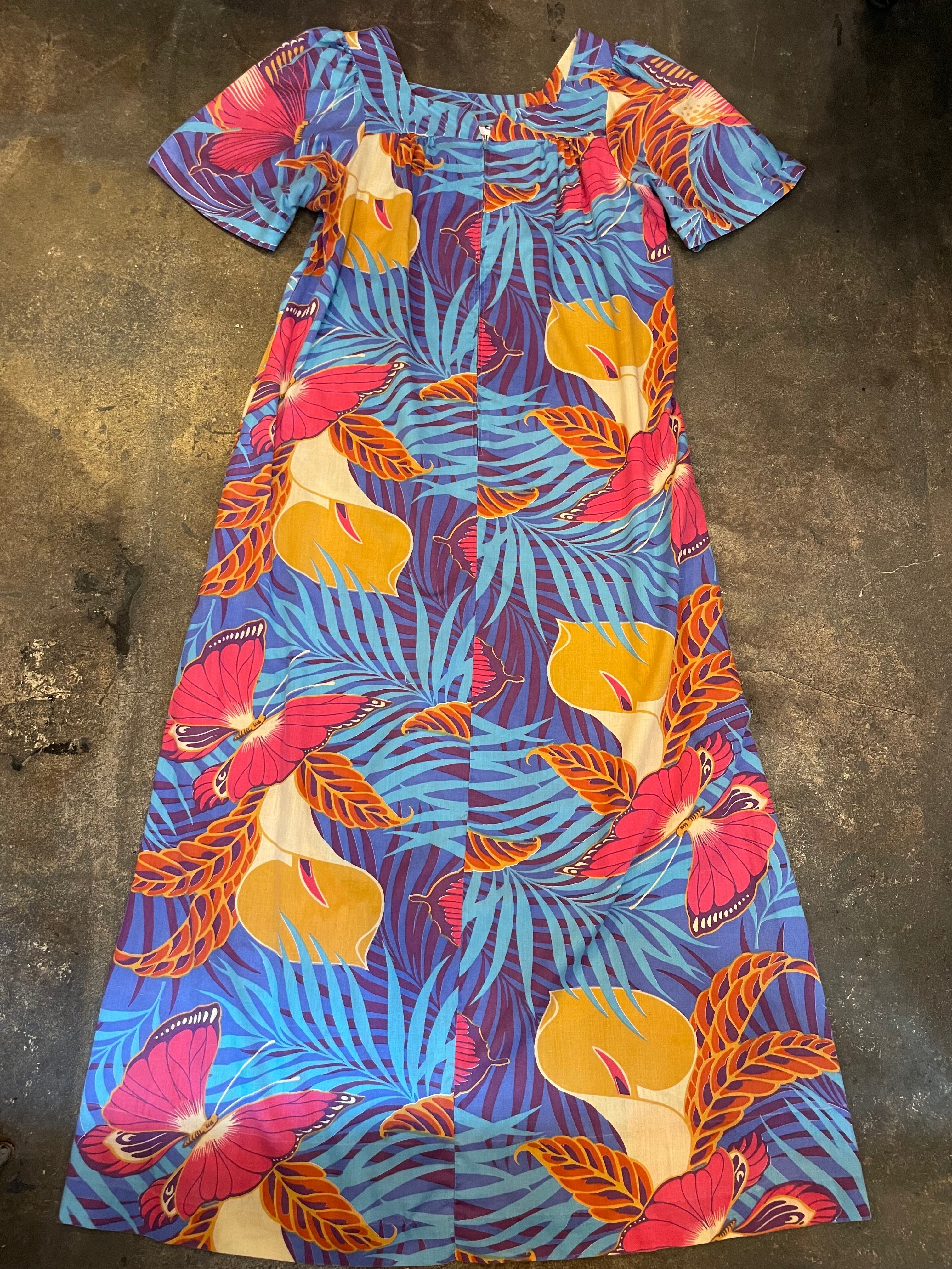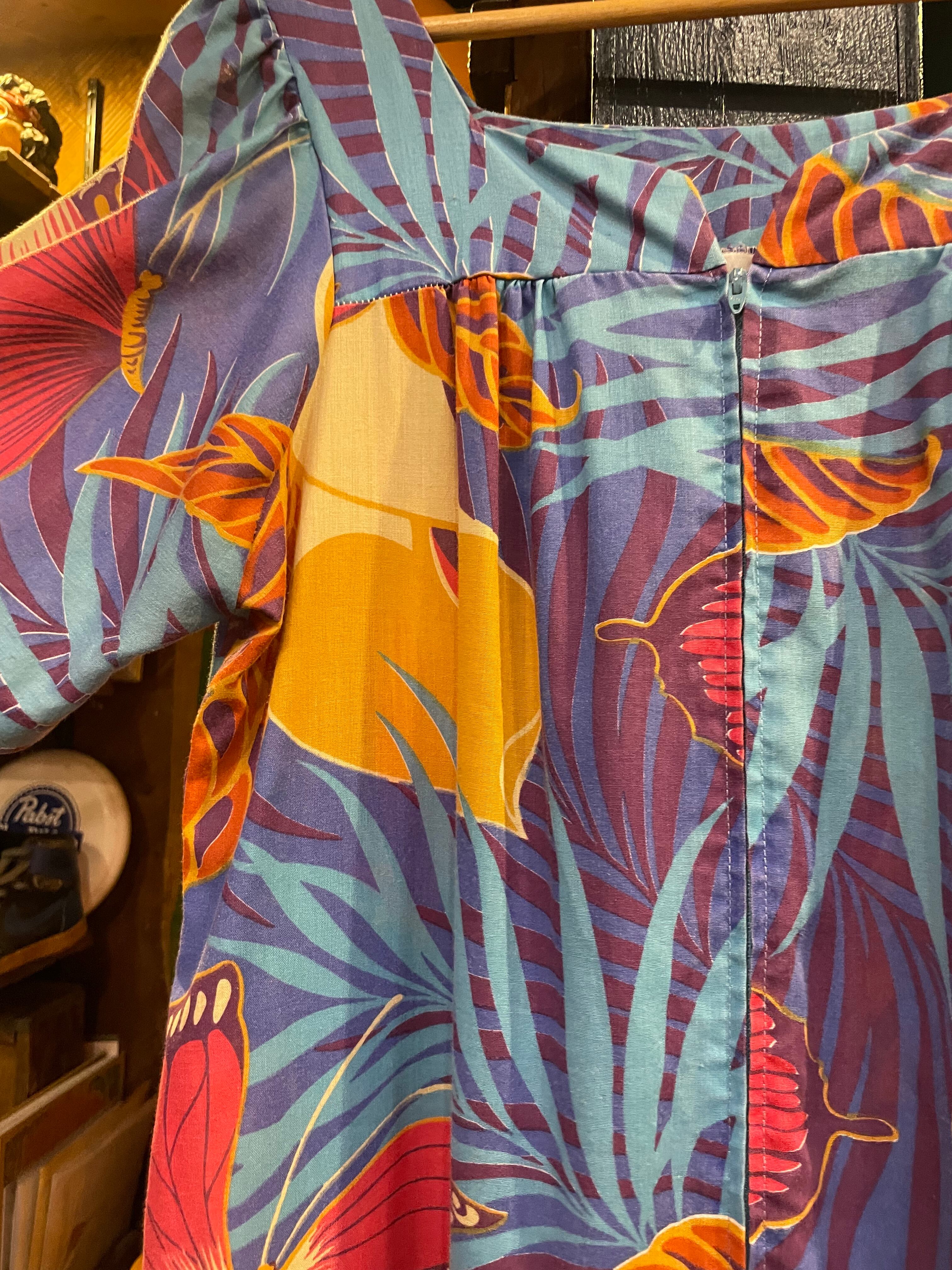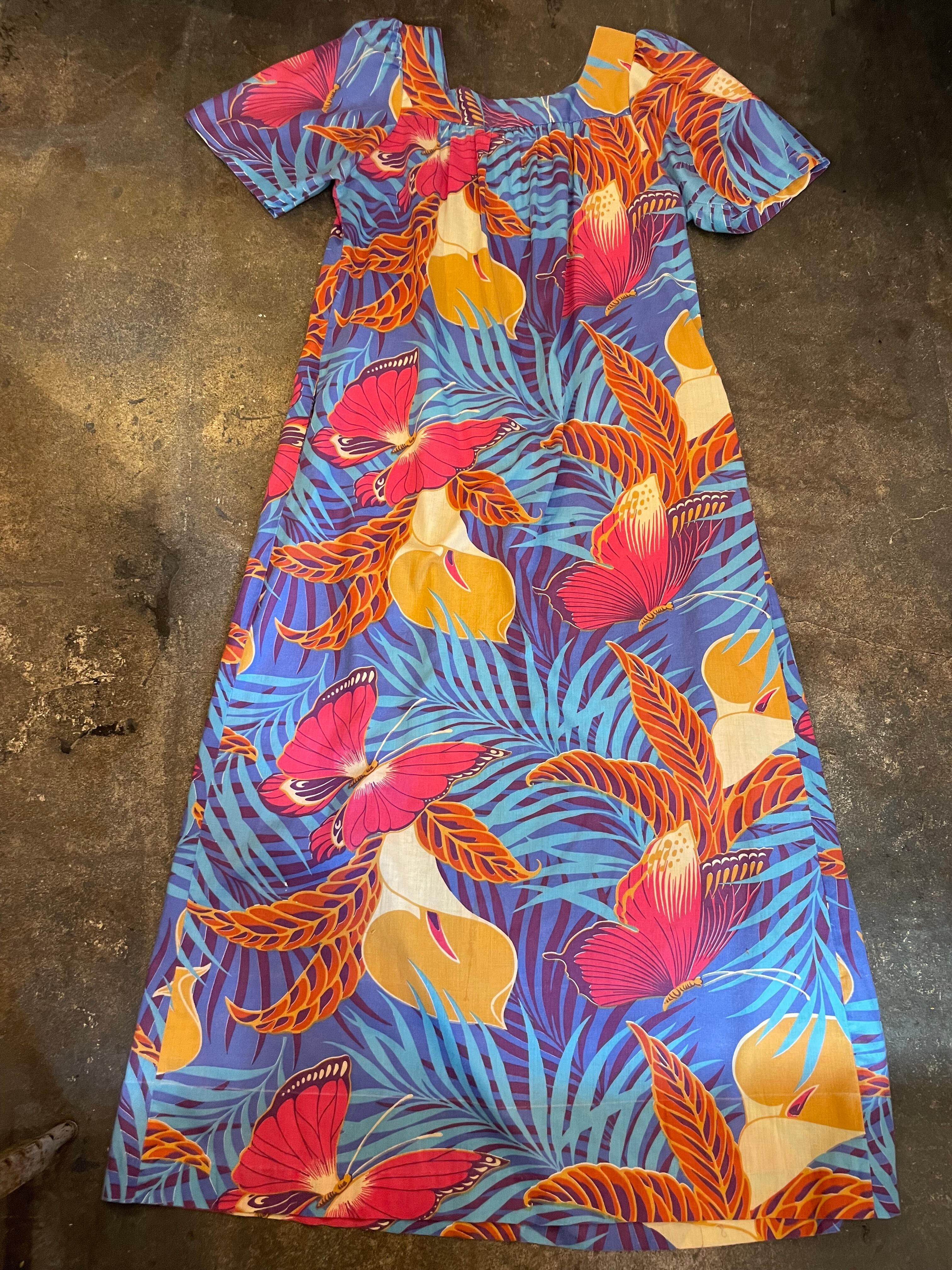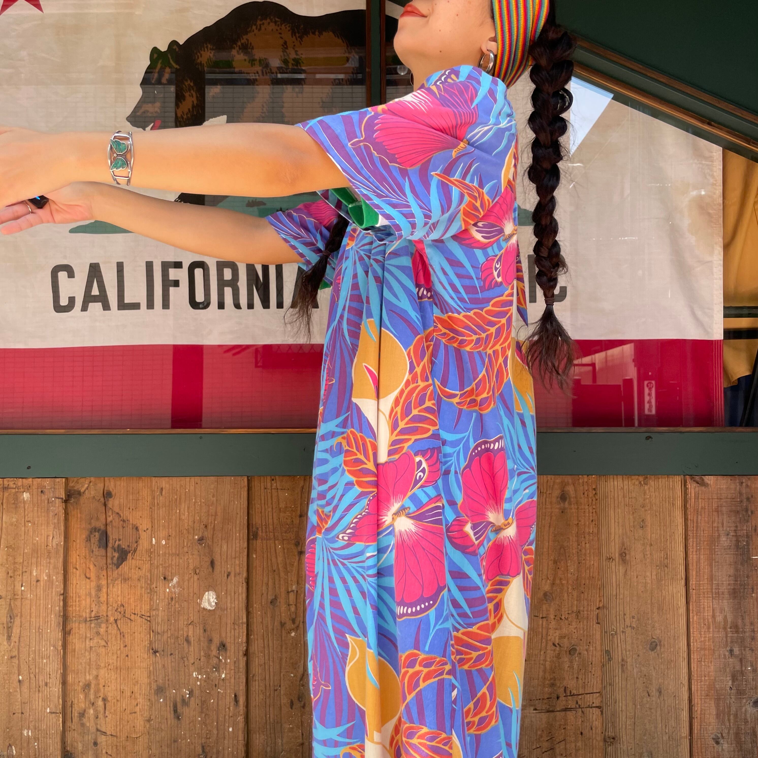 南国なムード漂う模様や色合わせが素敵なワンピースです。シダ植物?やカラーが咲いていて、大きな蝶々が飛んでいてとてもかわいいです。