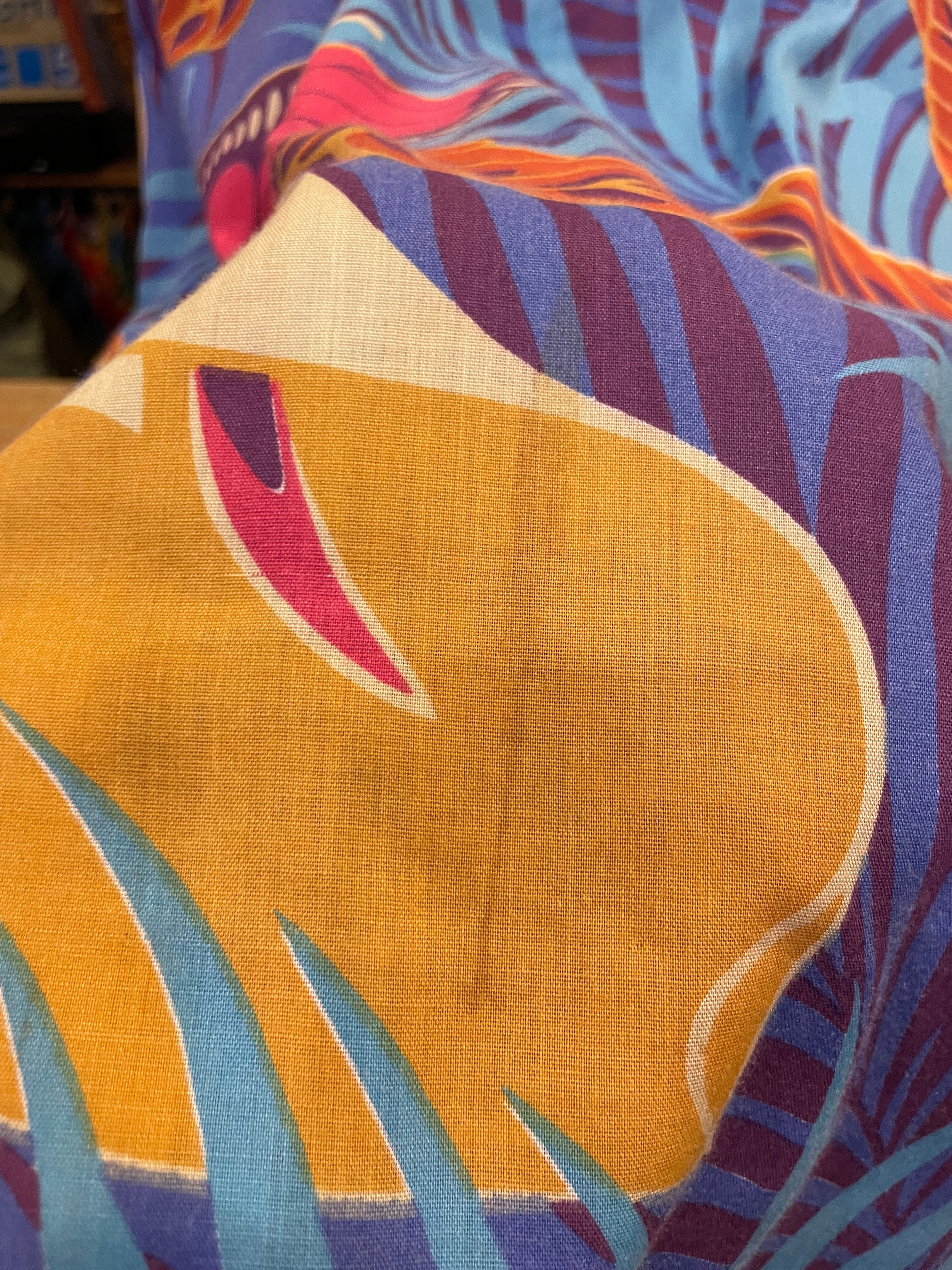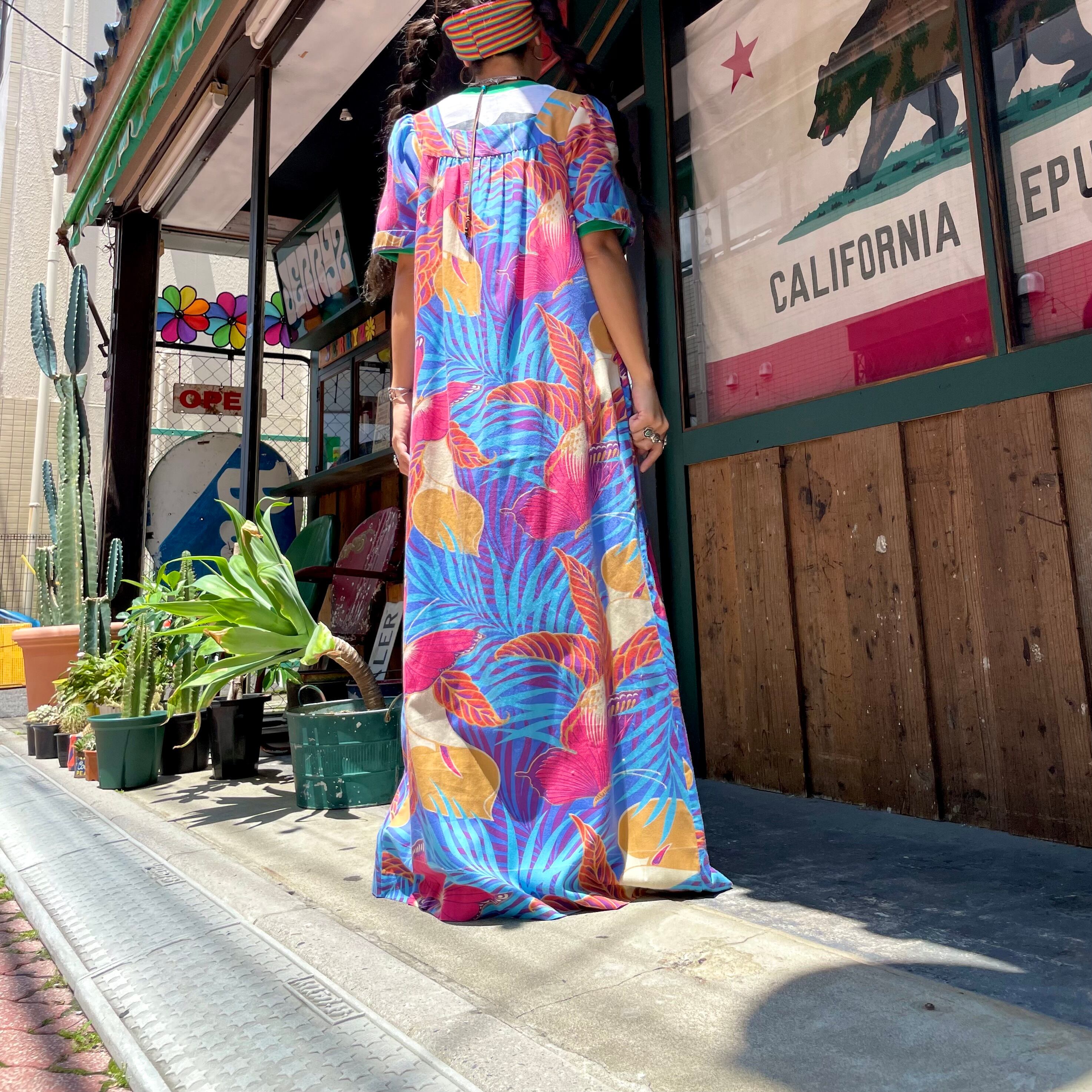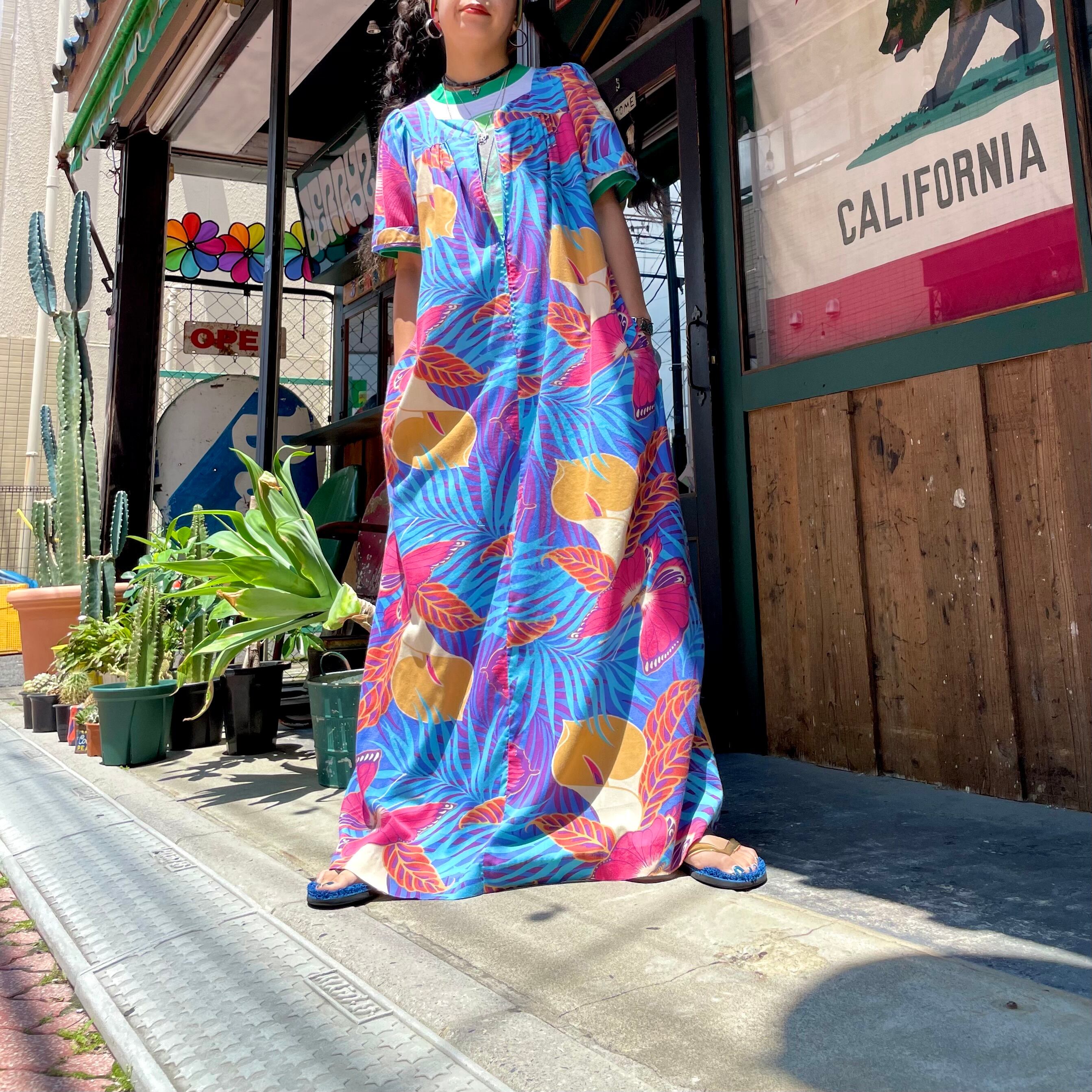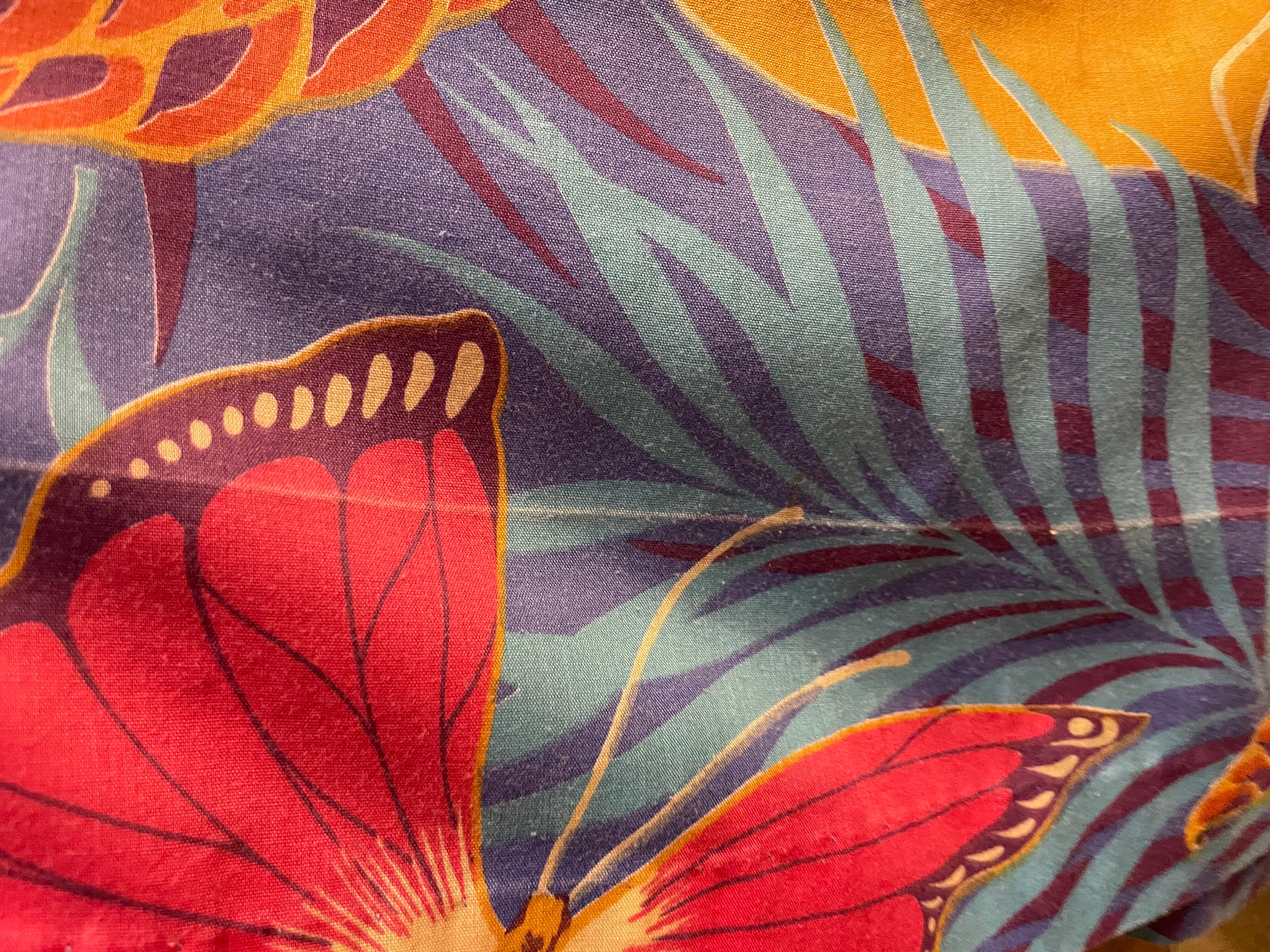 南国なムード漂う模様や色合わせが素敵なワンピースです。シダ植物?やカラーが咲いていて、大きな蝶々が飛んでいてとてもかわいいです。