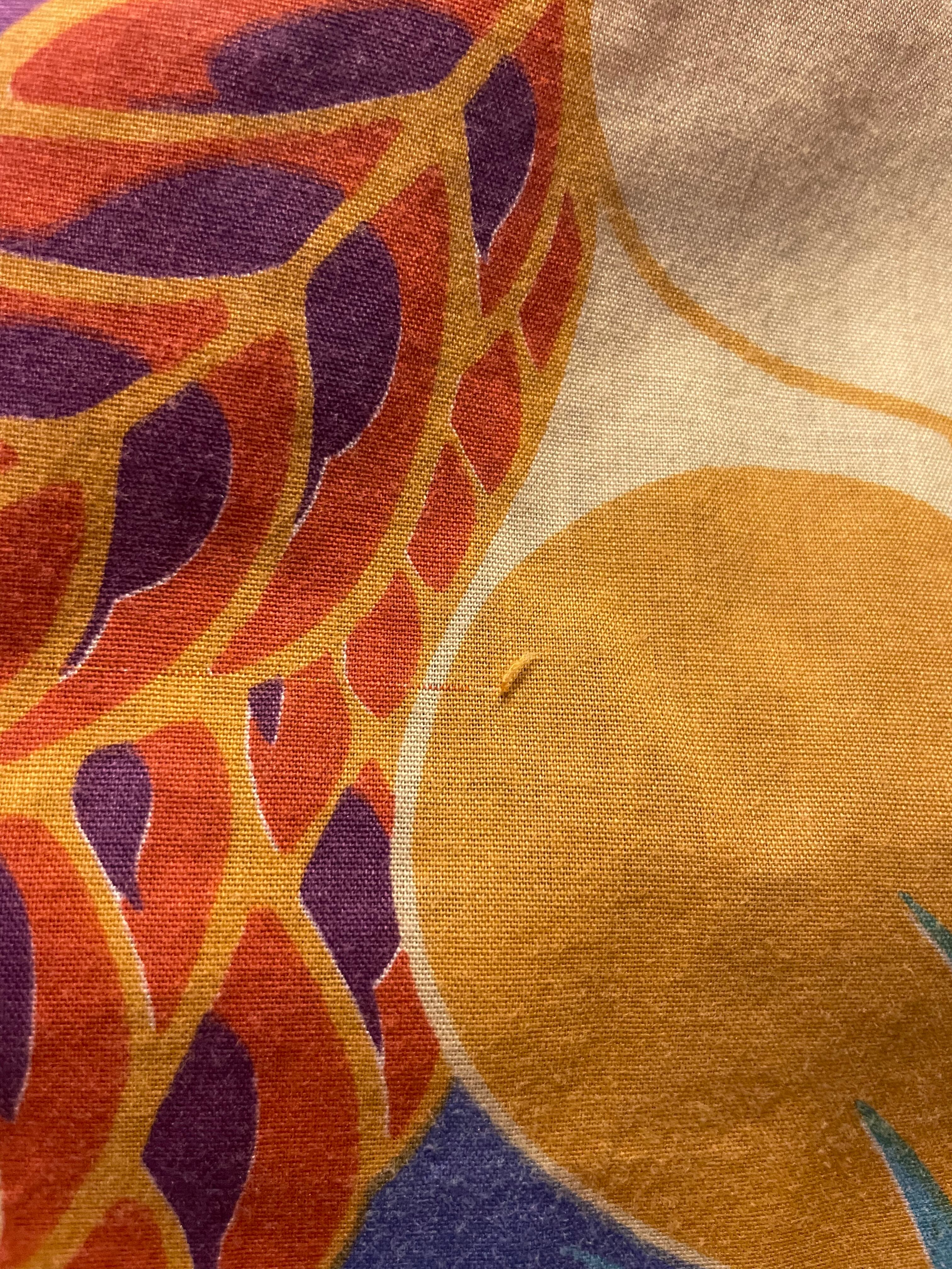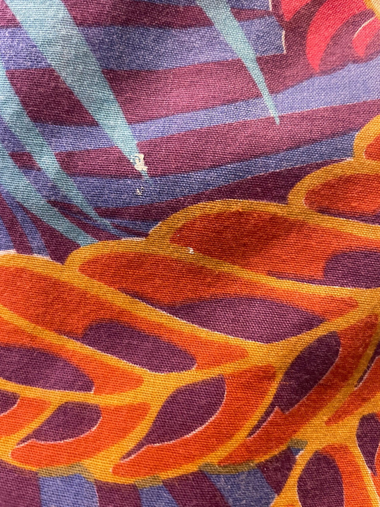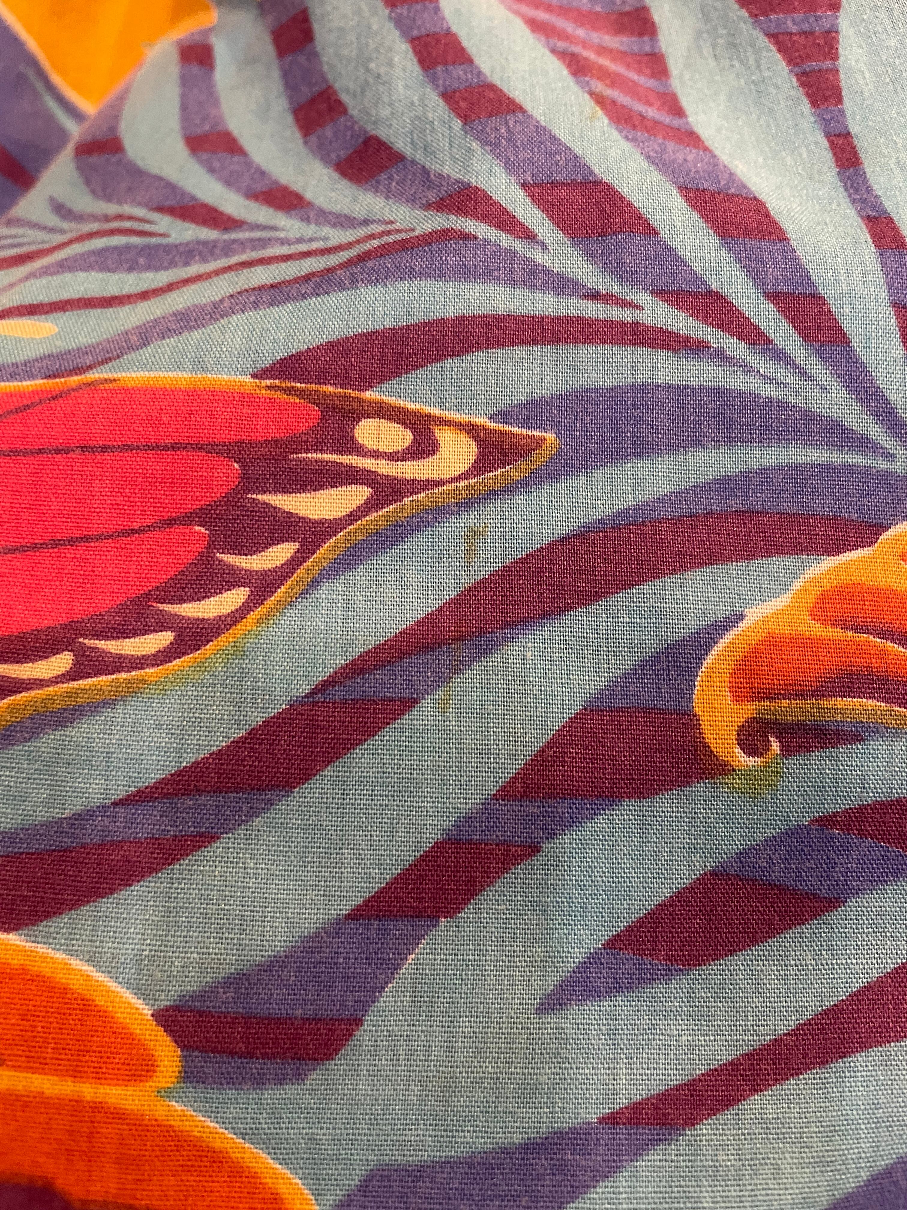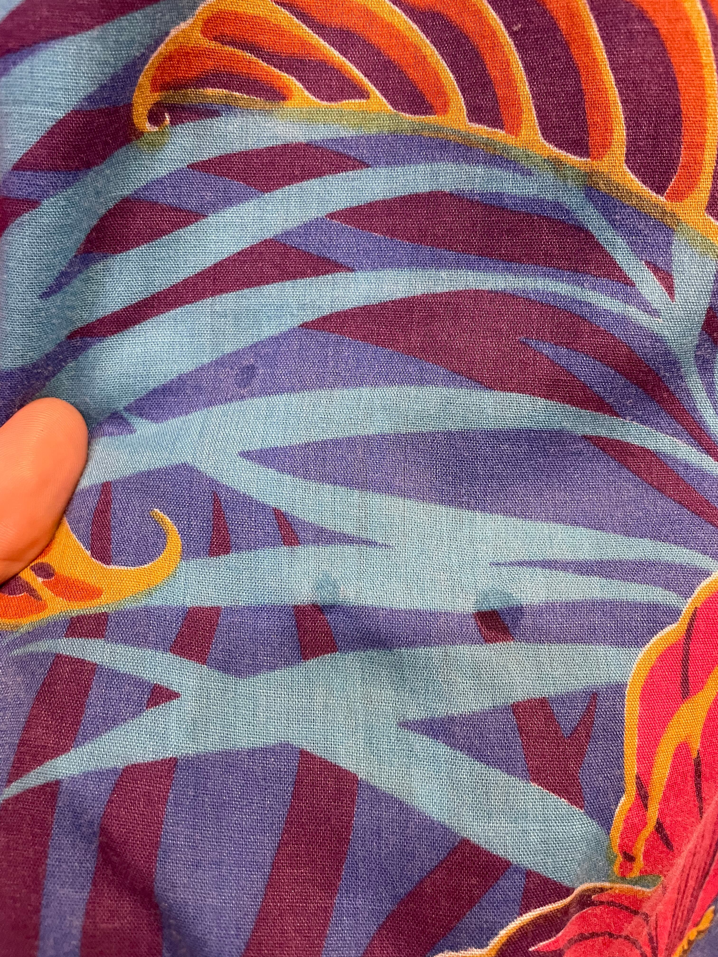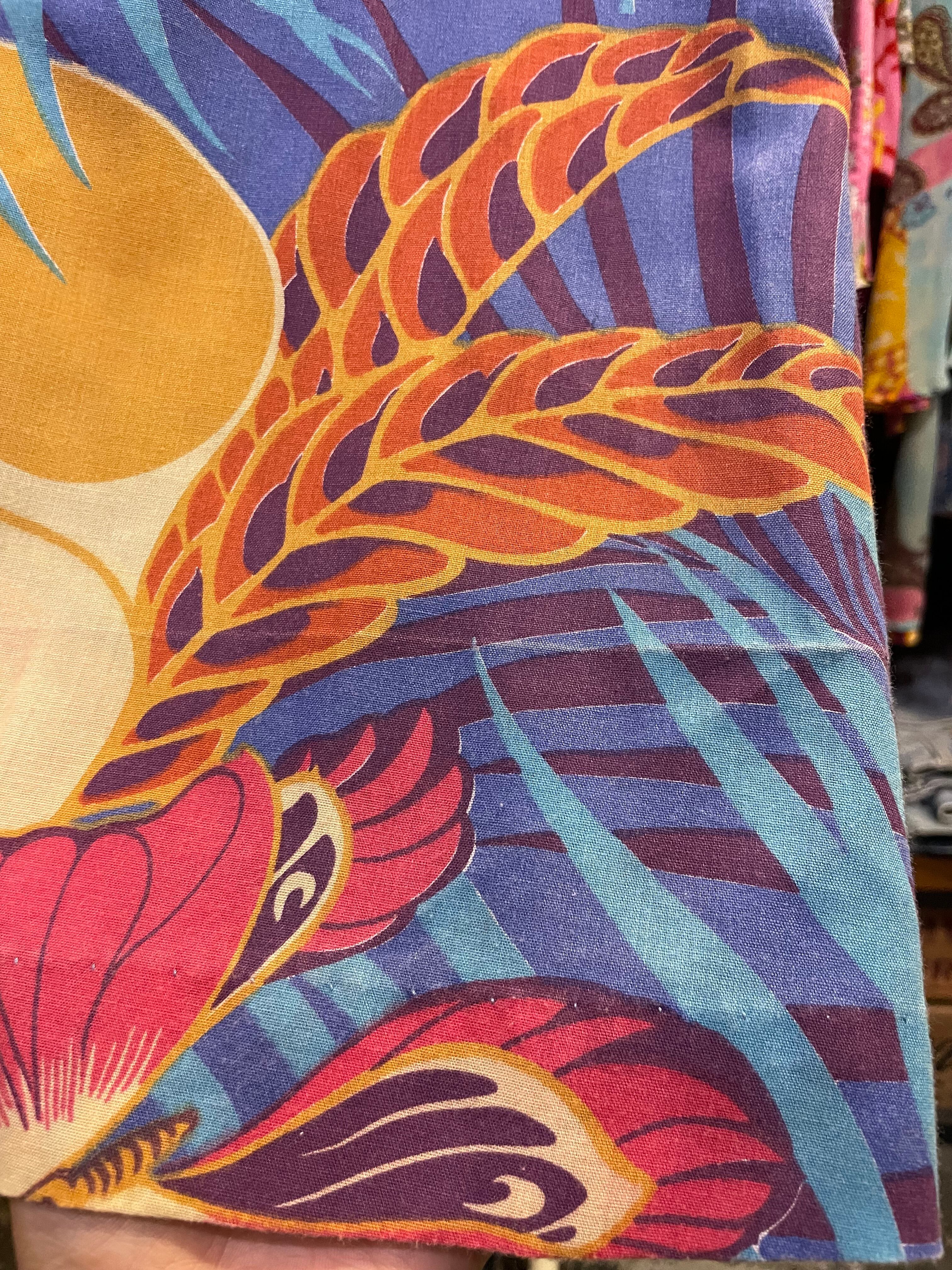 南国なムード漂う模様や色合わせが素敵なワンピースです。シダ植物?やカラーが咲いていて、大きな蝶々が飛んでいてとてもかわいいです。