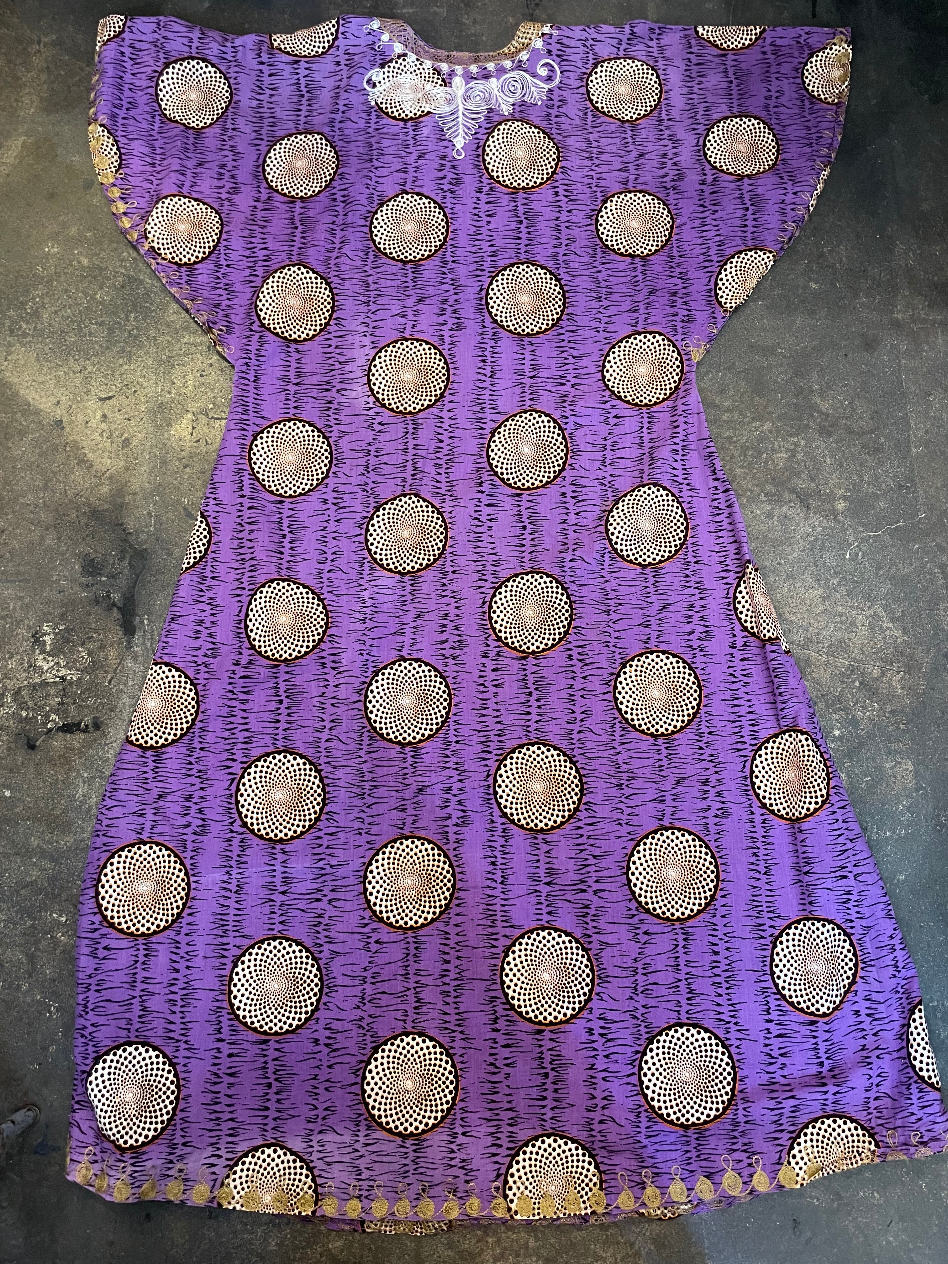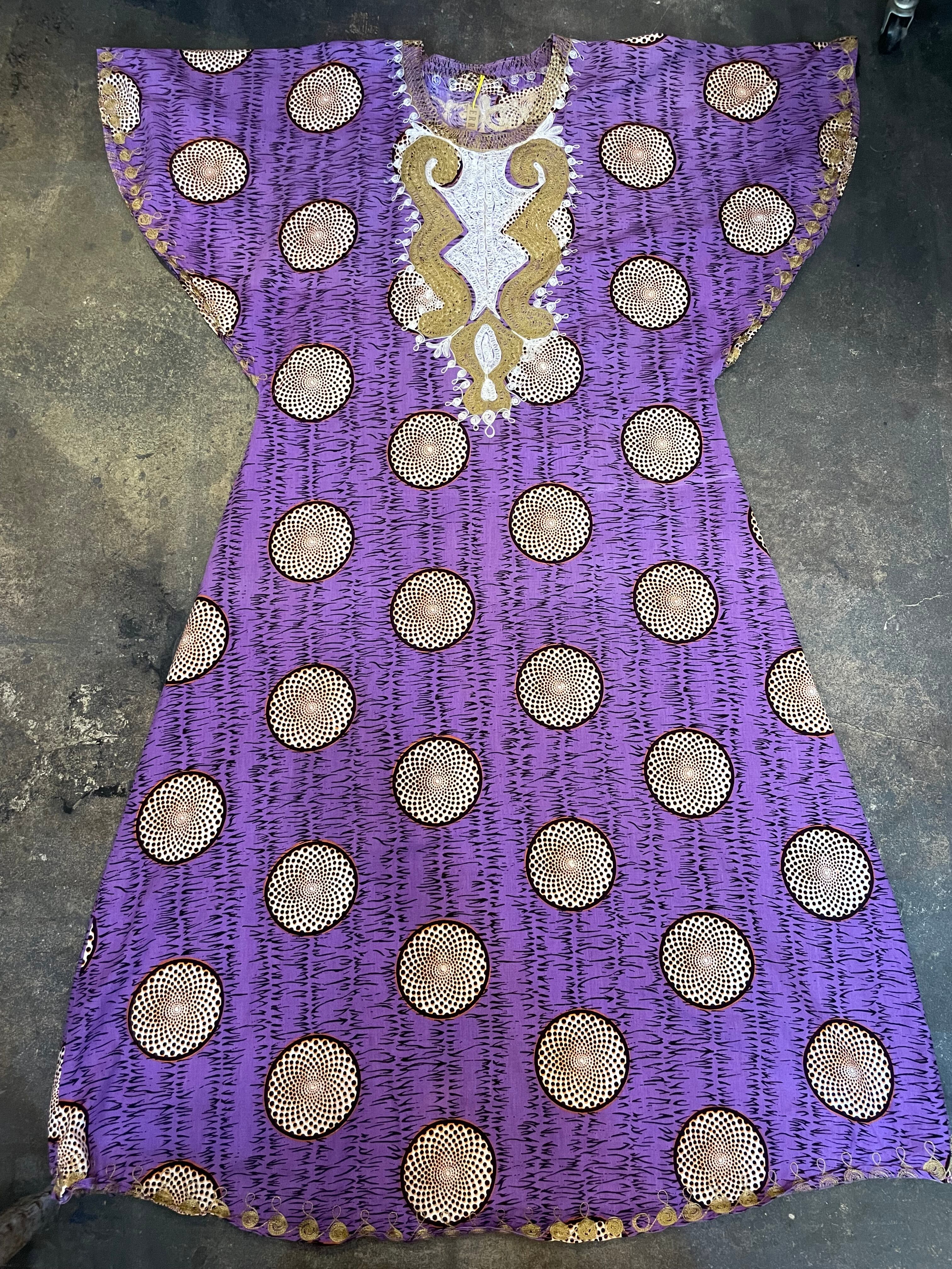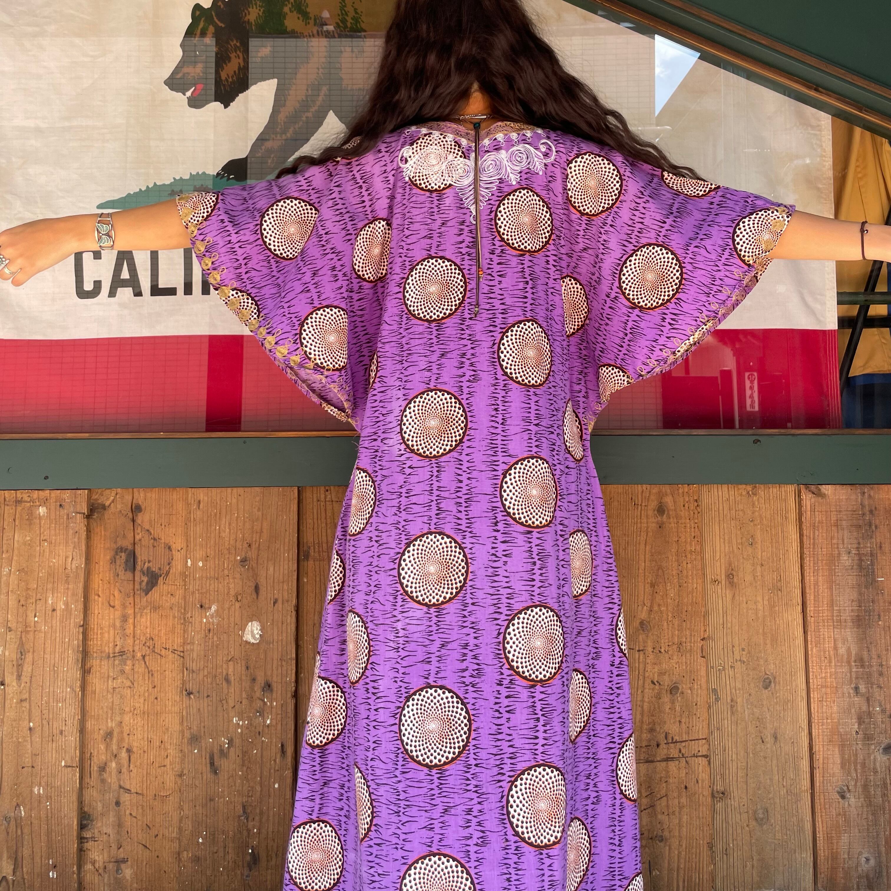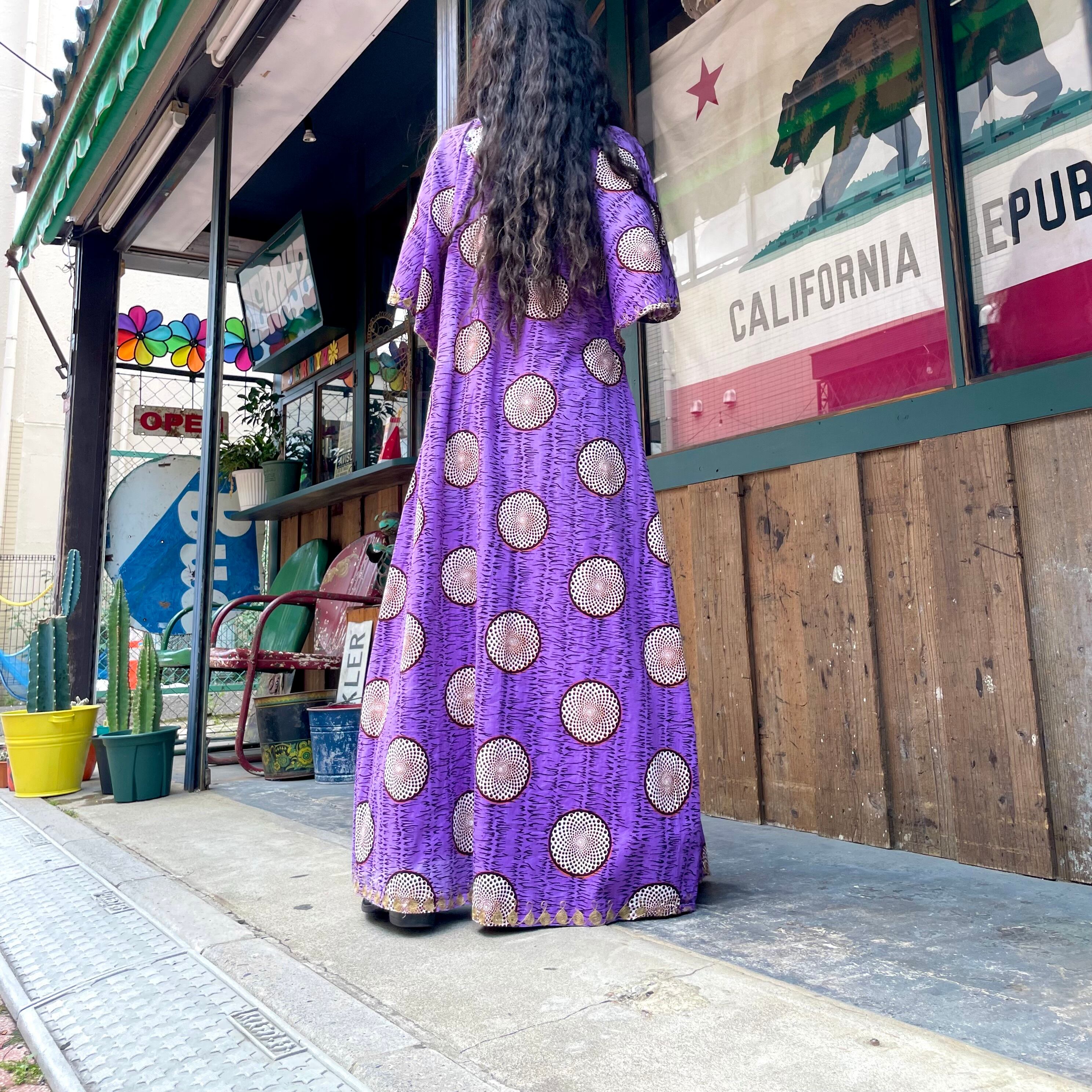 アフリカンバティックのような模様と色味がかっこいい生地で、カフタンドレス仕様の刺繍がたっぷり施されていて素敵なワンピースです。