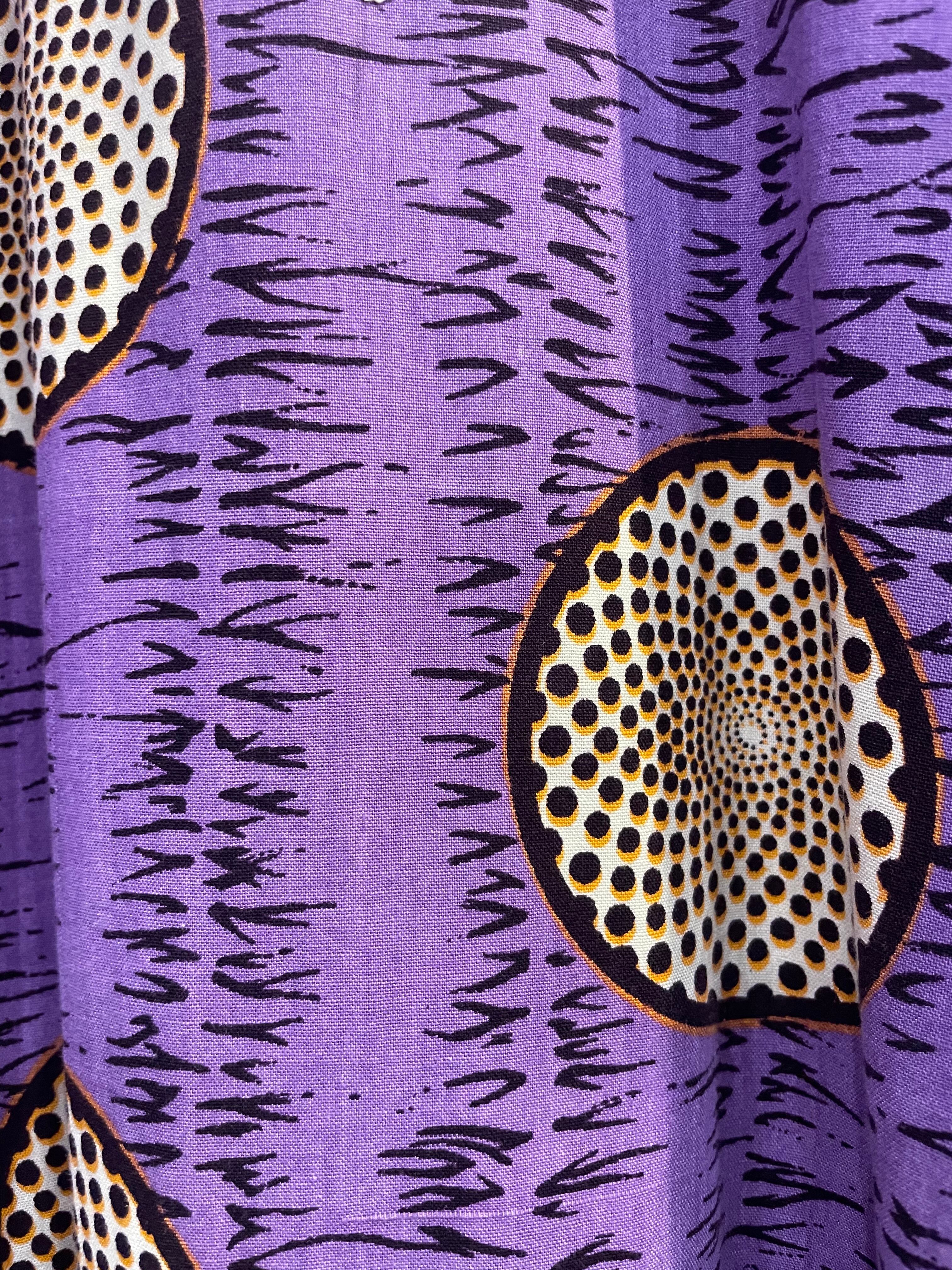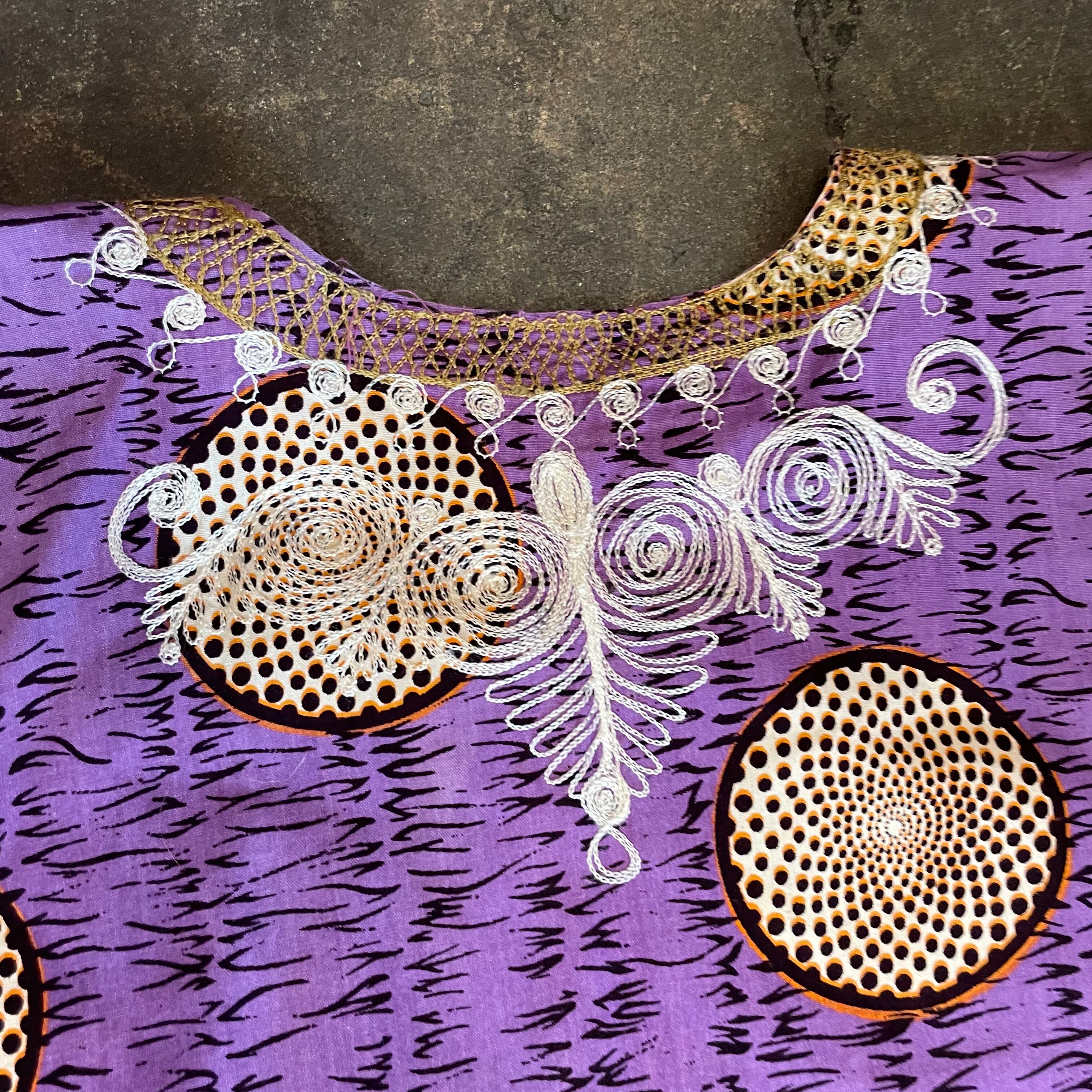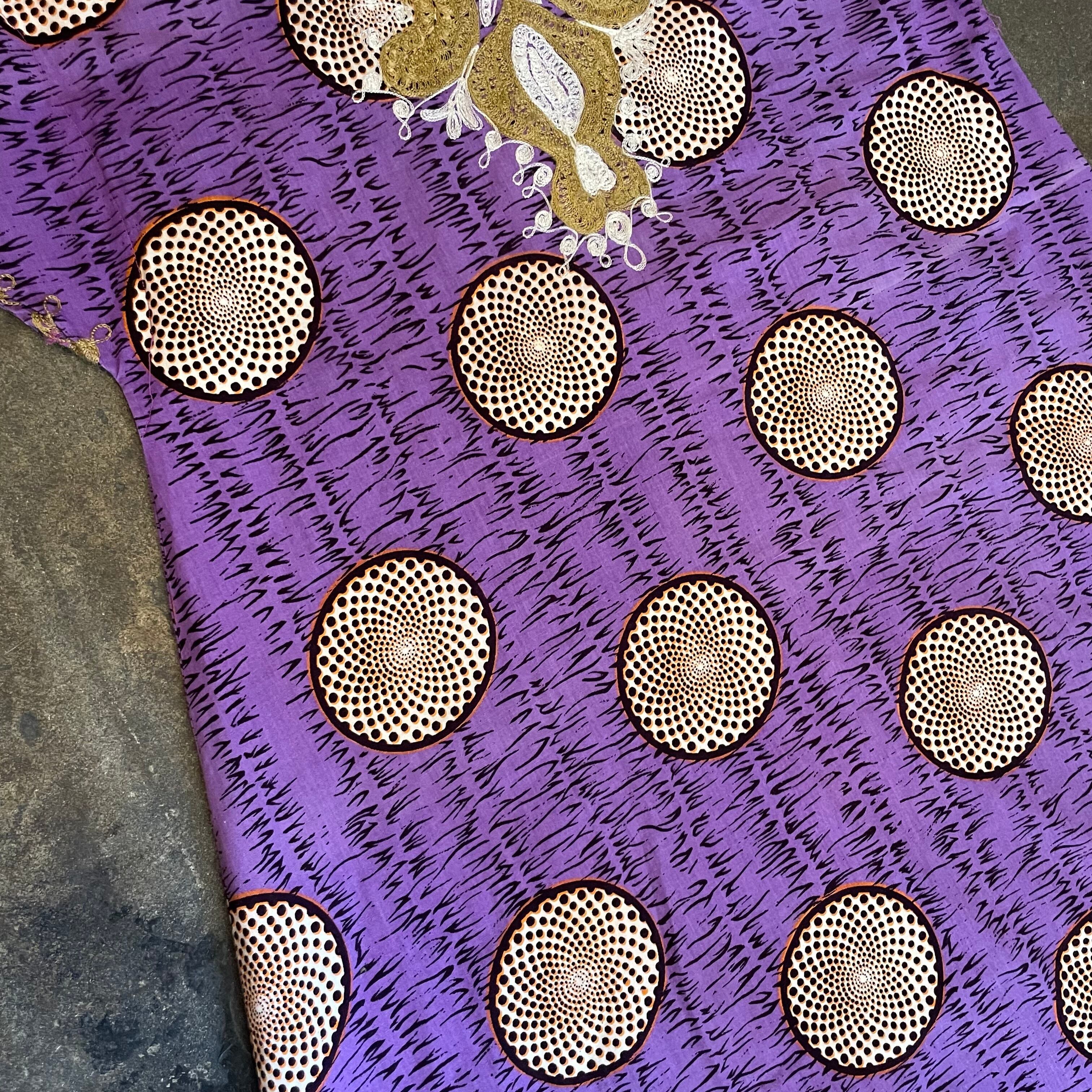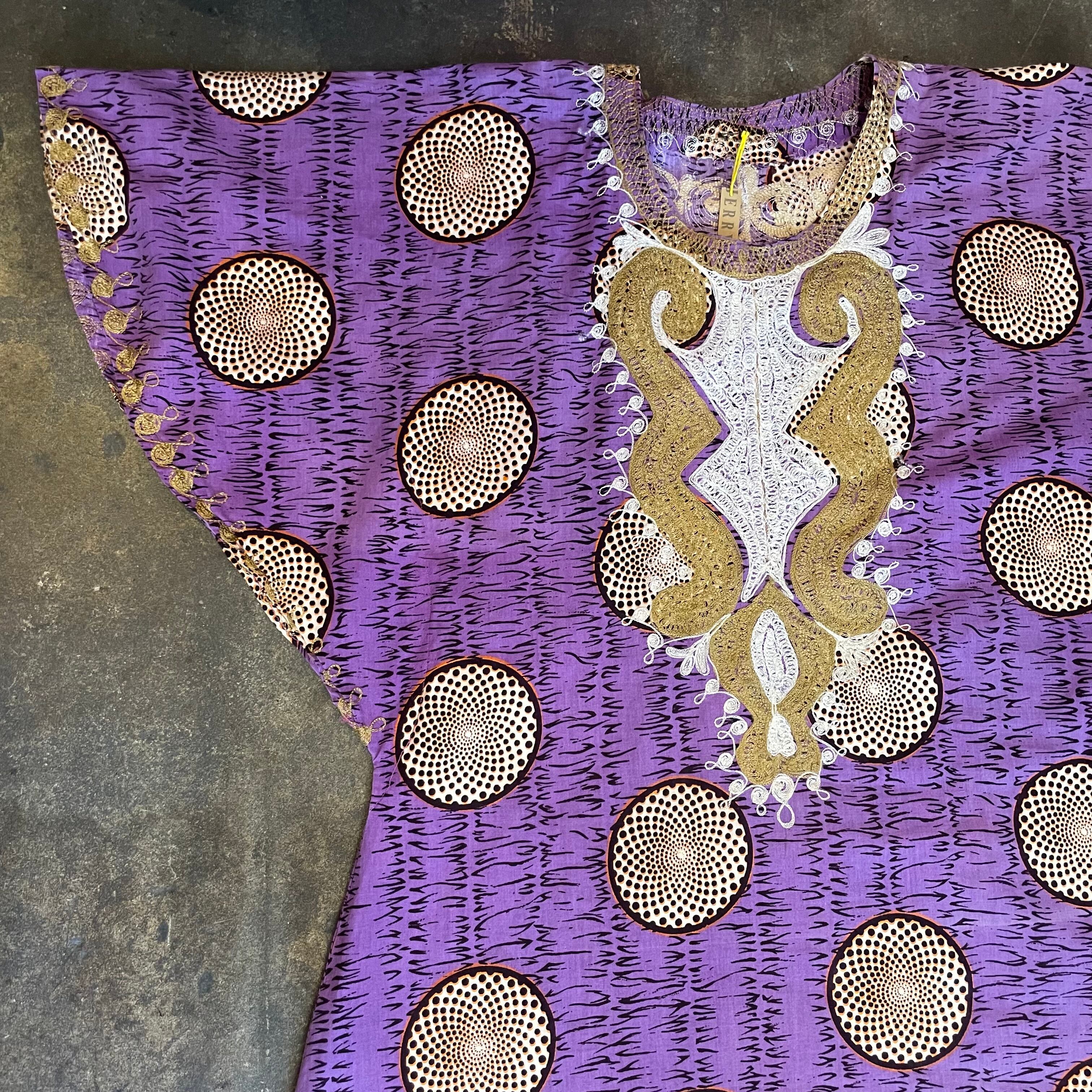 アフリカンバティックのような模様と色味がかっこいい生地で、カフタンドレス仕様の刺繍がたっぷり施されていて素敵なワンピースです。