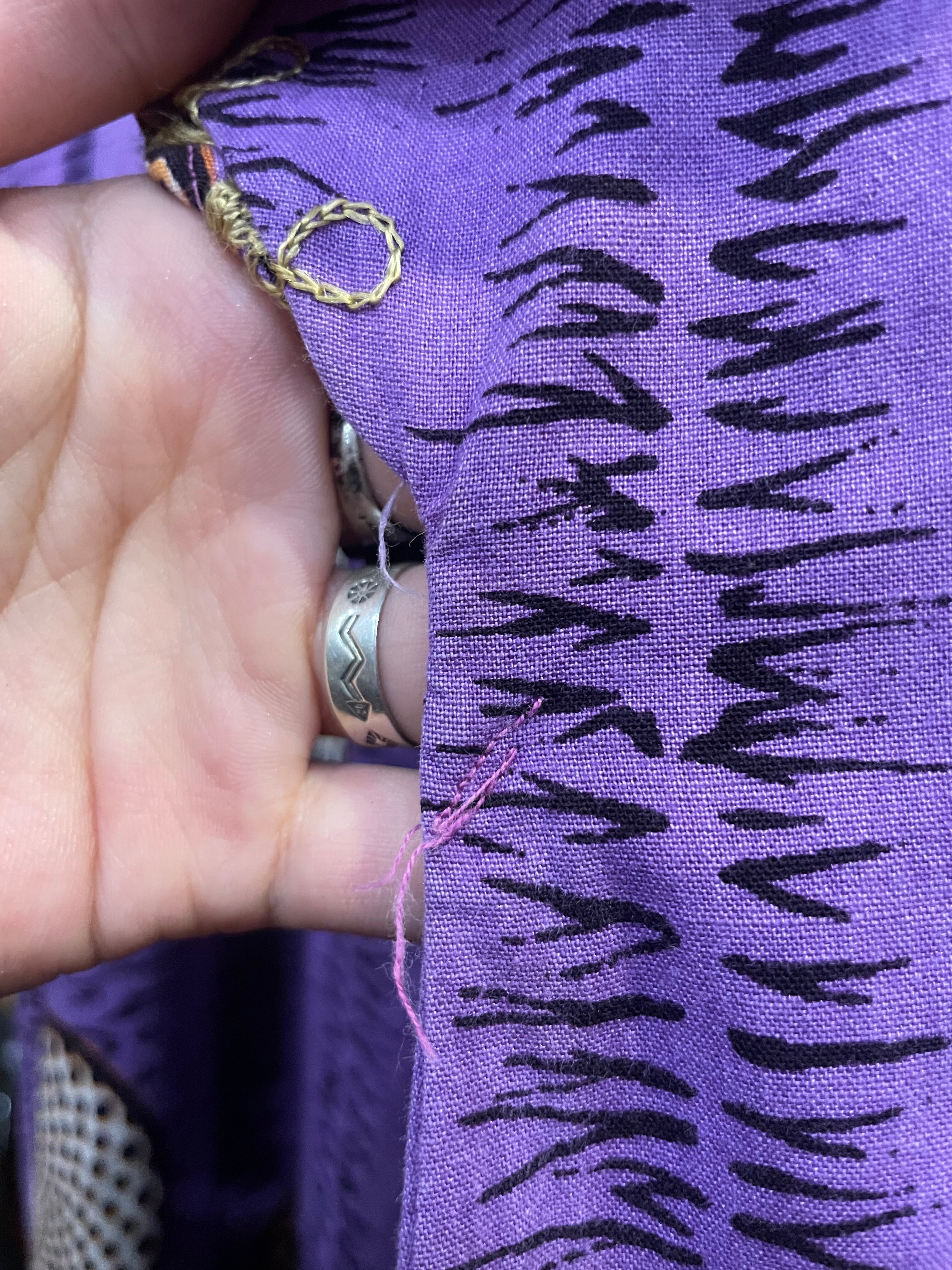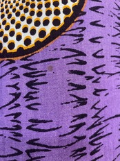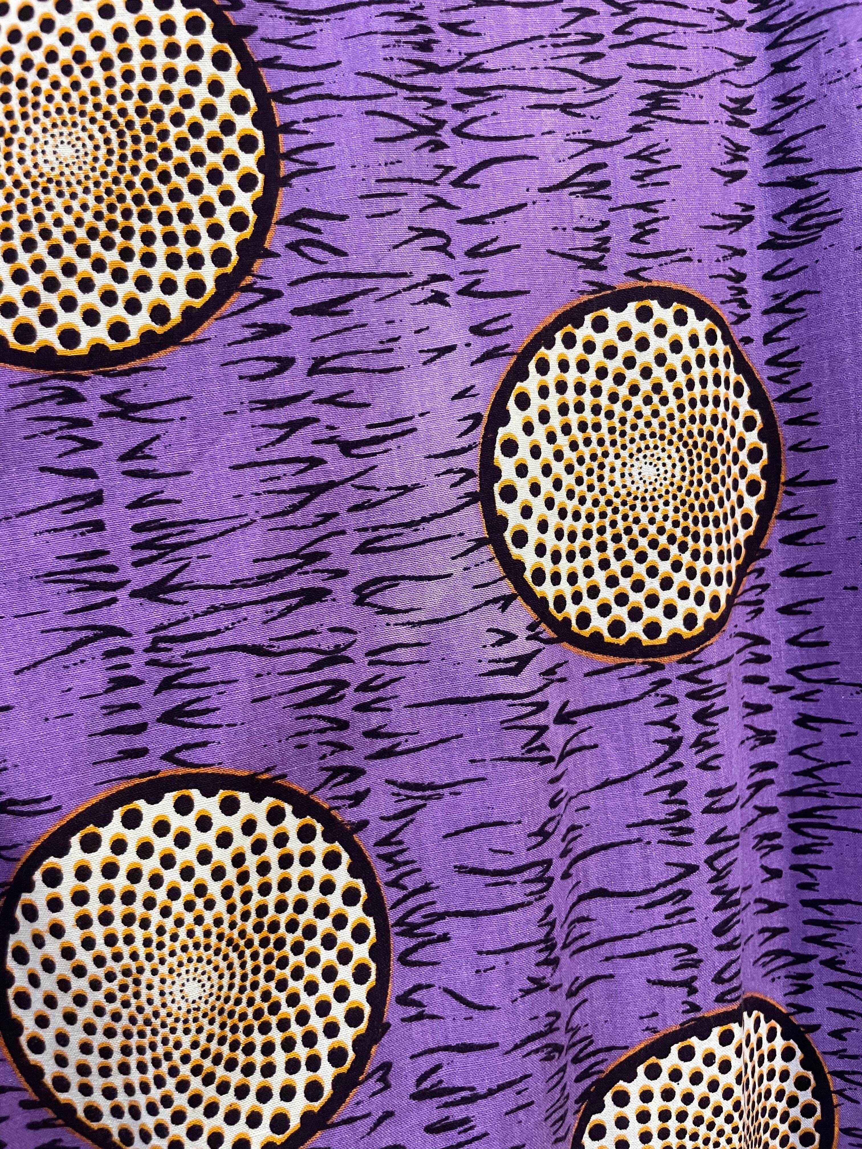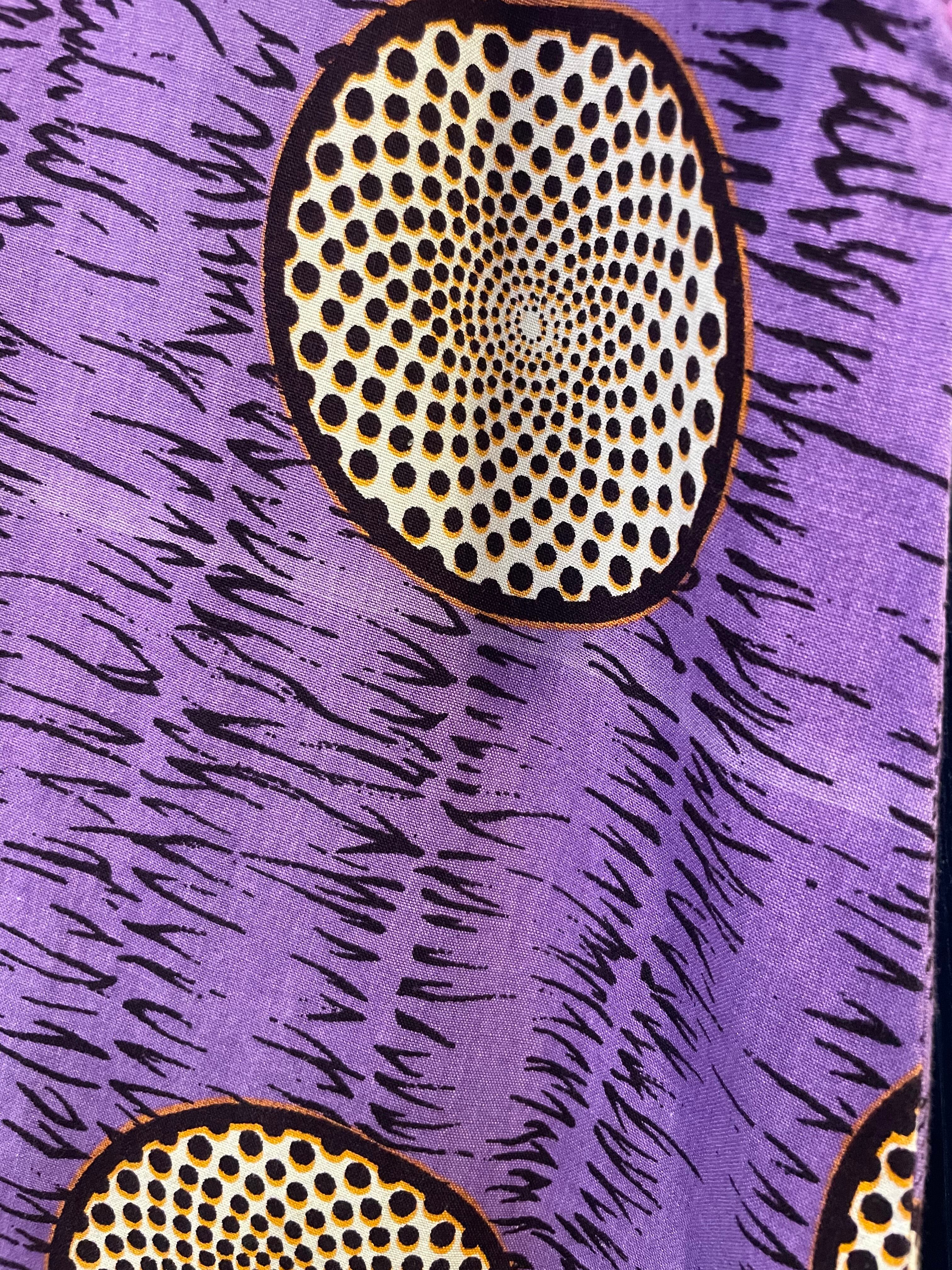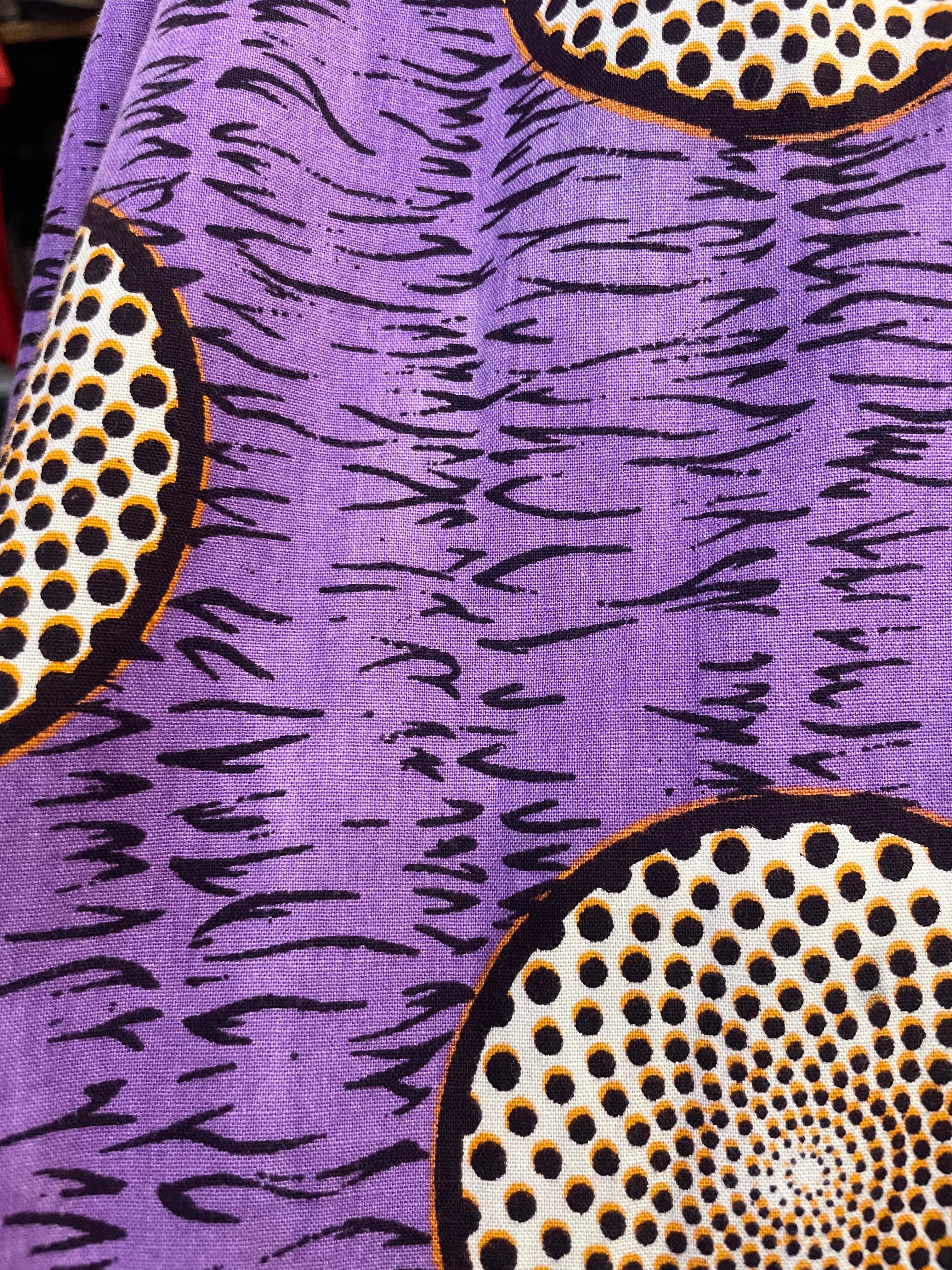 アフリカンバティックのような模様と色味がかっこいい生地で、カフタンドレス仕様の刺繍がたっぷり施されていて素敵なワンピースです。