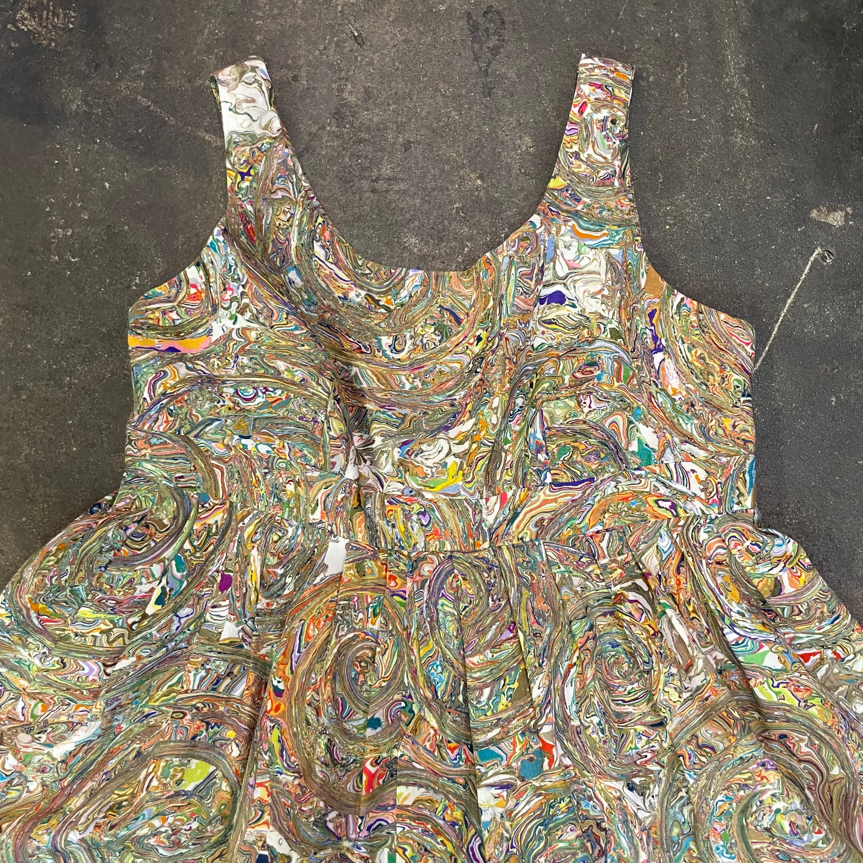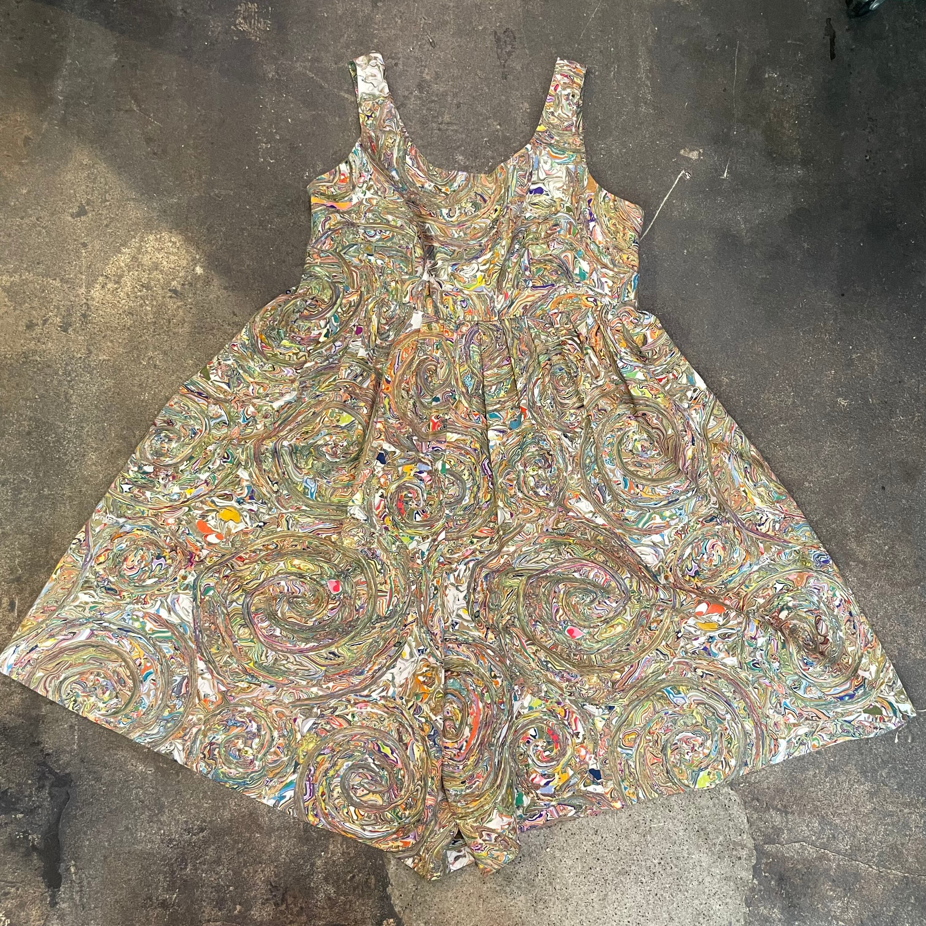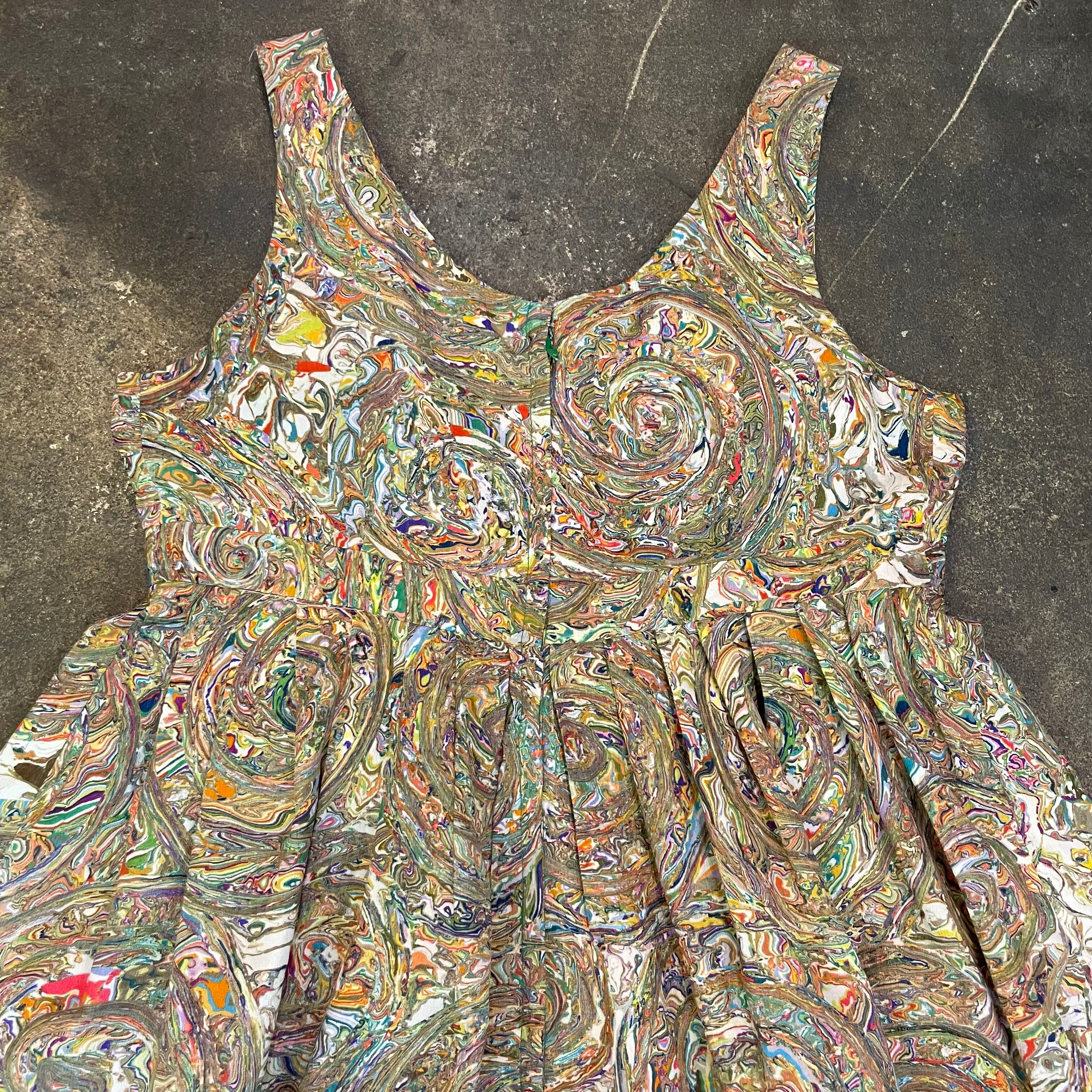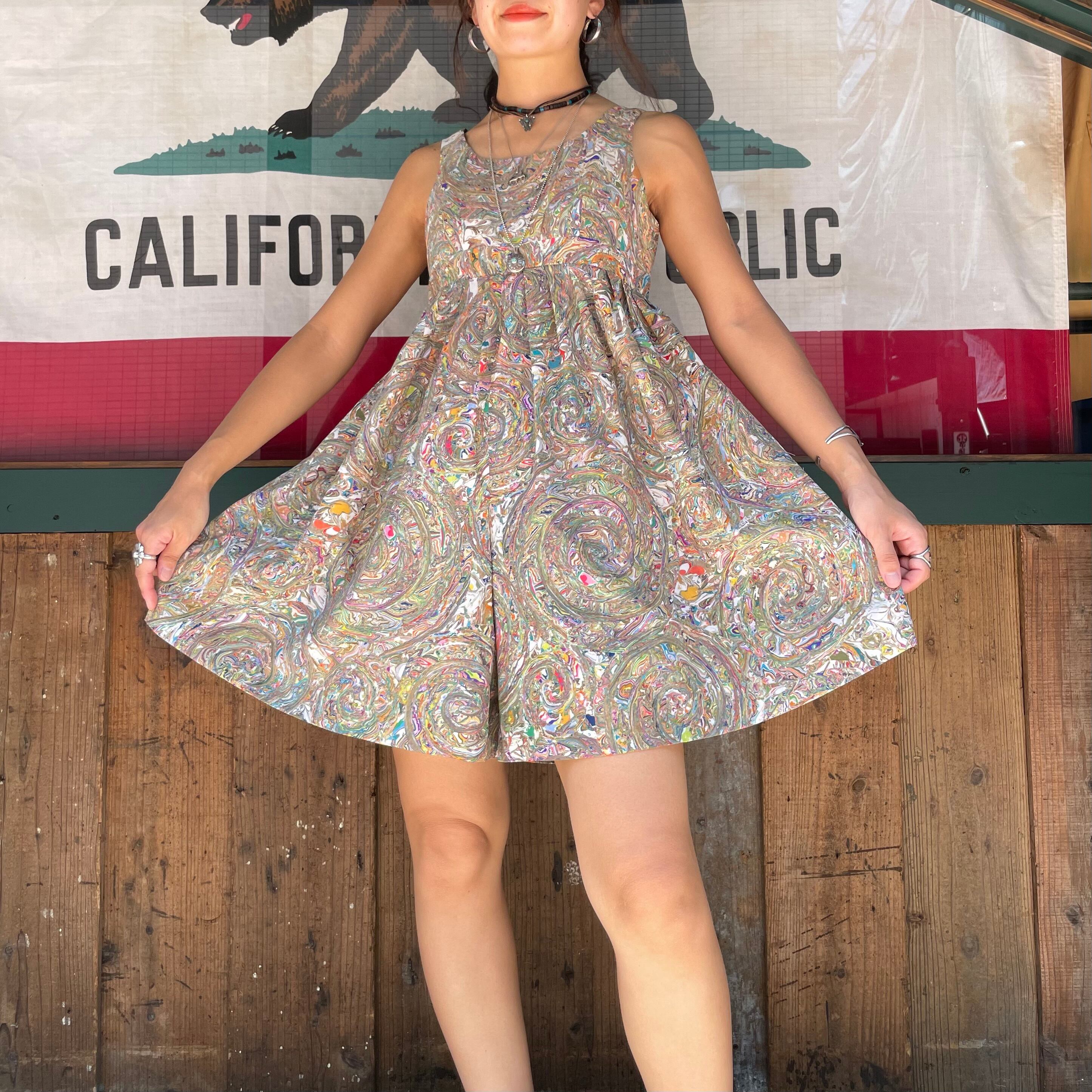 マーブリングの中に渦巻きがある、とてもアーティスティックな柄がかわいいサロペットです。
