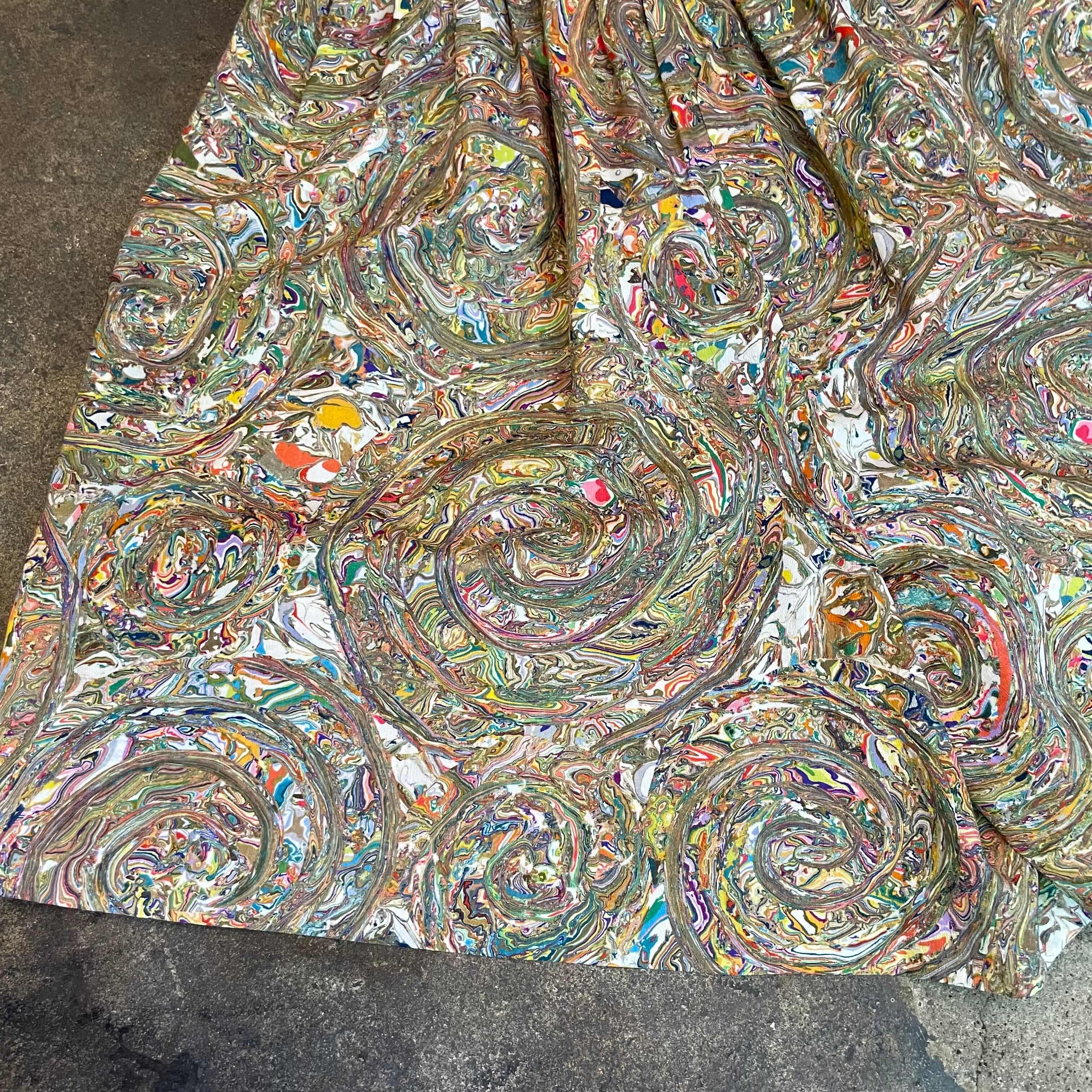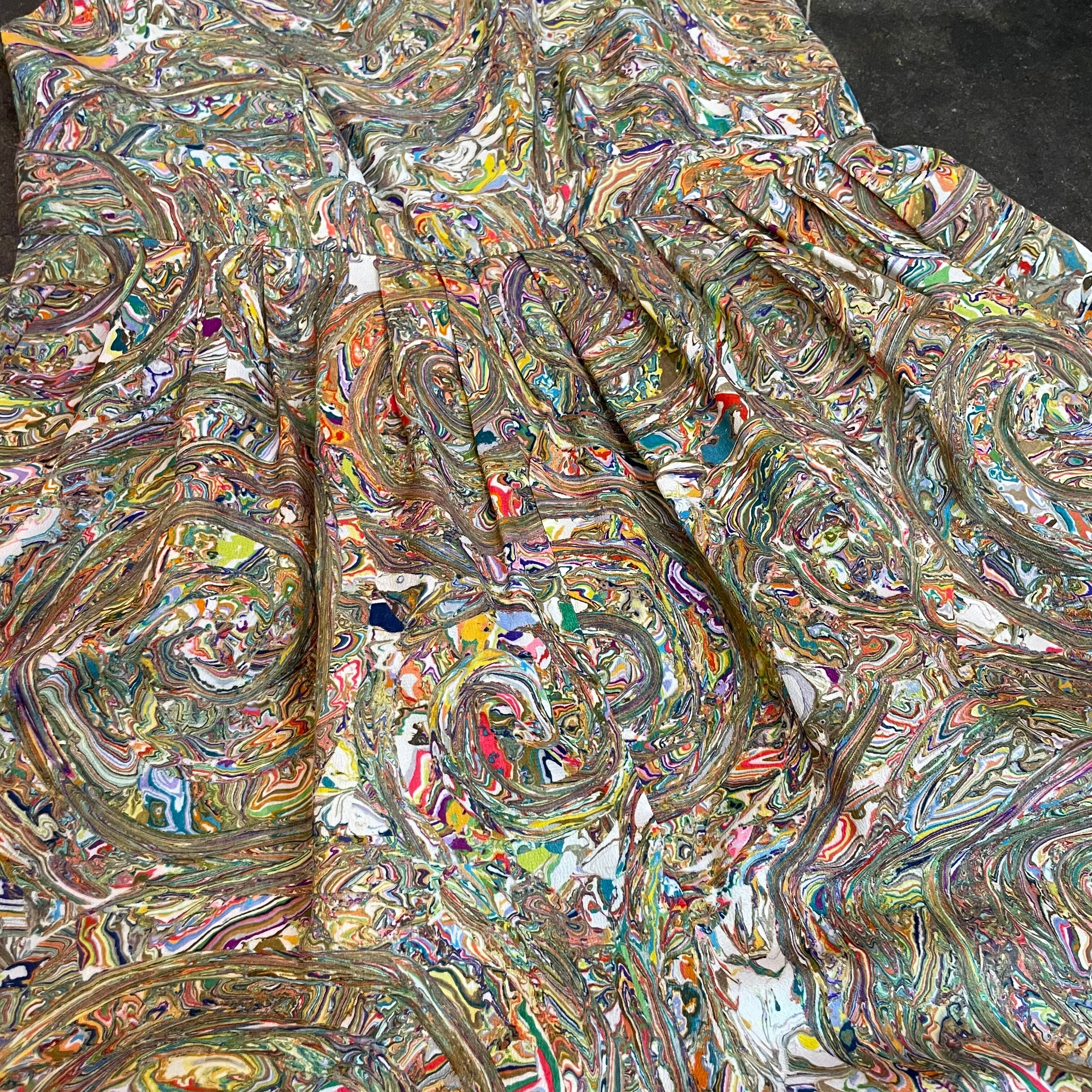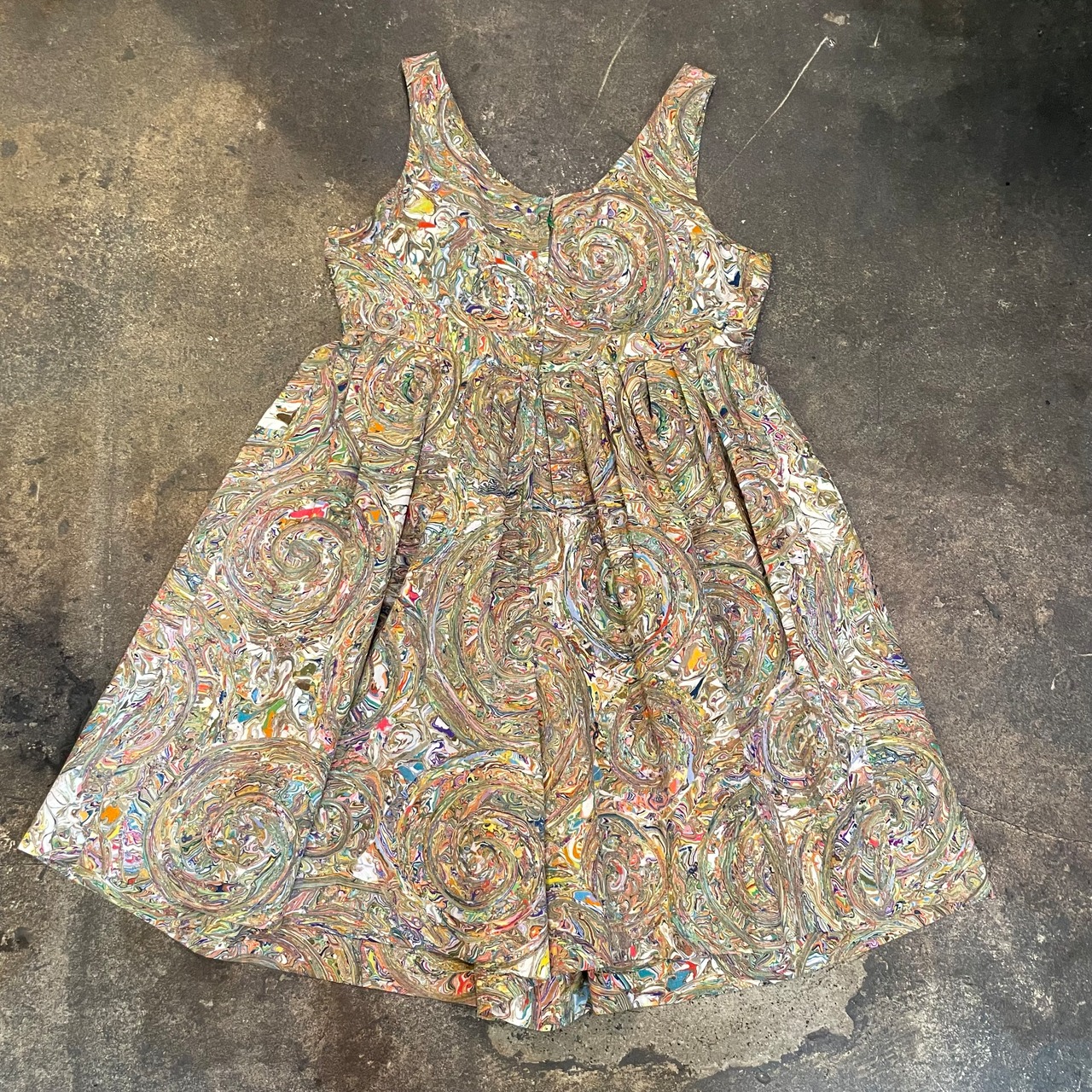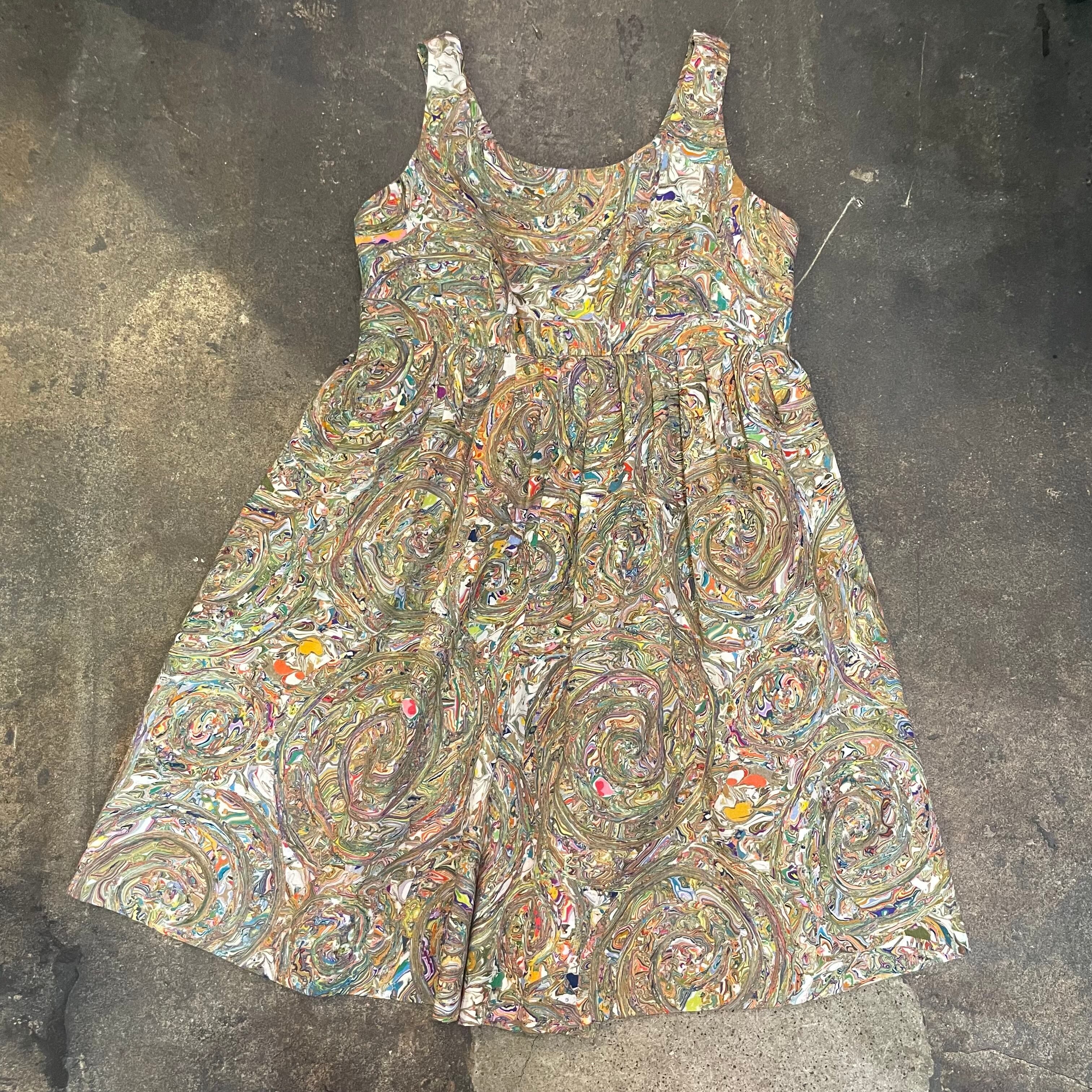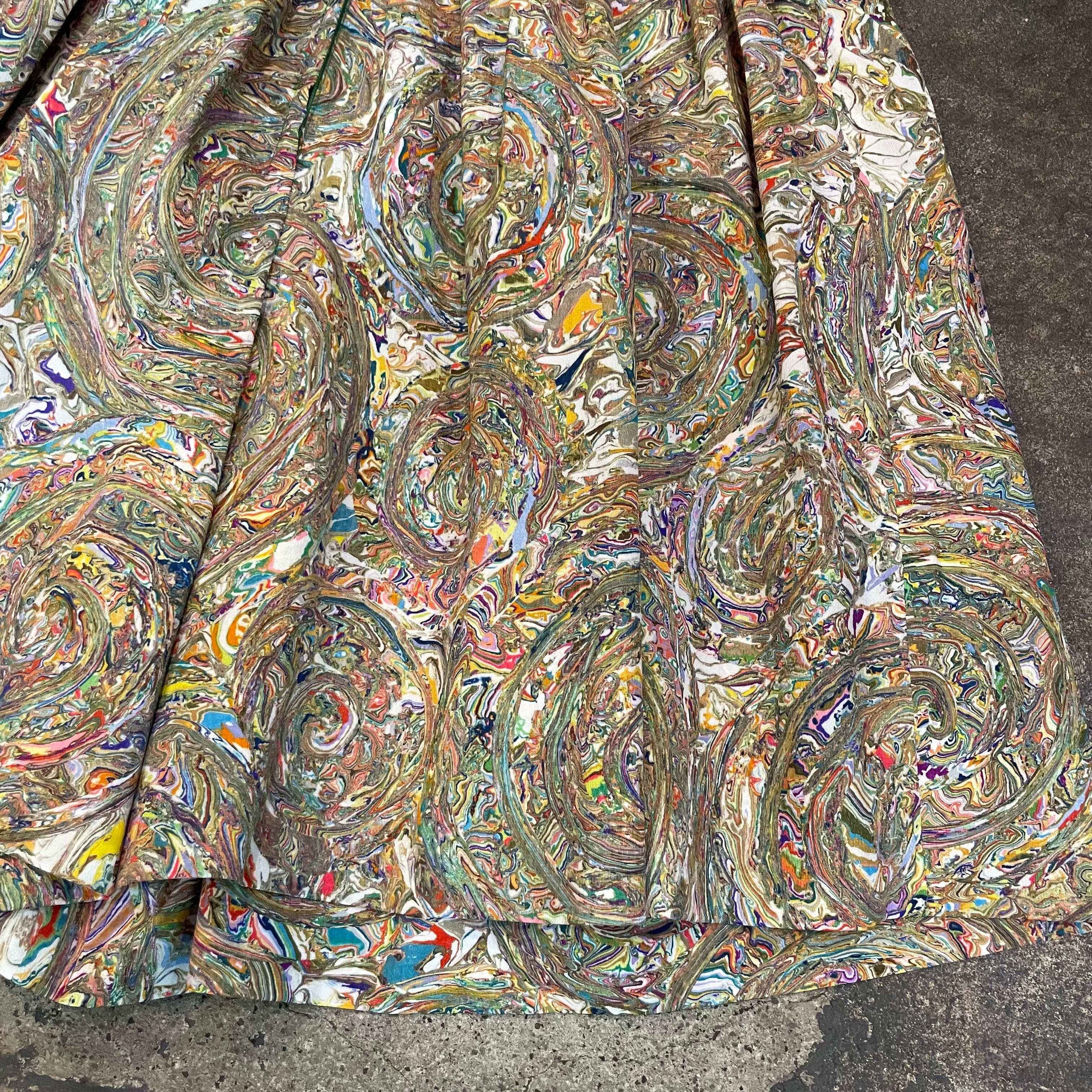 マーブリングの中に渦巻きがある、とてもアーティスティックな柄がかわいいサロペットです。