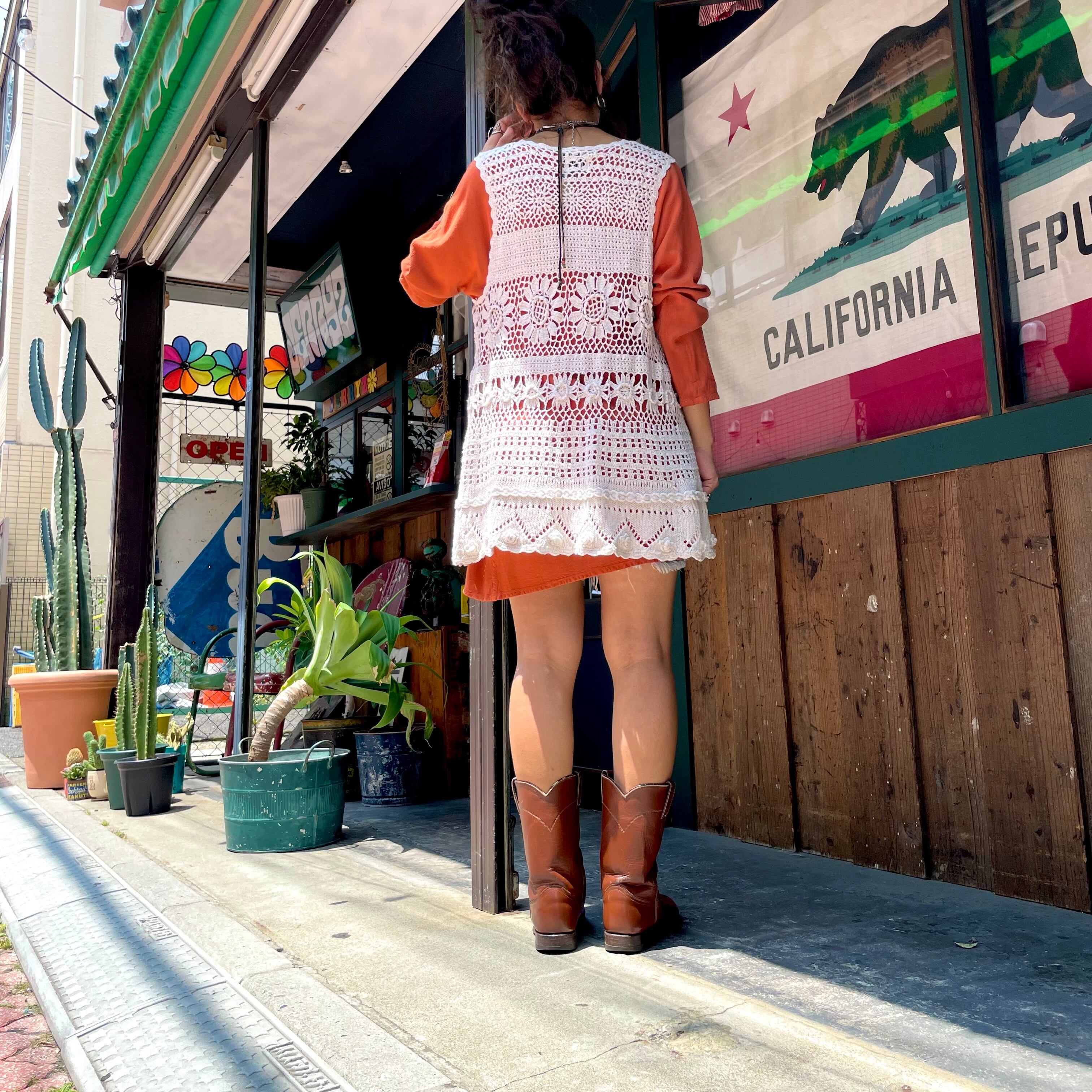 お花のモチーフがかわいい手編みのかぎ針編みベストです。袖ぐりも広く着丈も長めなのでいろんなアイテムとの重ね着が楽しめるアイテムだと思います。