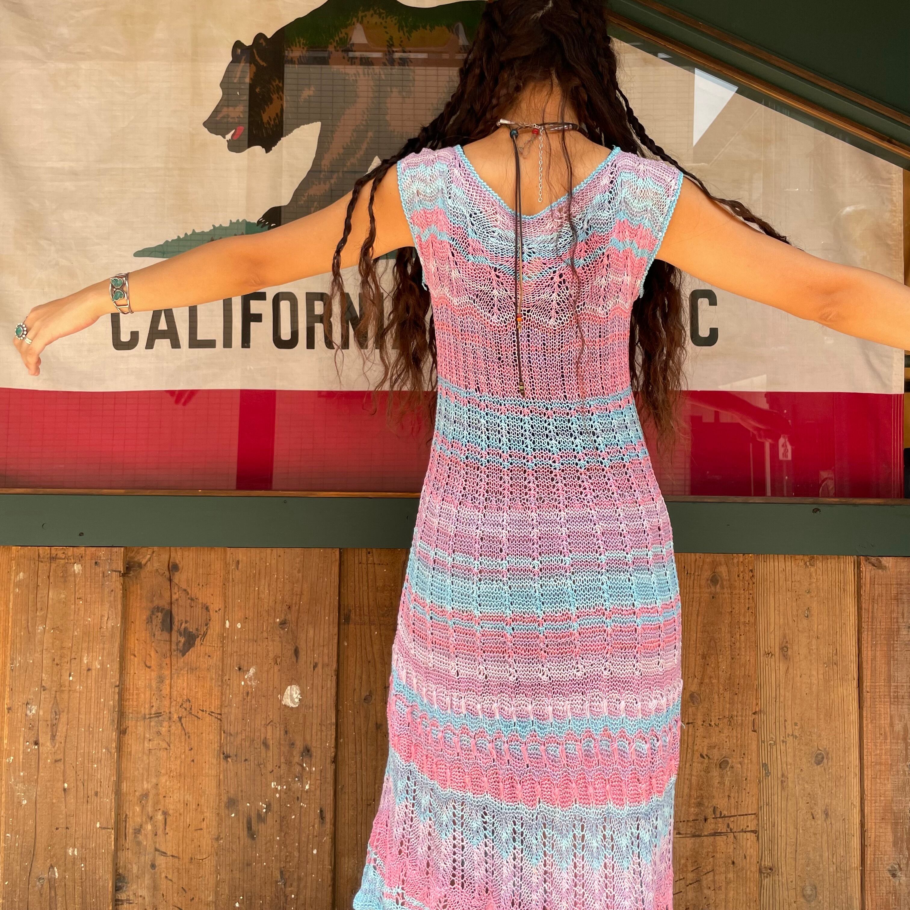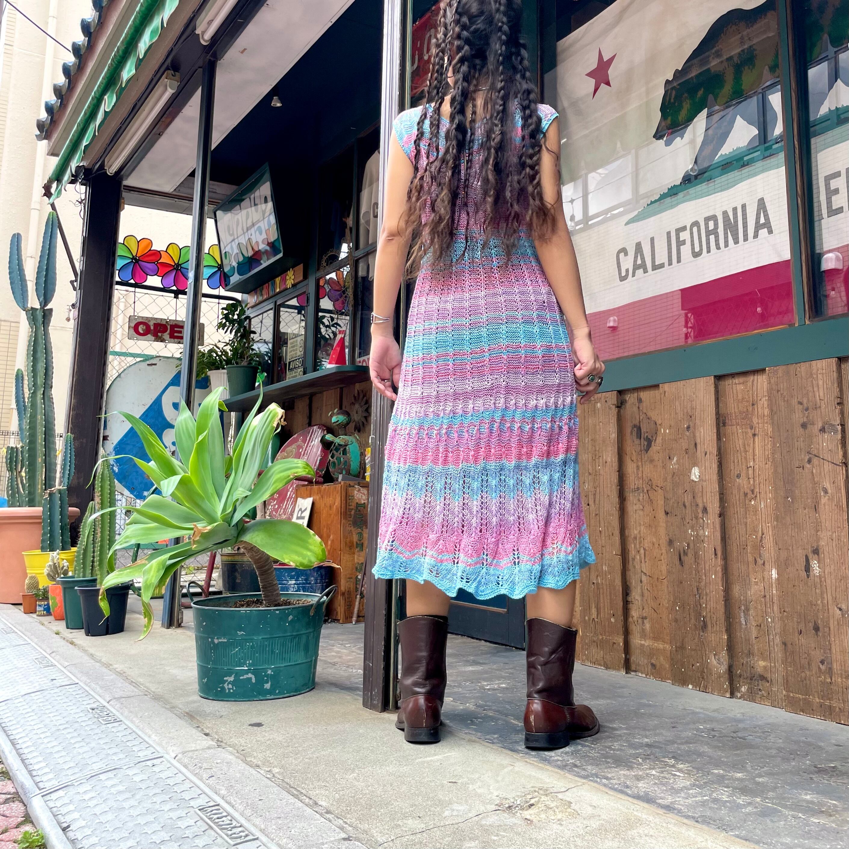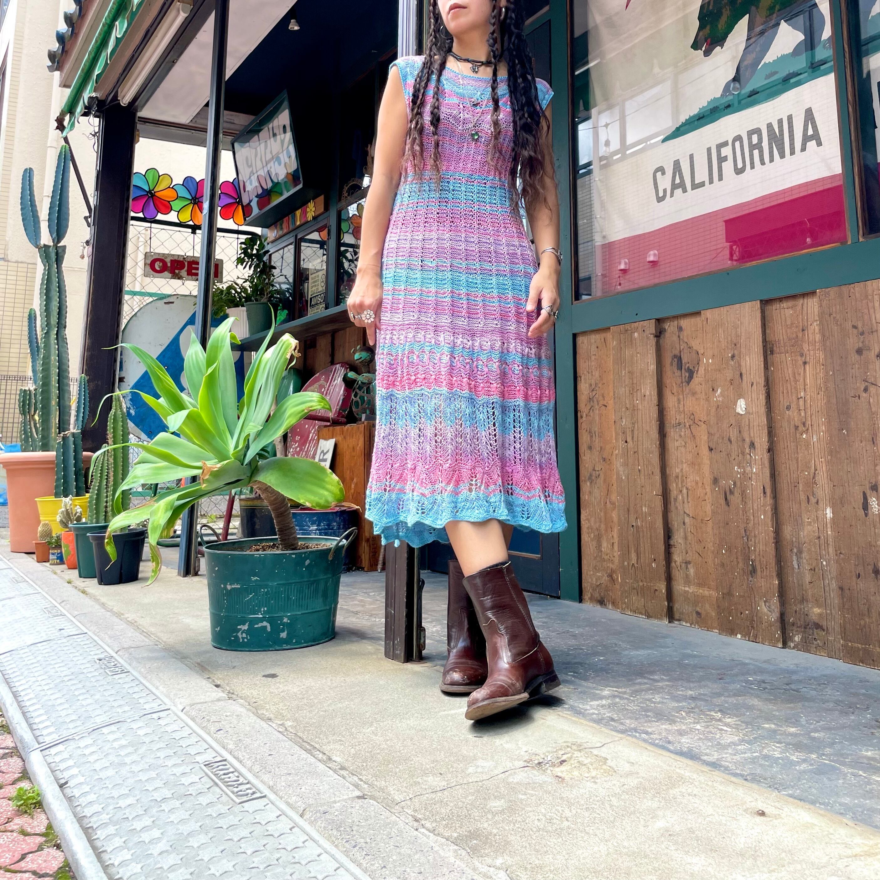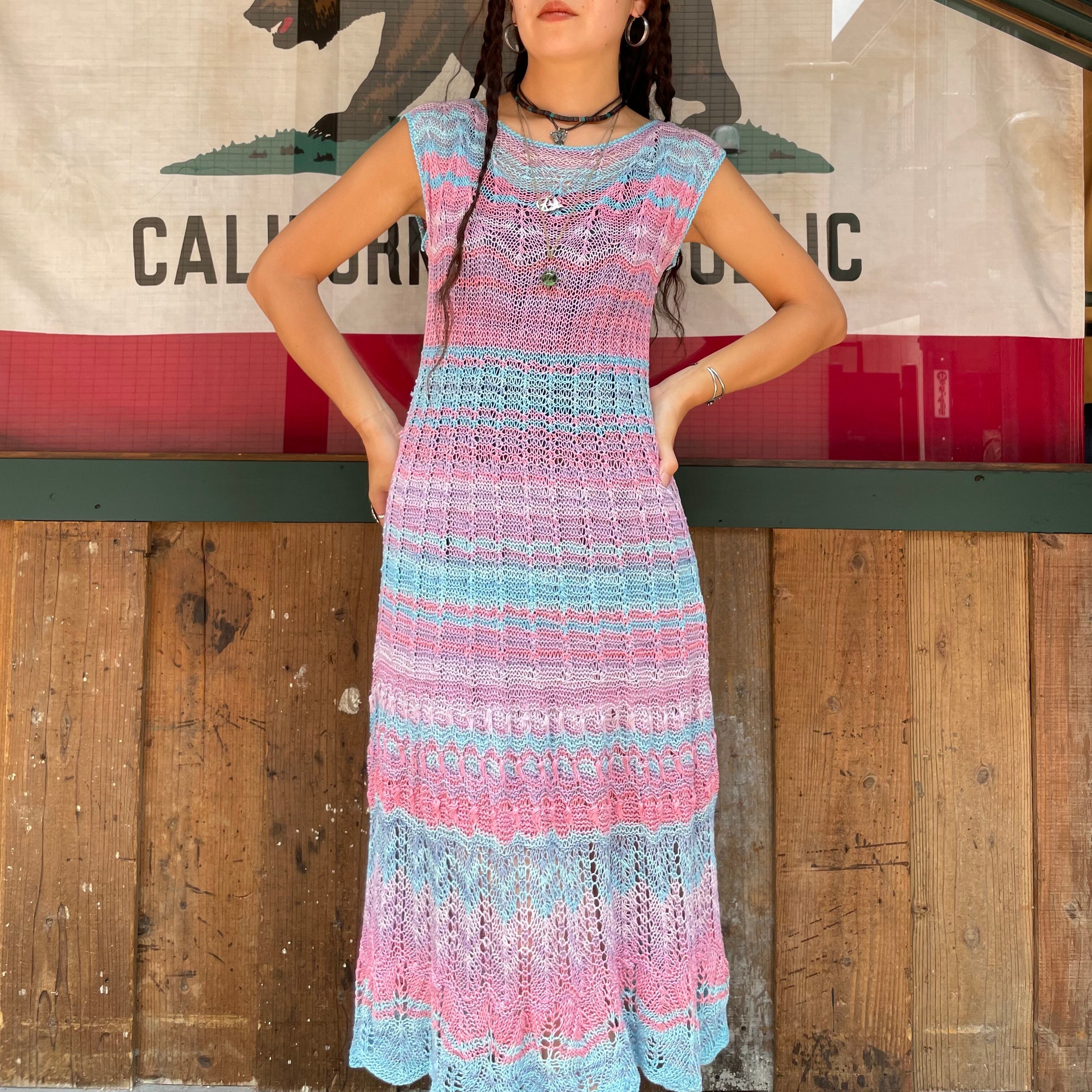 水色ピンクのグラデーションがかわいい、ニットワンピースです。パサっとした肌触りの糸で編まれていて爽やかですし涼しい一枚だと思います。