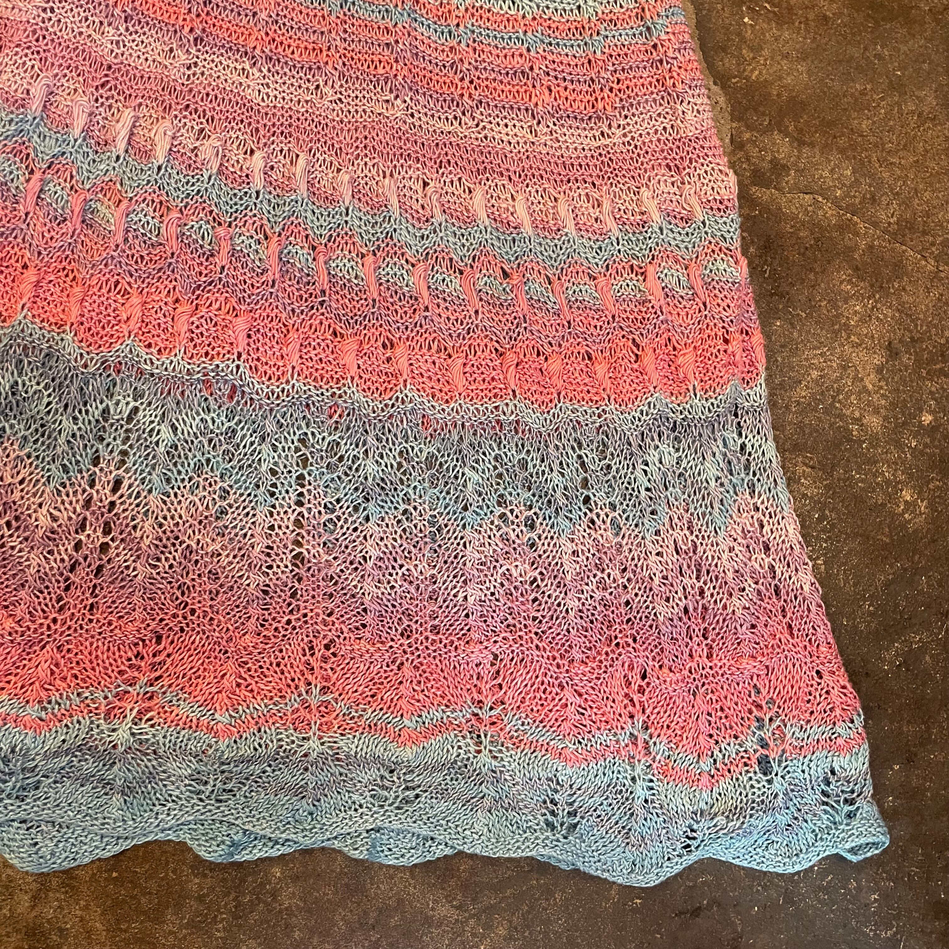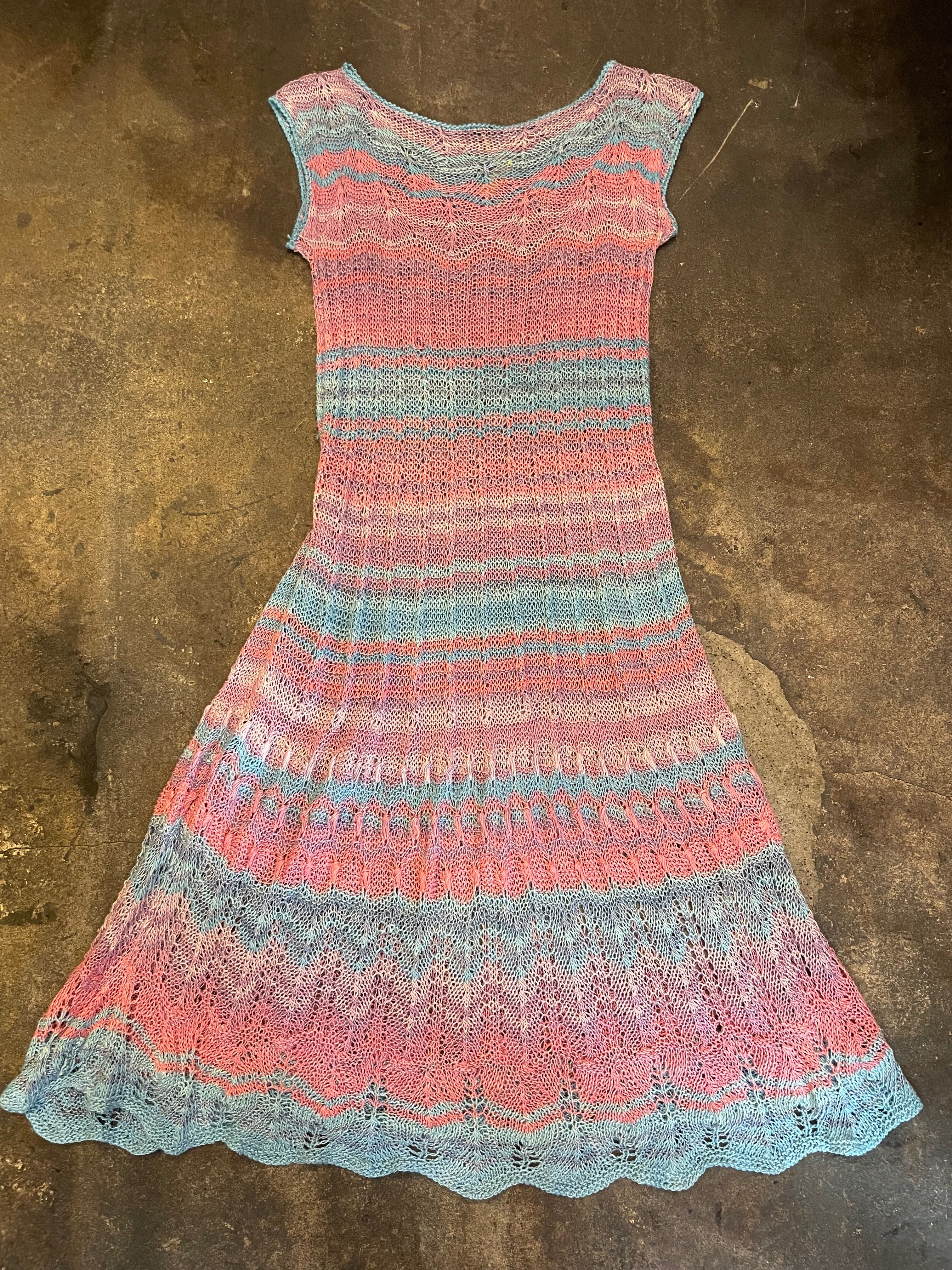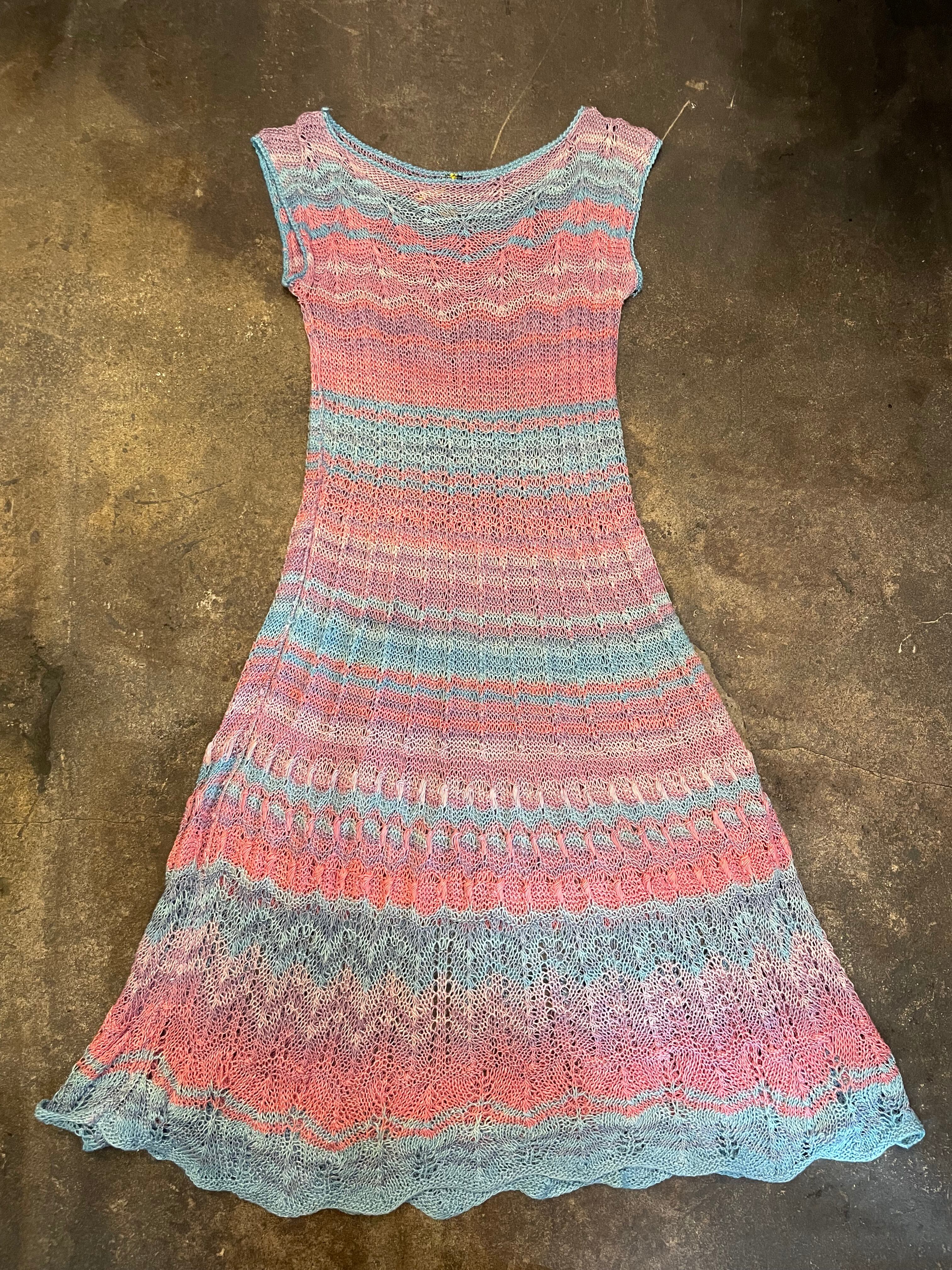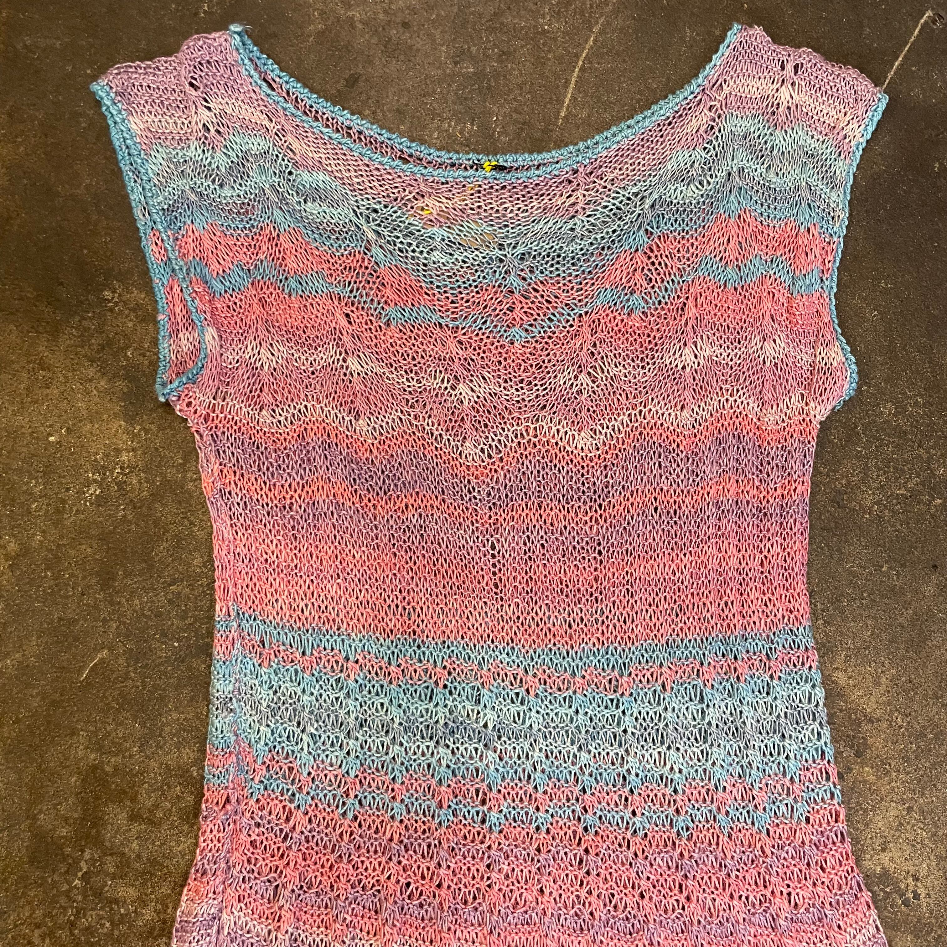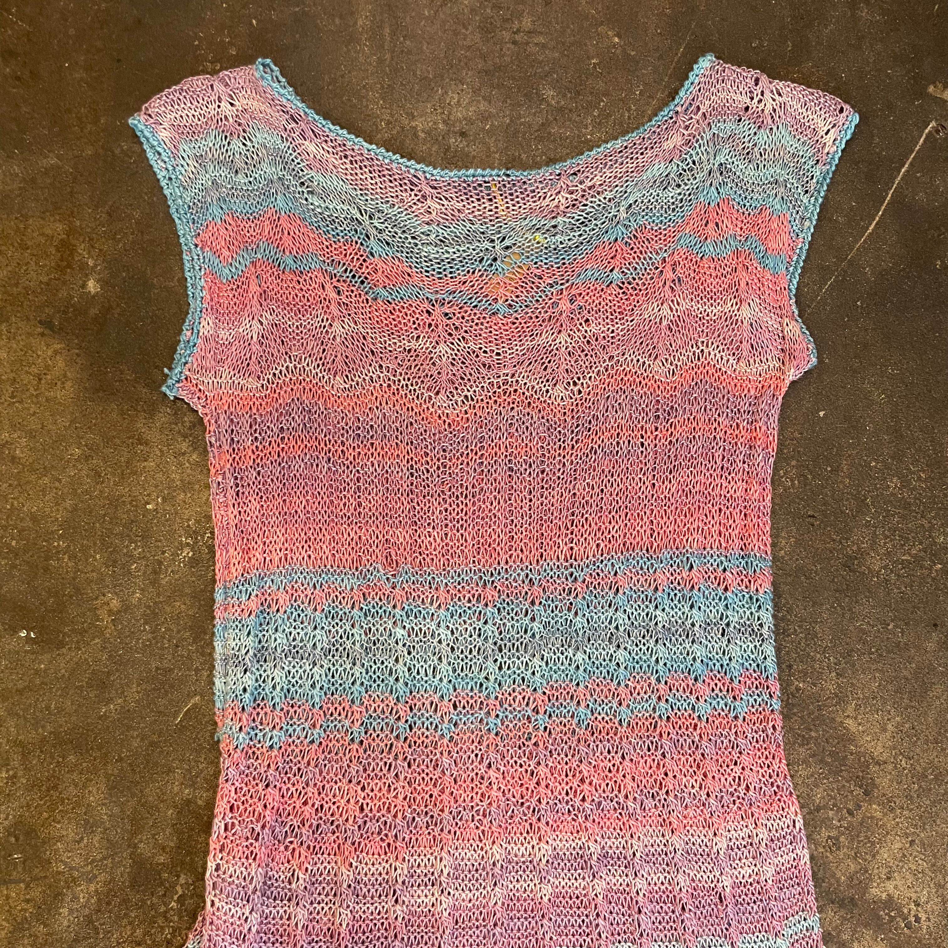 水色ピンクのグラデーションがかわいい、ニットワンピースです。パサっとした肌触りの糸で編まれていて爽やかですし涼しい一枚だと思います。