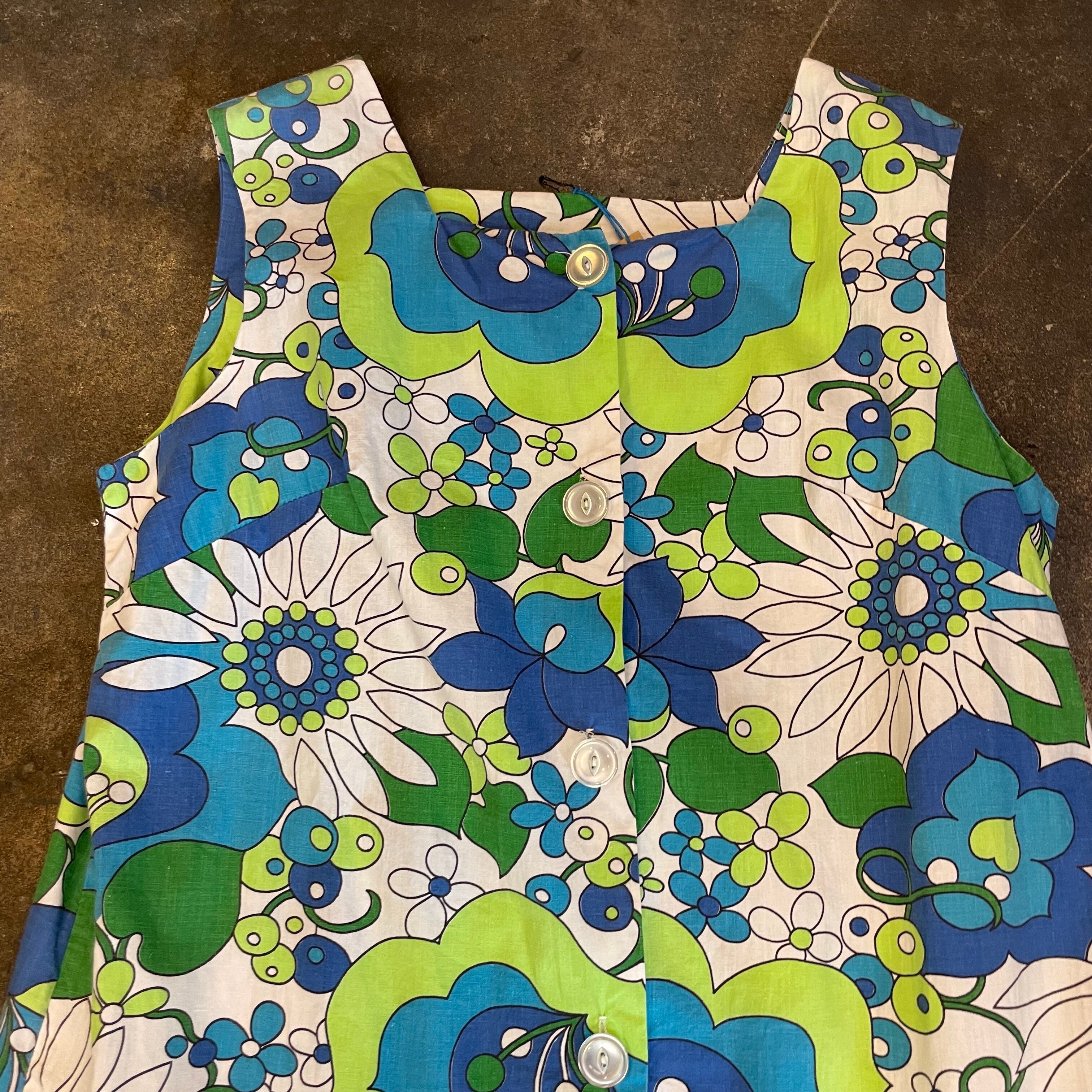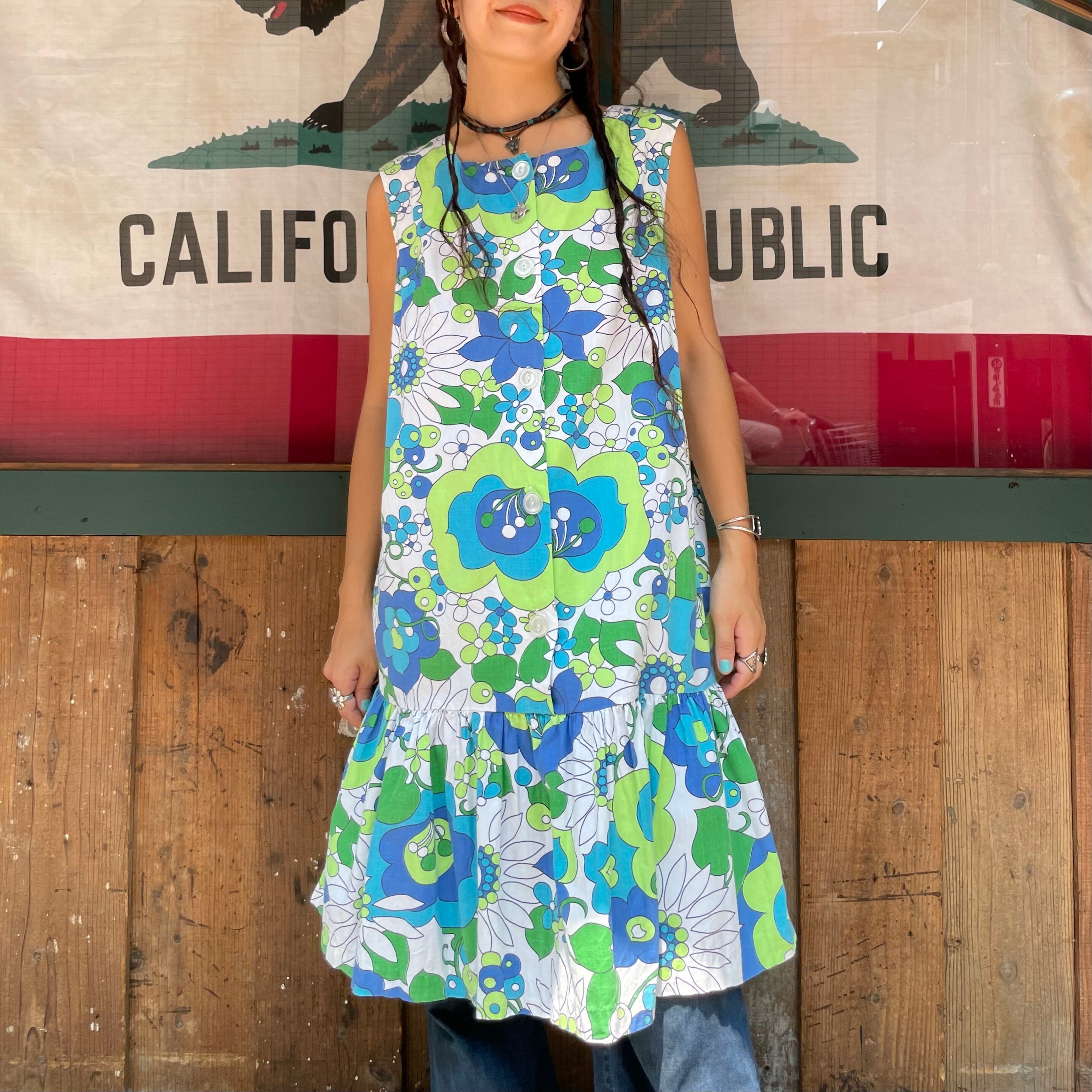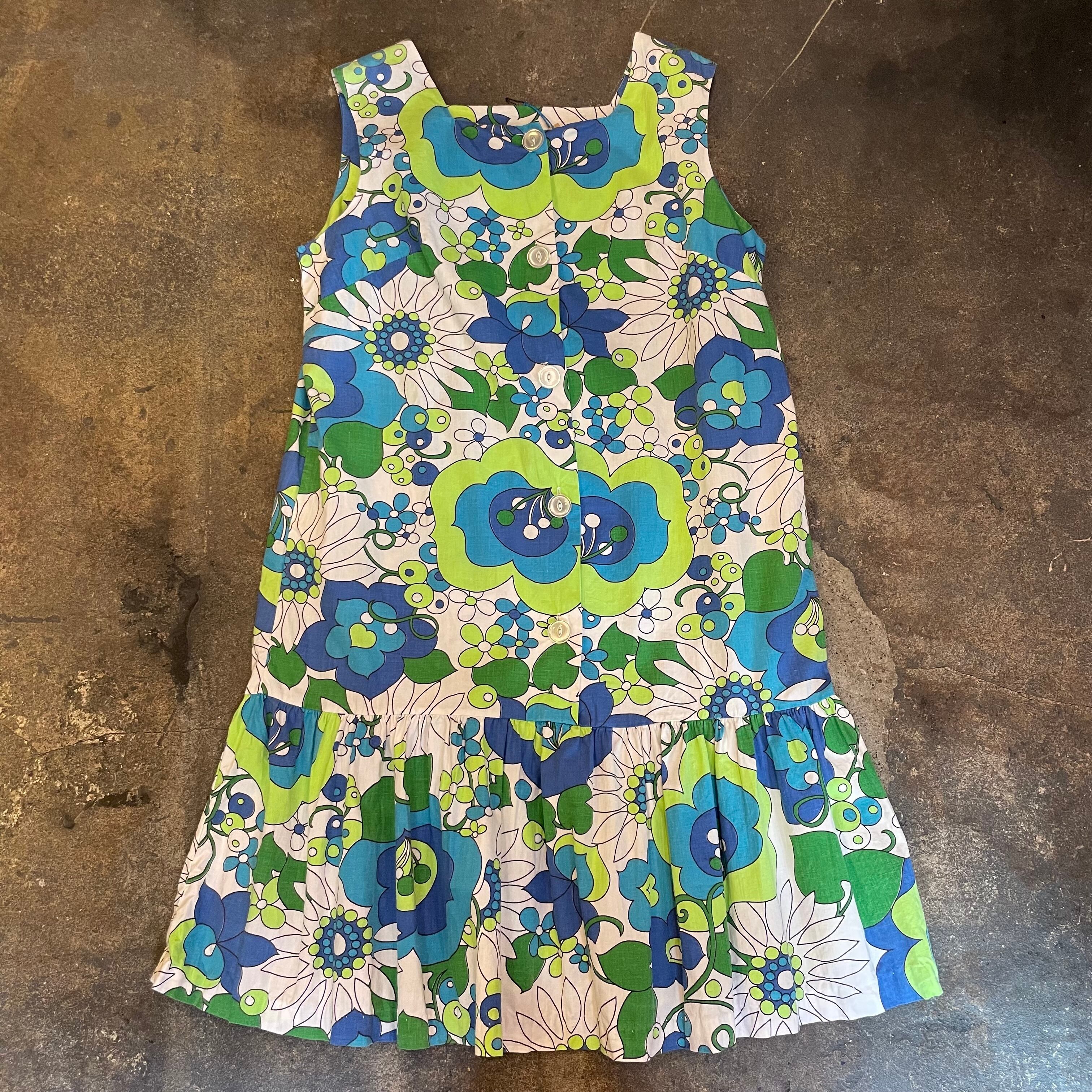 白ベースにレトロな青い花柄がかわいい60〜70年代頃のワンピースです。