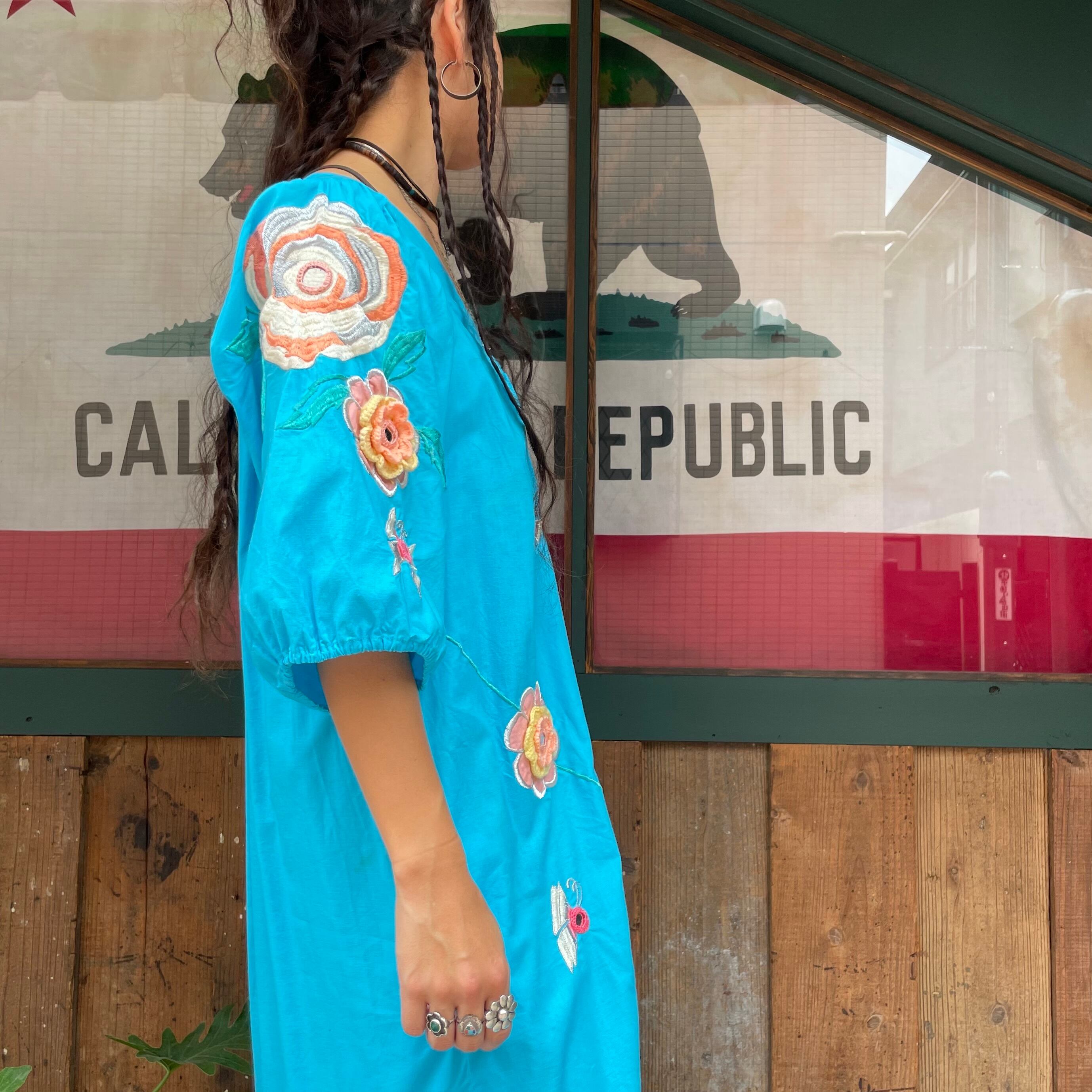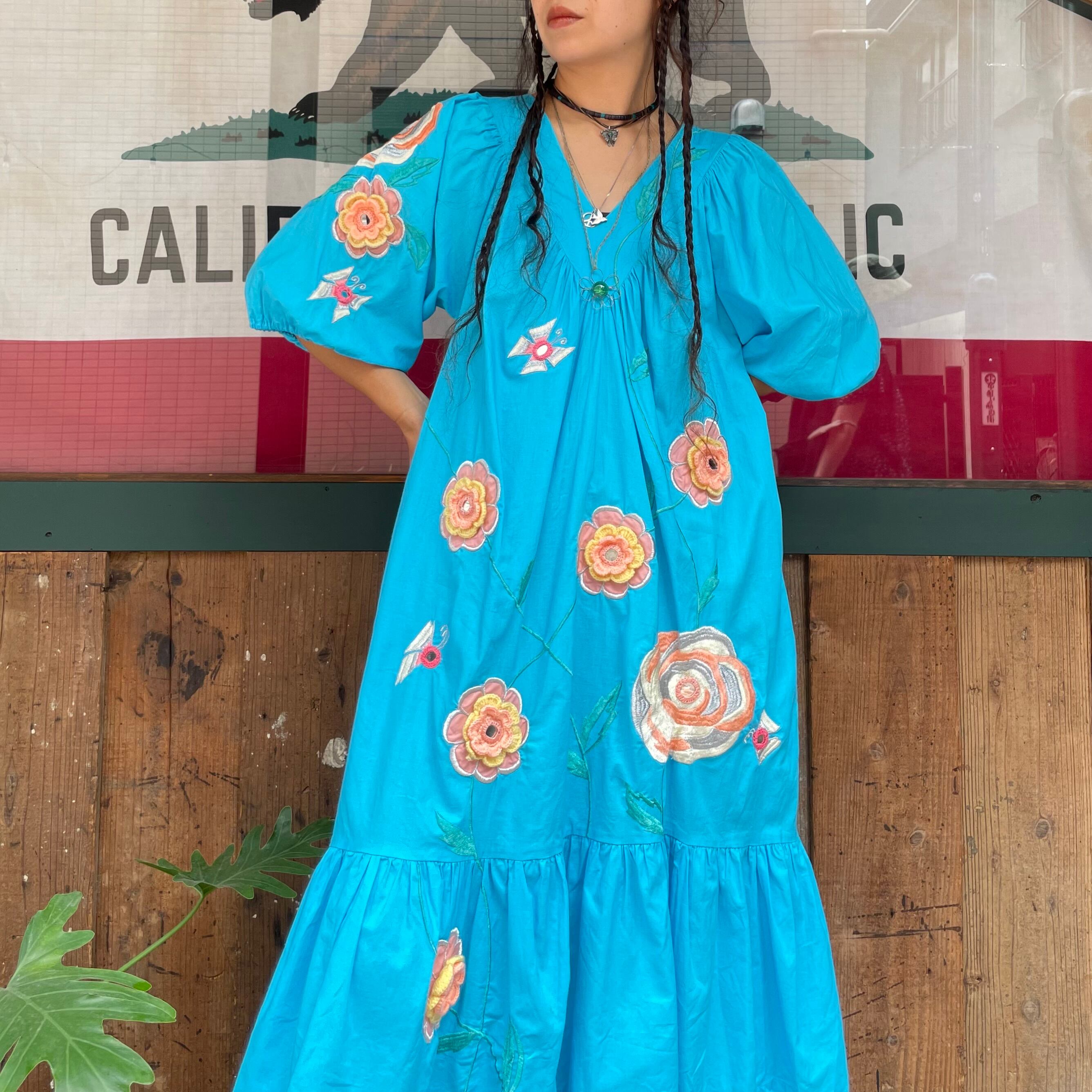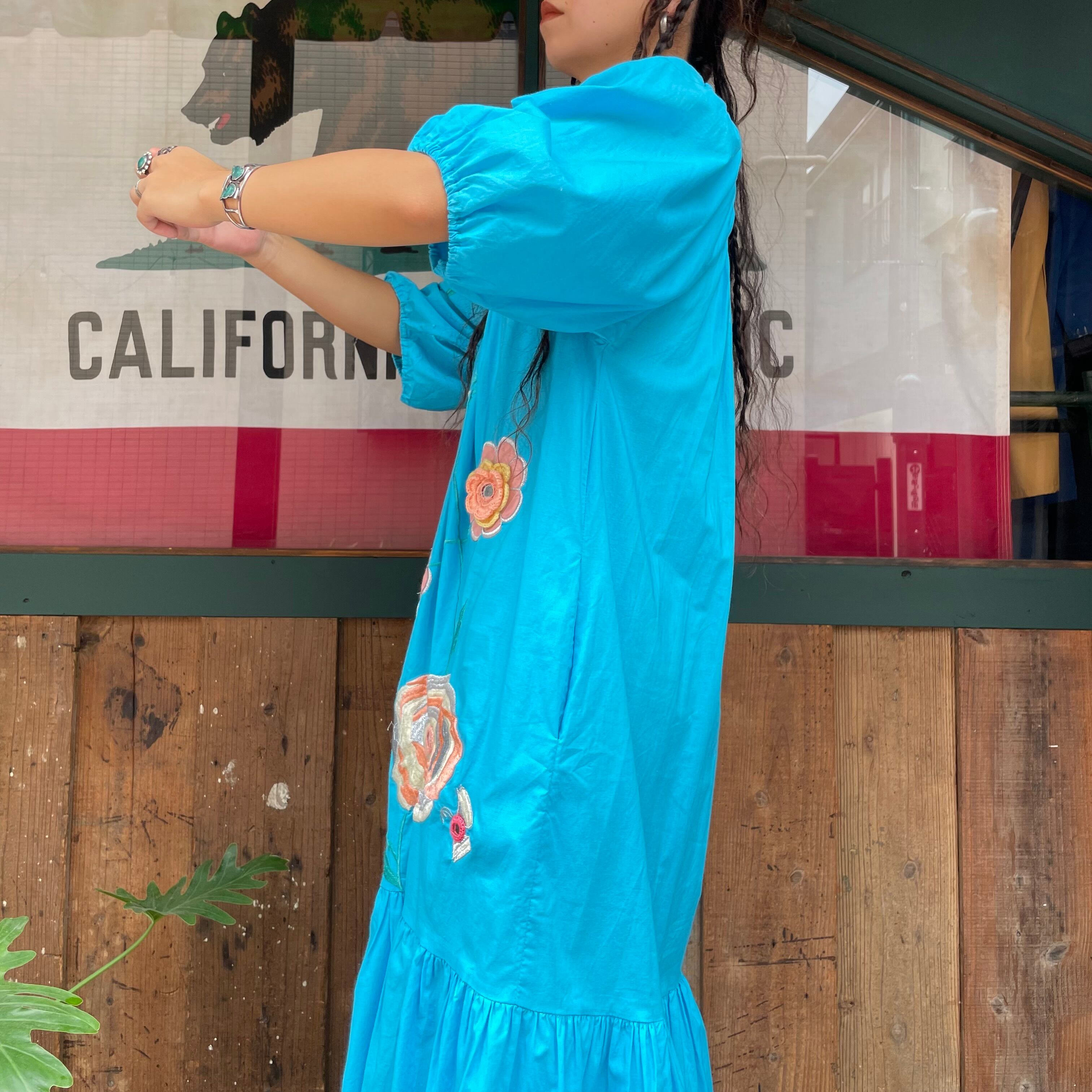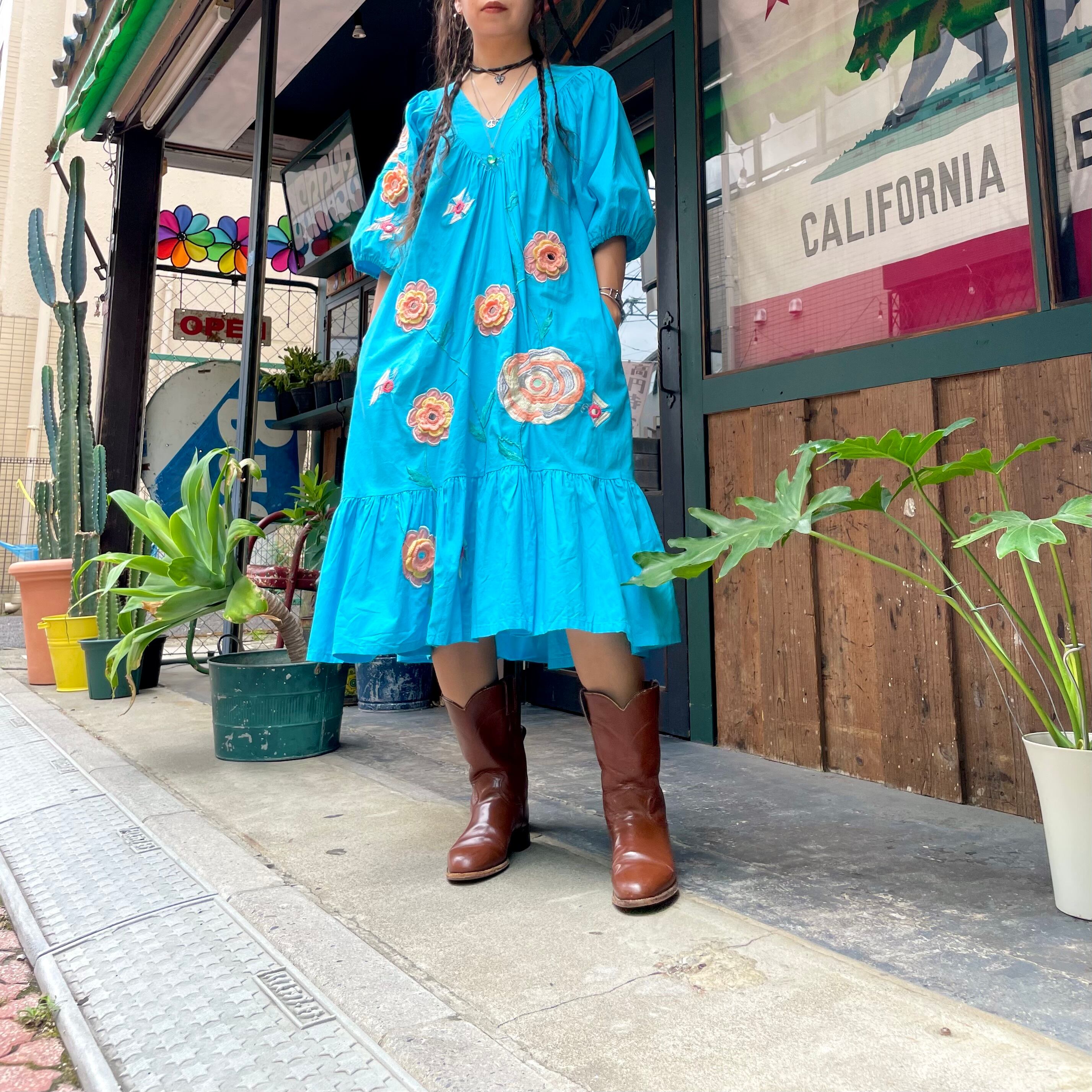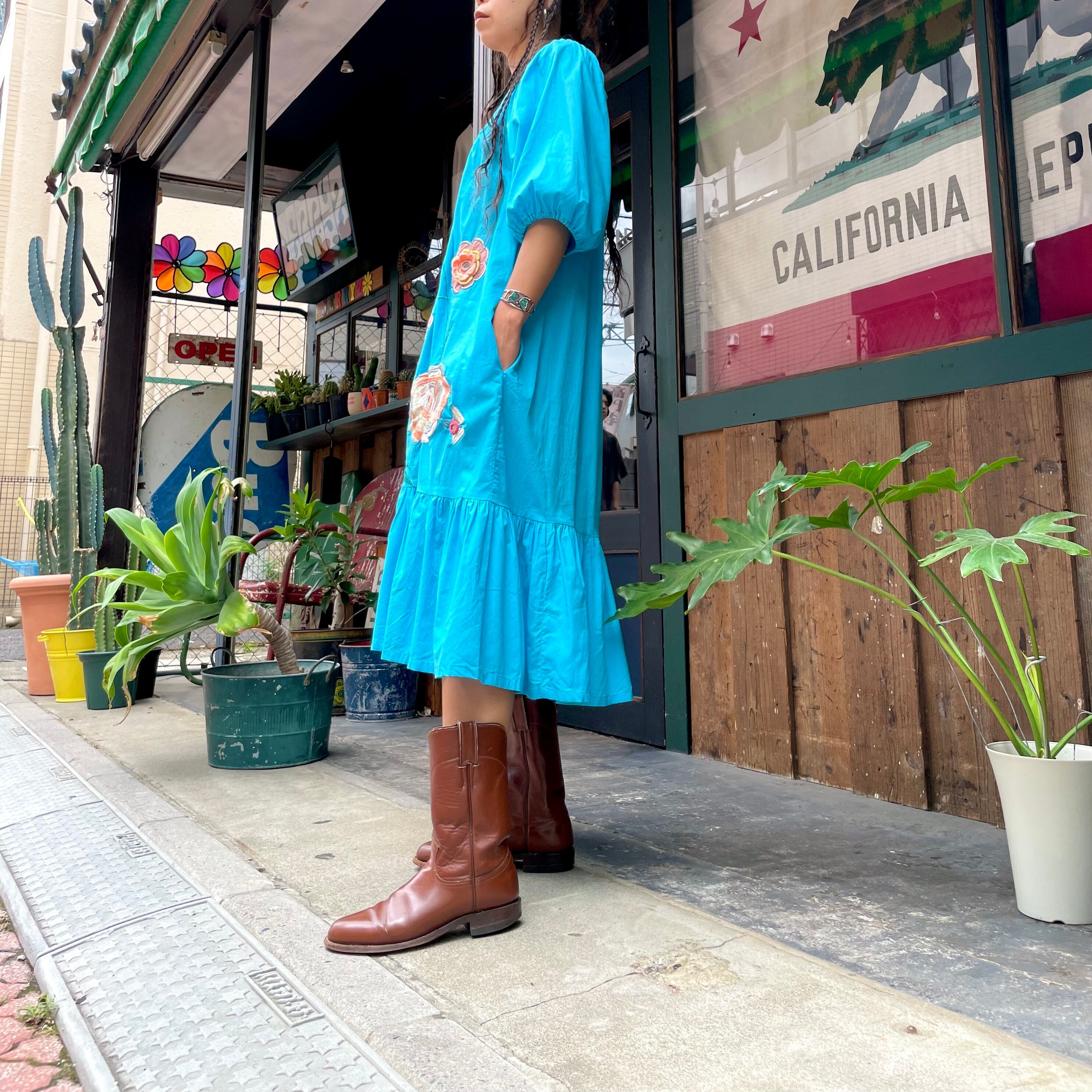 鮮やかな水色に優しいピンク系の装飾がかわいい、80年代頃のワンピースです。