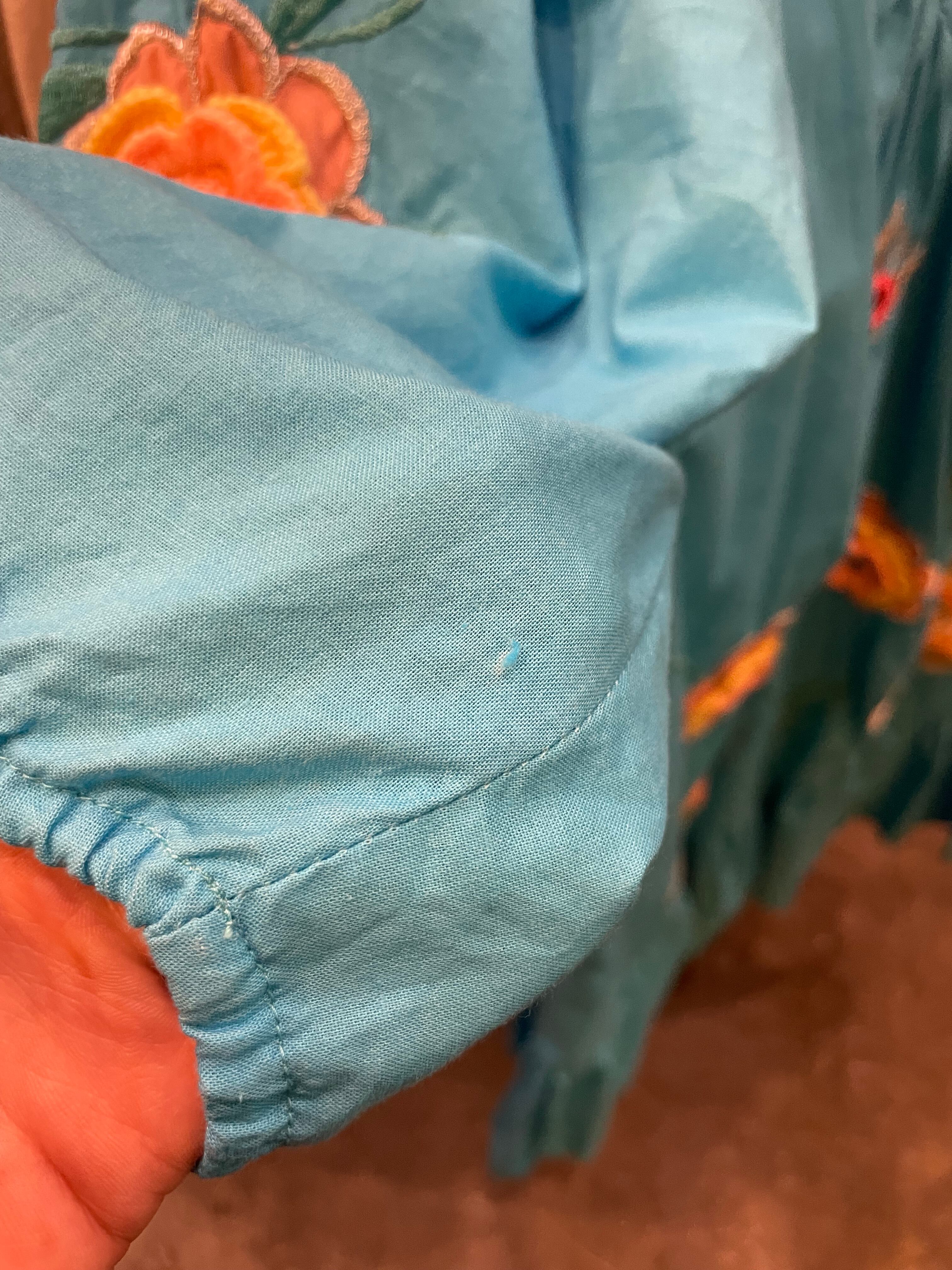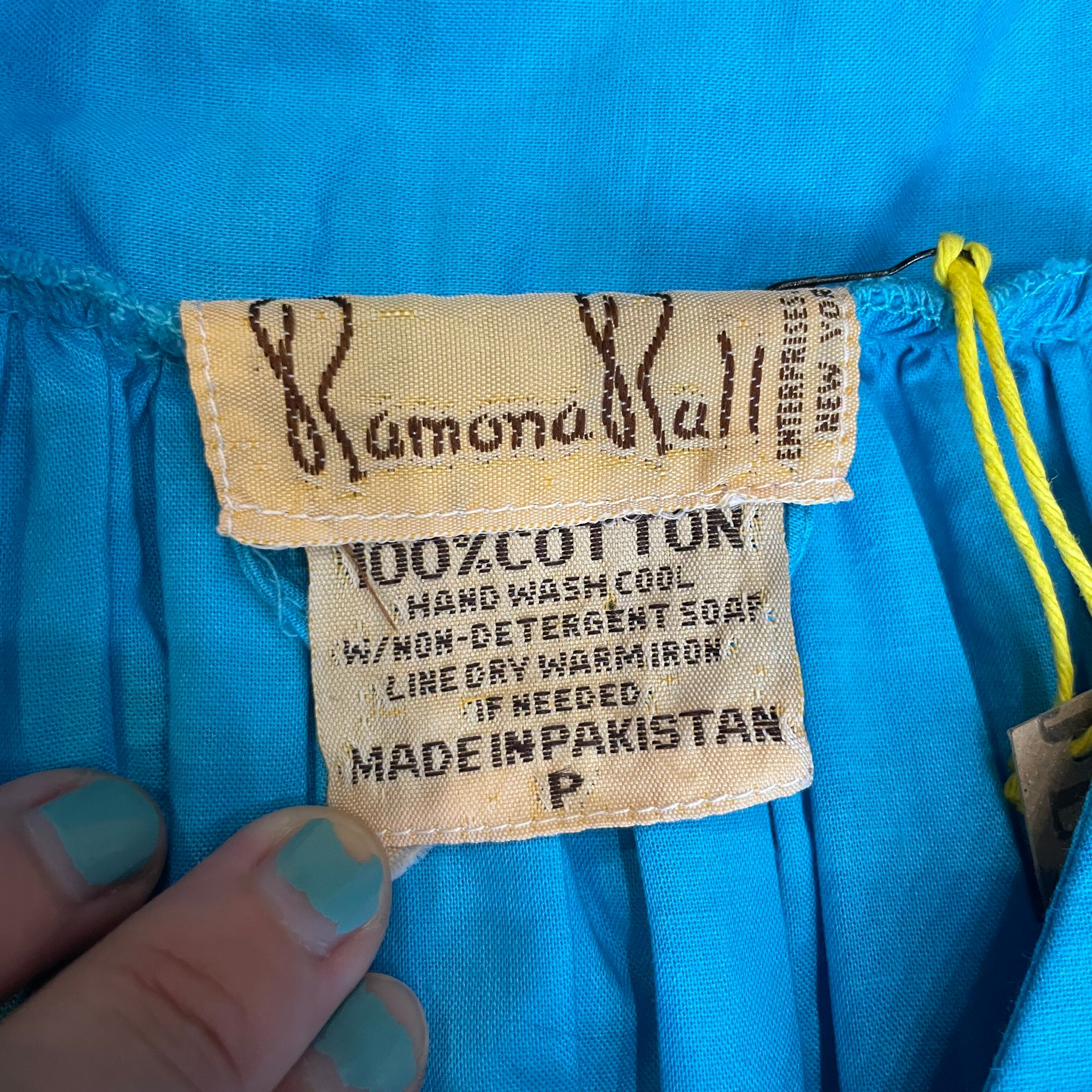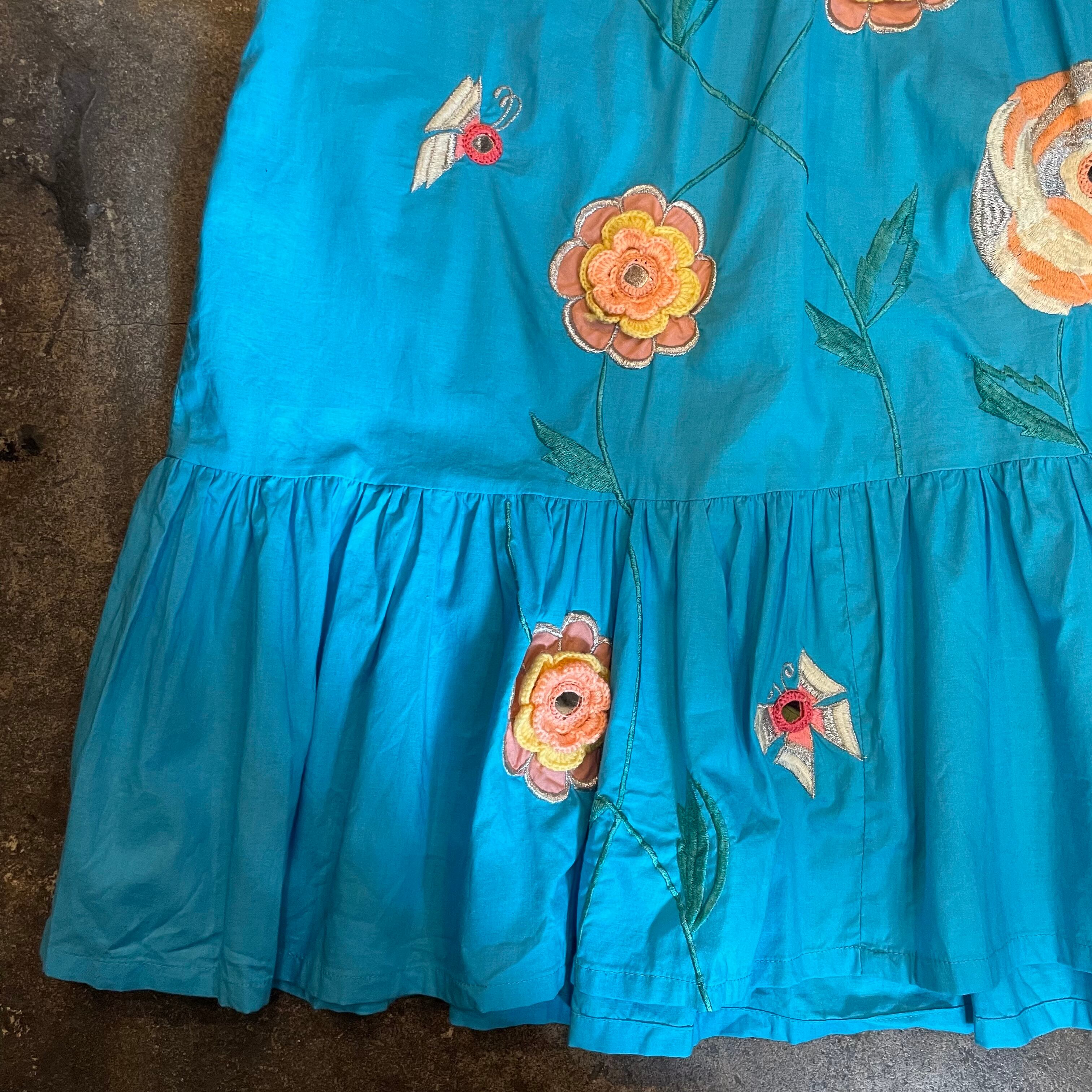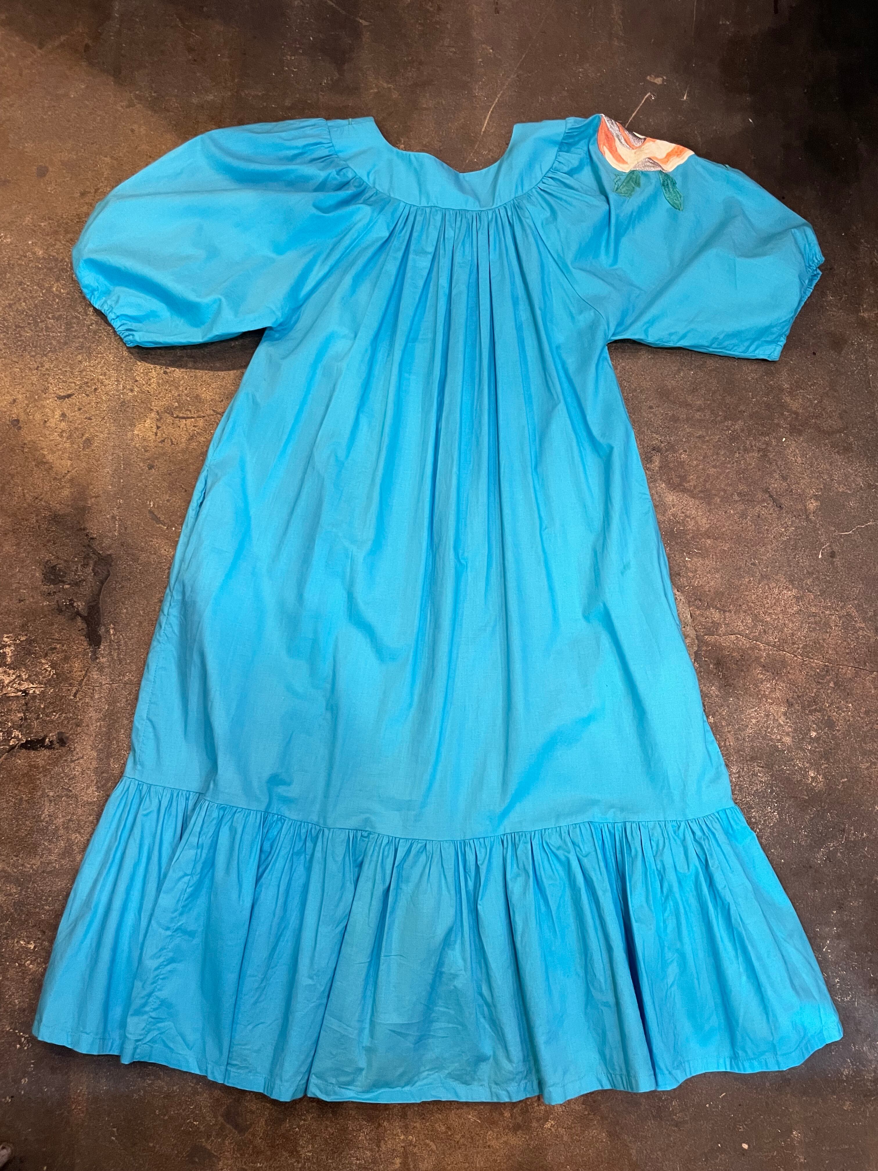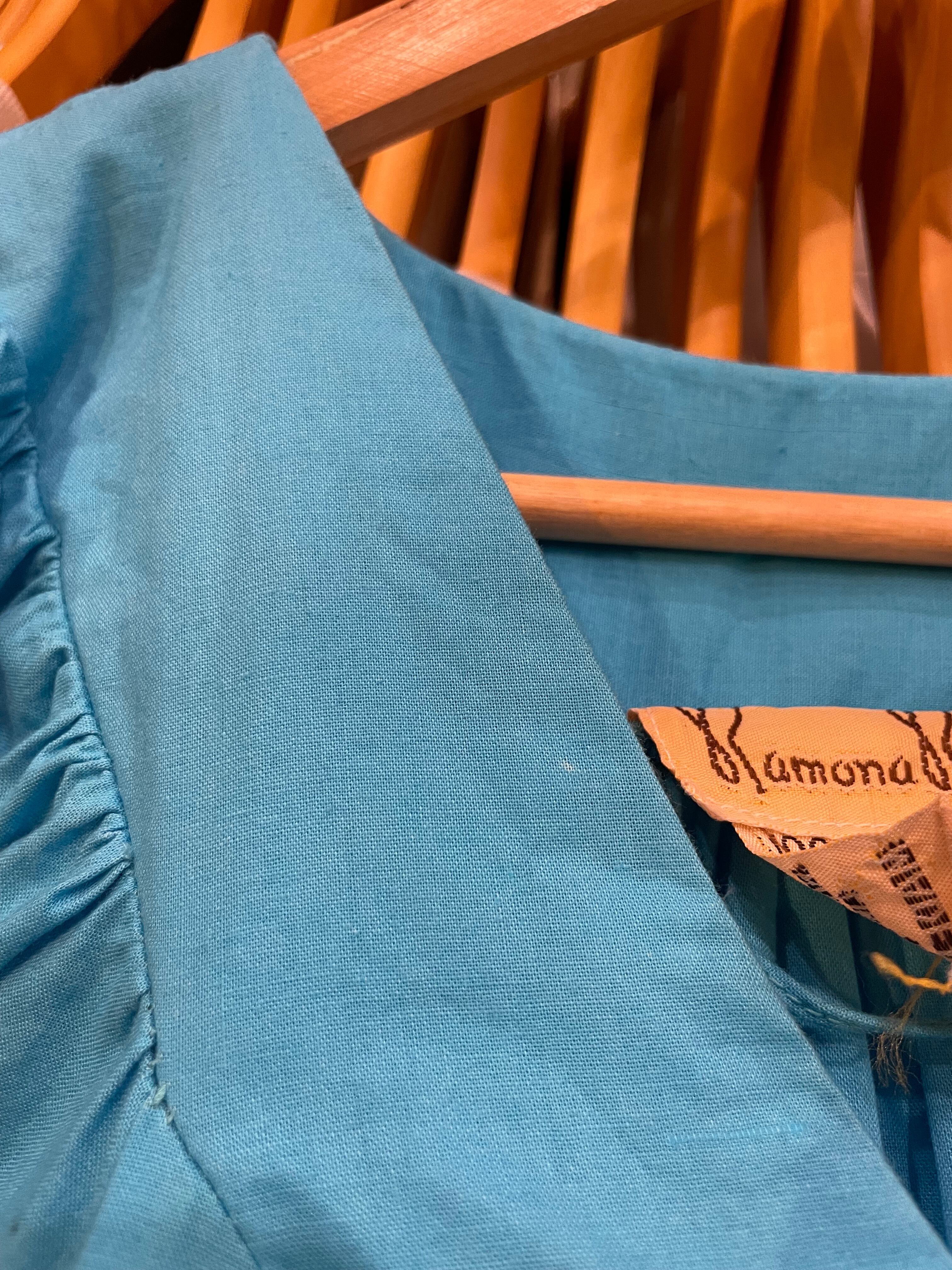 鮮やかな水色に優しいピンク系の装飾がかわいい、80年代頃のワンピースです。