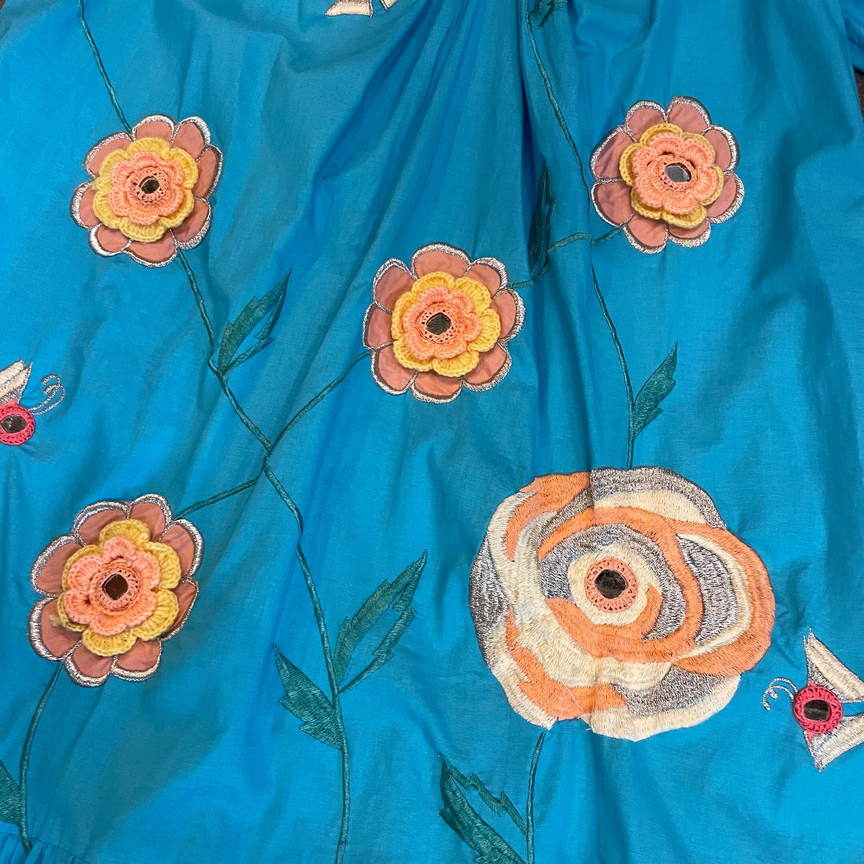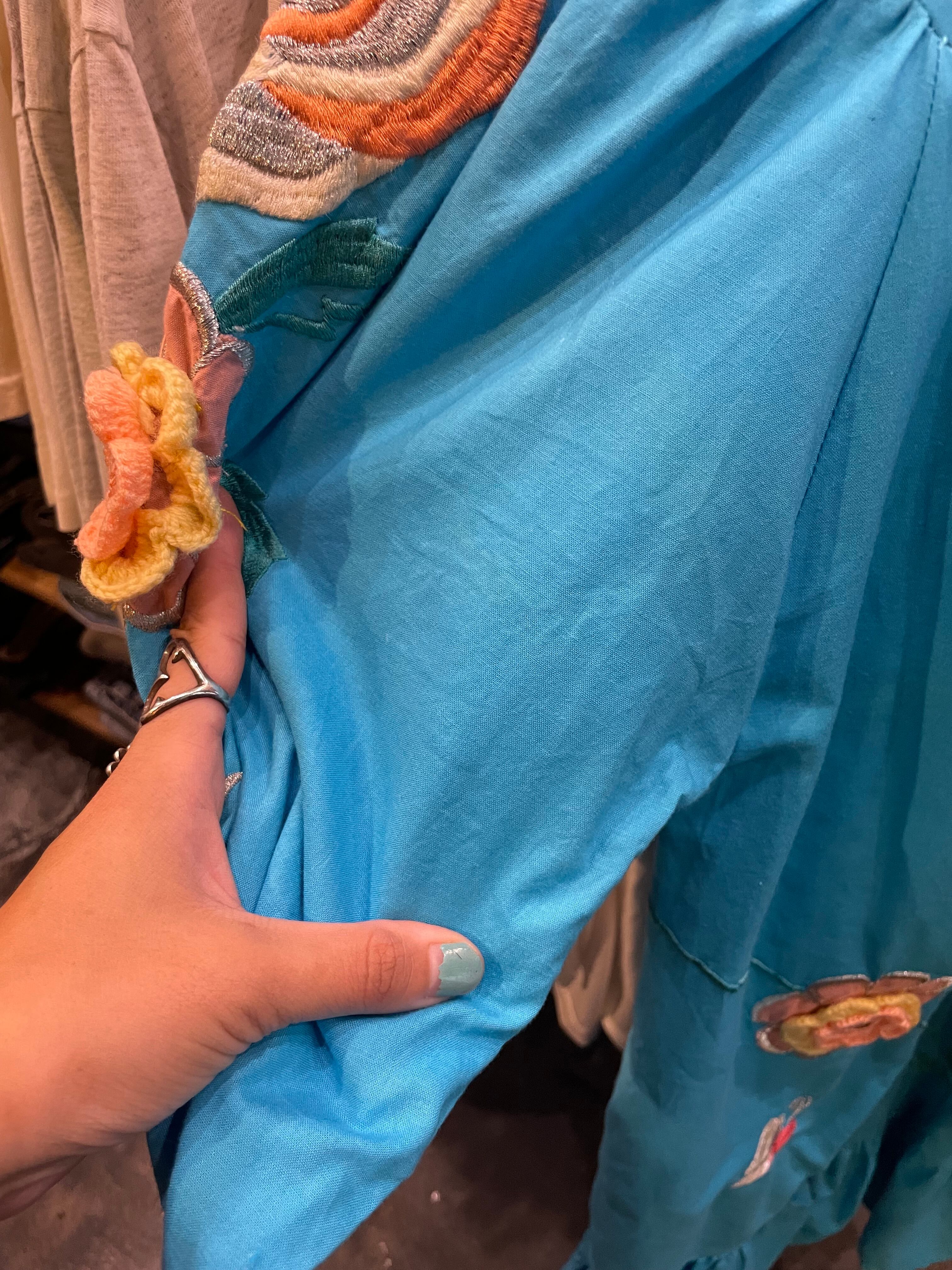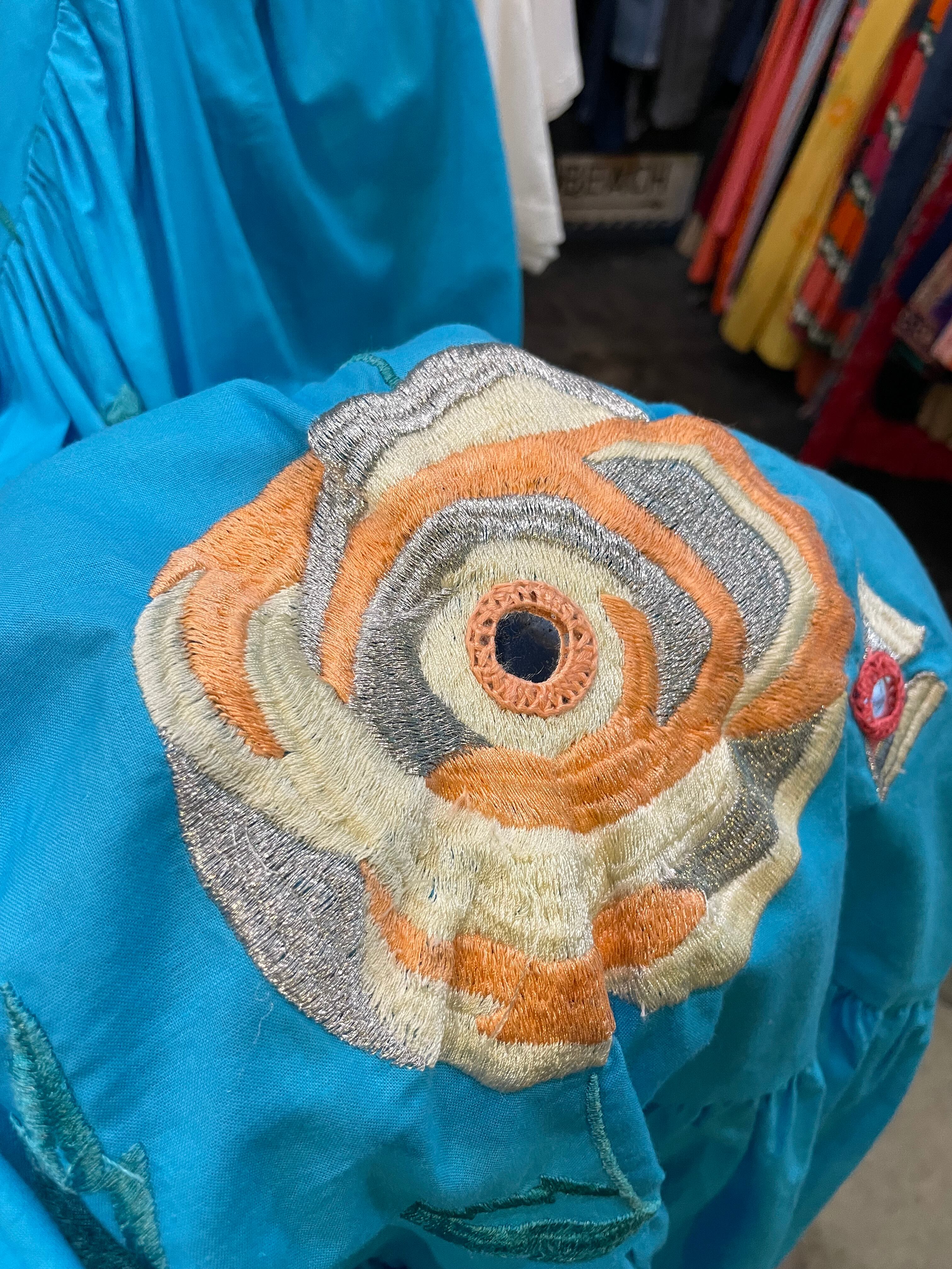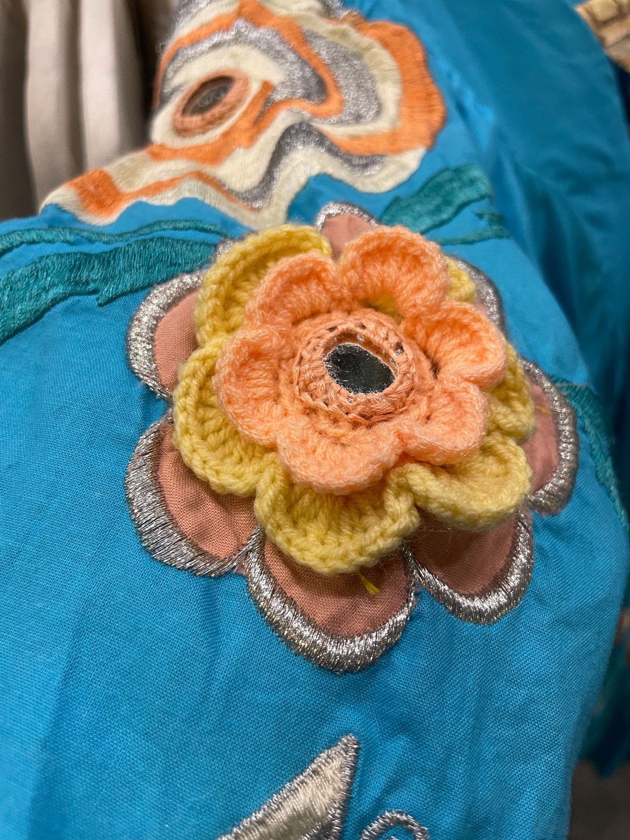 機械刺繍や手刺繍によるミラーワーク、手編みのお花のモチーフなど立体的でアシンメトリーでアーティスティックな柄がとても素敵ですね。