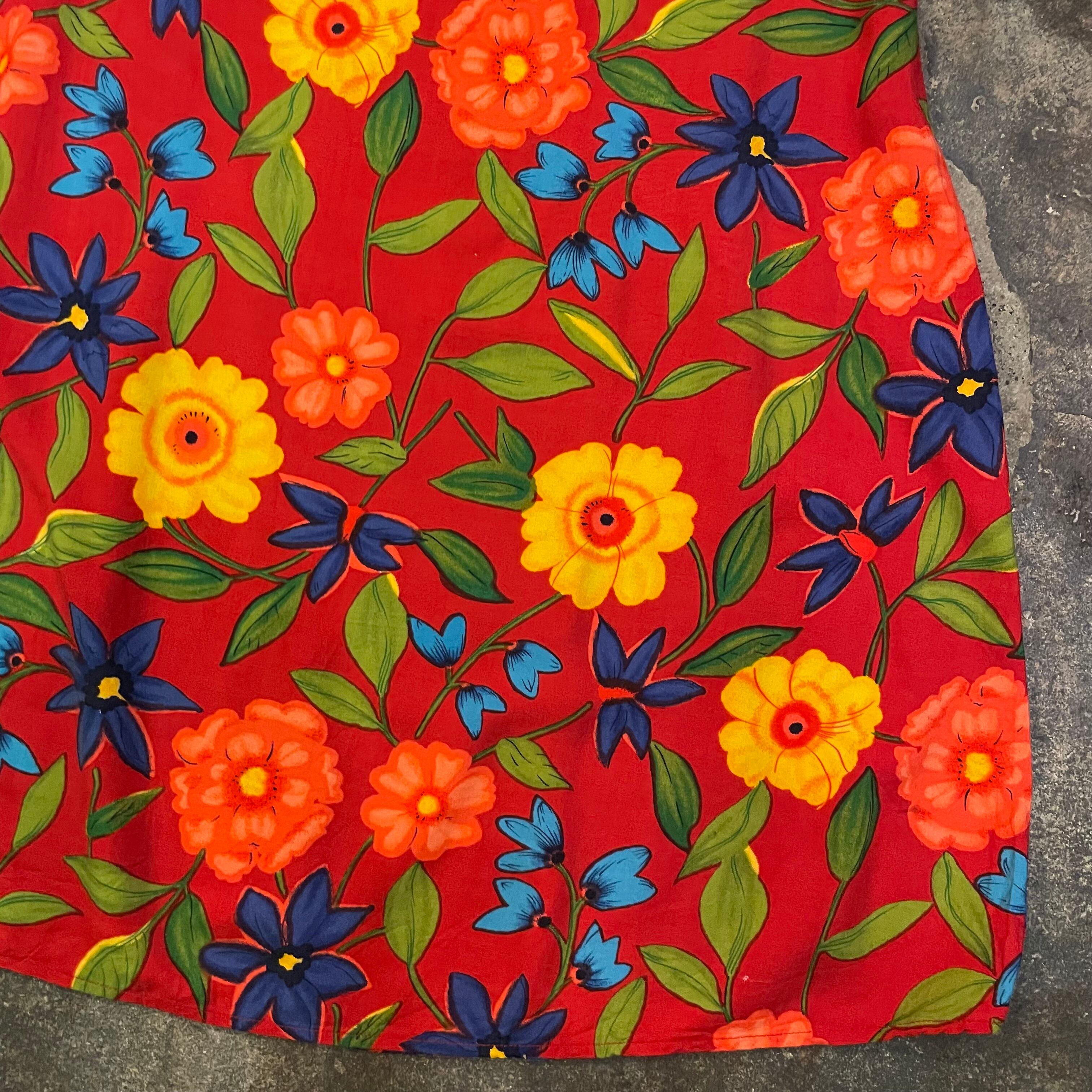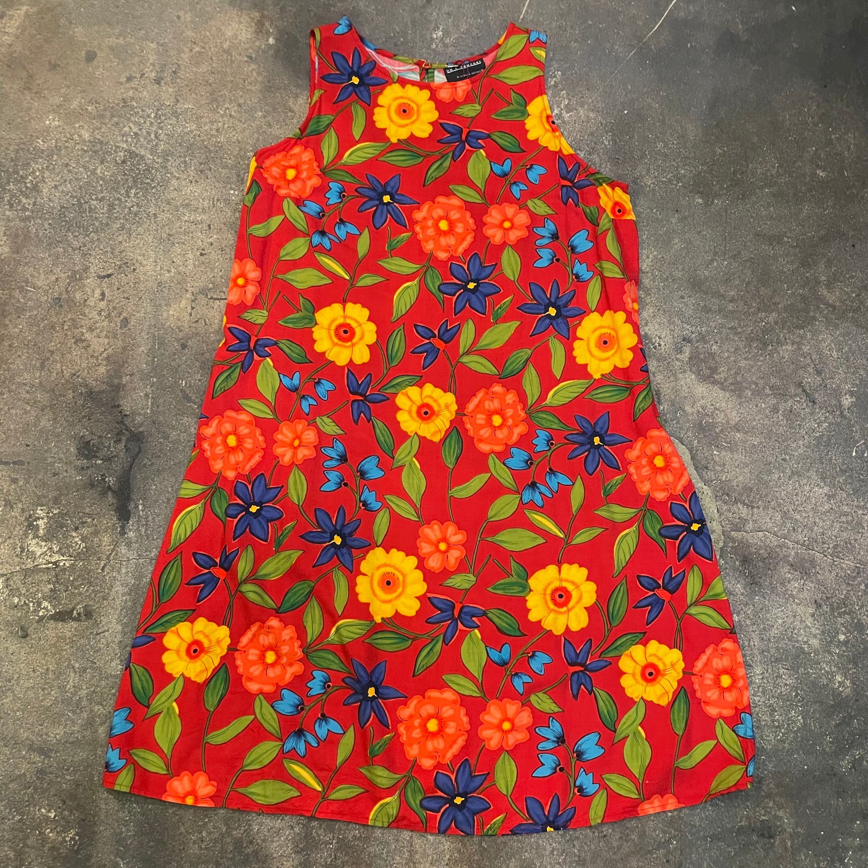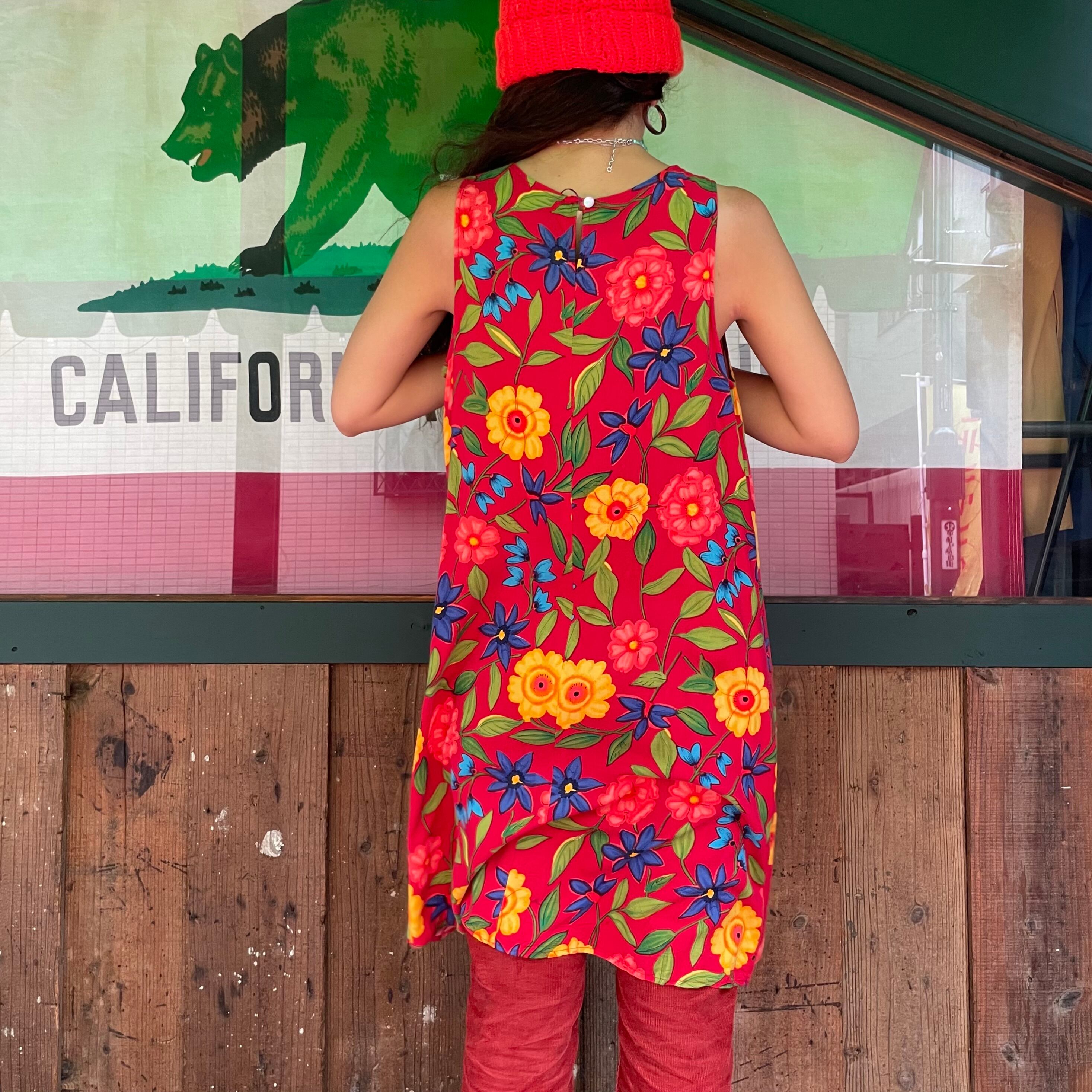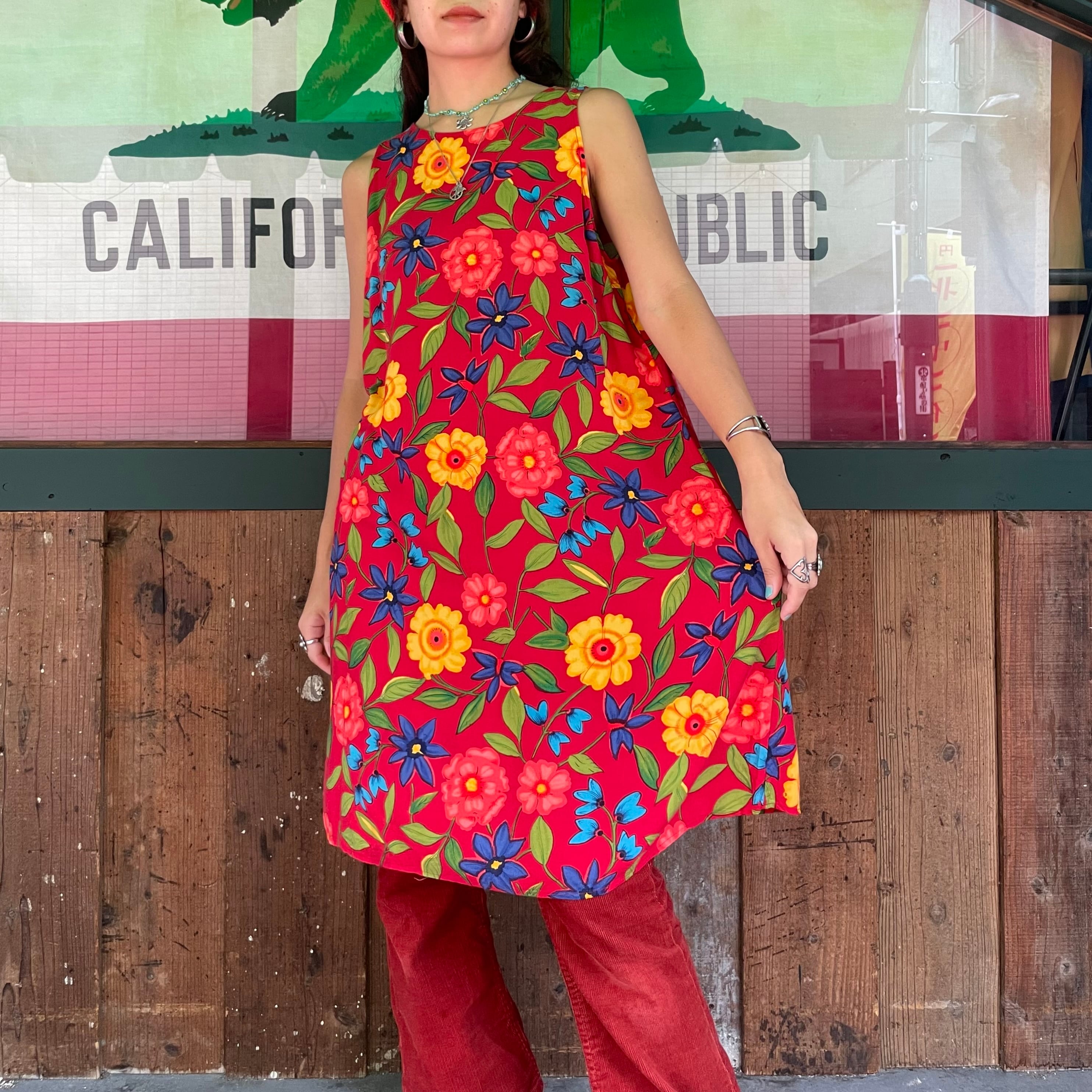 赤ベースに花柄がかわいいレーヨン素材のワンピースです。コンパクトなサイズ感で激しめな色味な柄でなんだか雰囲気のある一枚です。