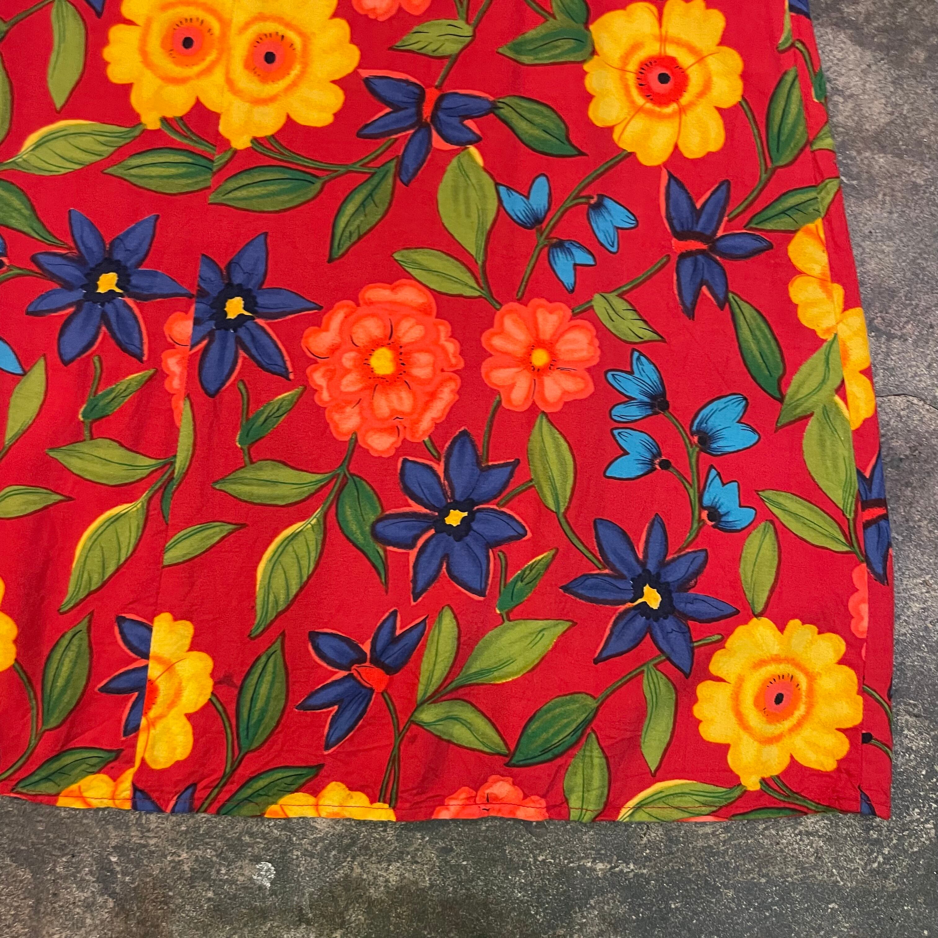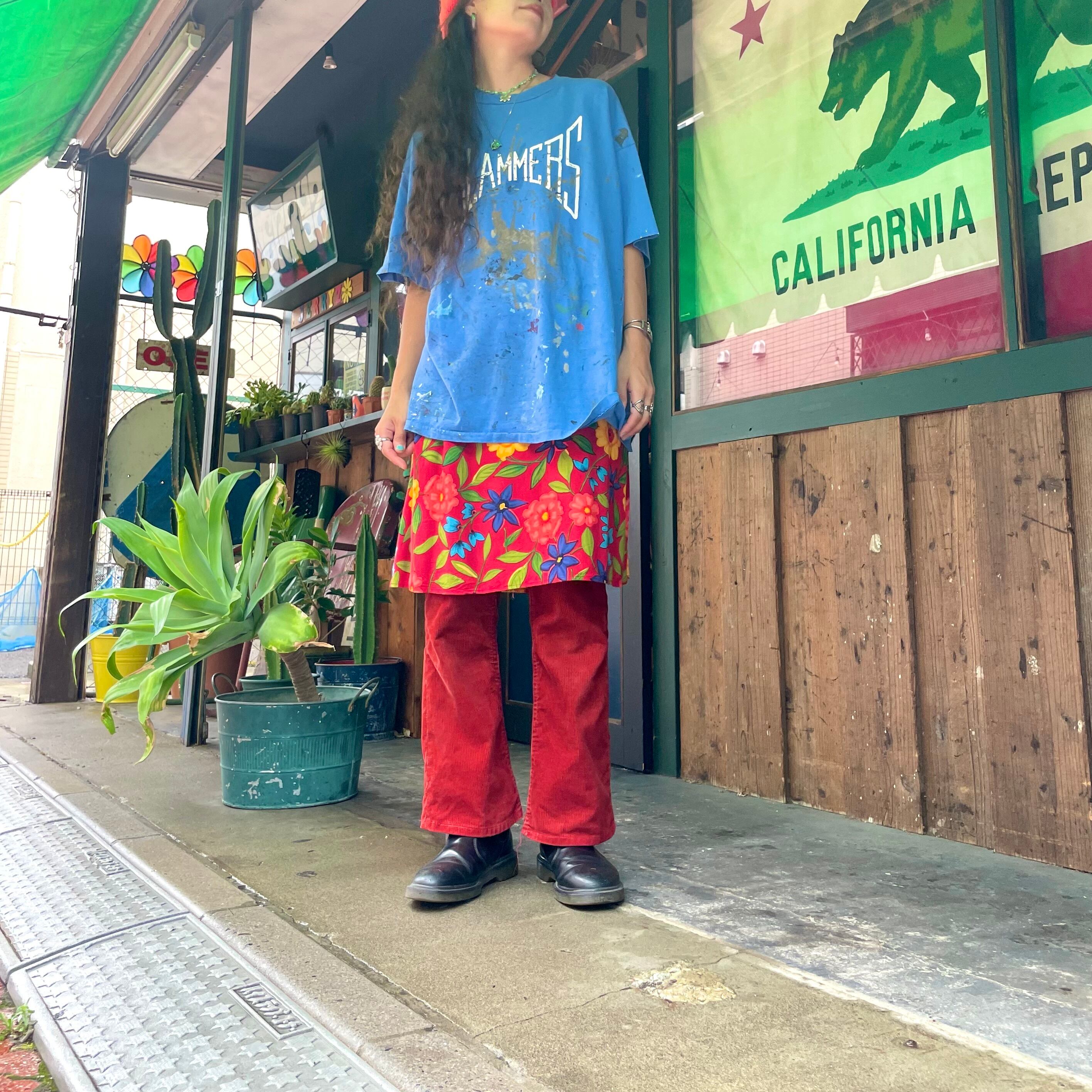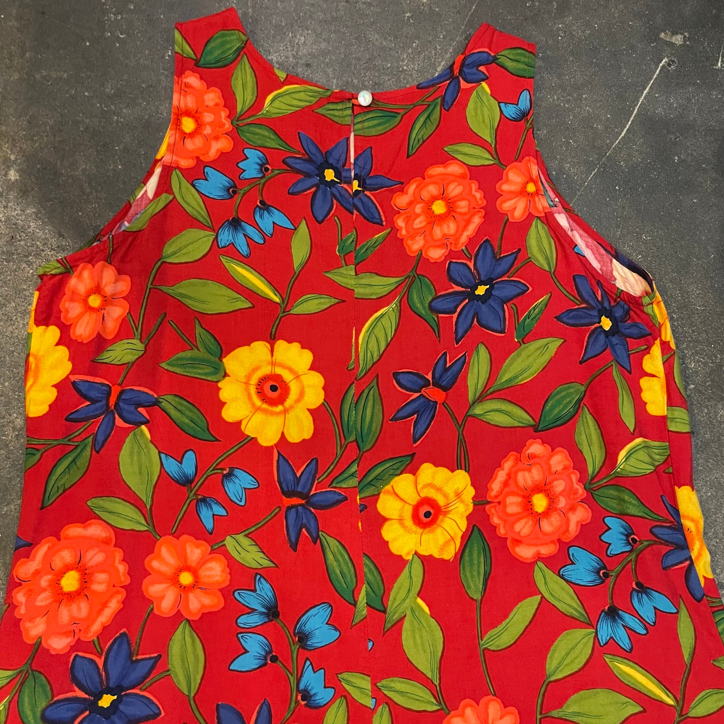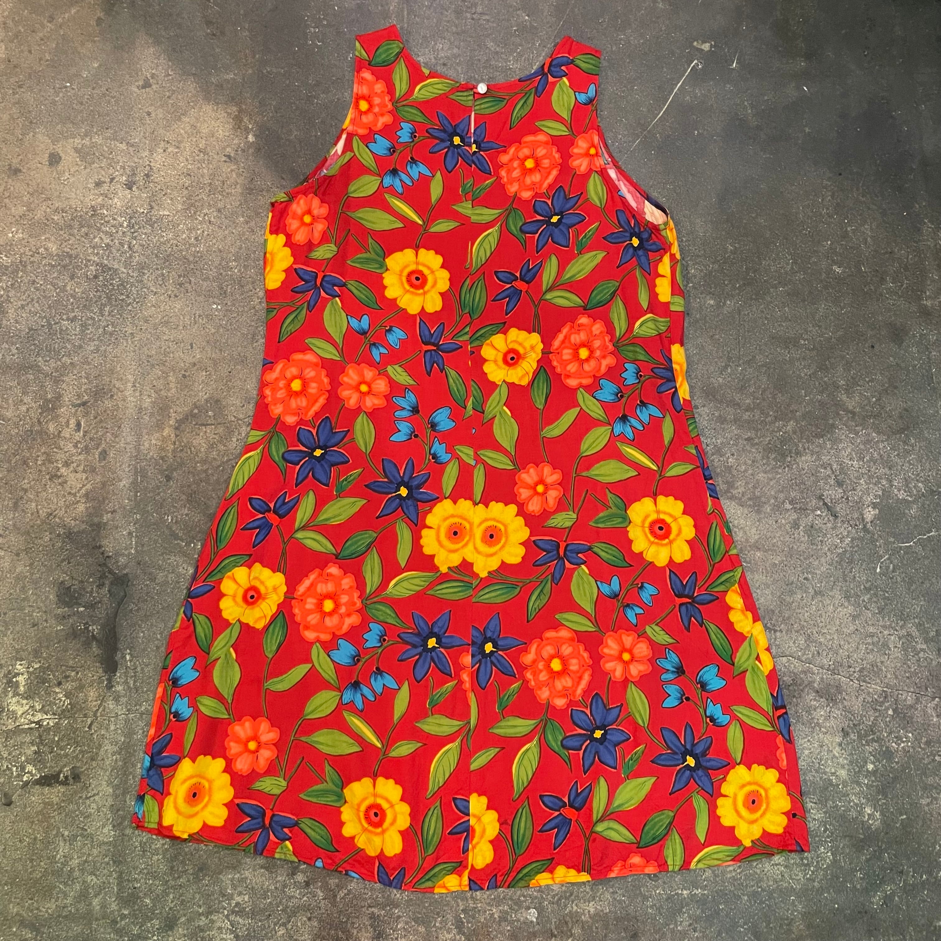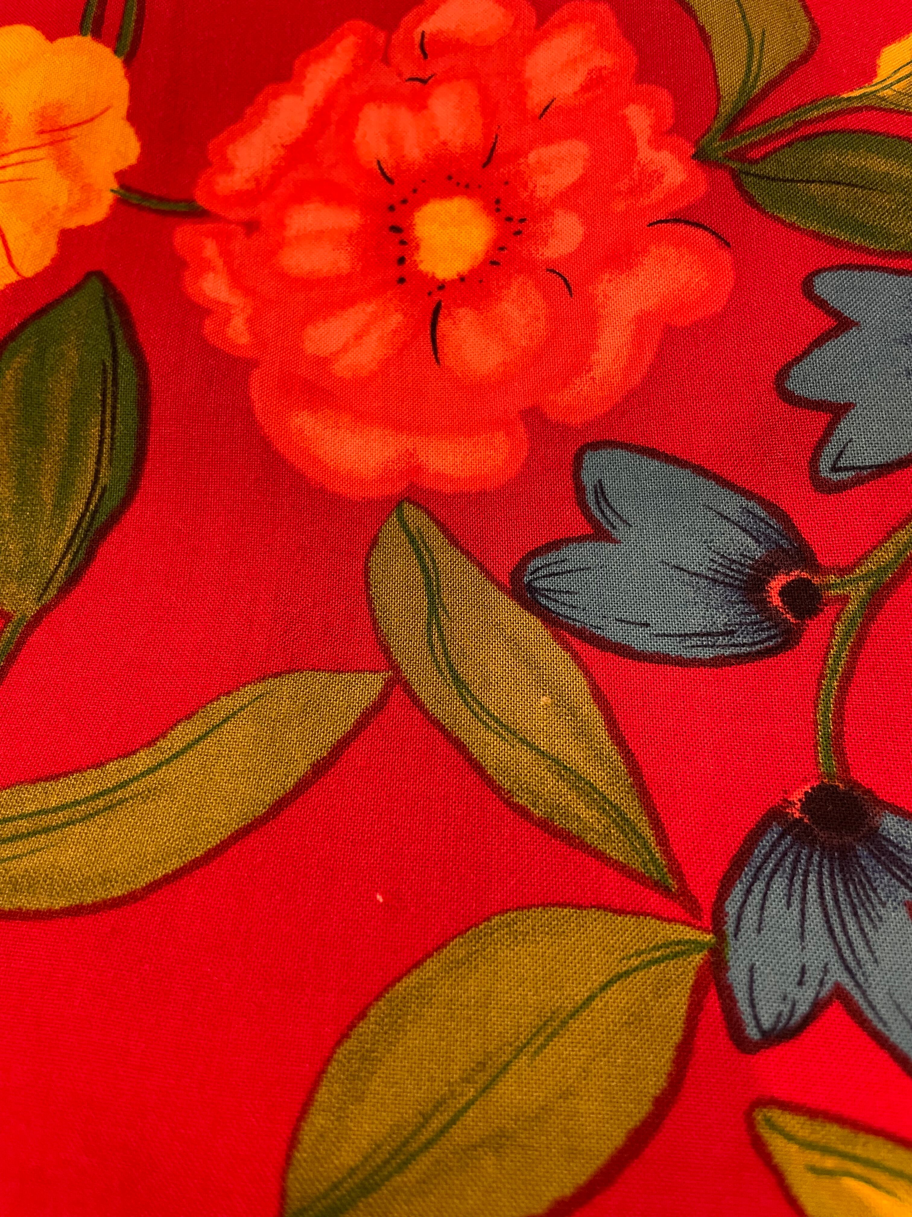赤ベースに花柄がかわいいレーヨン素材のワンピースです。コンパクトなサイズ感で激しめな色味な柄でなんだか雰囲気のある一枚です。