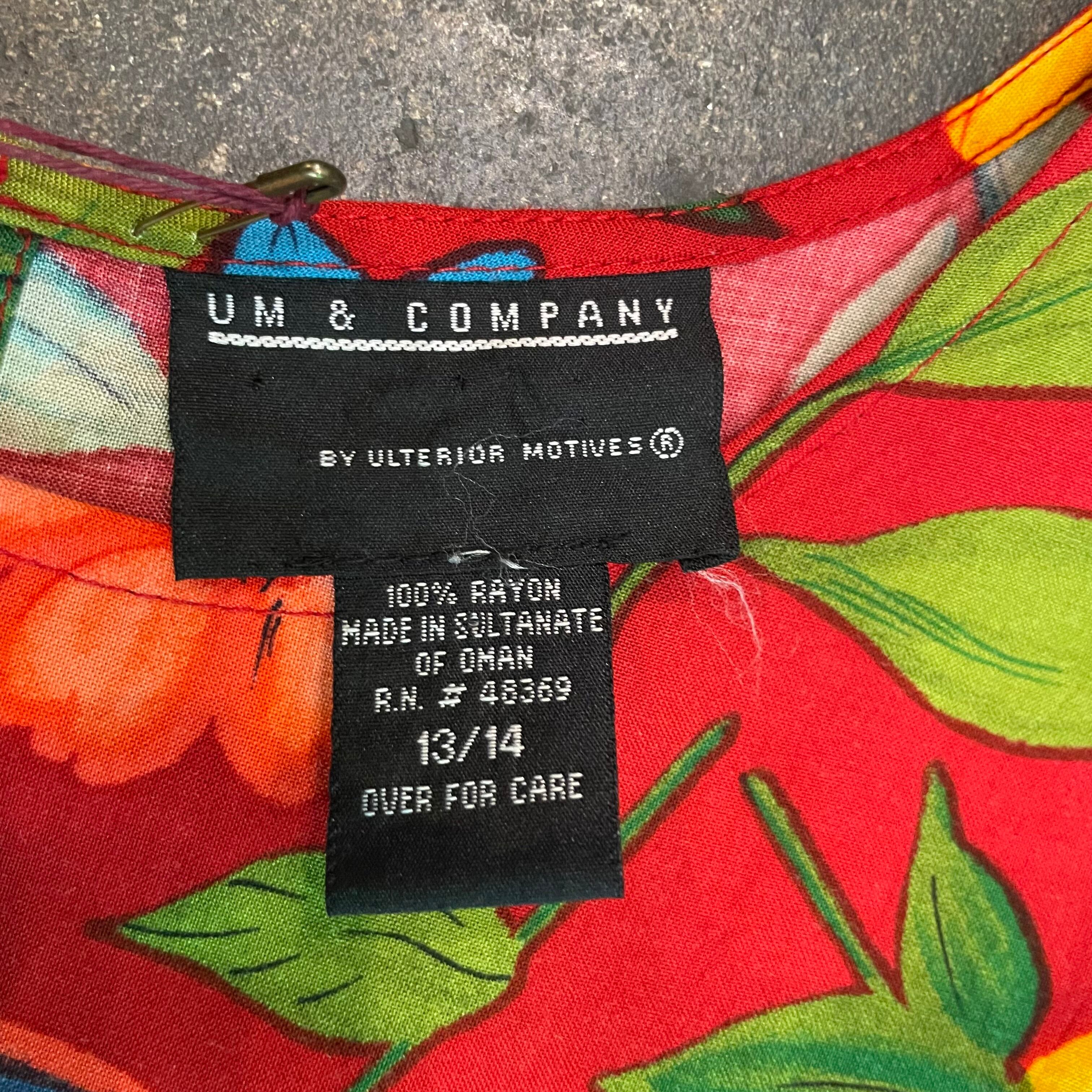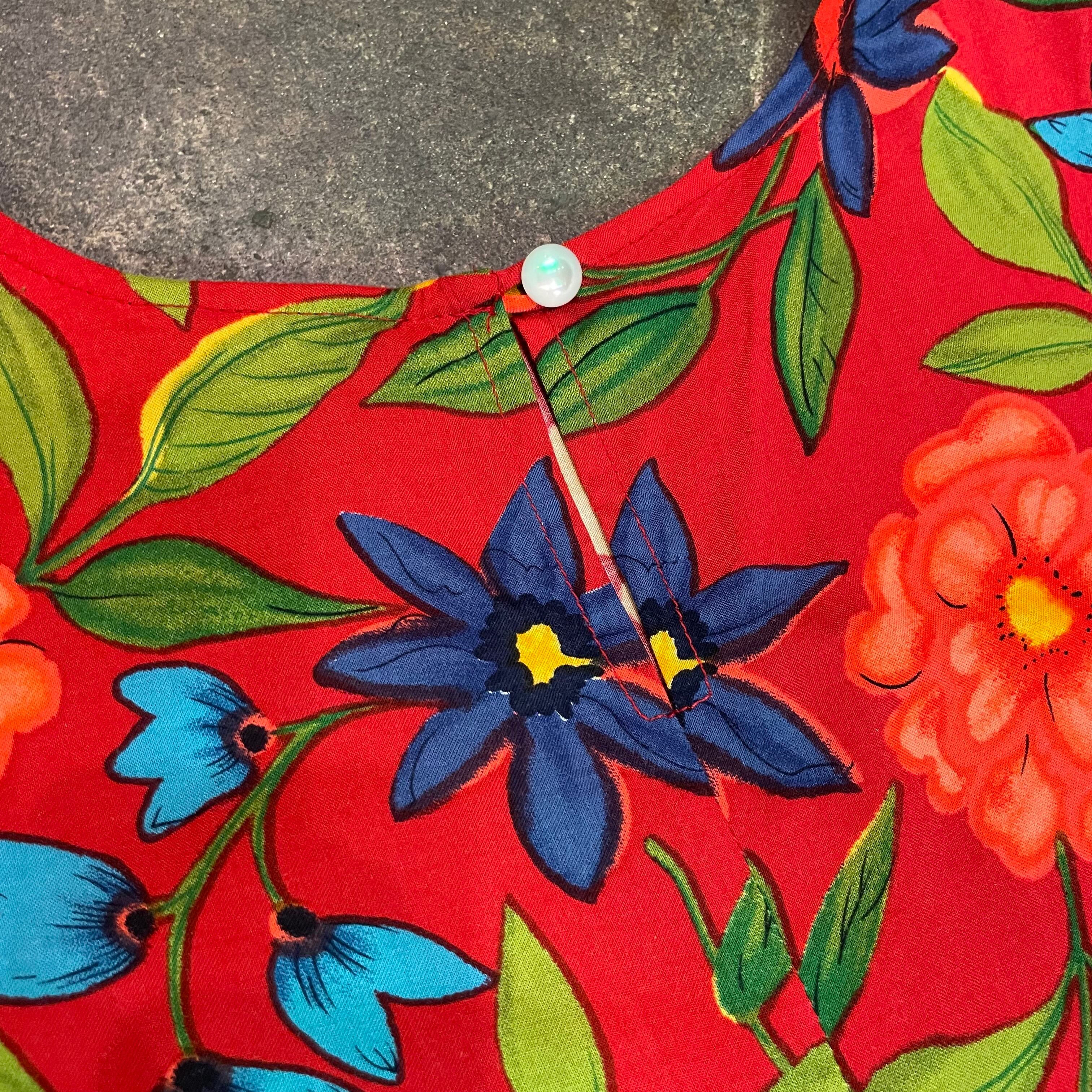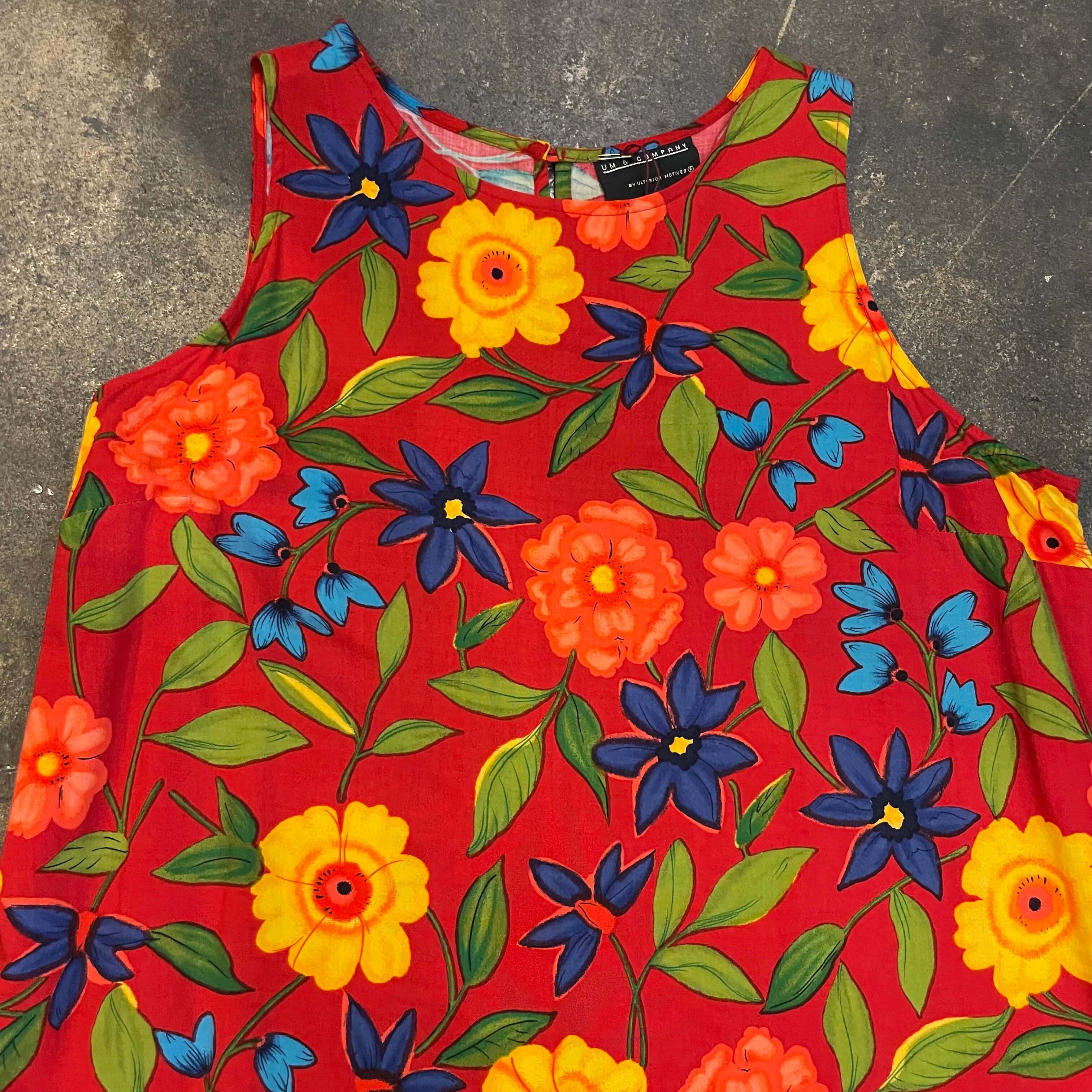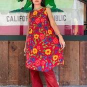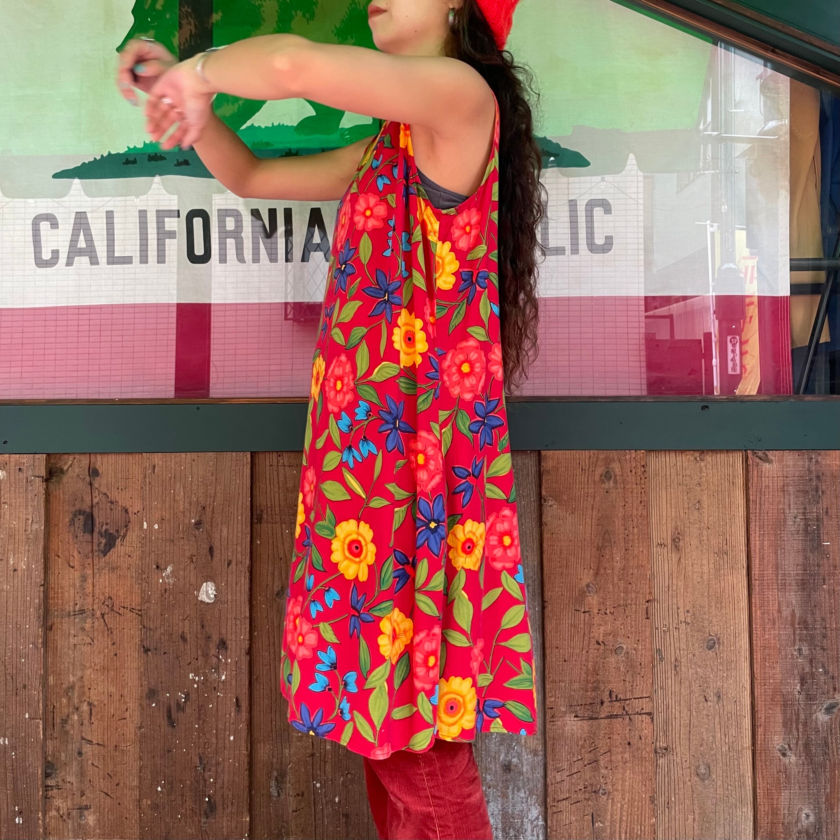 赤ベースに花柄がかわいいレーヨン素材のワンピースです。コンパクトなサイズ感で激しめな色味な柄でなんだか雰囲気のある一枚です。