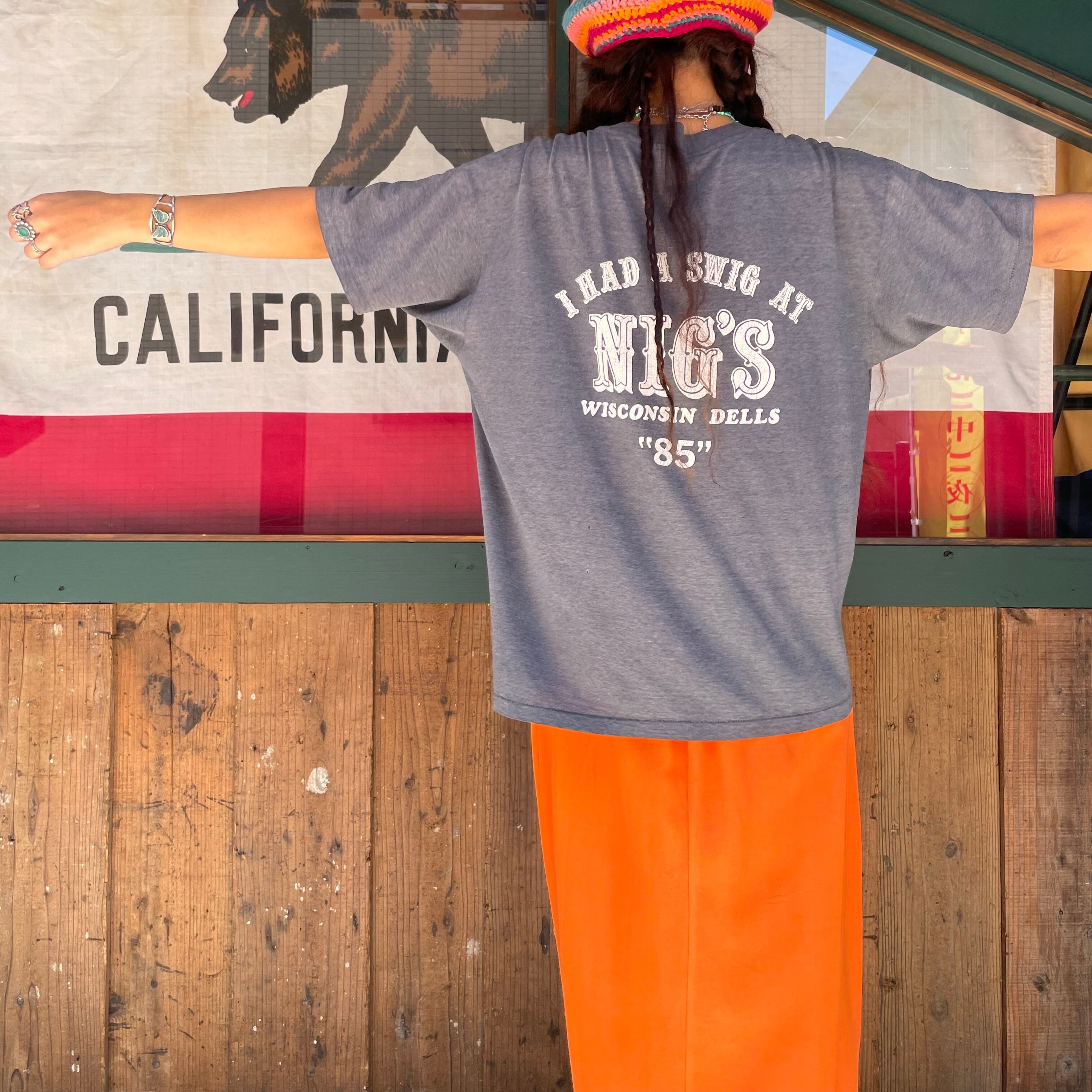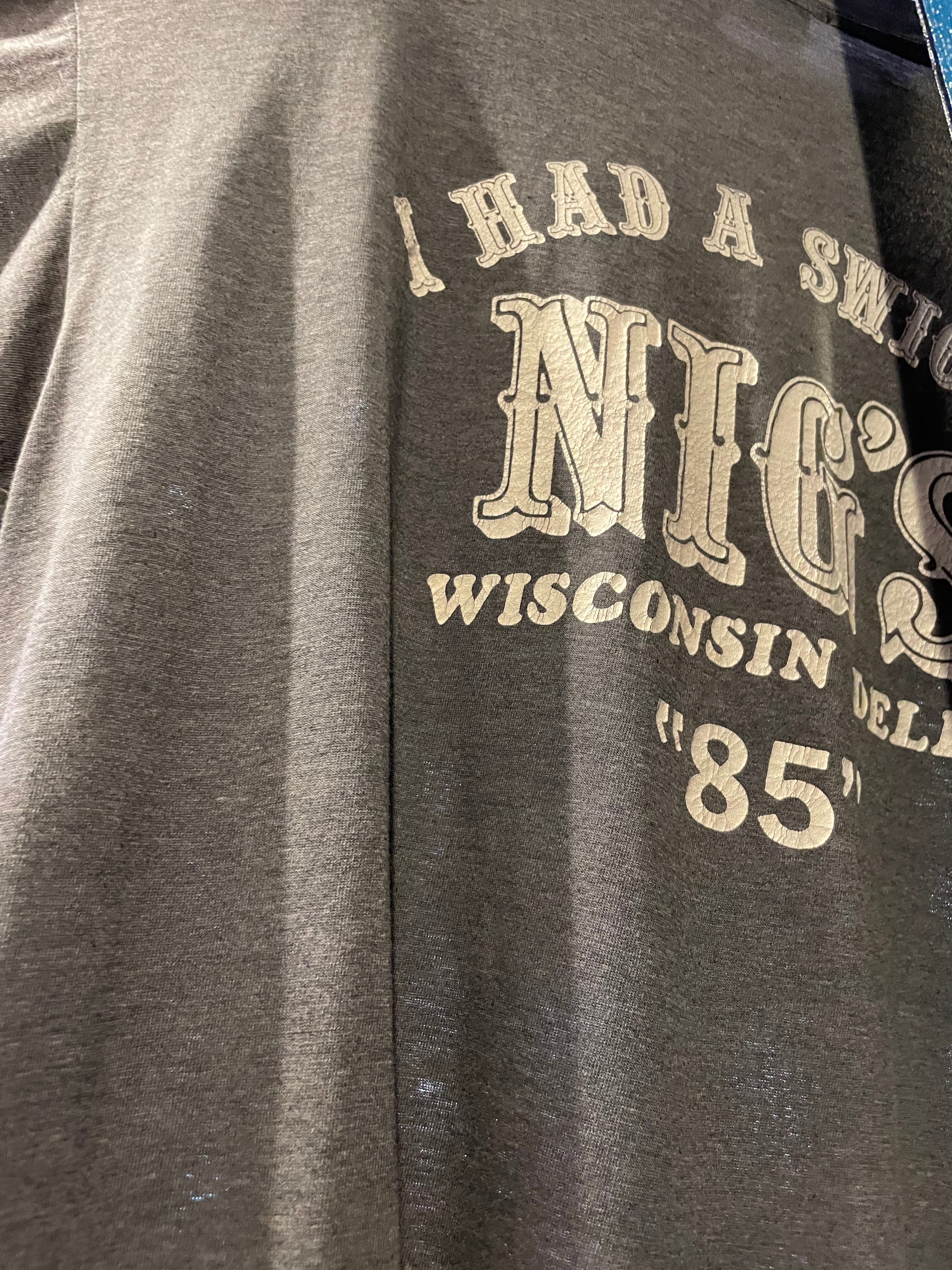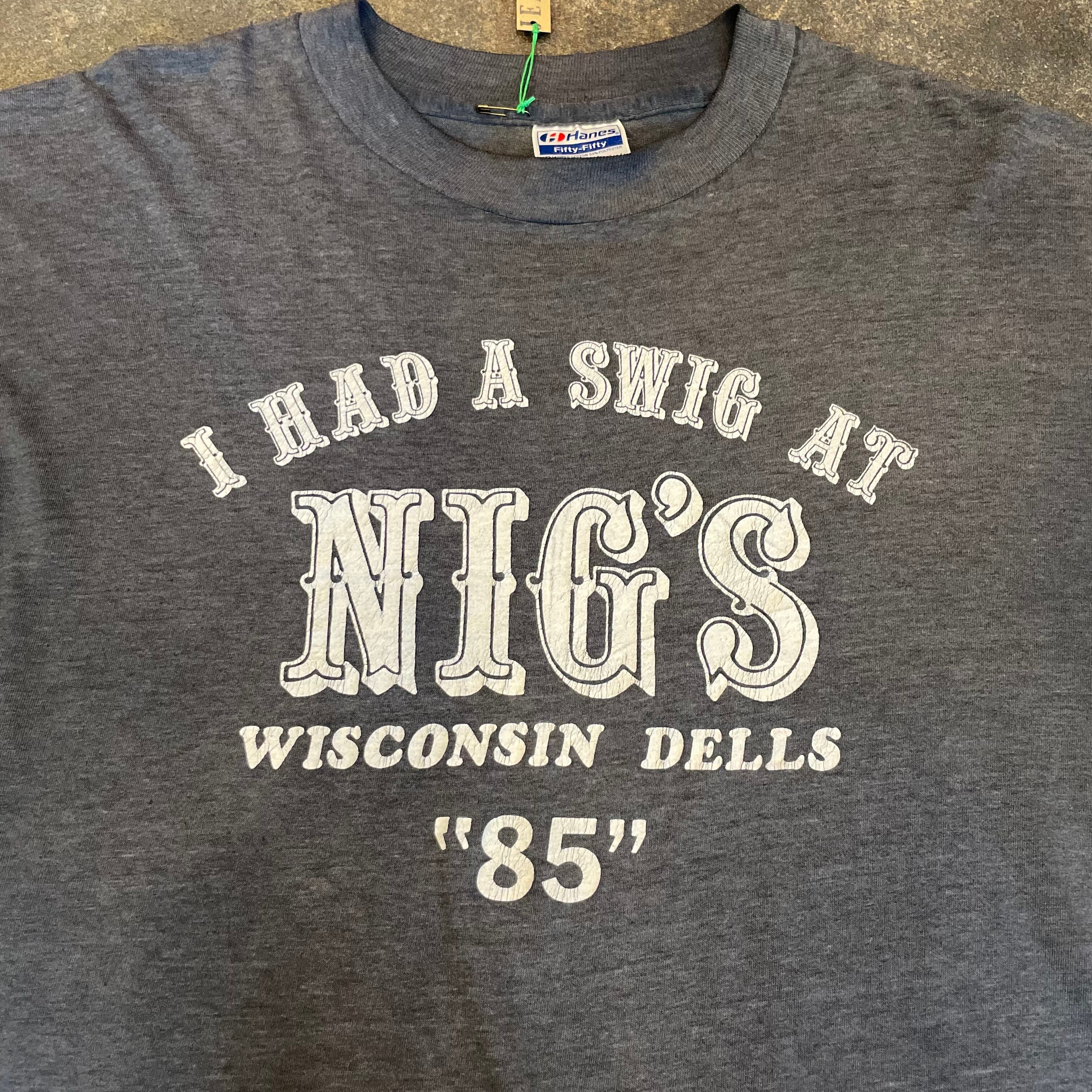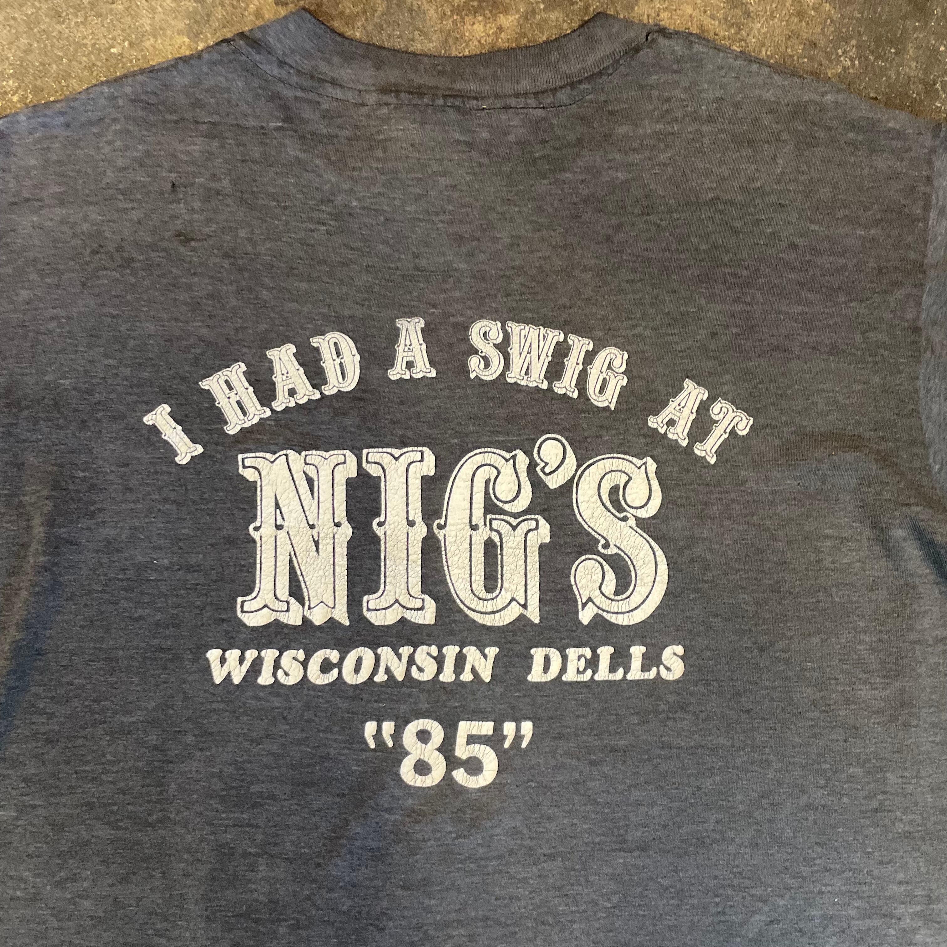 ウィスコンシン州DELLSにあるバーのTシャツのようですが、書体もかっこいいですし、両面同じプリントが贅沢で雰囲気のある一枚だと思います。