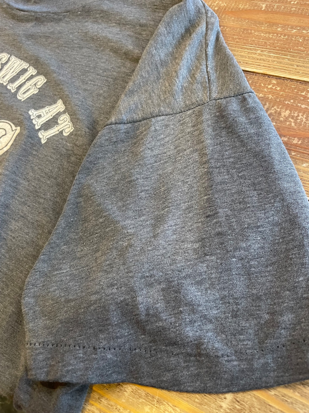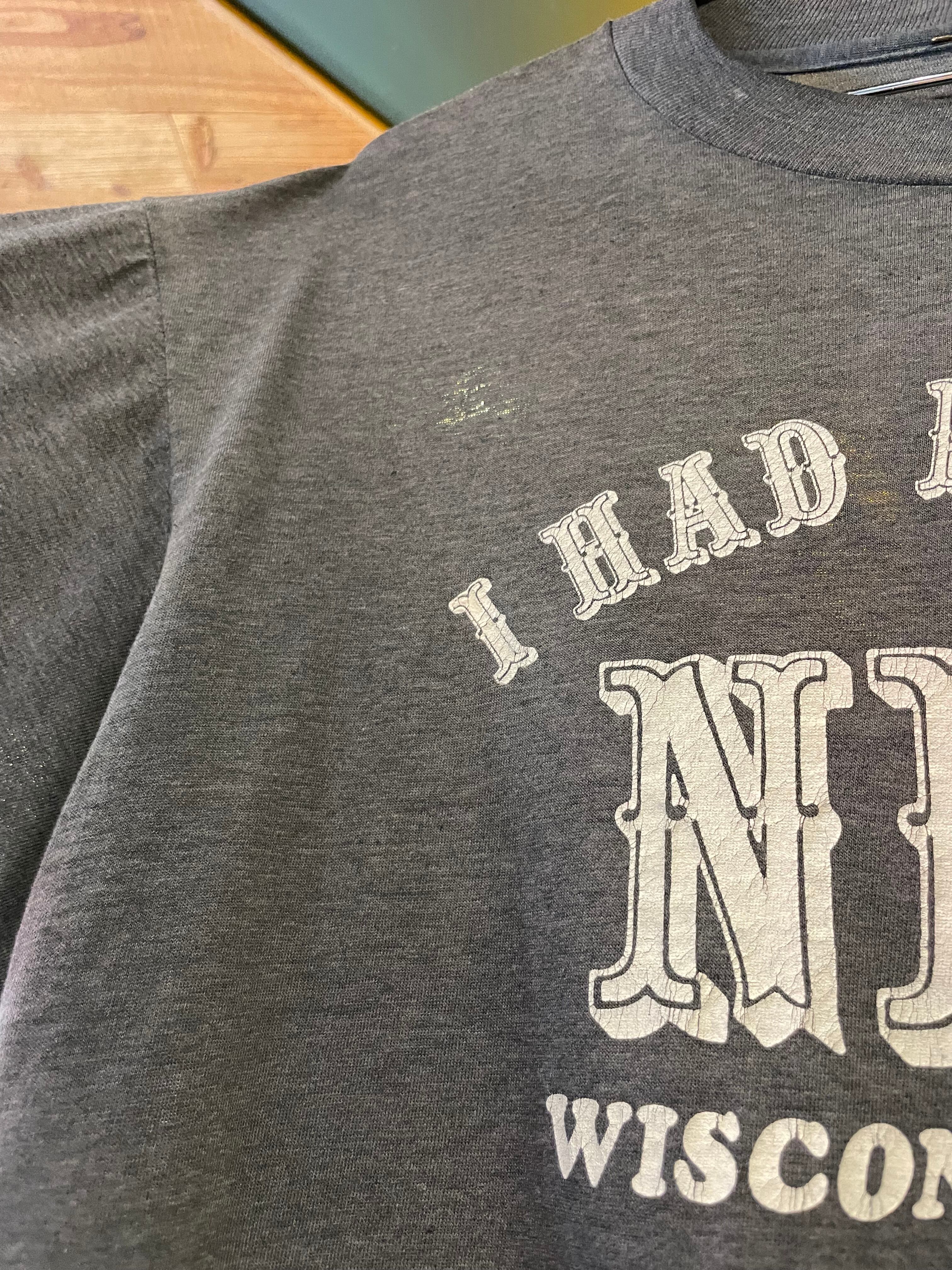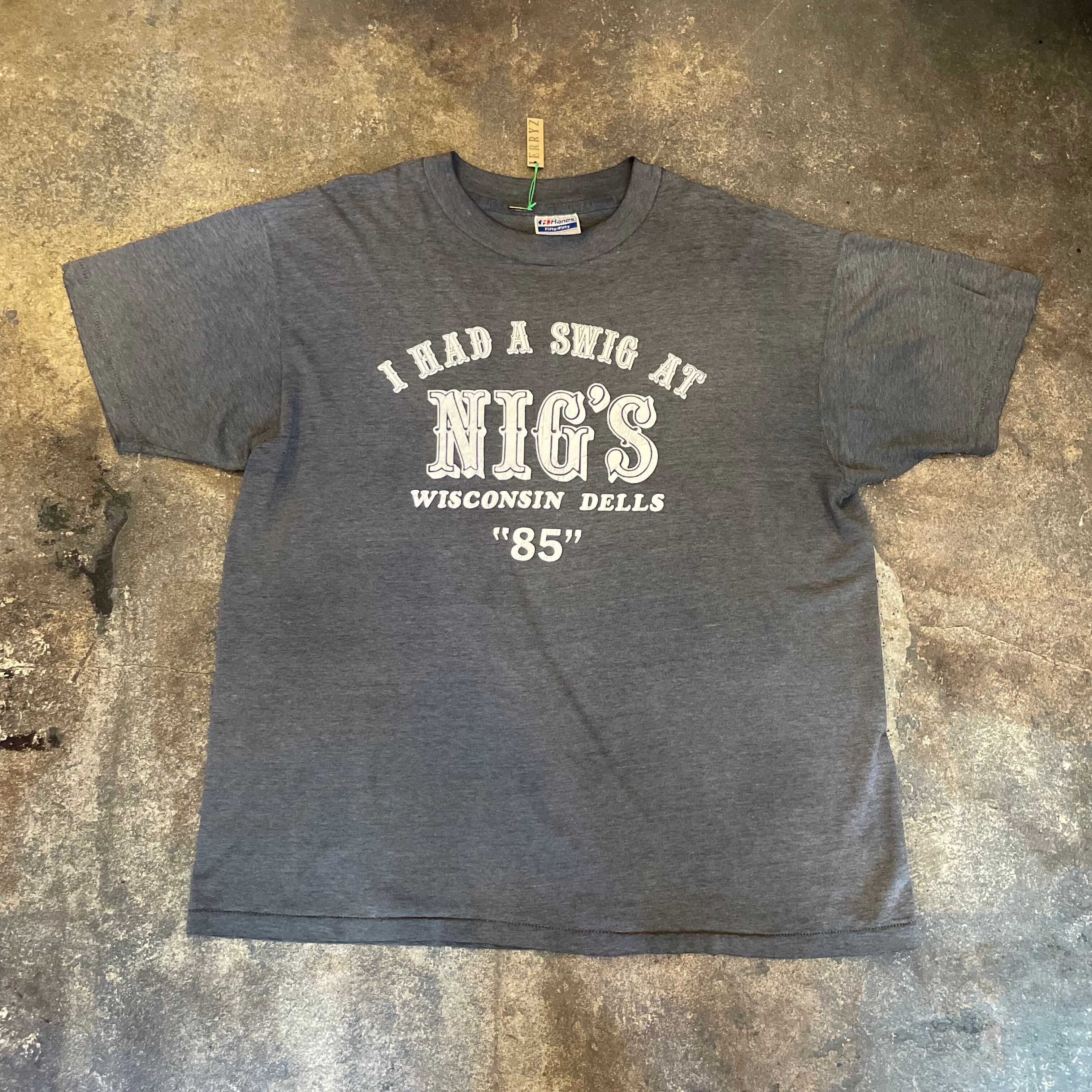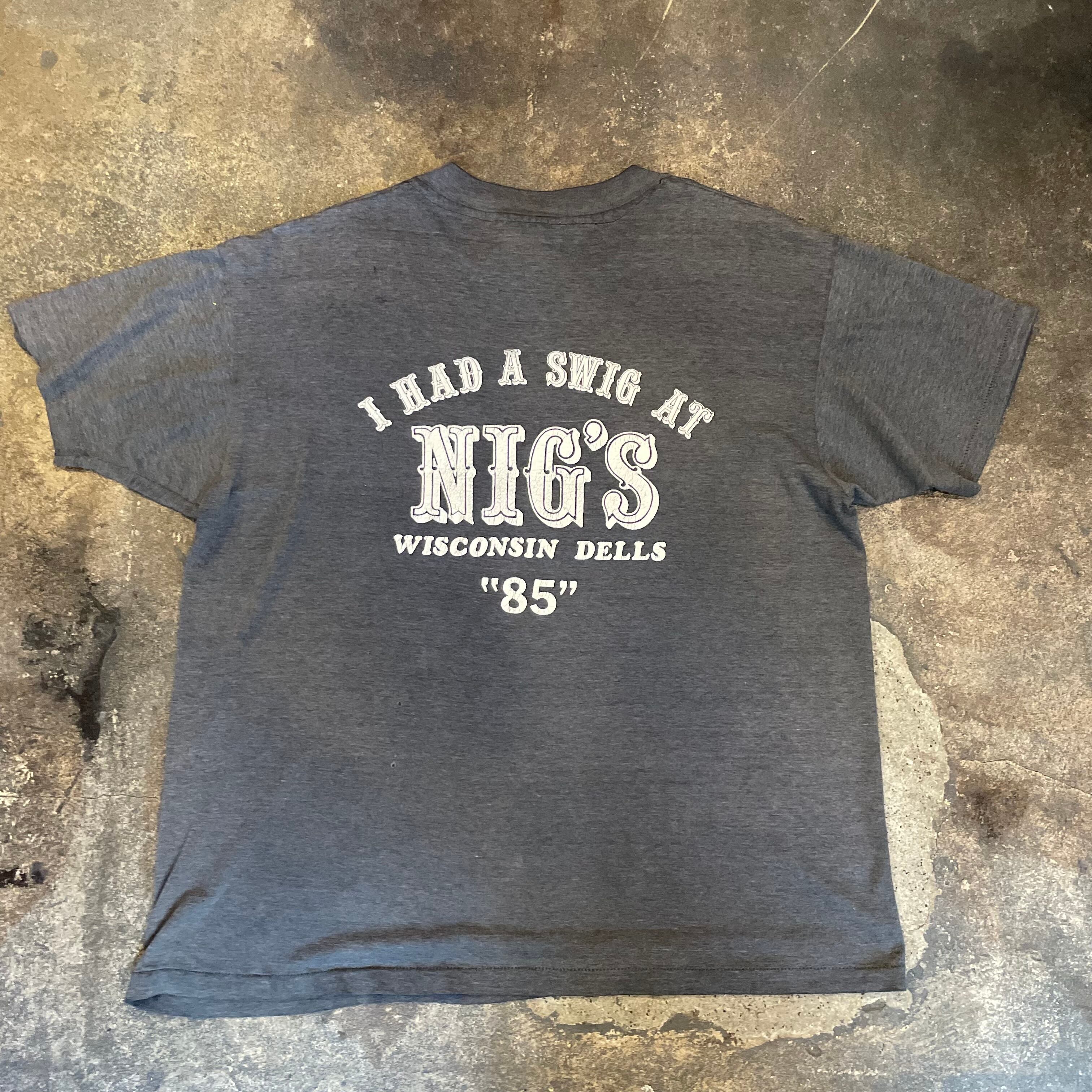 ウィスコンシン州DELLSにあるバーのTシャツのようですが、書体もかっこいいですし、両面同じプリントが贅沢で雰囲気のある一枚だと思います。