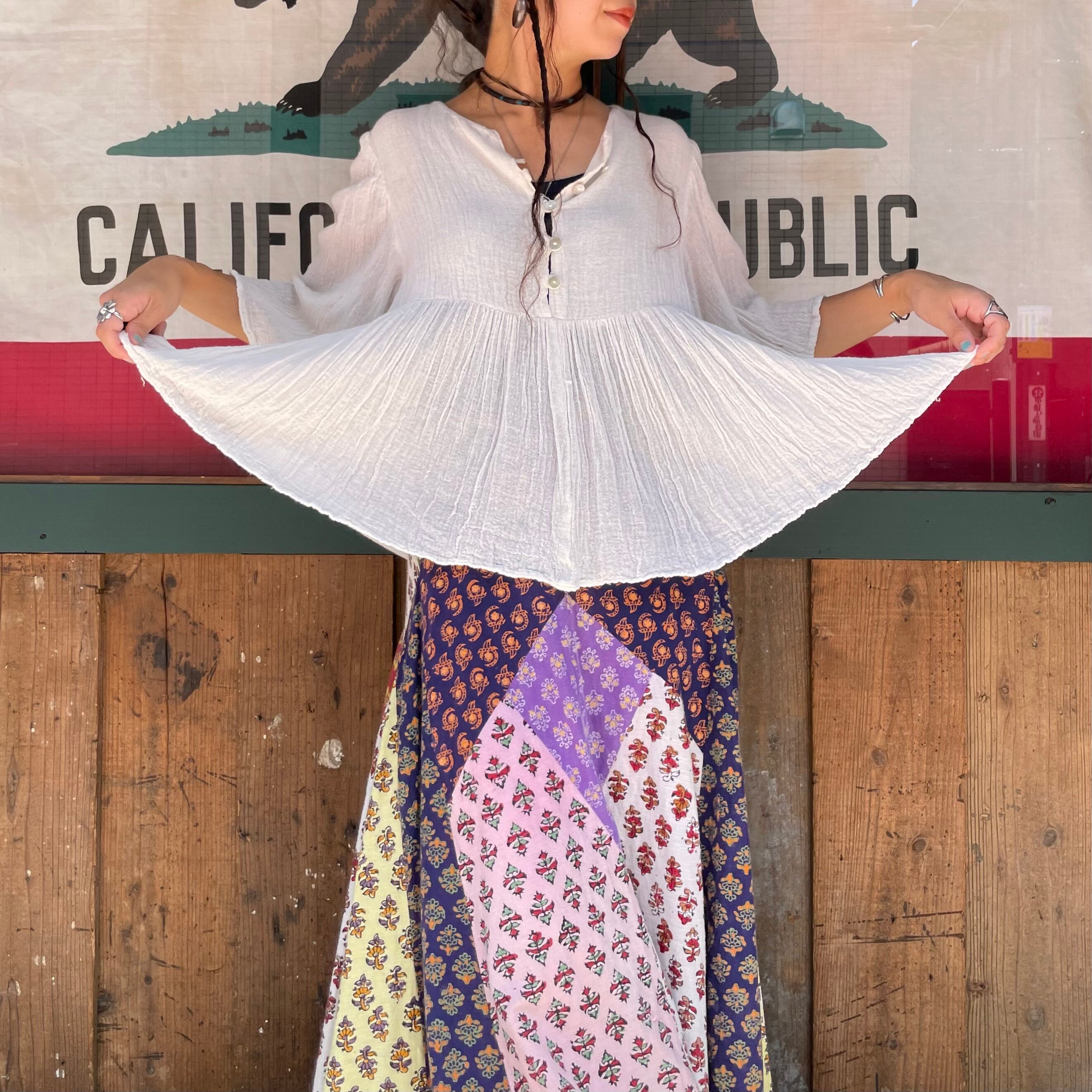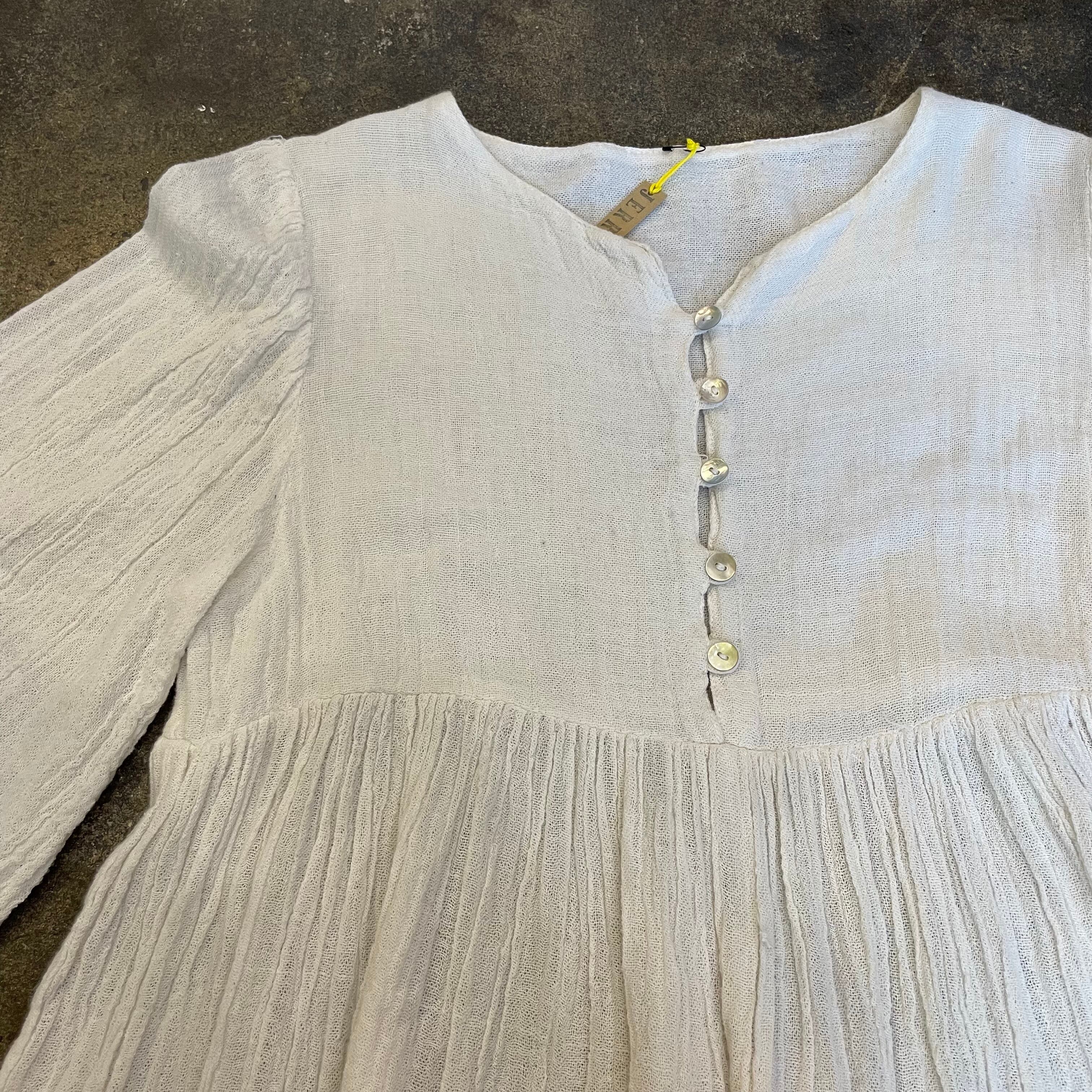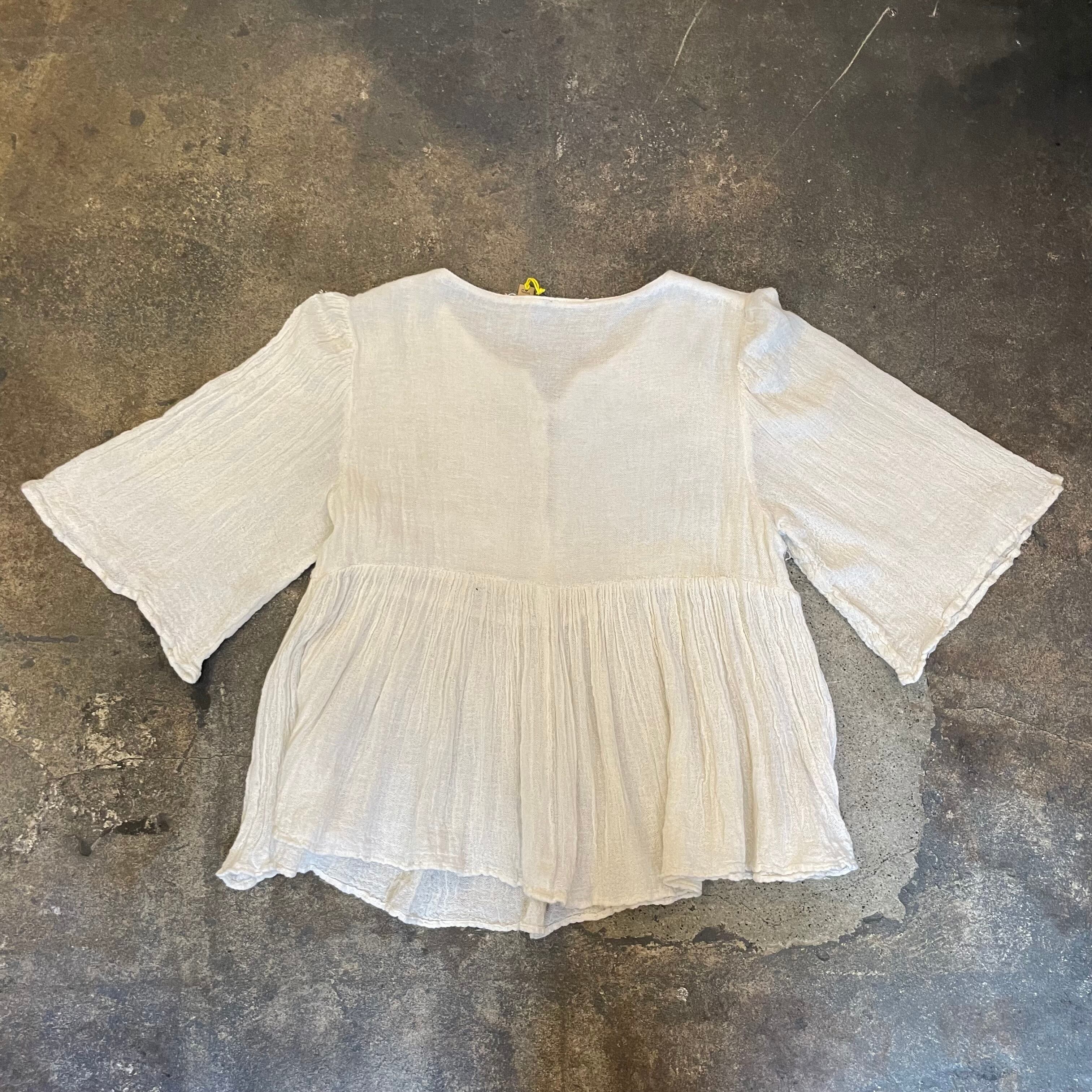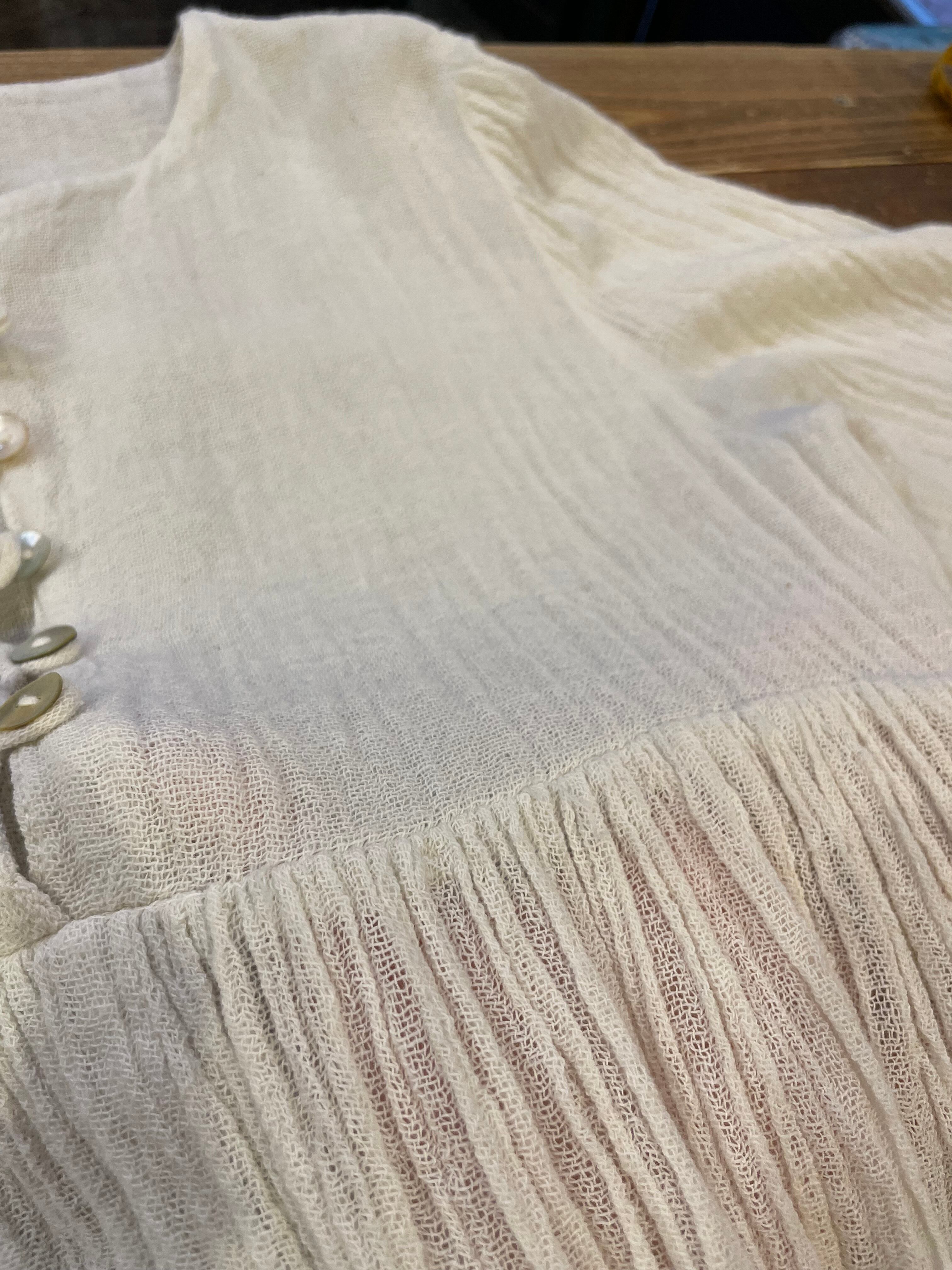 オフホワイトのガーゼのような生地感がナチュラルで落ち着いた雰囲気のあるチュニックです。