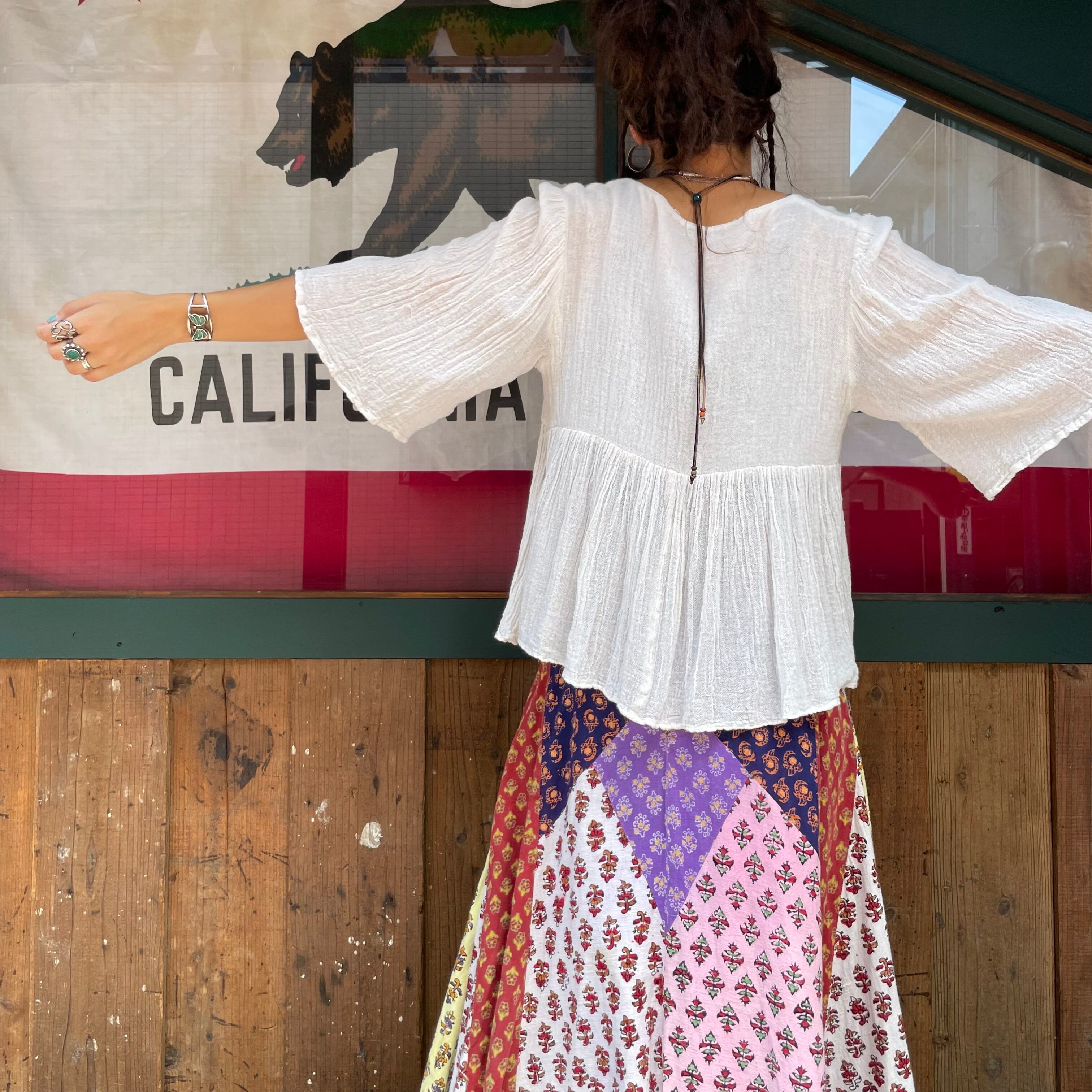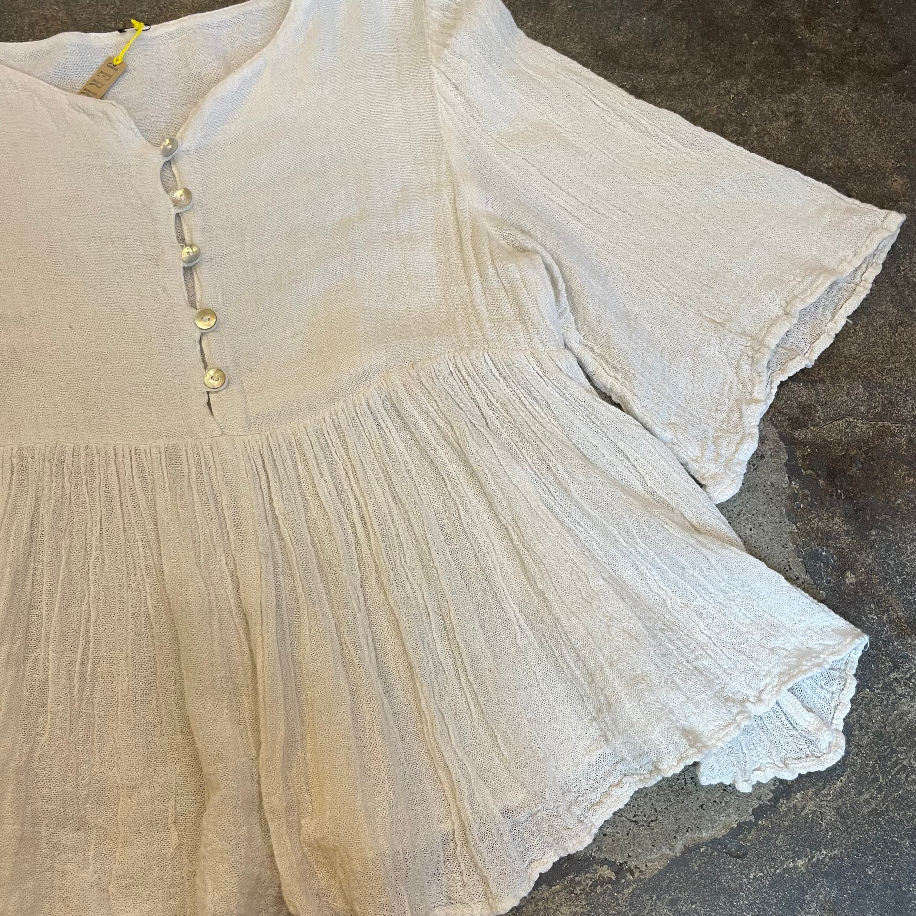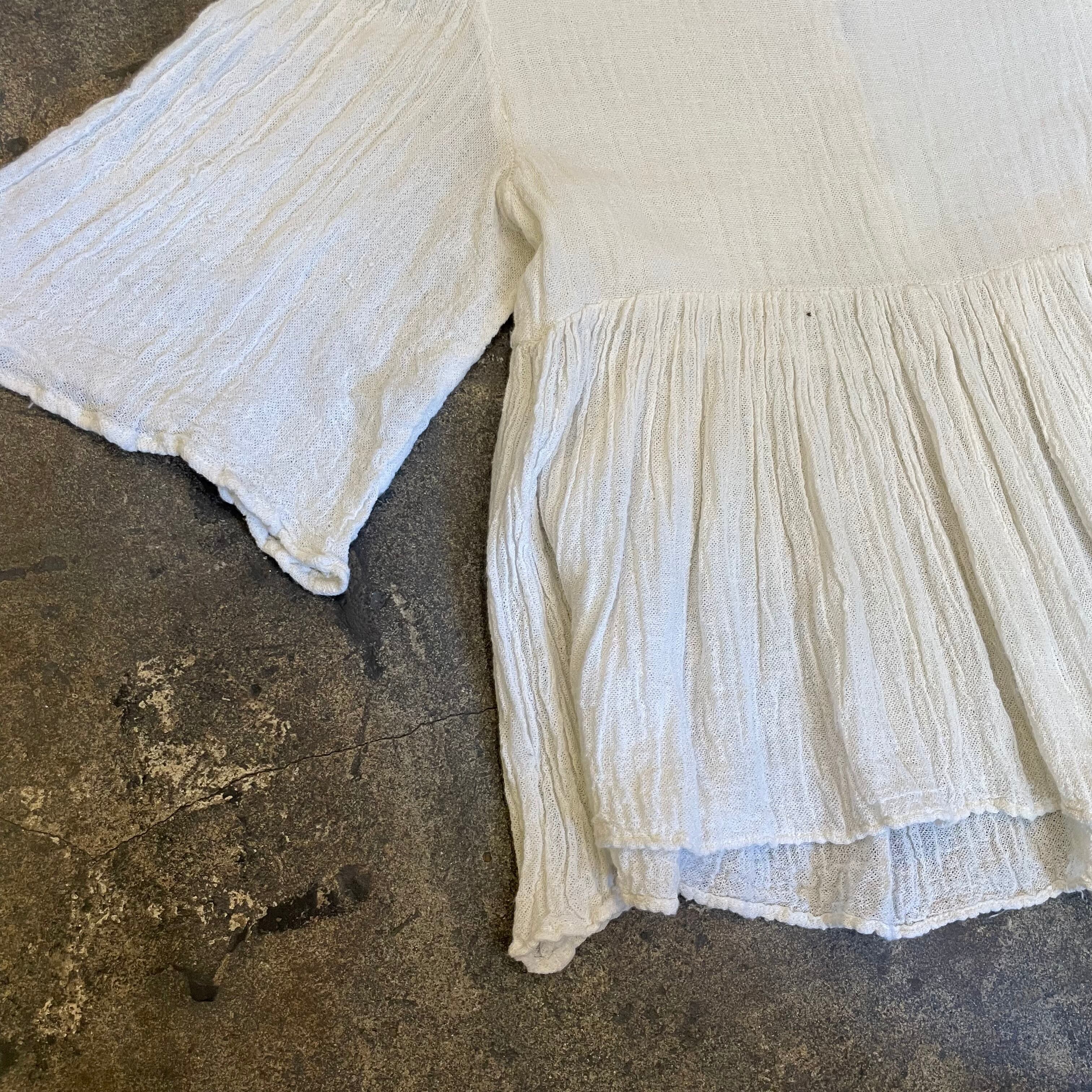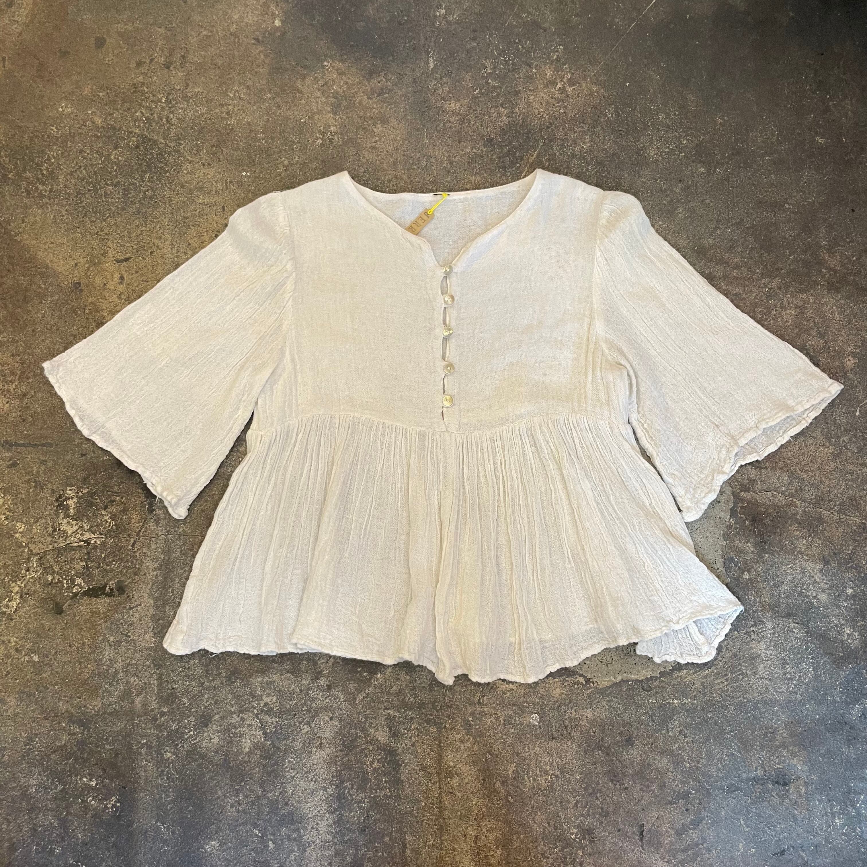 オフホワイトのガーゼのような生地感がナチュラルで落ち着いた雰囲気のあるチュニックです。
