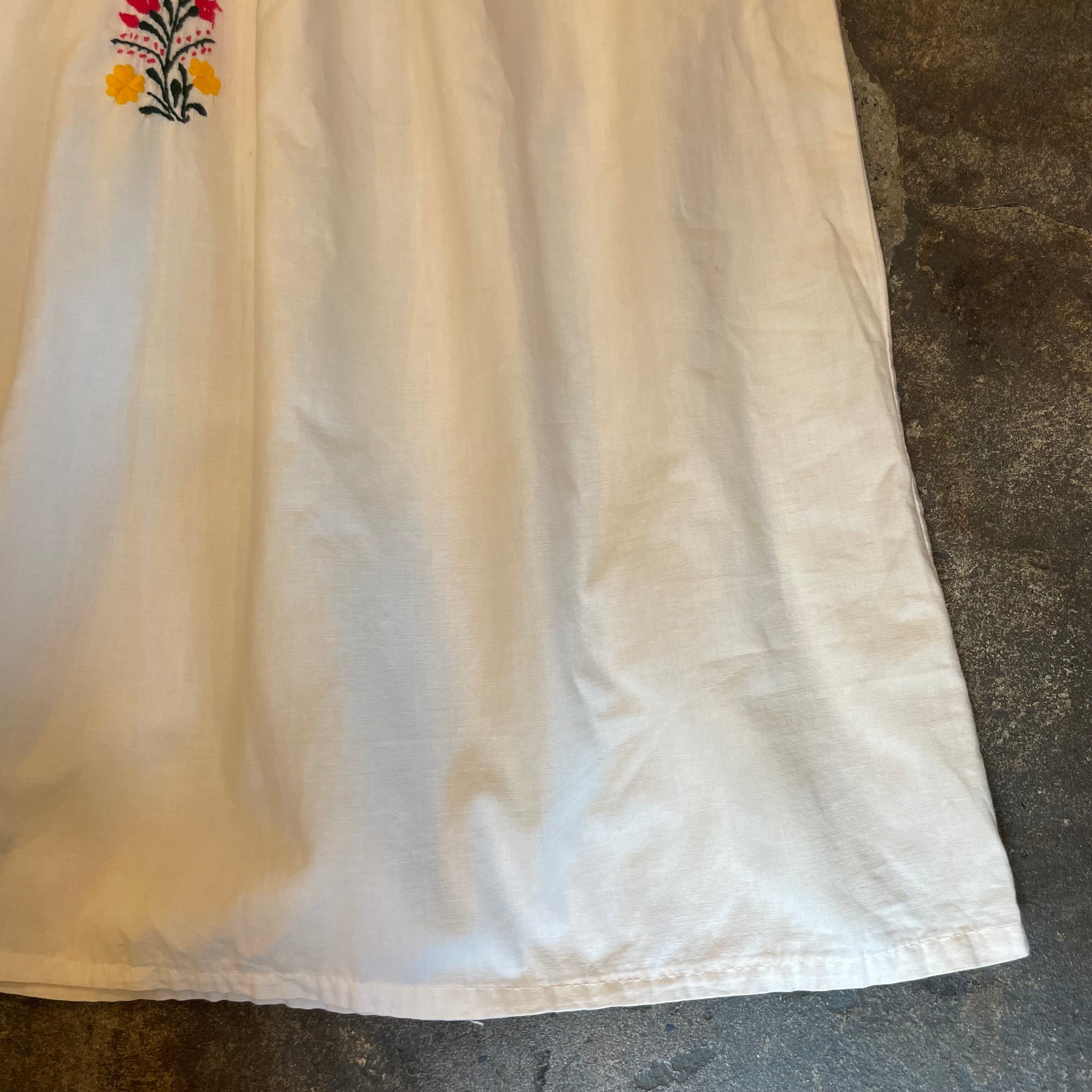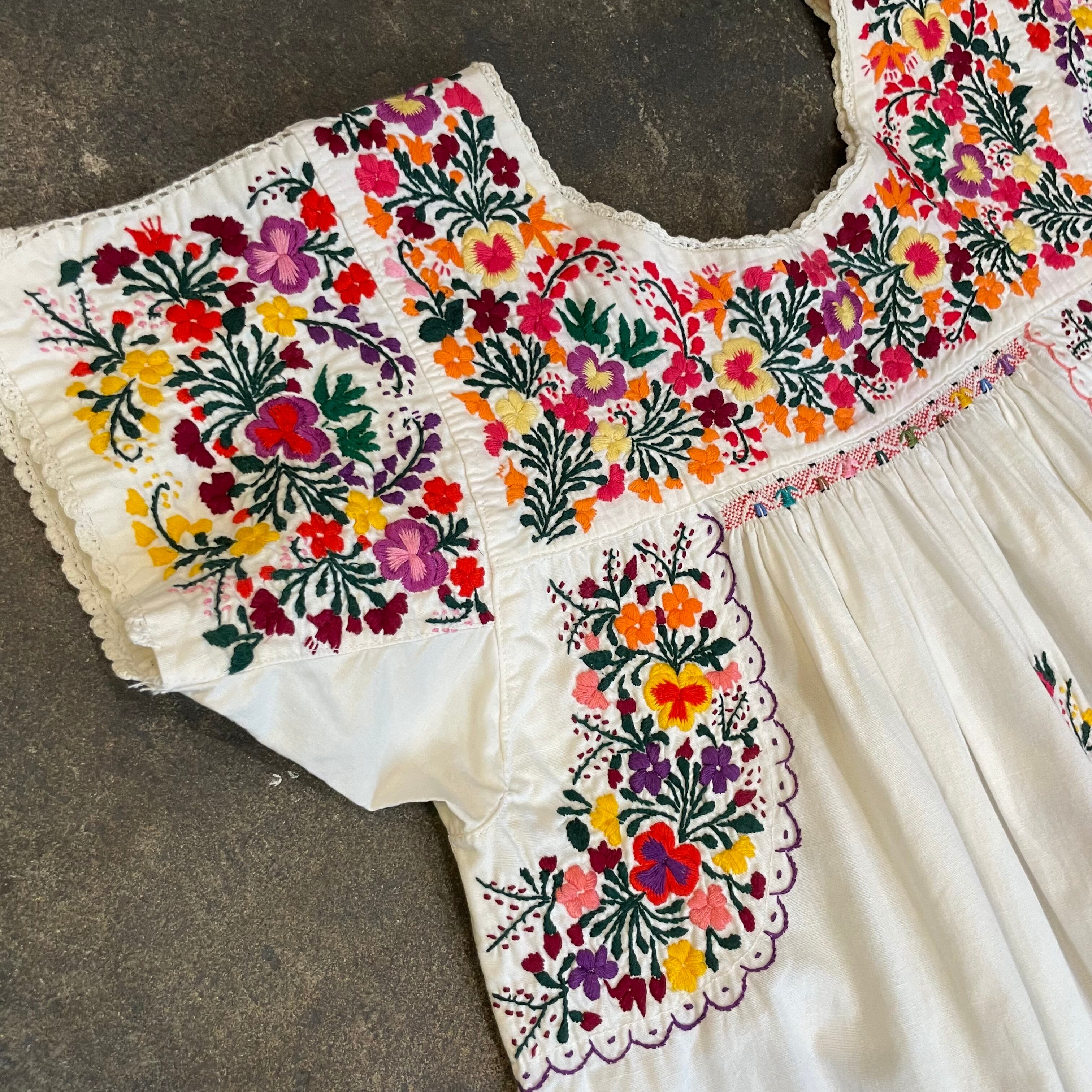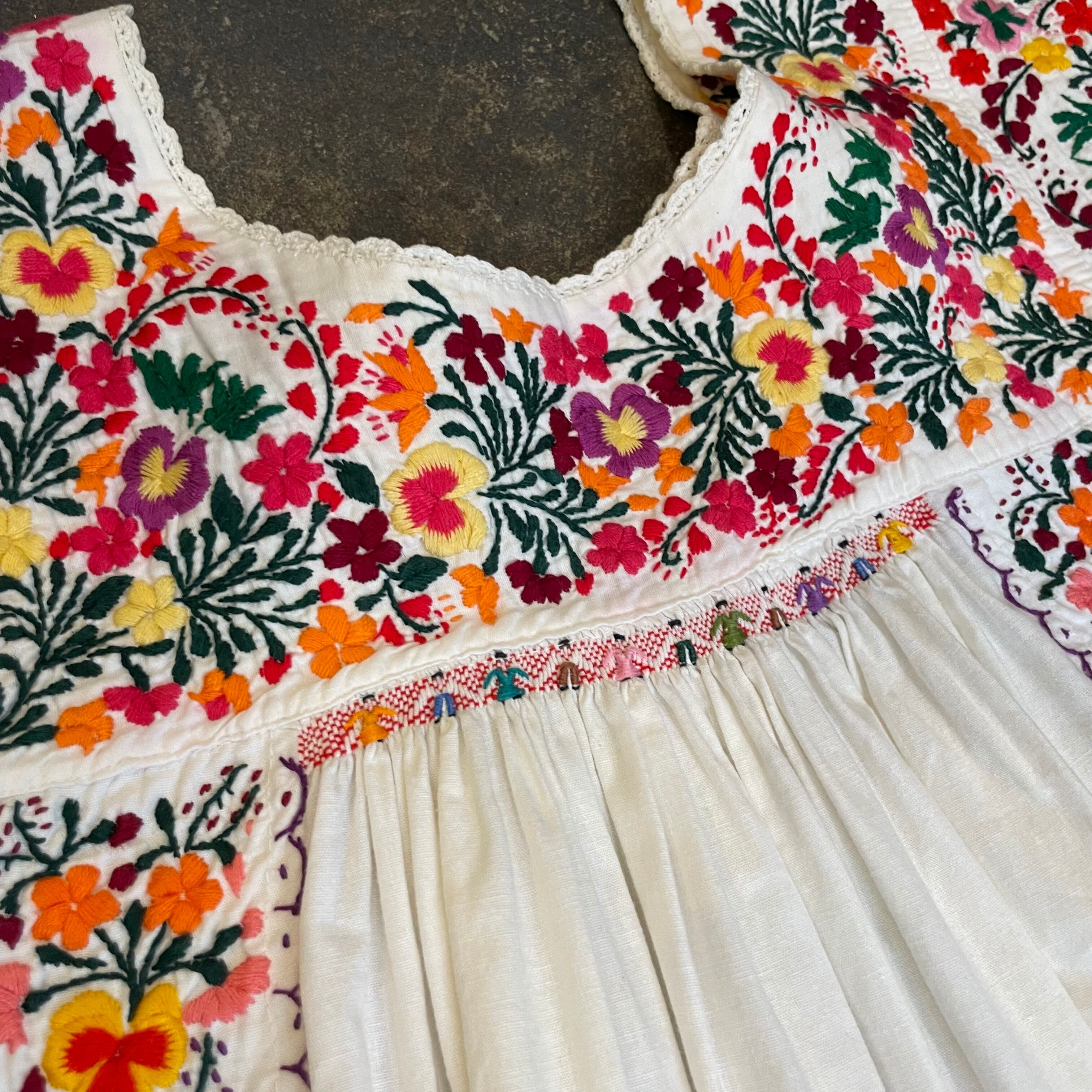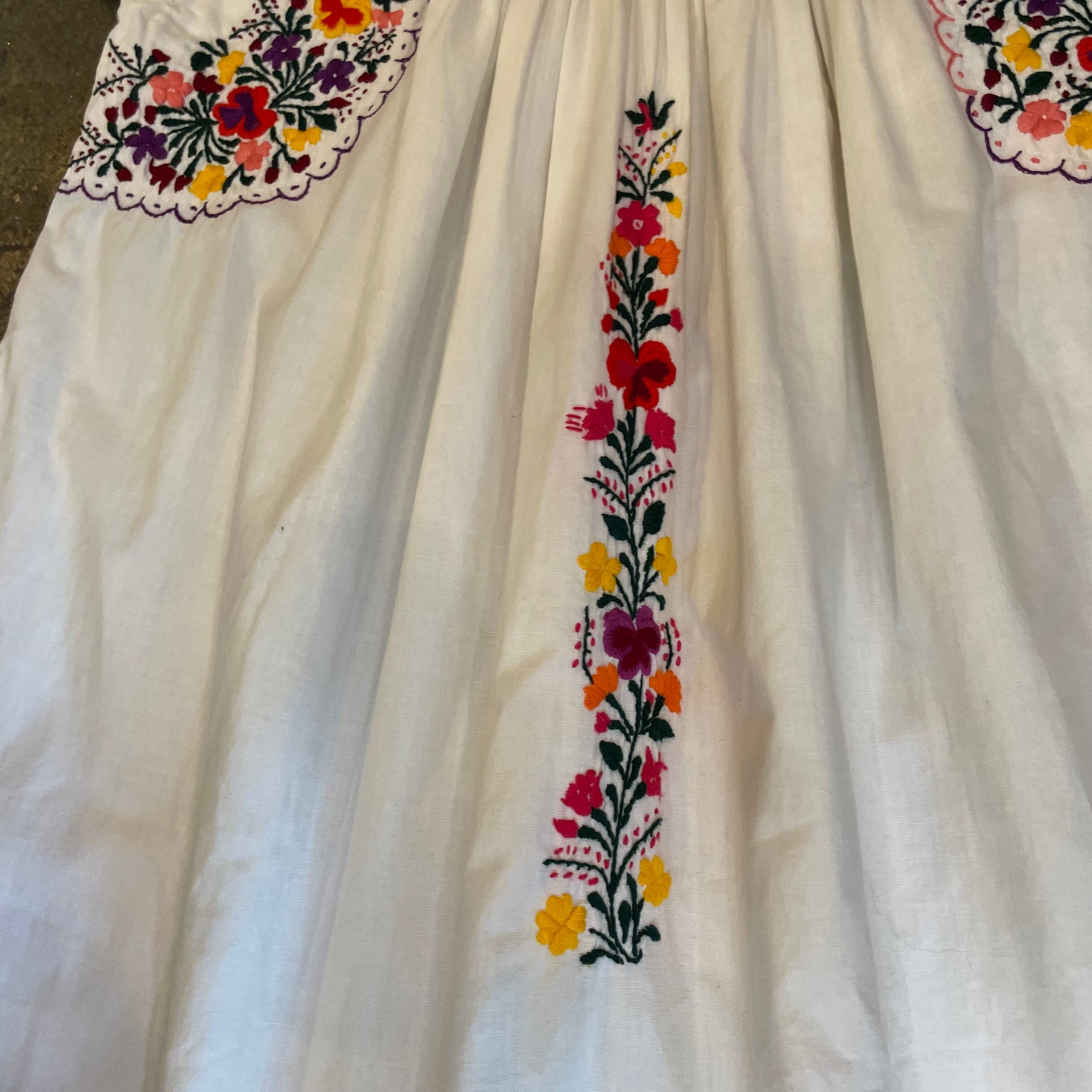 コットン地にコットンの糸の刺繍で雰囲気のある素敵な一着です。コットンの糸でかぎ針編みもしてあり、胸元のギャザー部分の手を繋いでいる人間たちの模様も、もちろん刺繍も細部まで細かいですね。