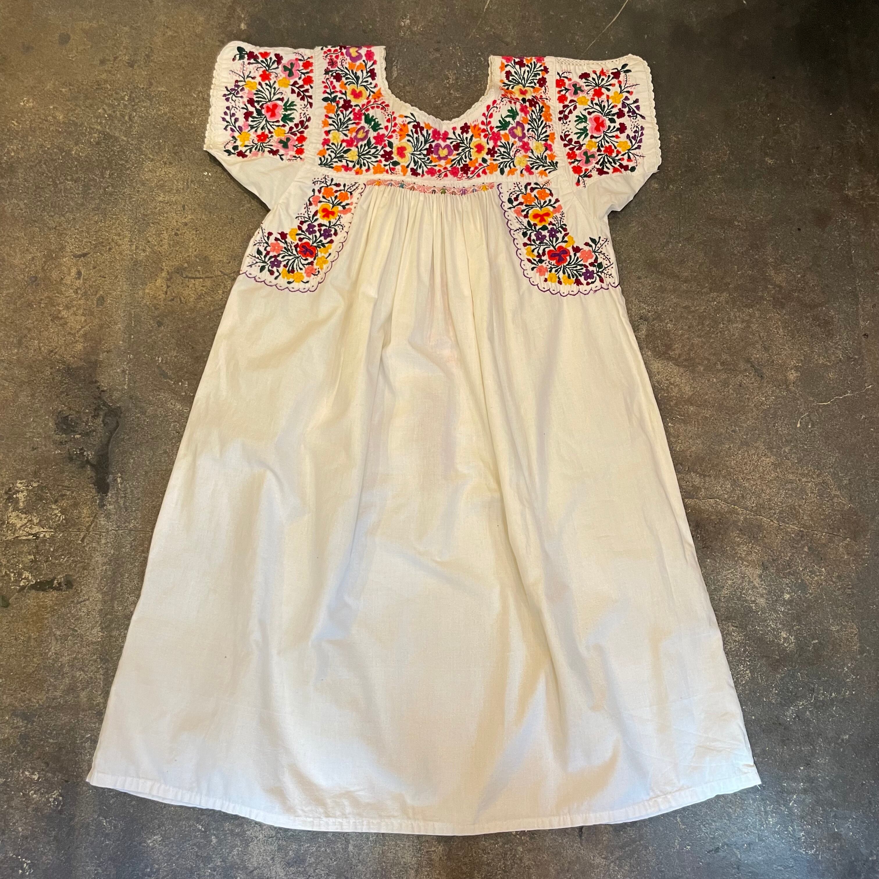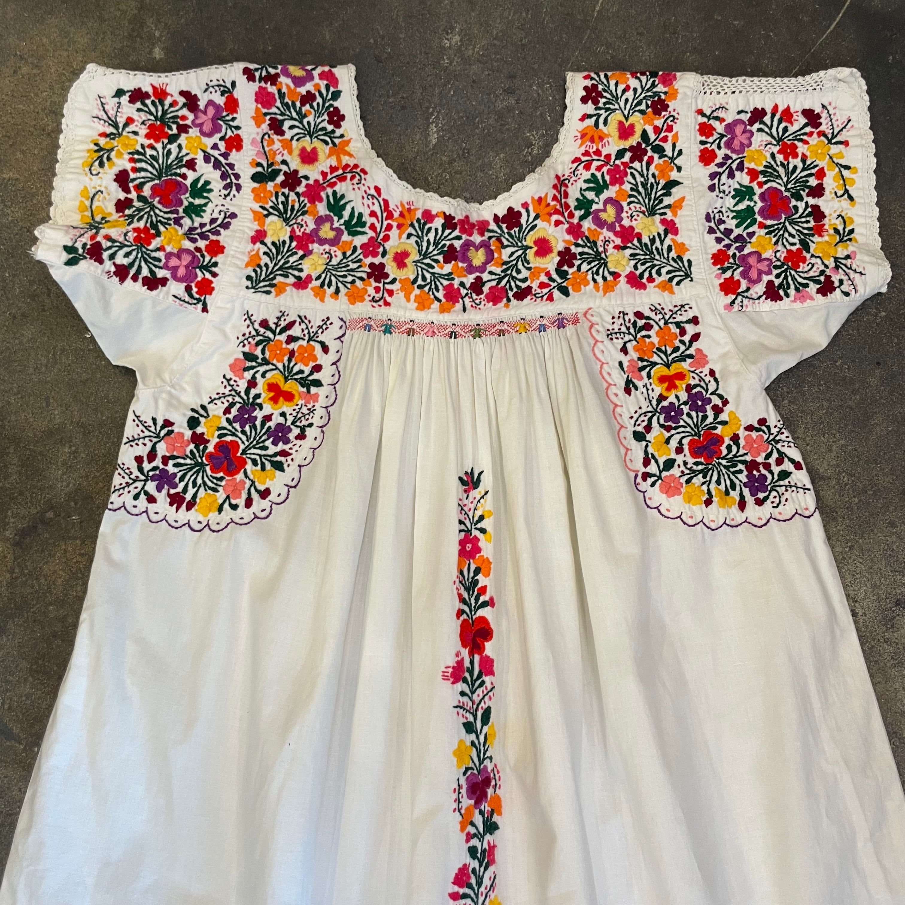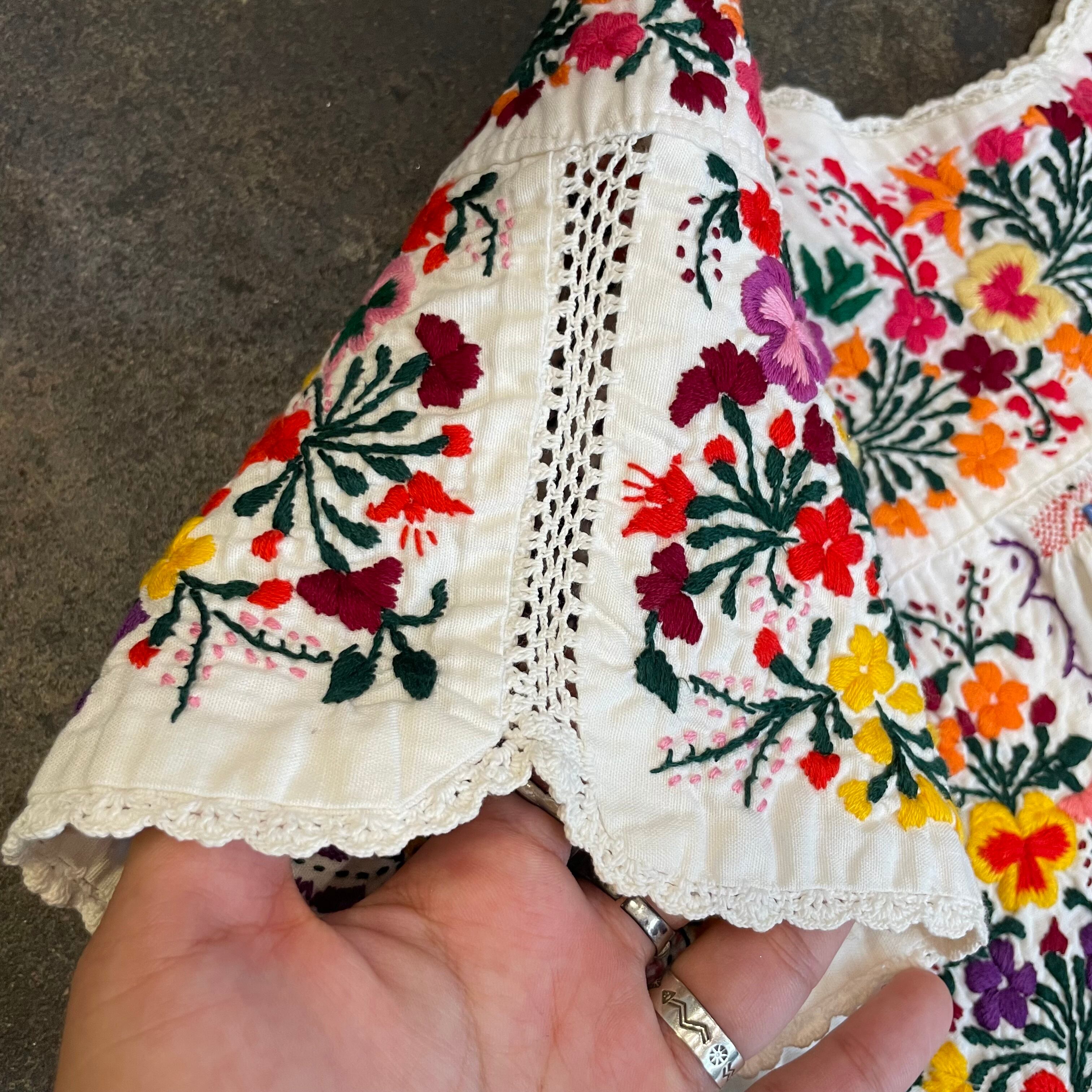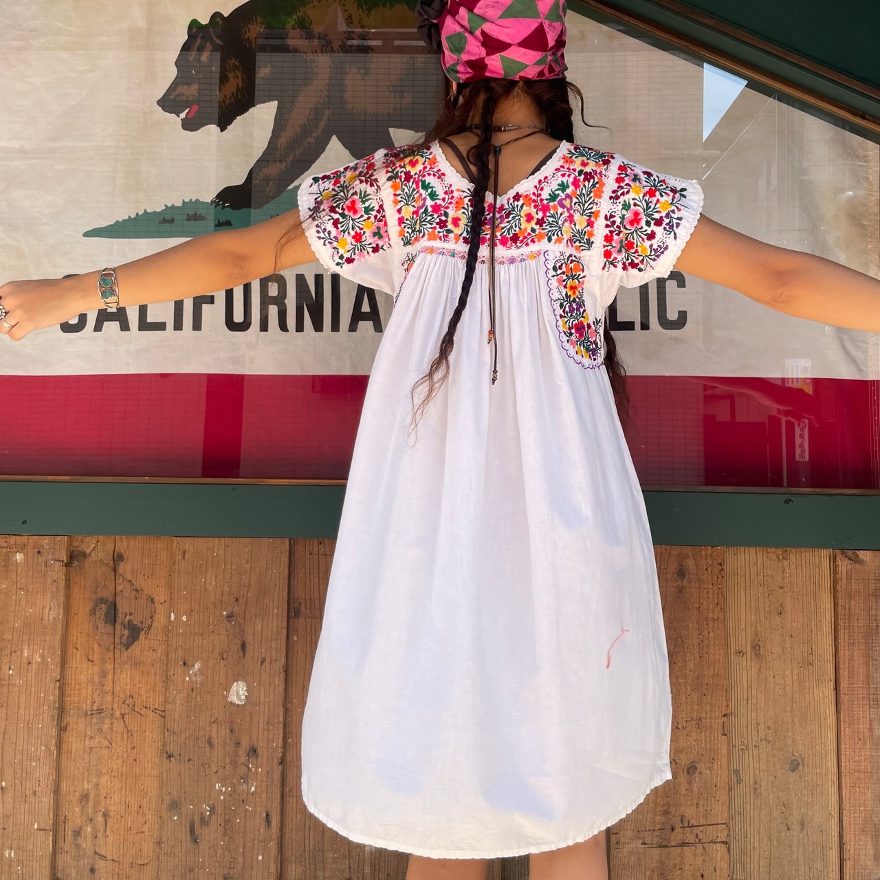 コットン地にコットンの糸の刺繍で雰囲気のある素敵な一着です。コットンの糸でかぎ針編みもしてあり、胸元のギャザー部分の手を繋いでいる人間たちの模様も、もちろん刺繍も細部まで細かいですね。