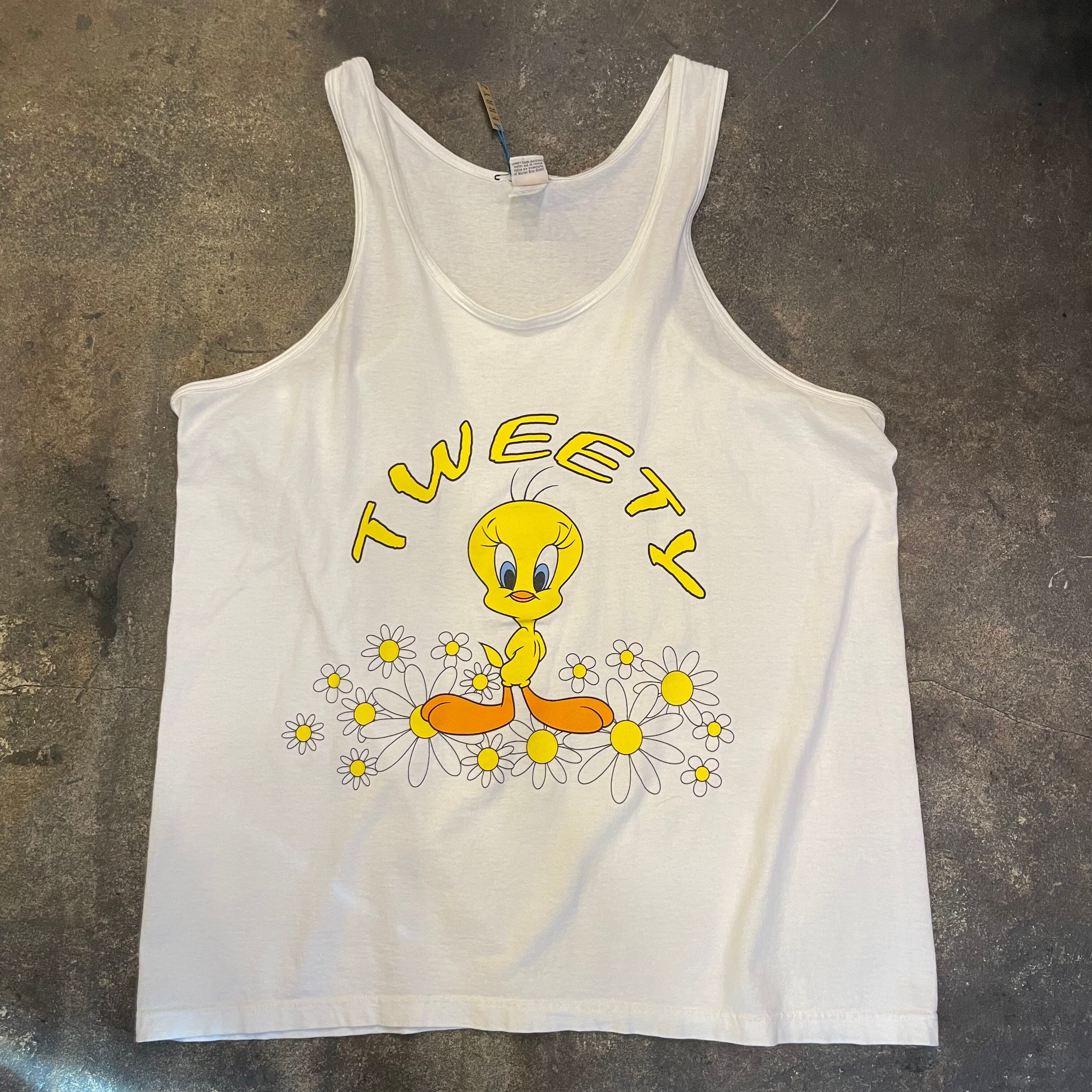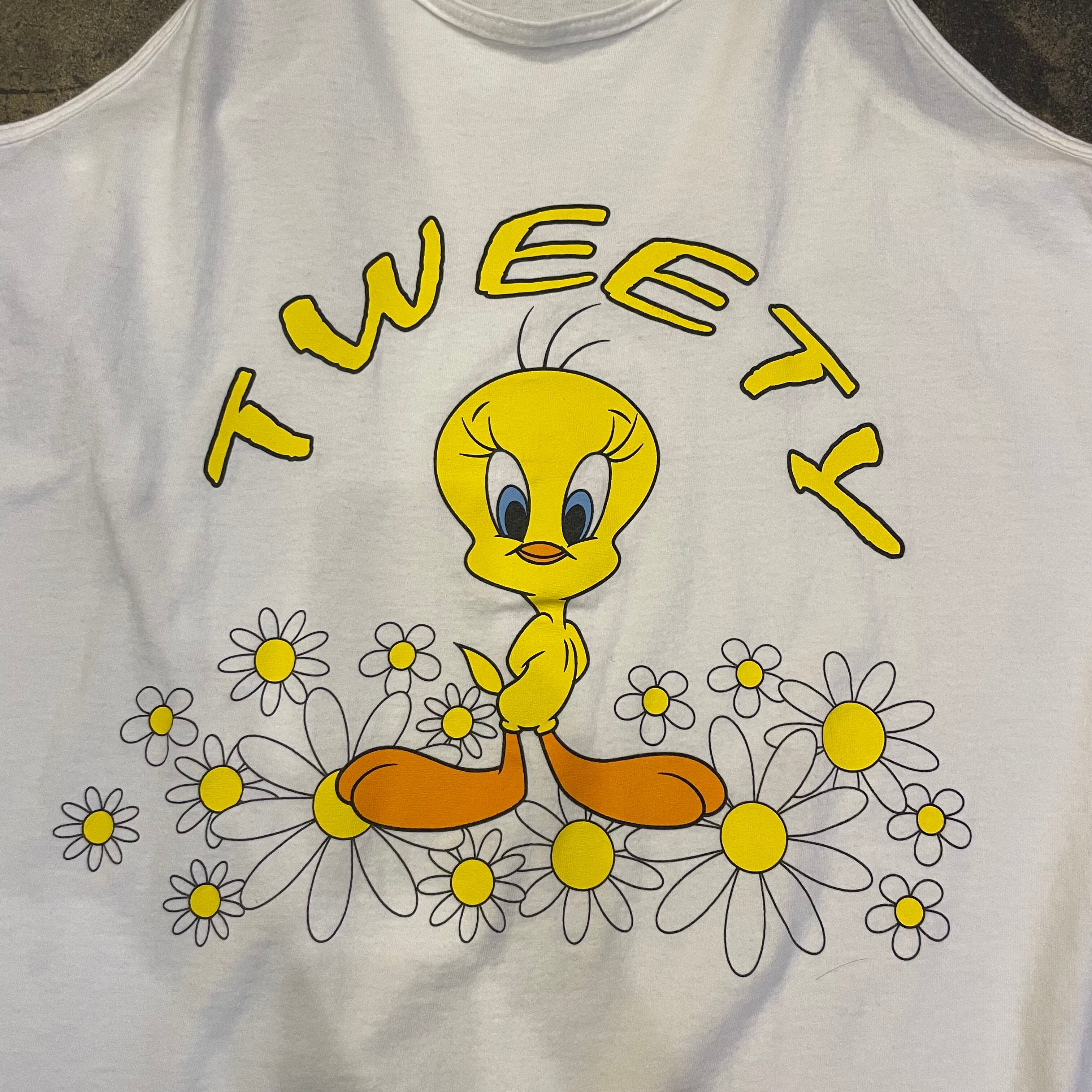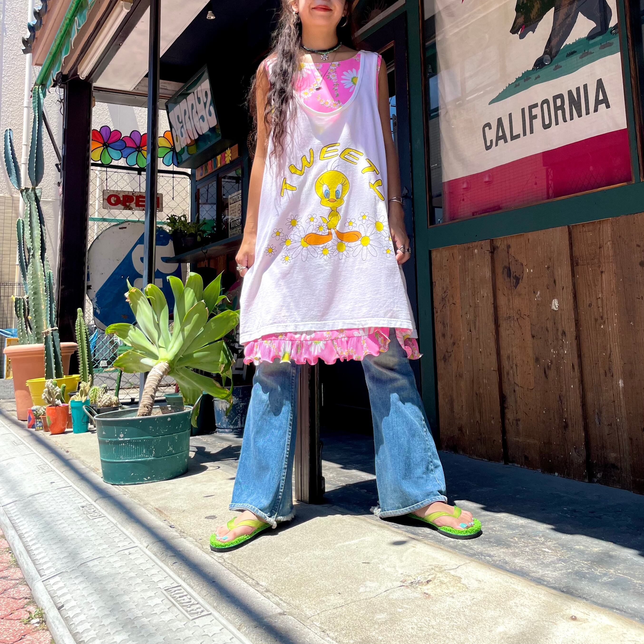 トゥイーティーとお花がシンプルでかわいいタンクトップです。オーバーサイズでゆったり楽ちんですし、もはやワンピースの丈感なところも良いですね。中にピタっとしたタンクトップ着てショートパンツを合わせてもかわいいですし、真っ白なワンピースやノースリーブワンピースの上に重ねたり、カラーパンツにビーサンでもかわいいですし、このオーバーサイズを色々なスタイルで楽しめそうです。