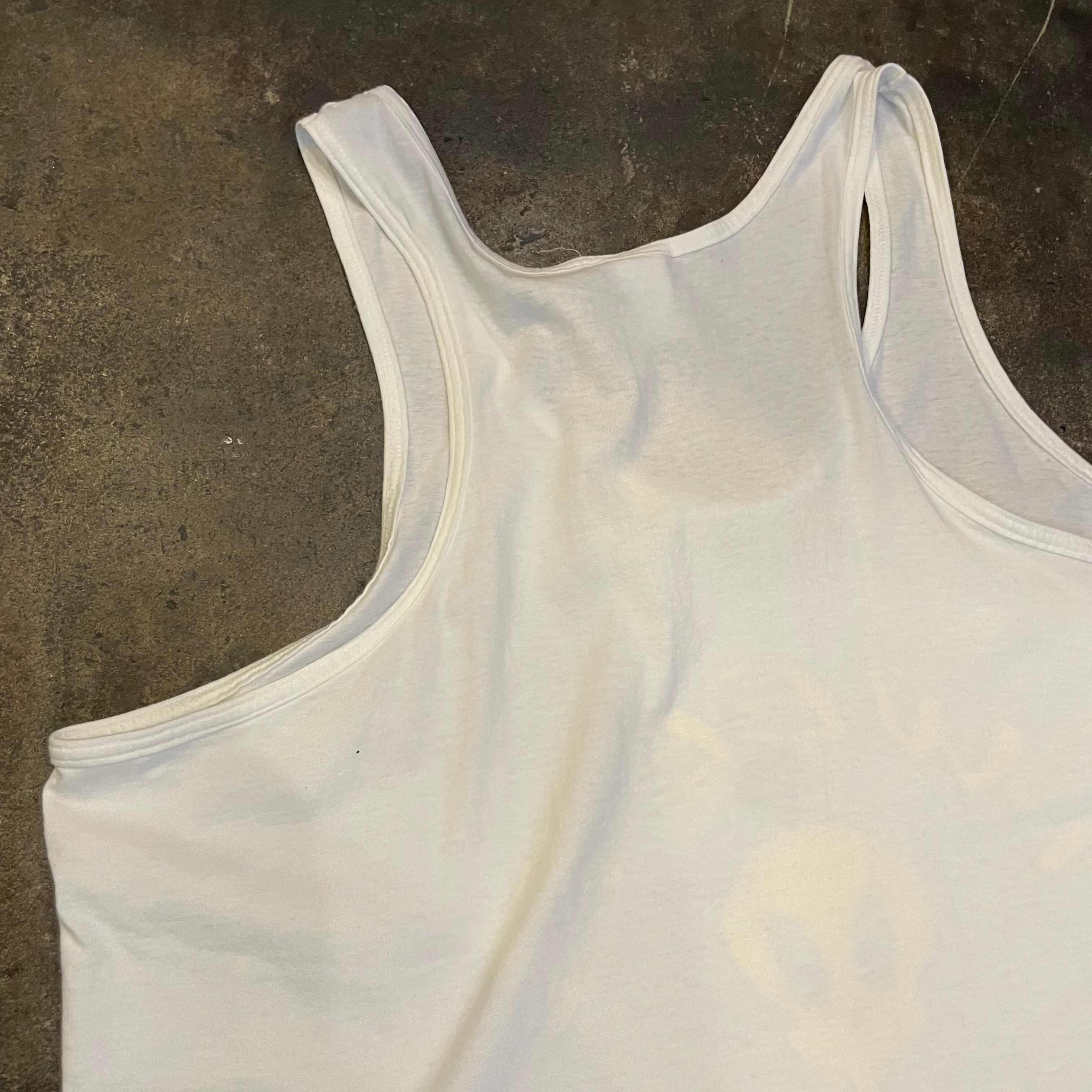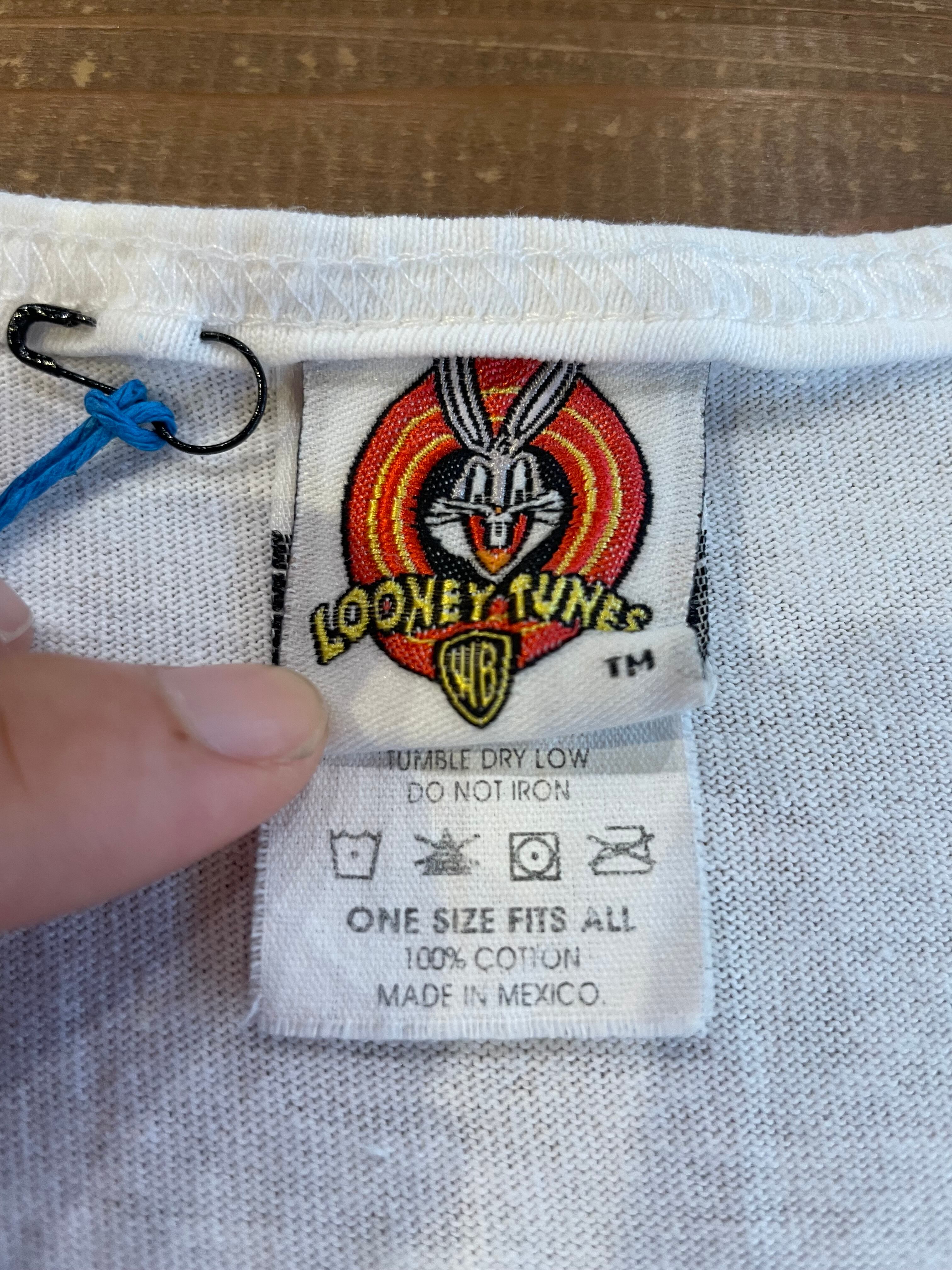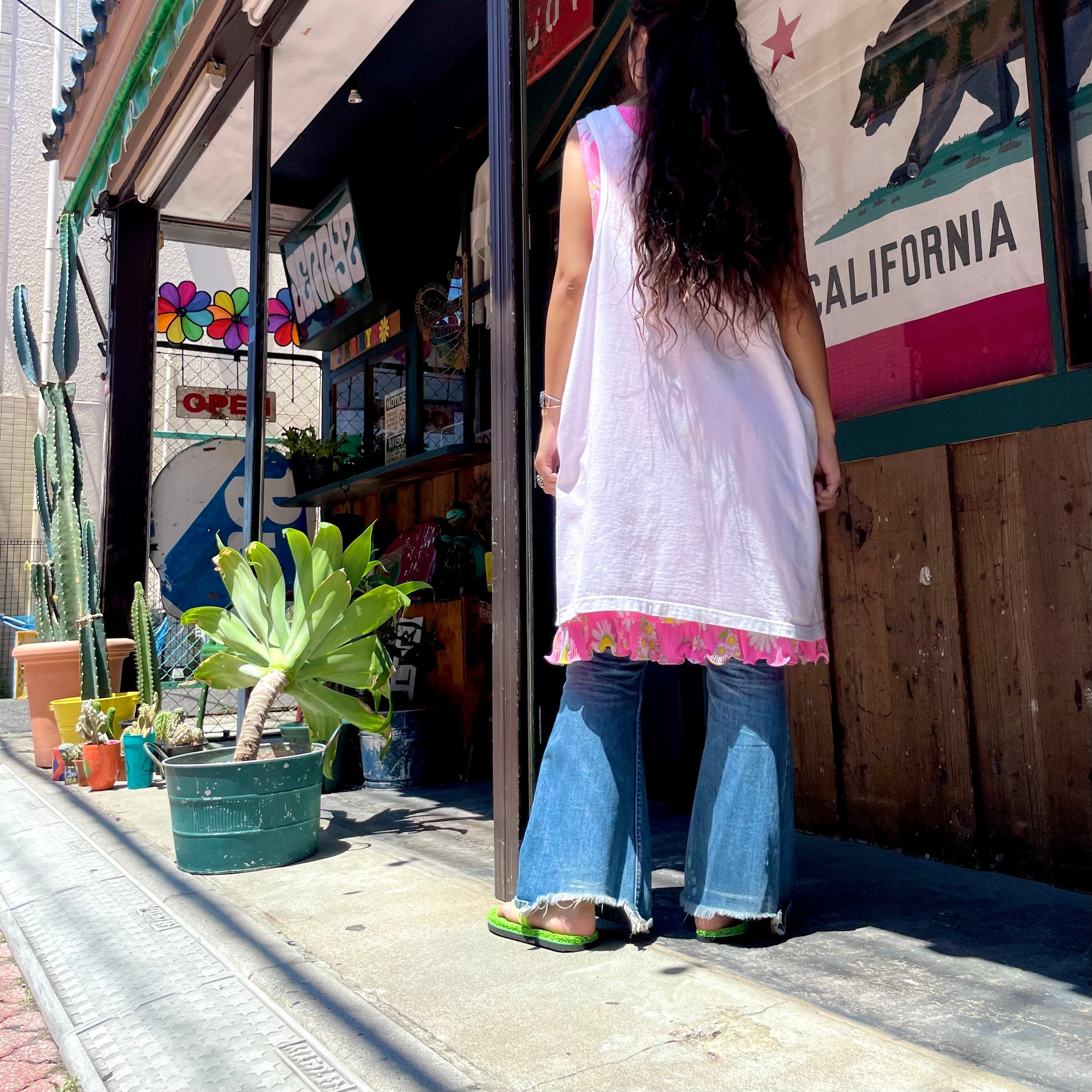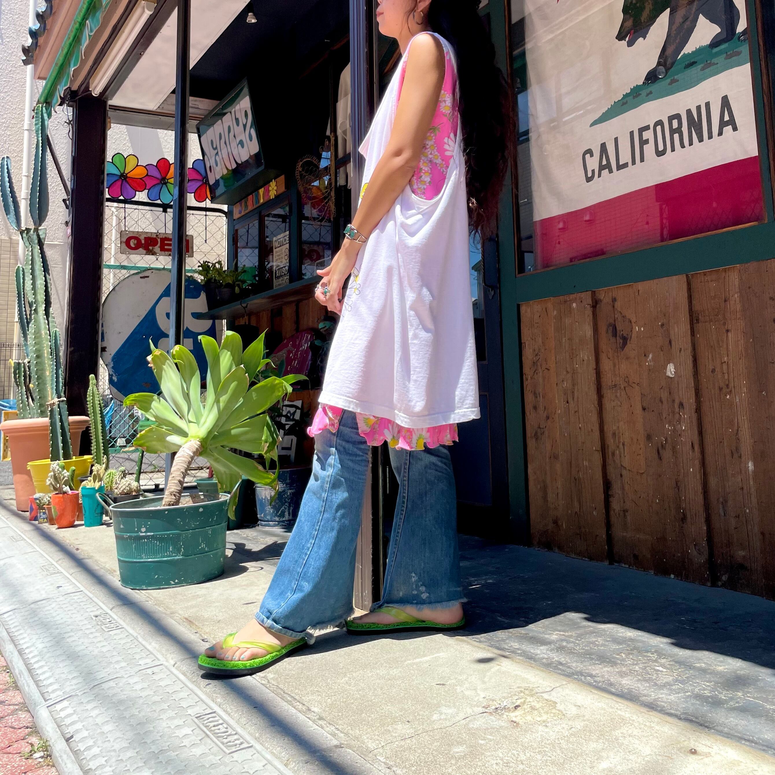 トゥイーティーとお花がシンプルでかわいいタンクトップです。オーバーサイズでゆったり楽ちんですし、もはやワンピースの丈感なところも良いですね。中にピタっとしたタンクトップ着てショートパンツを合わせてもかわいいですし、真っ白なワンピースやノースリーブワンピースの上に重ねたり、カラーパンツにビーサンでもかわいいですし、このオーバーサイズを色々なスタイルで楽しめそうです。
