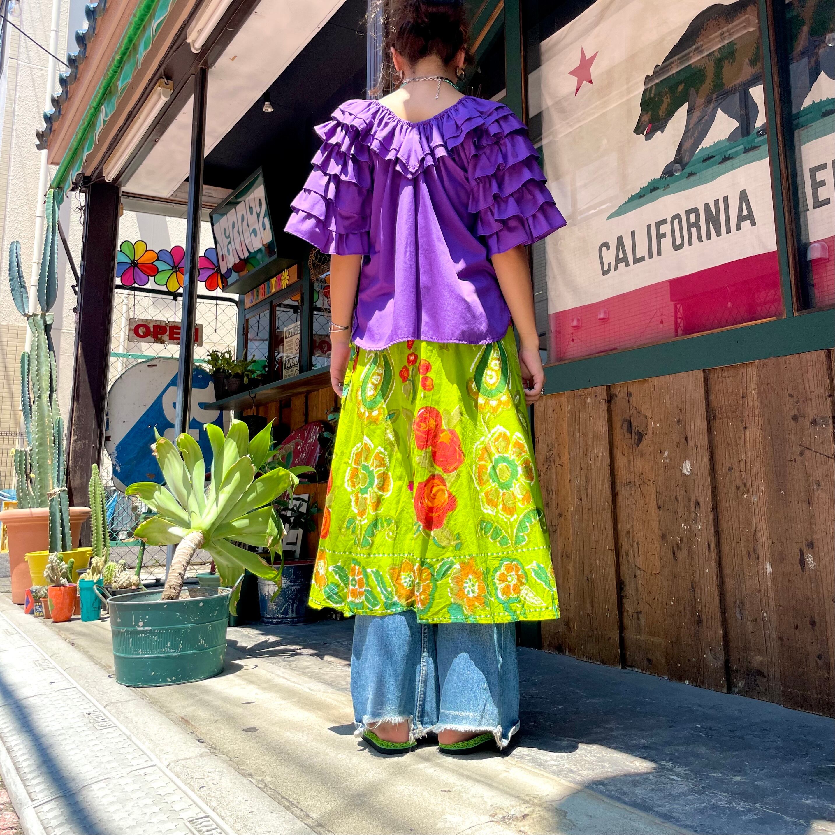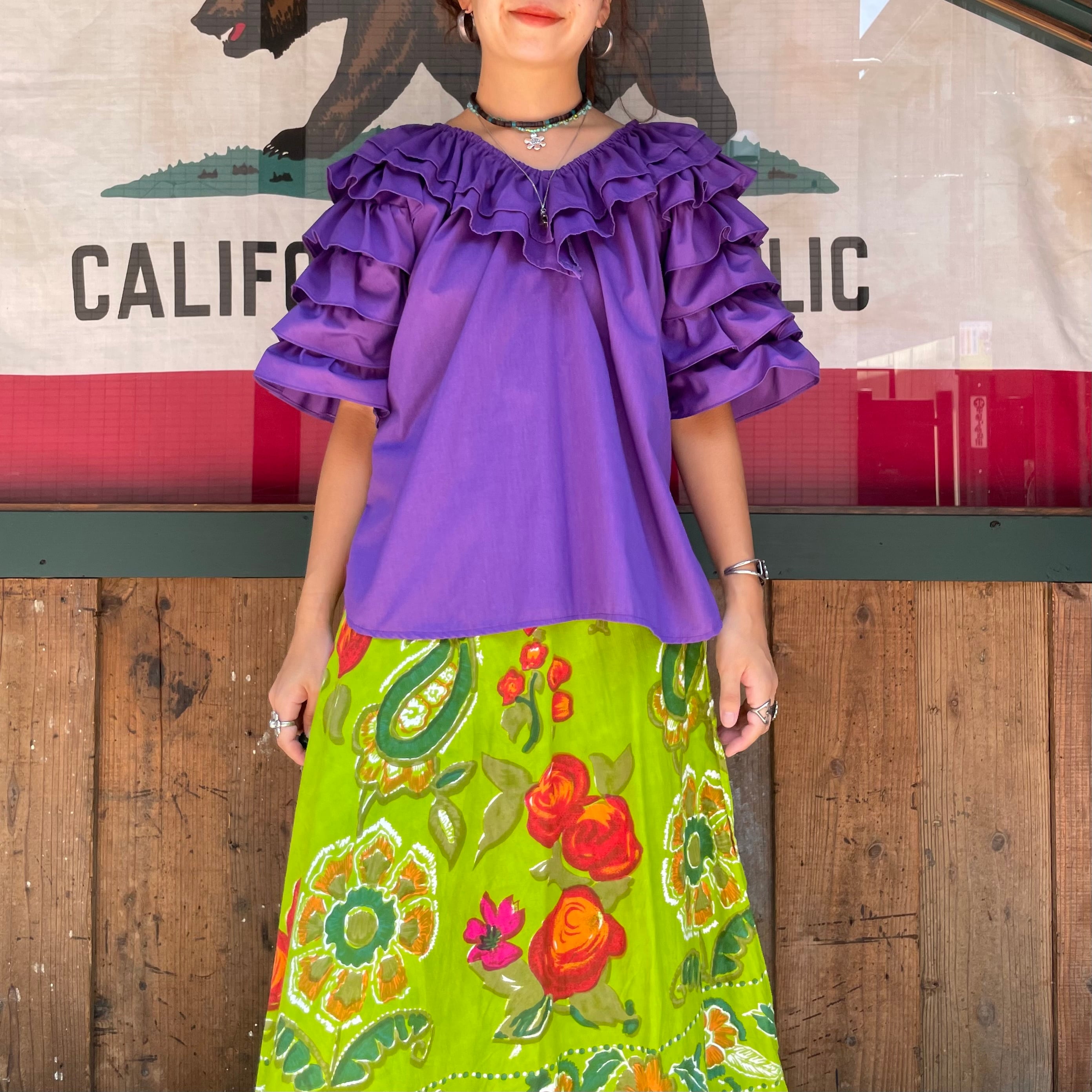 襟ぐりの2段フリルと袖が4段フリルで、ボリュームたっぷりな感じがかわいいチュニックです。