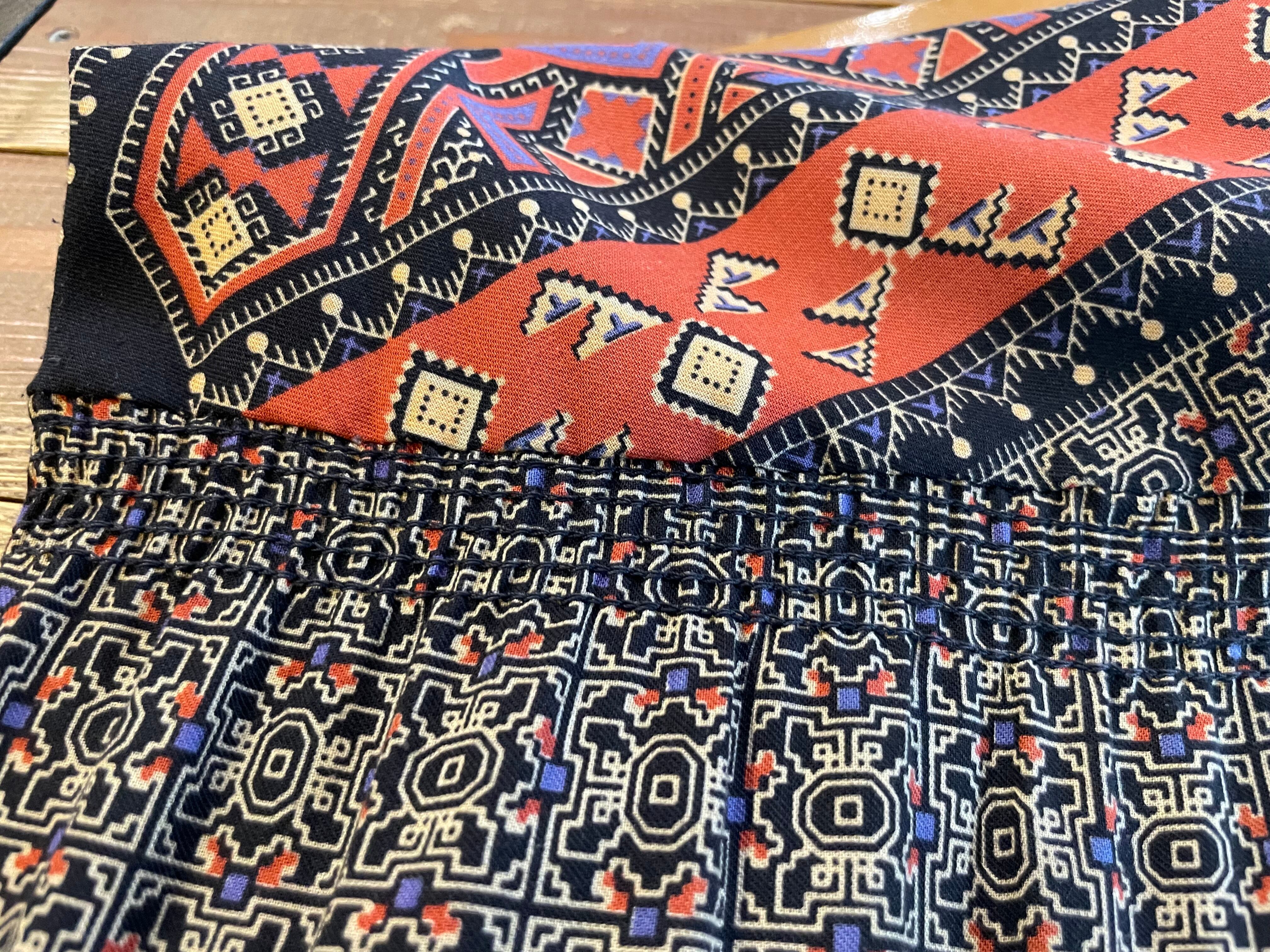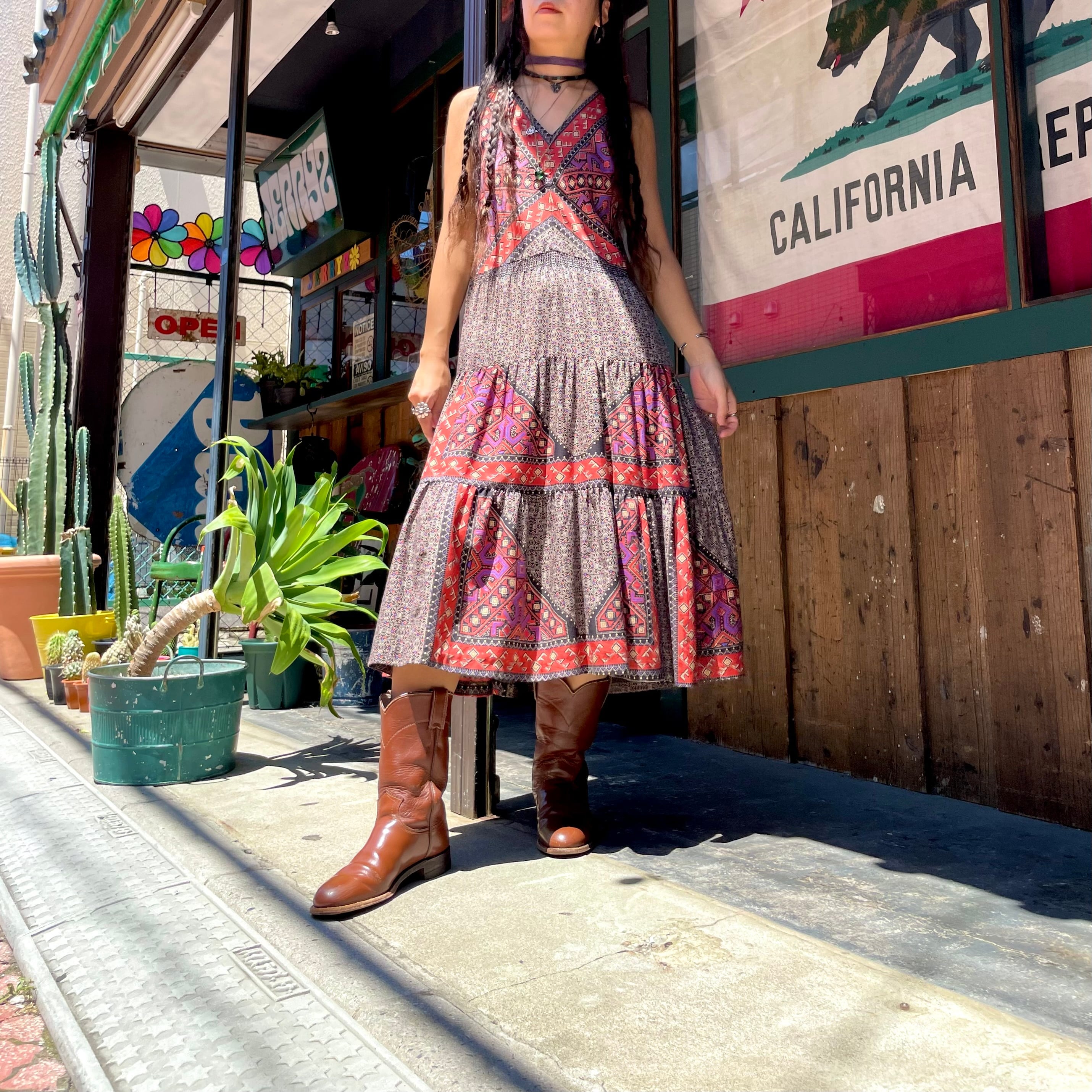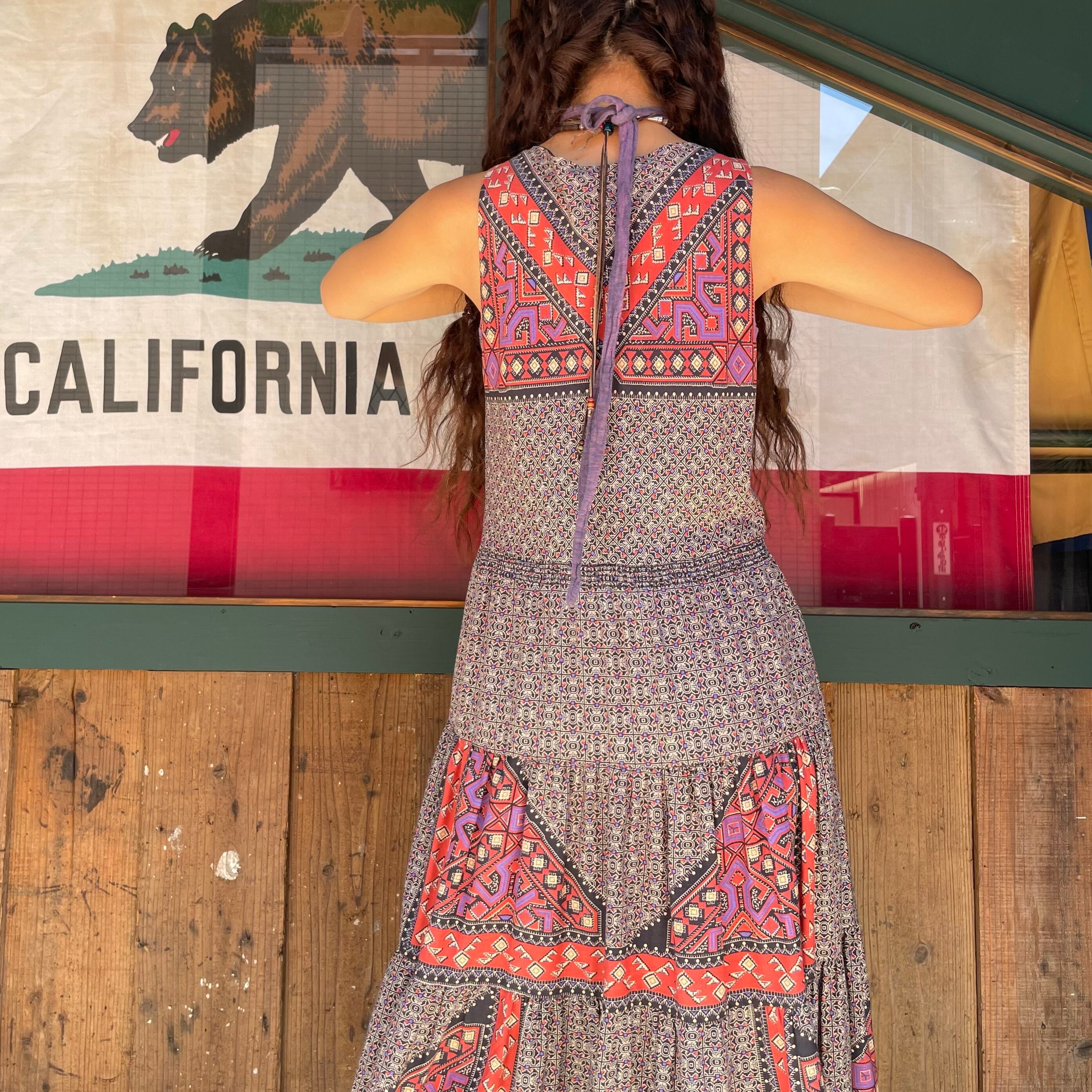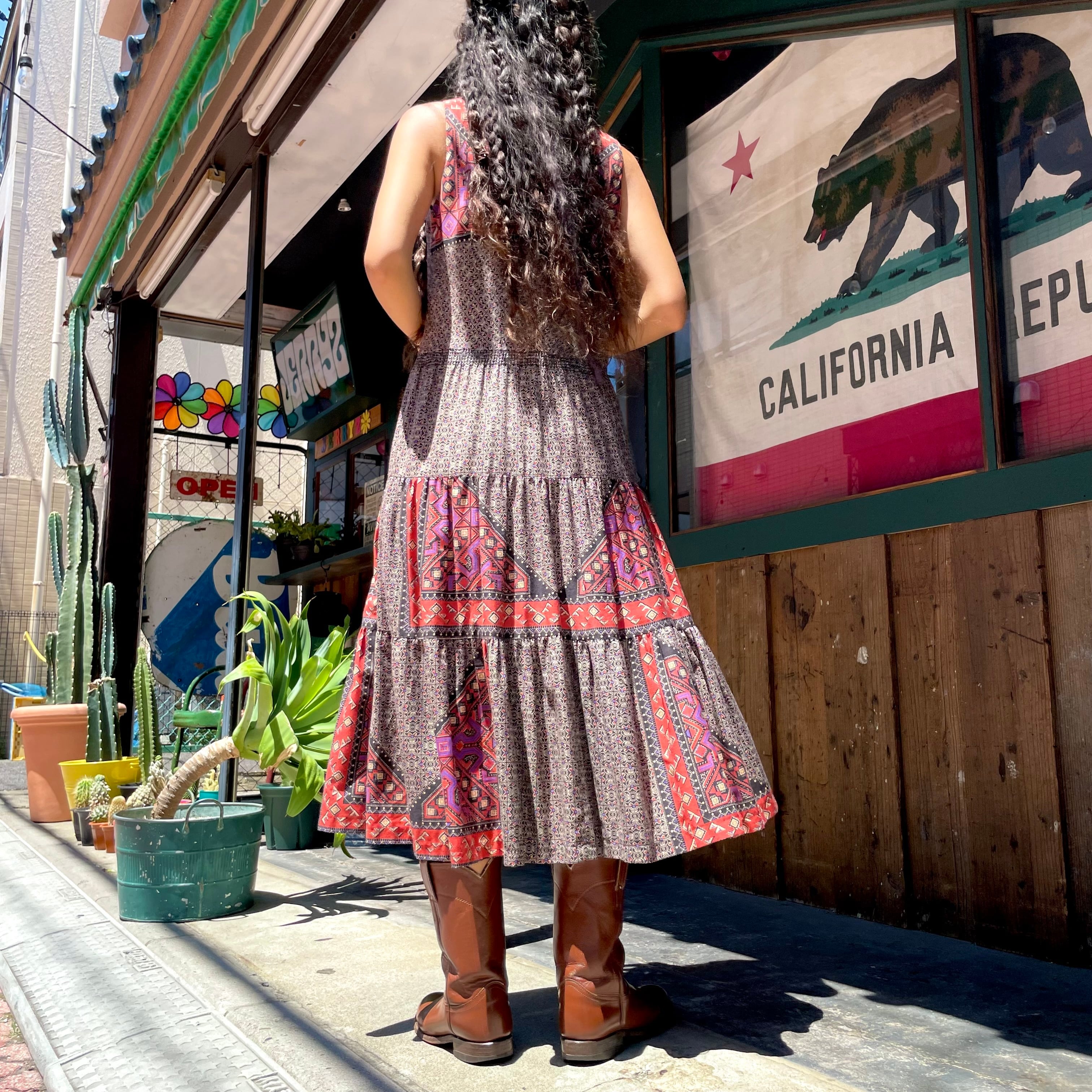 幾何学模様のような、エジプトっぽい感じもありつつ、ちょっとネイティブ柄っぽくもあり、不思議な柄でとても雰囲気のあるワンピースです。