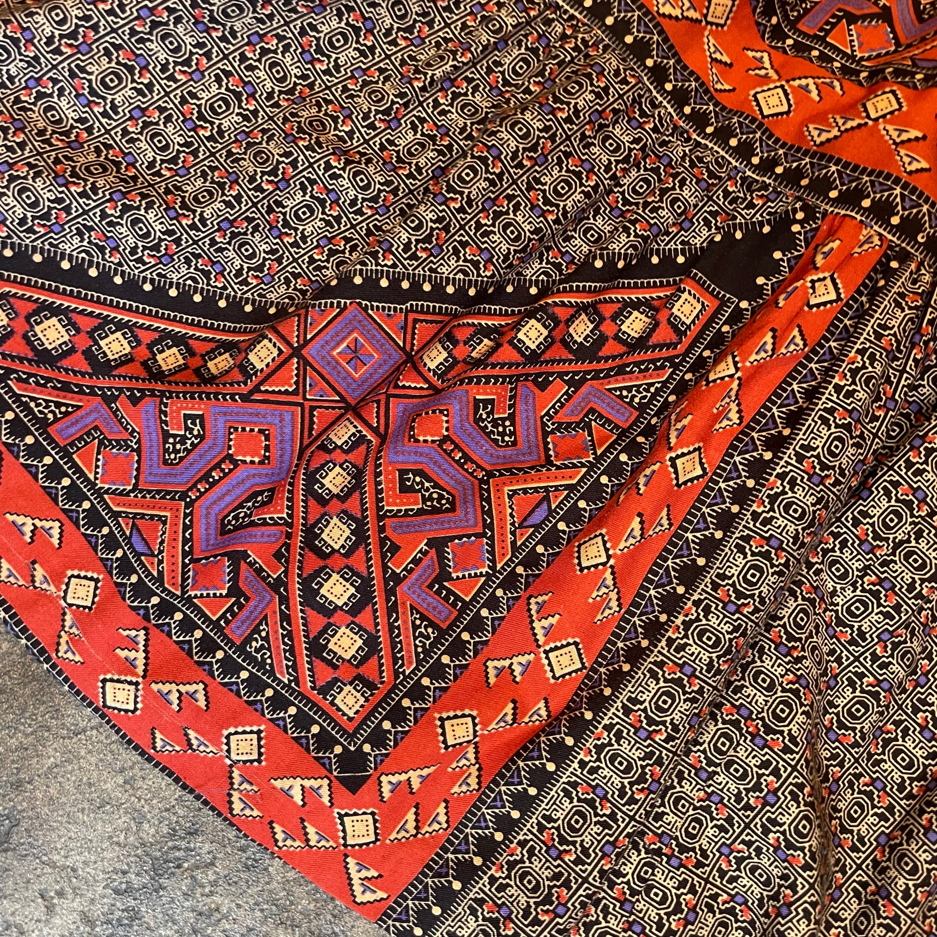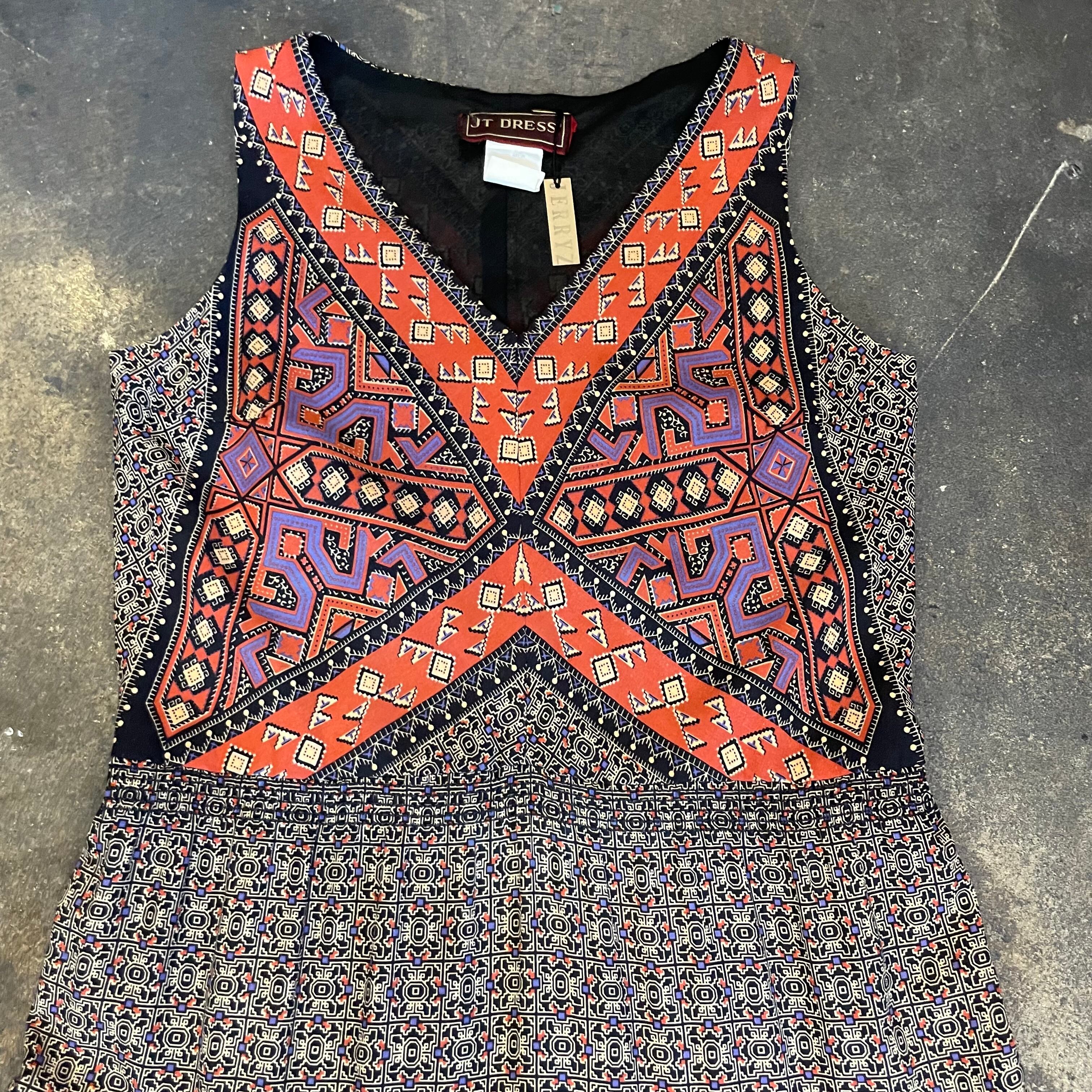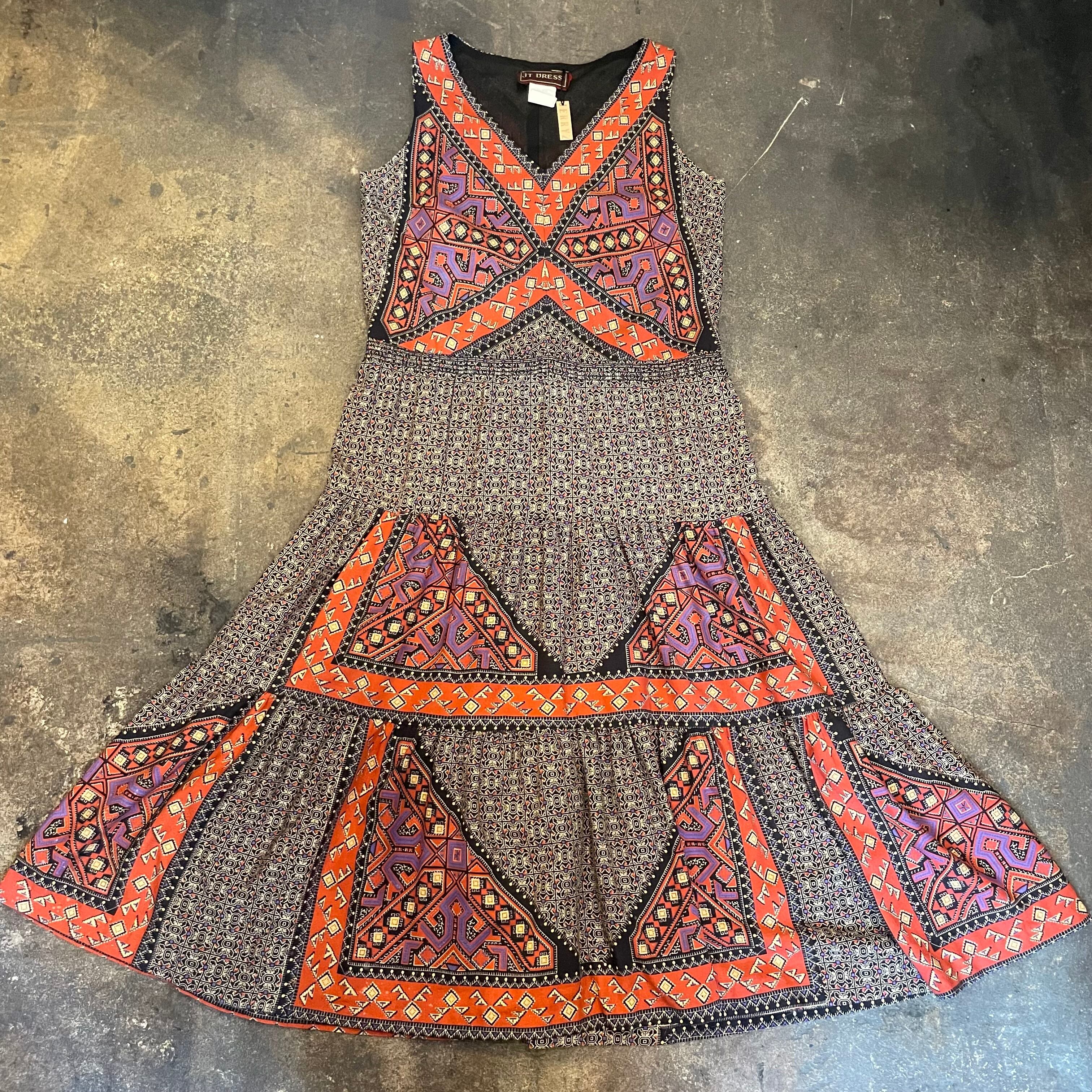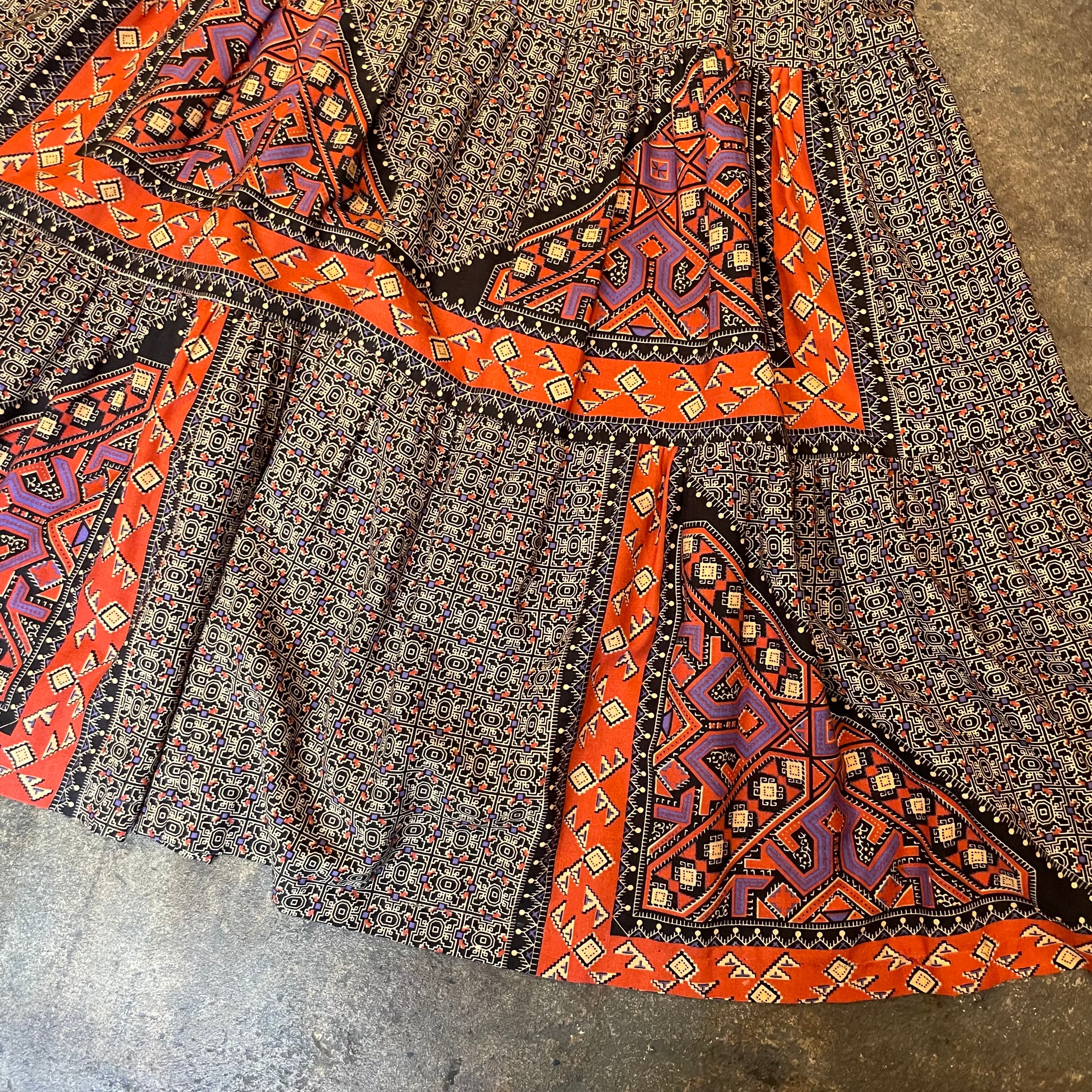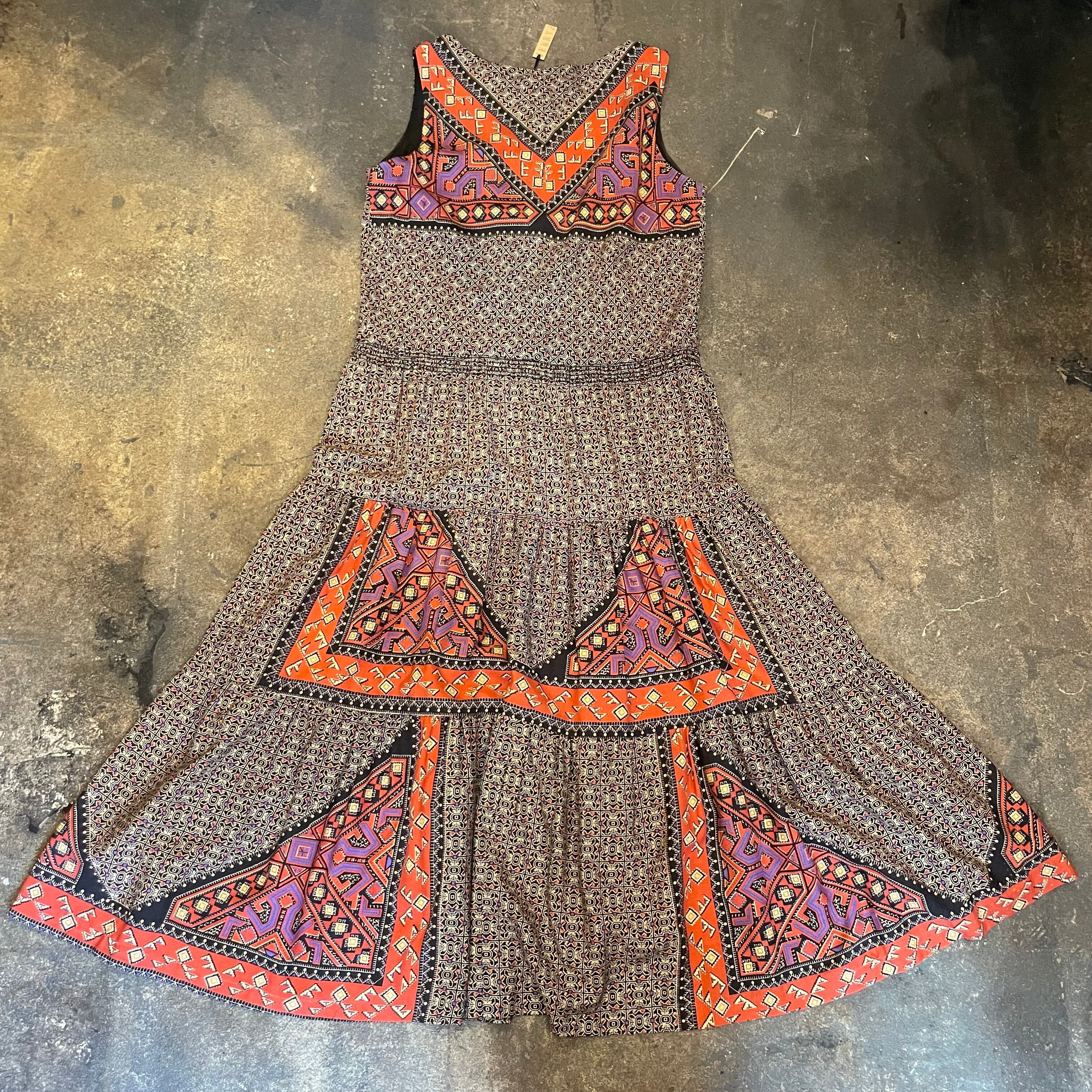 幾何学模様のような、エジプトっぽい感じもありつつ、ちょっとネイティブ柄っぽくもあり、不思議な柄でとても雰囲気のあるワンピースです。