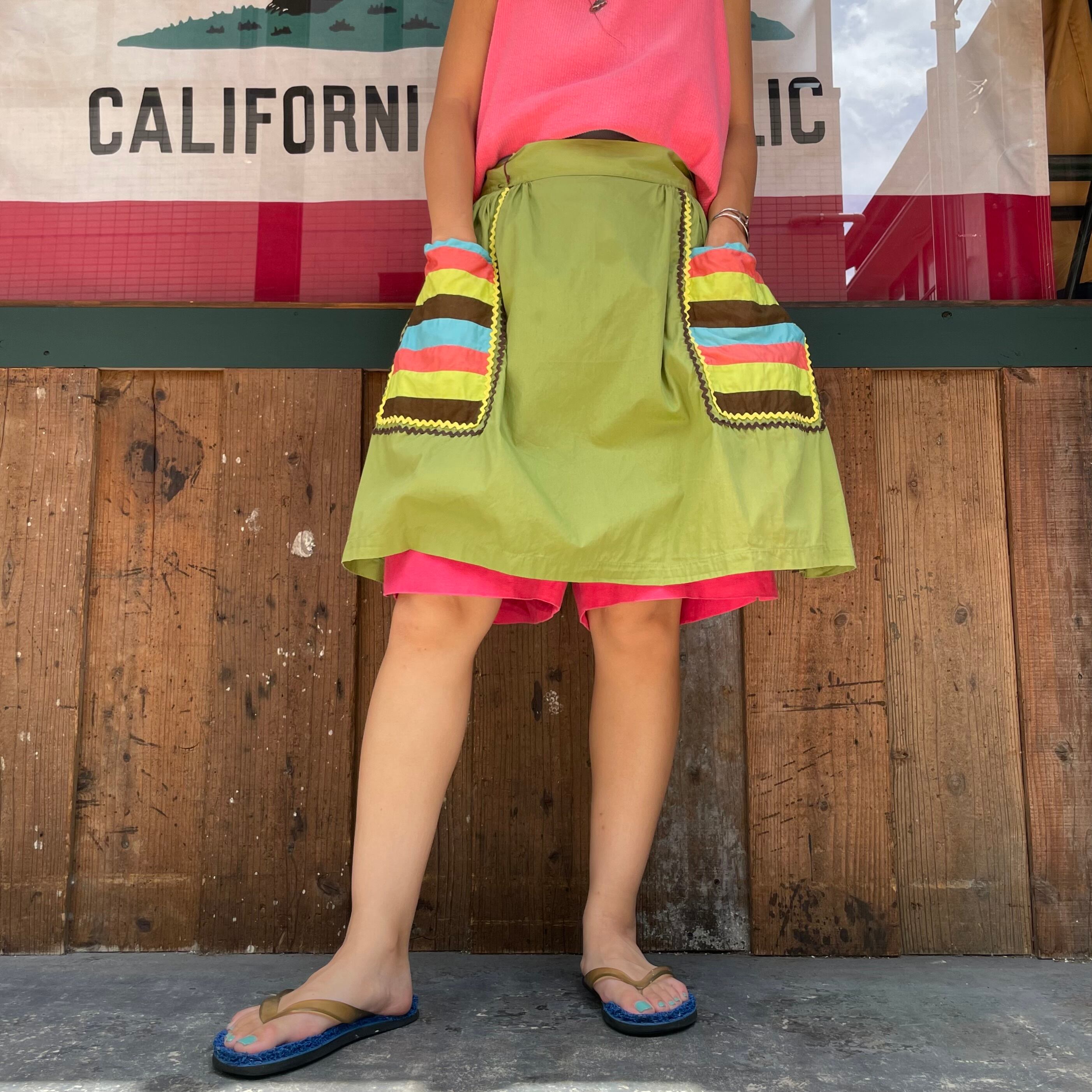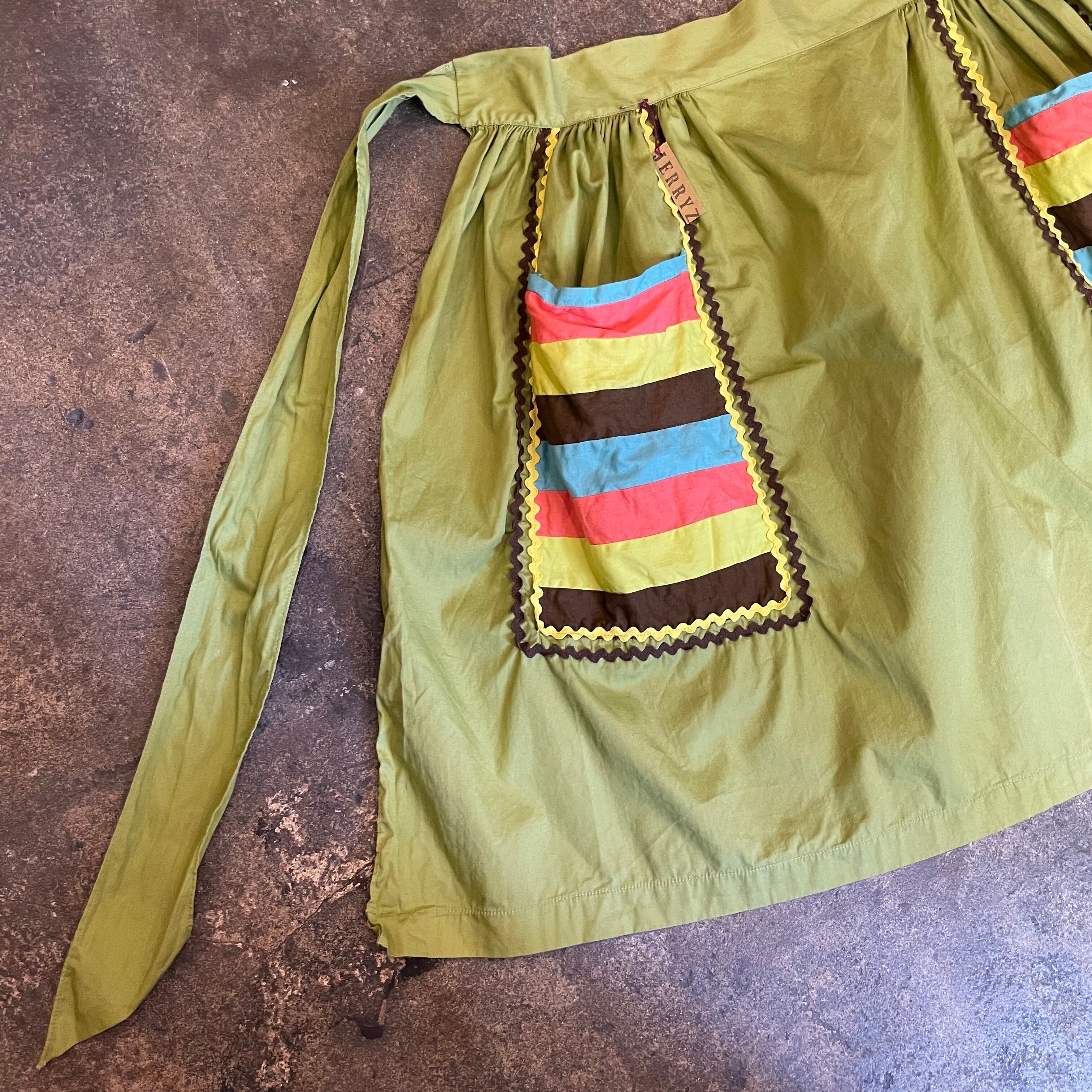 抹茶色にマルチボーダーにパッチワークされたポケット、二色の山道テープがかわいい、おそらく60〜70年代頃のエプロンです。