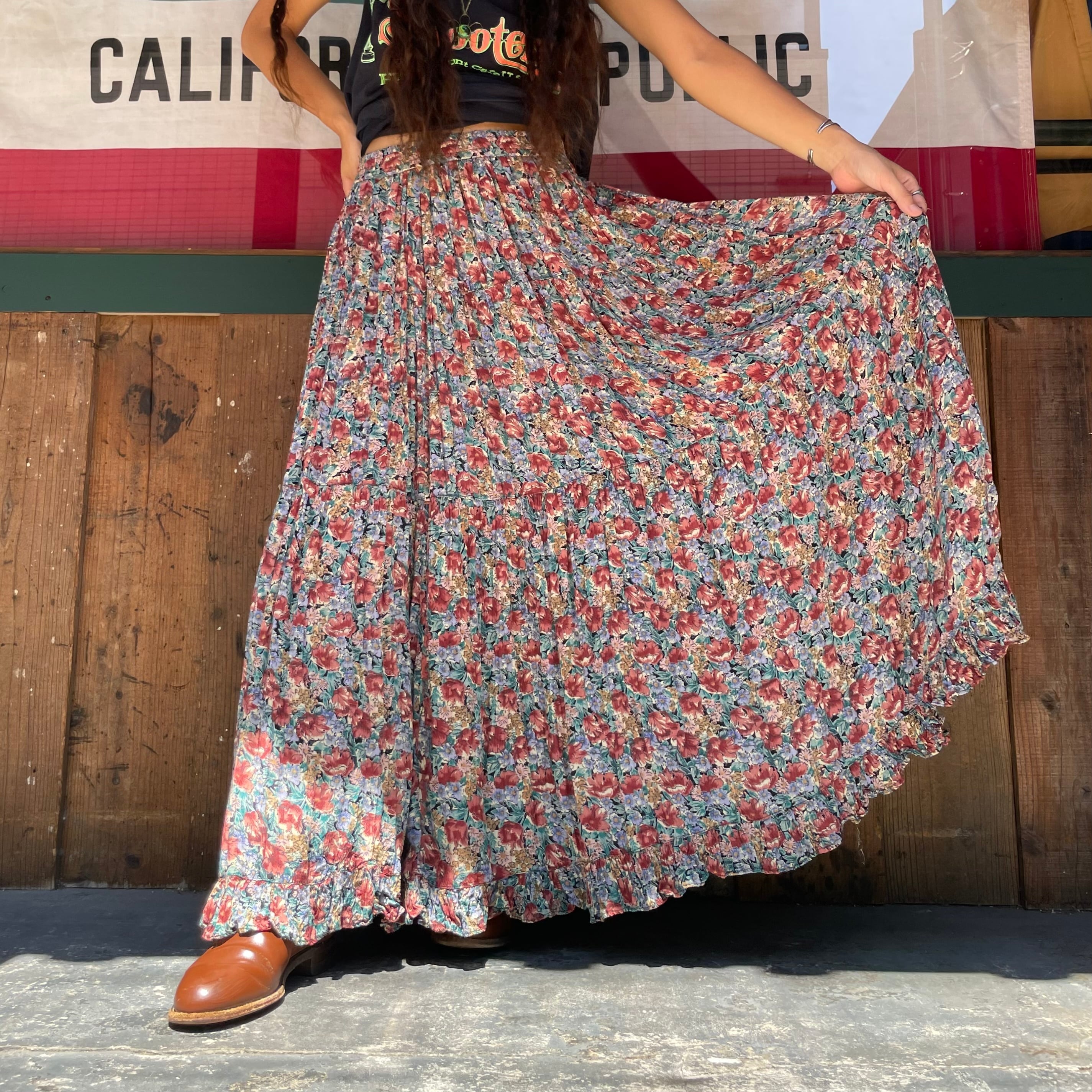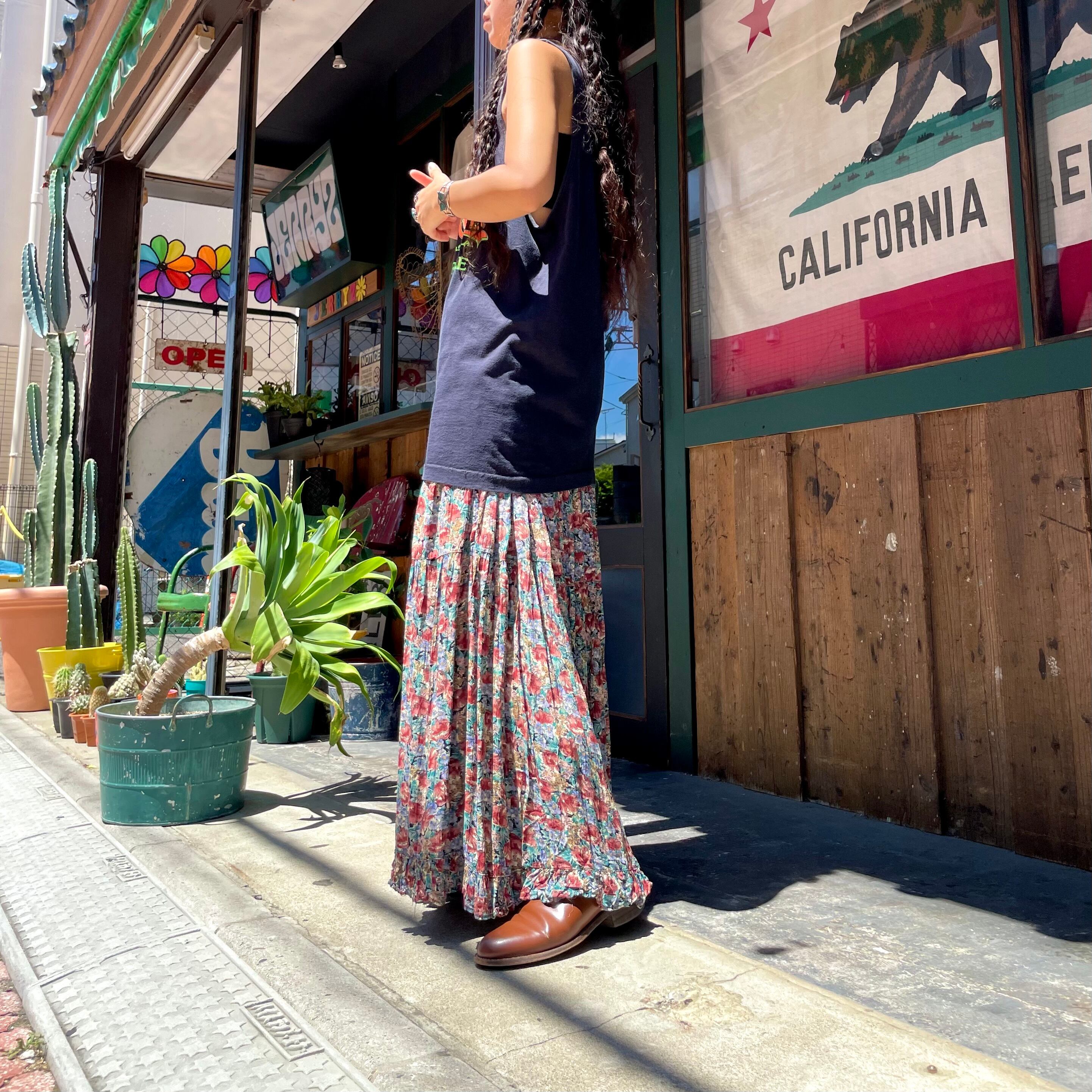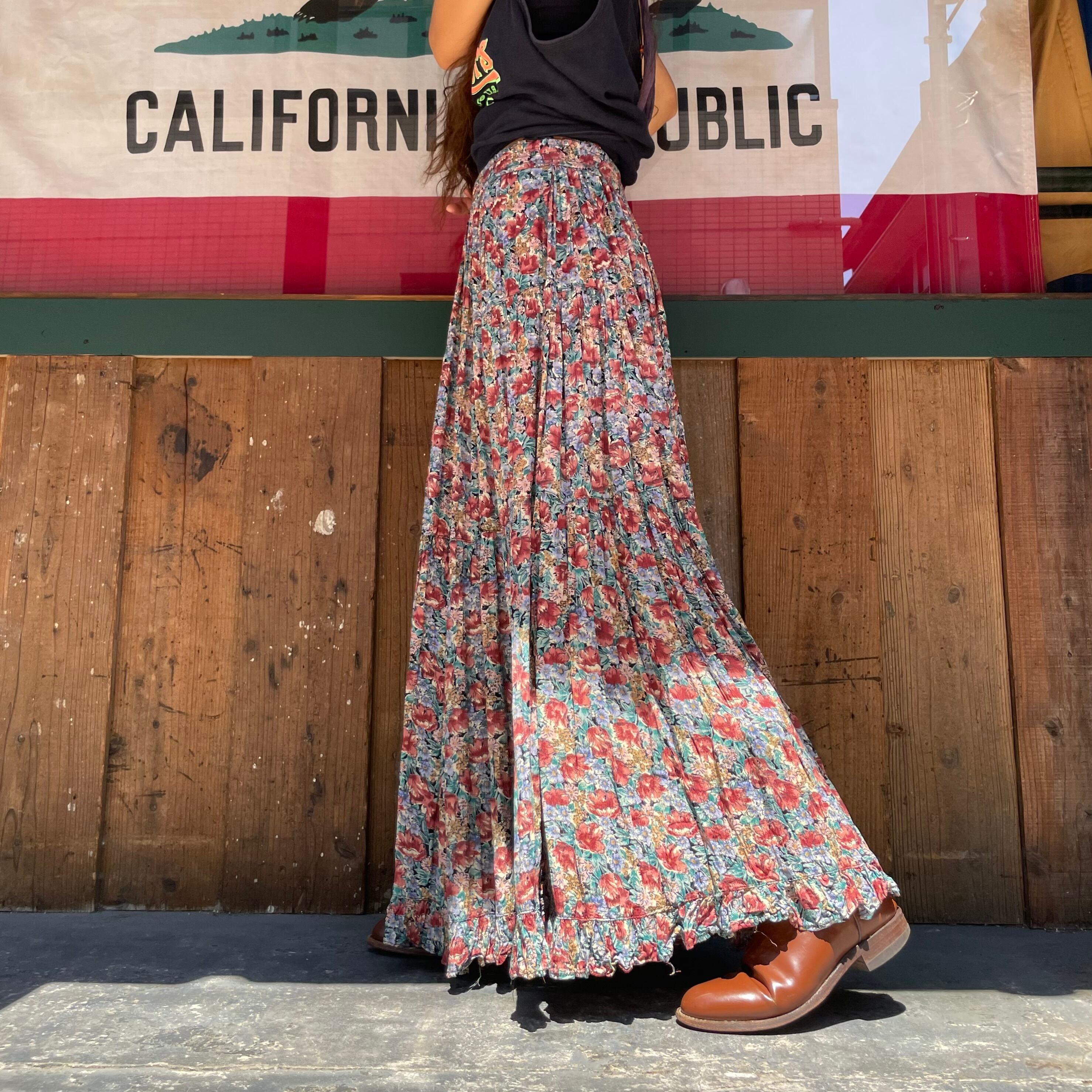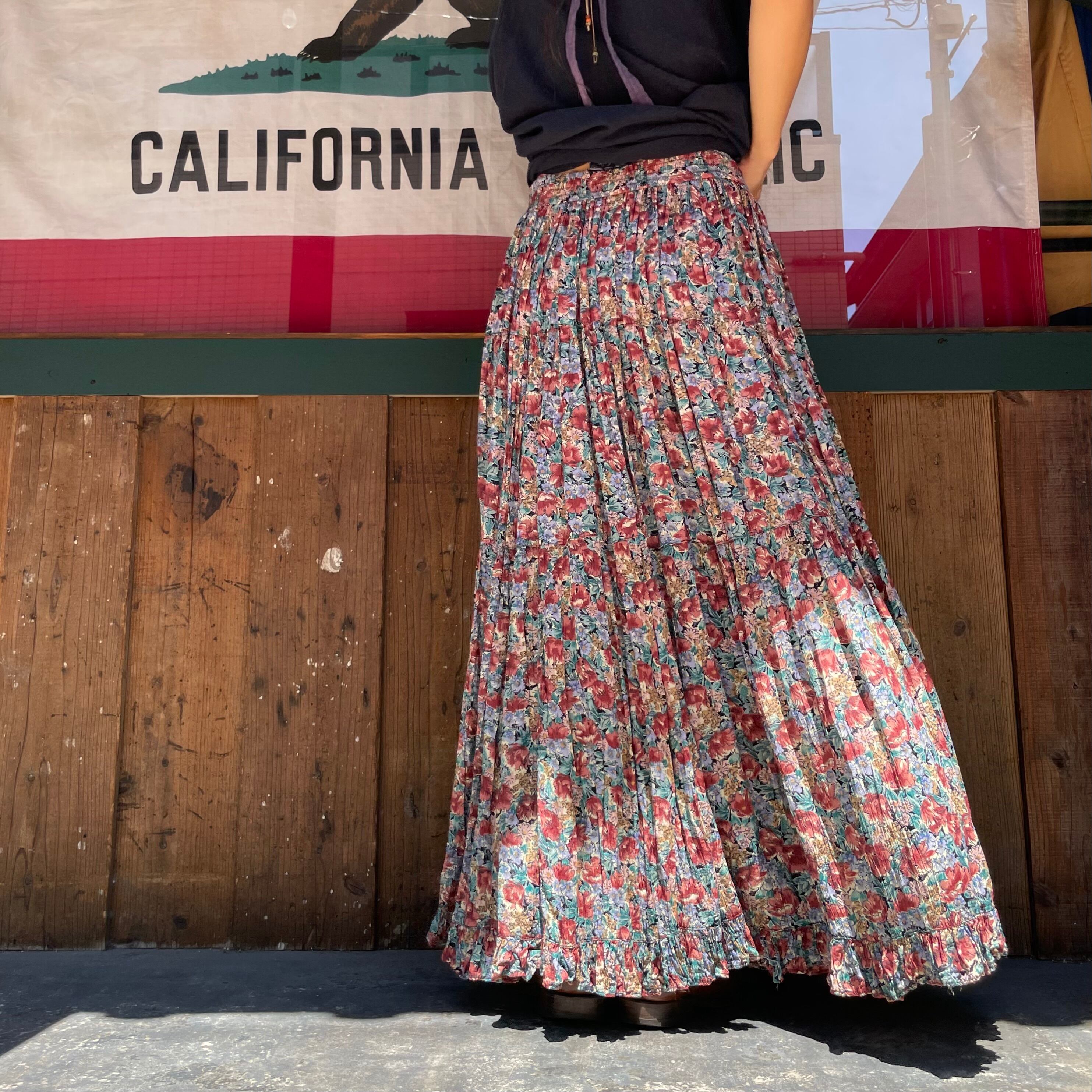 全体的に渋めなカラーで雰囲気のある花柄がかわいいロングスカートです。