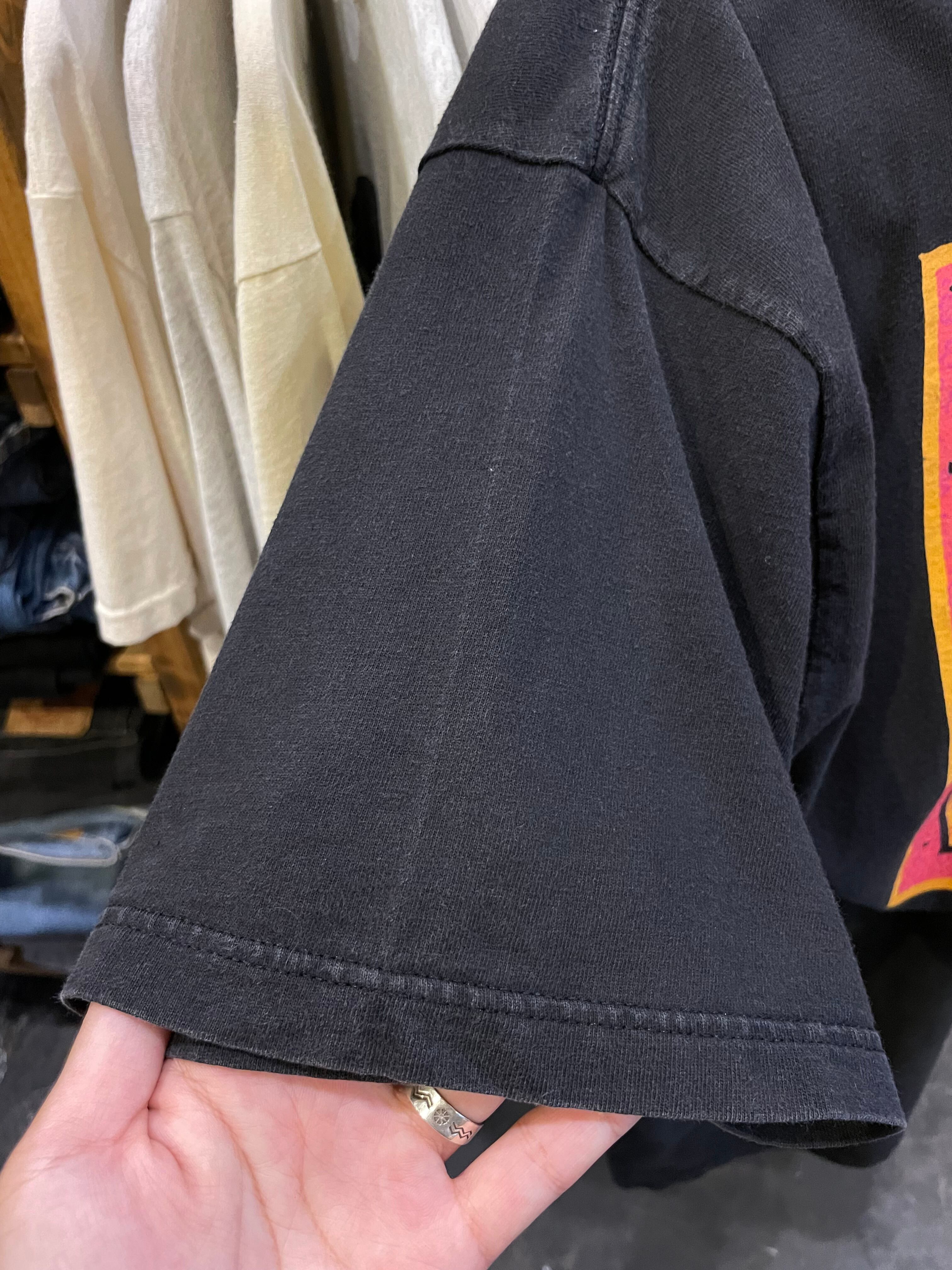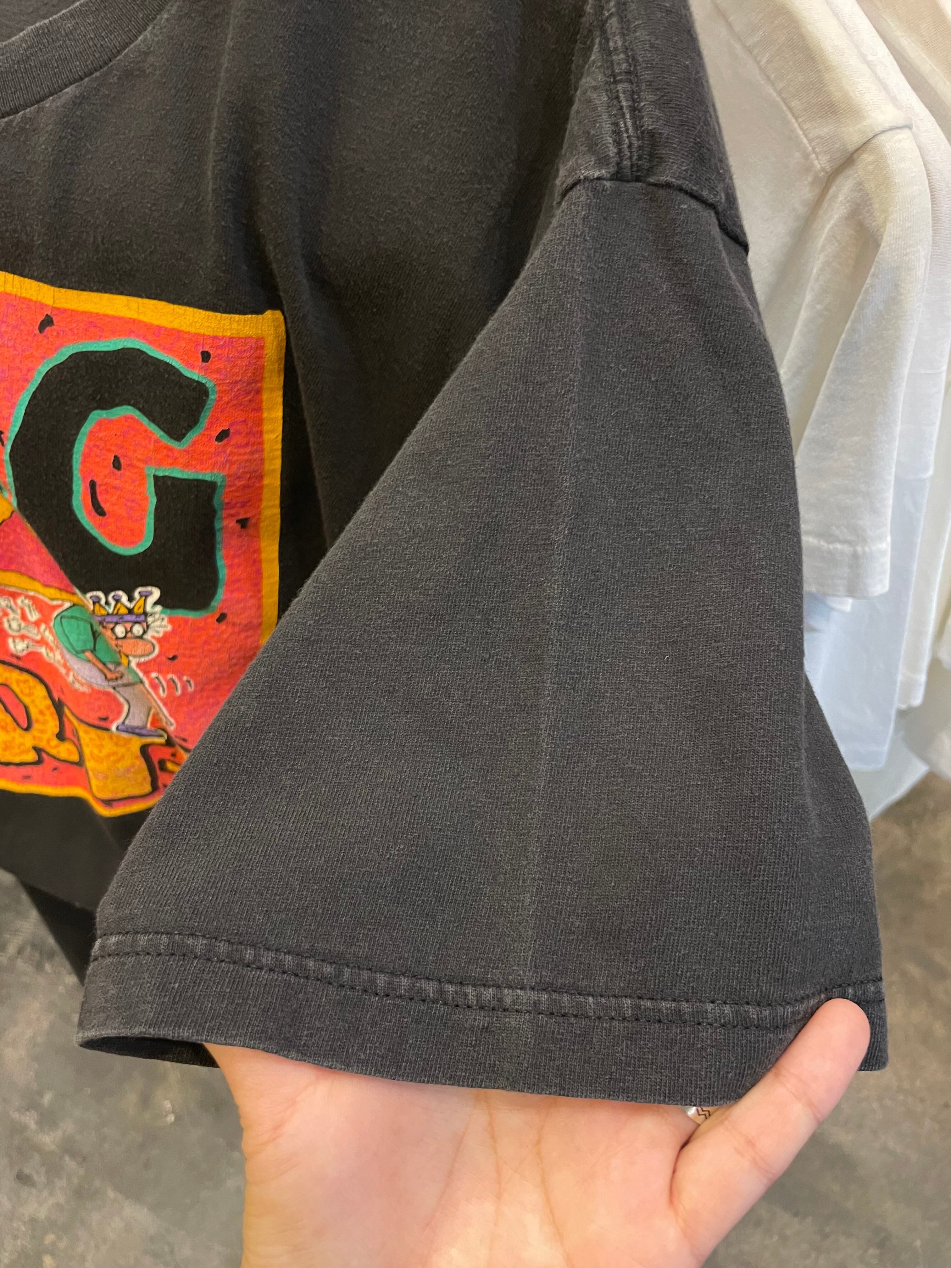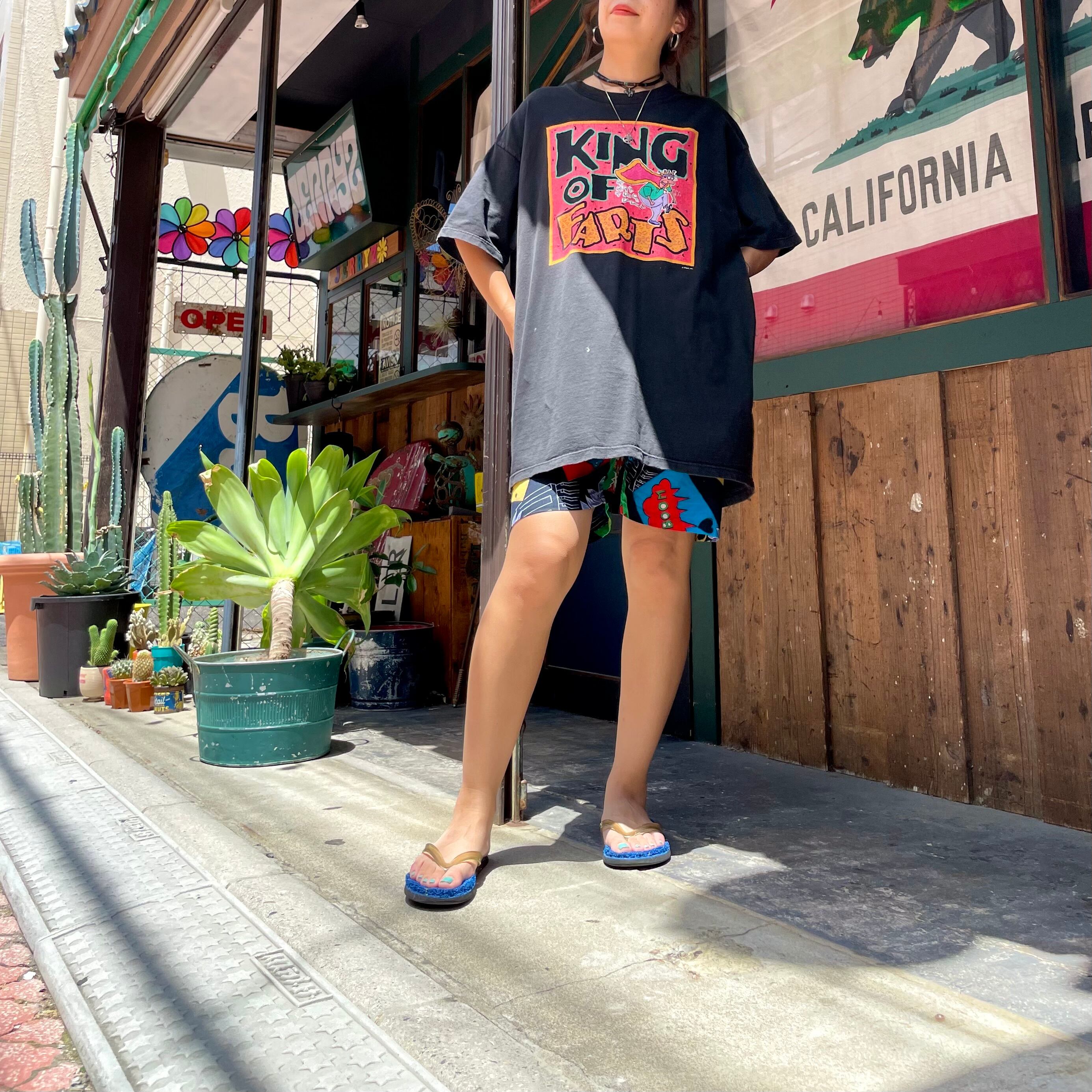 黒ボディにポップなデザインとカラーのプリントが映えてかわいいTシャツです。