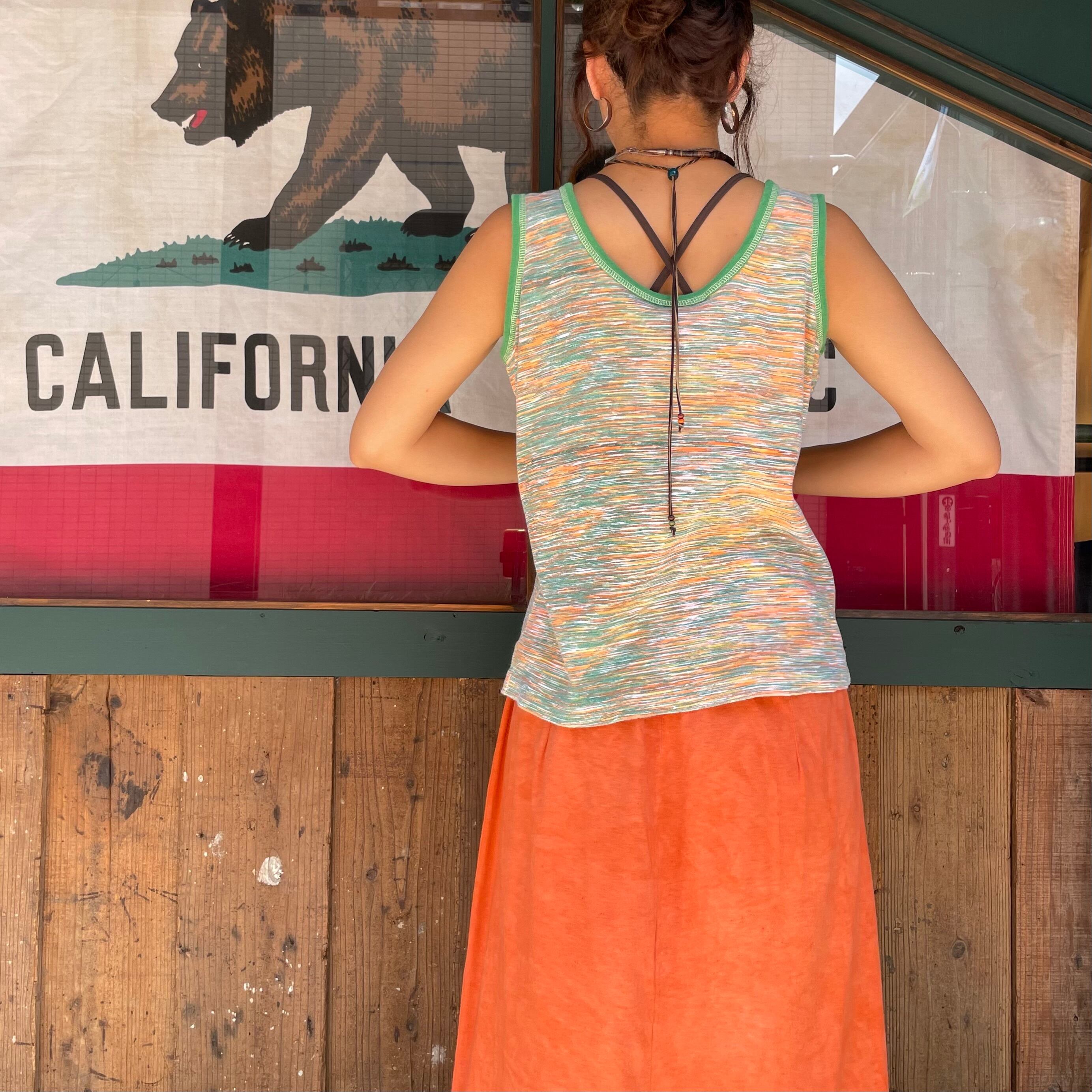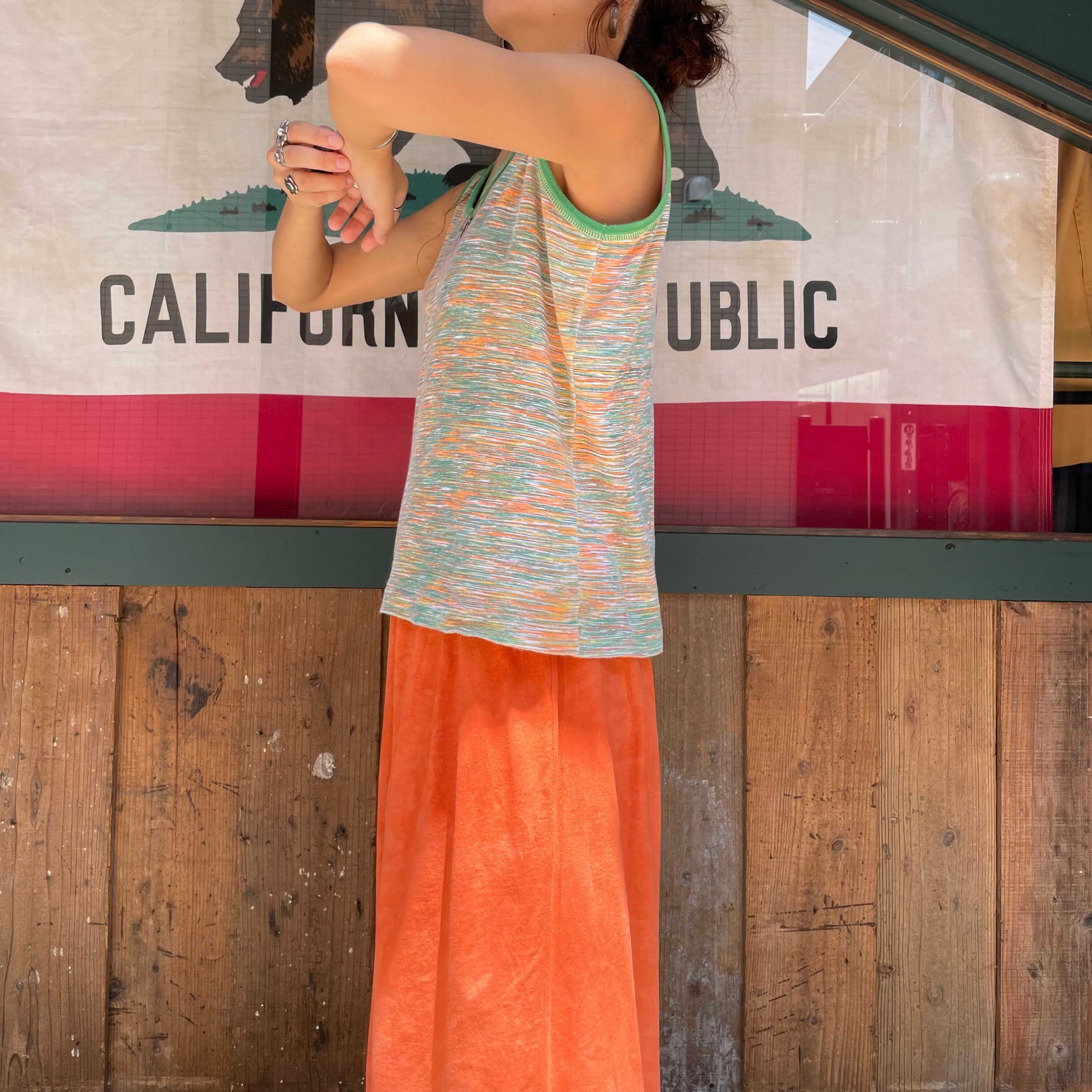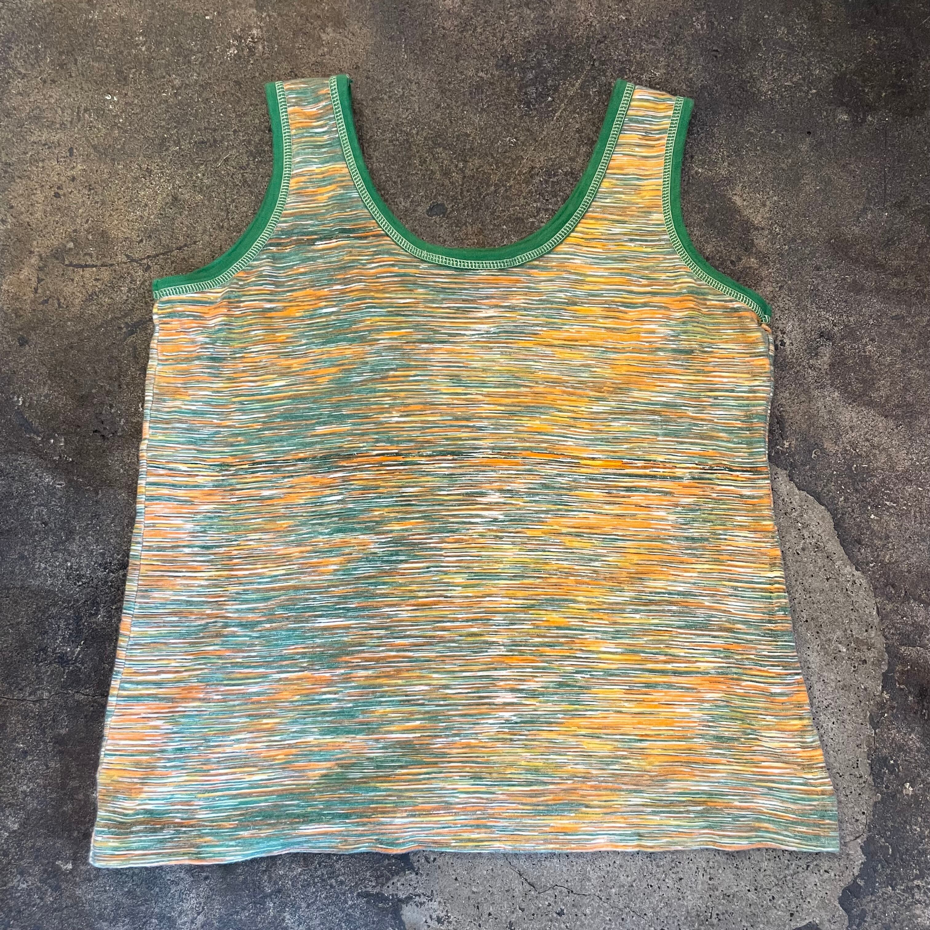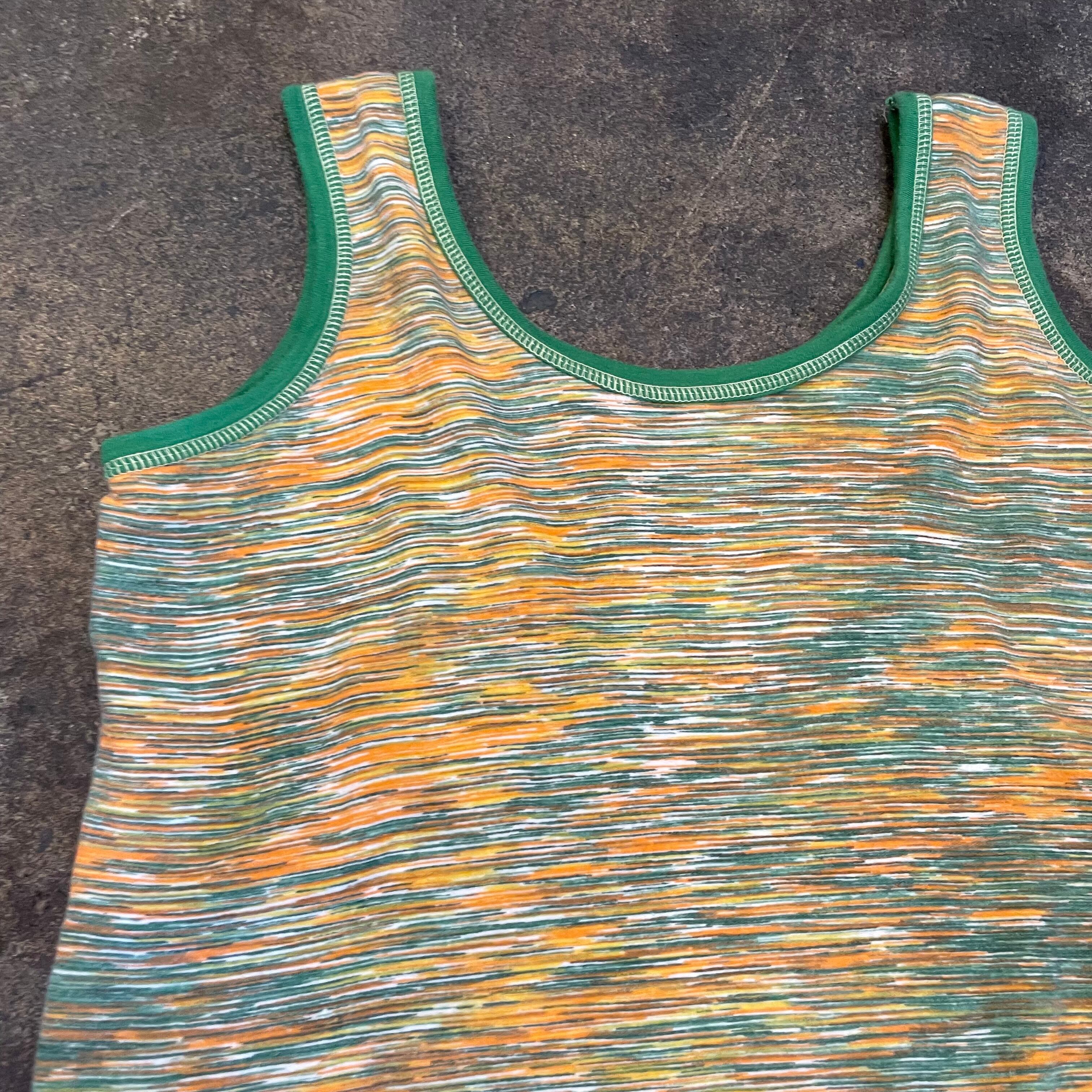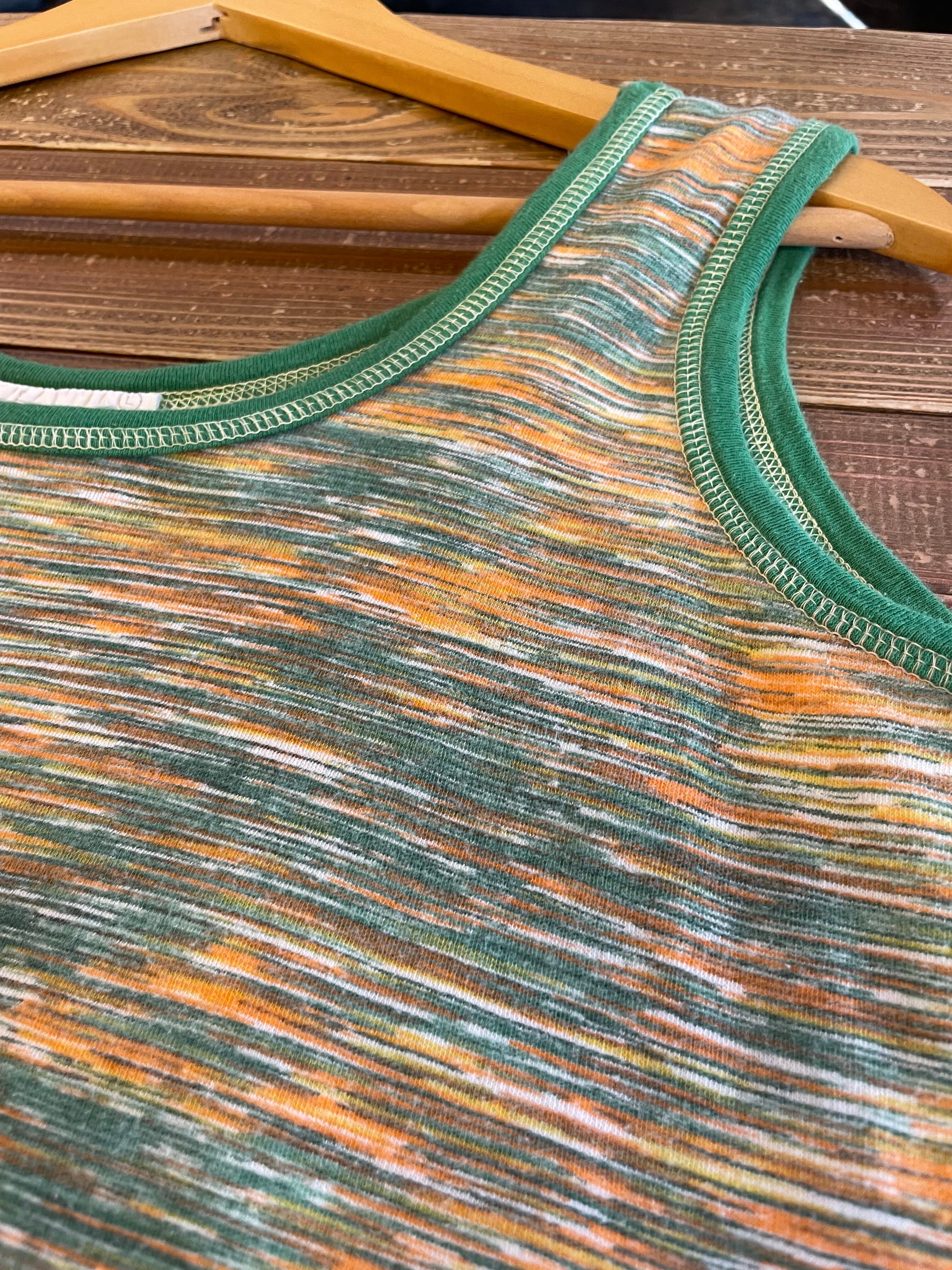 緑×オレンジのシュシュっと混ざり合った模様がかわいい70年代頃のタンクトップです。