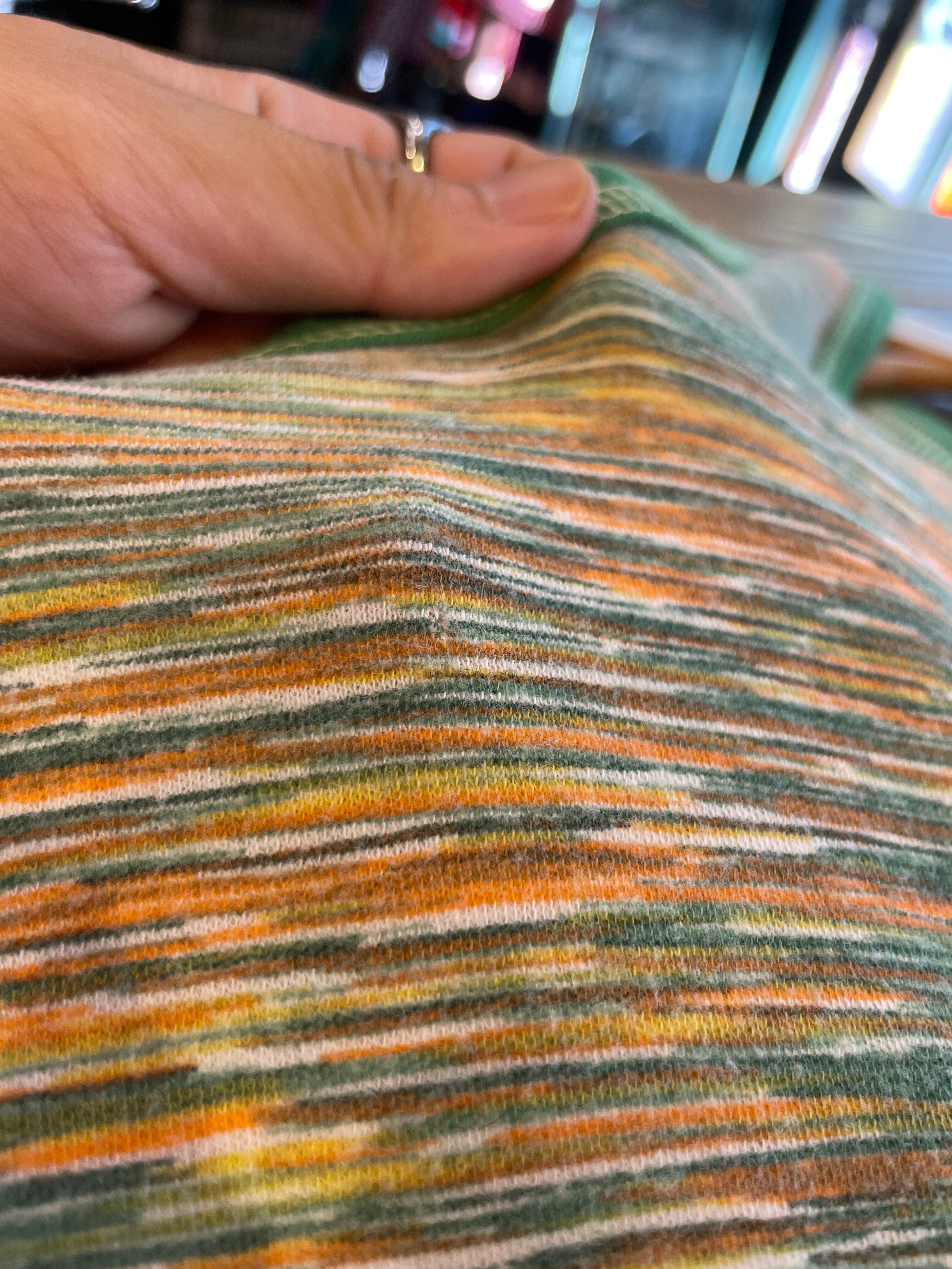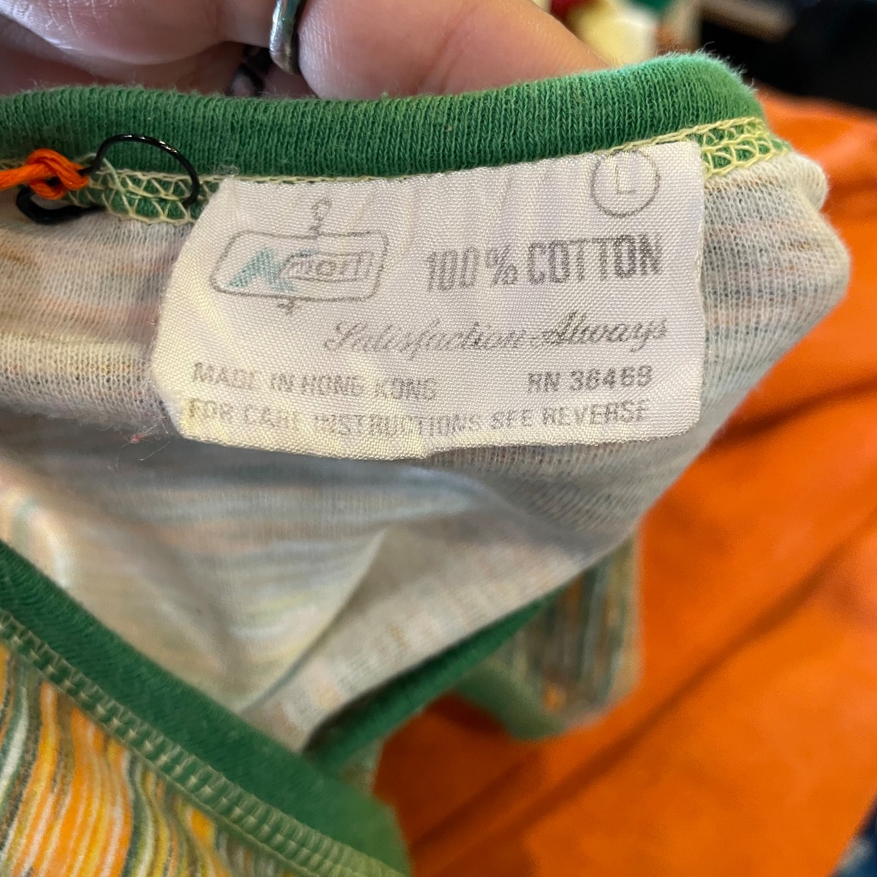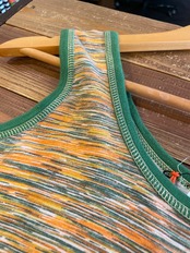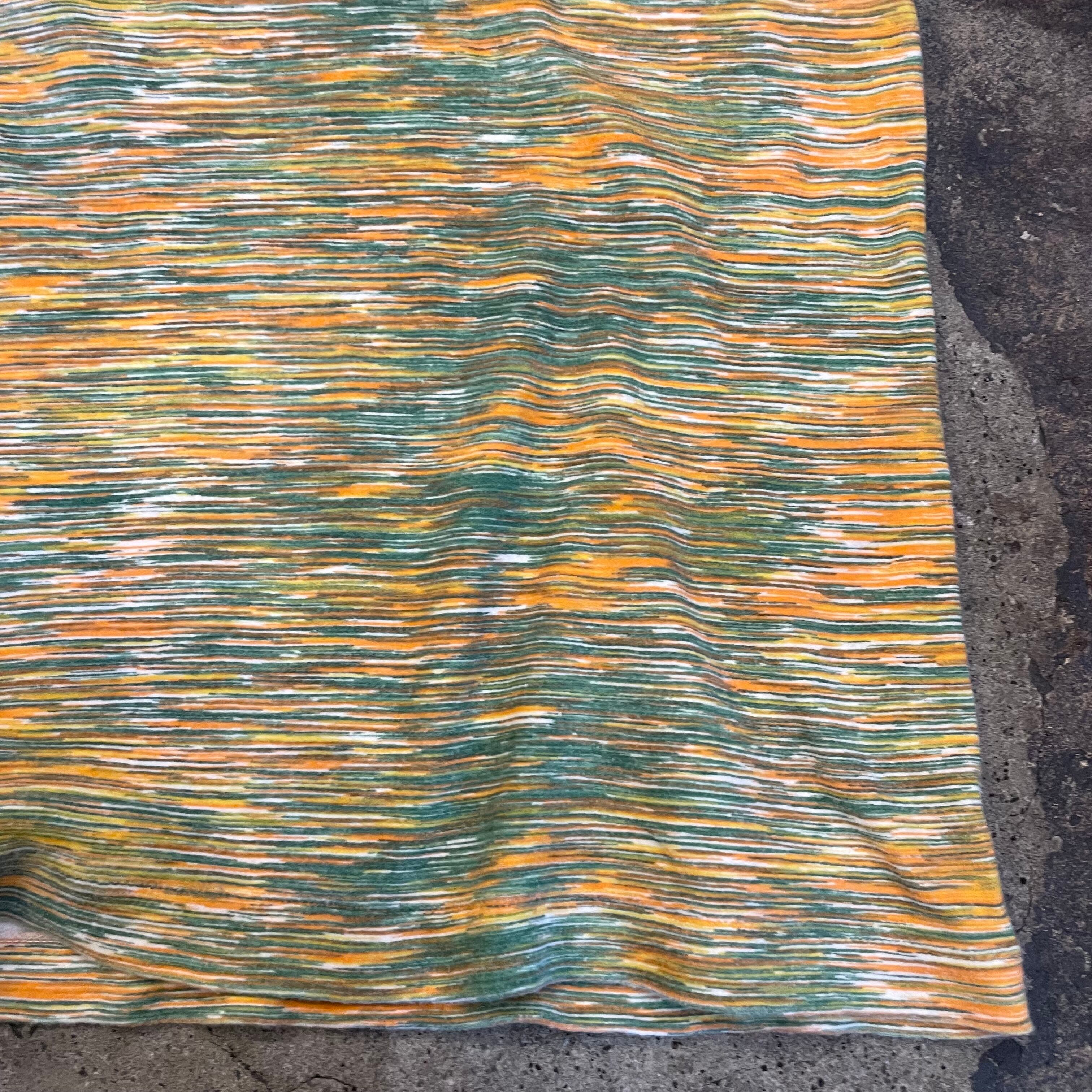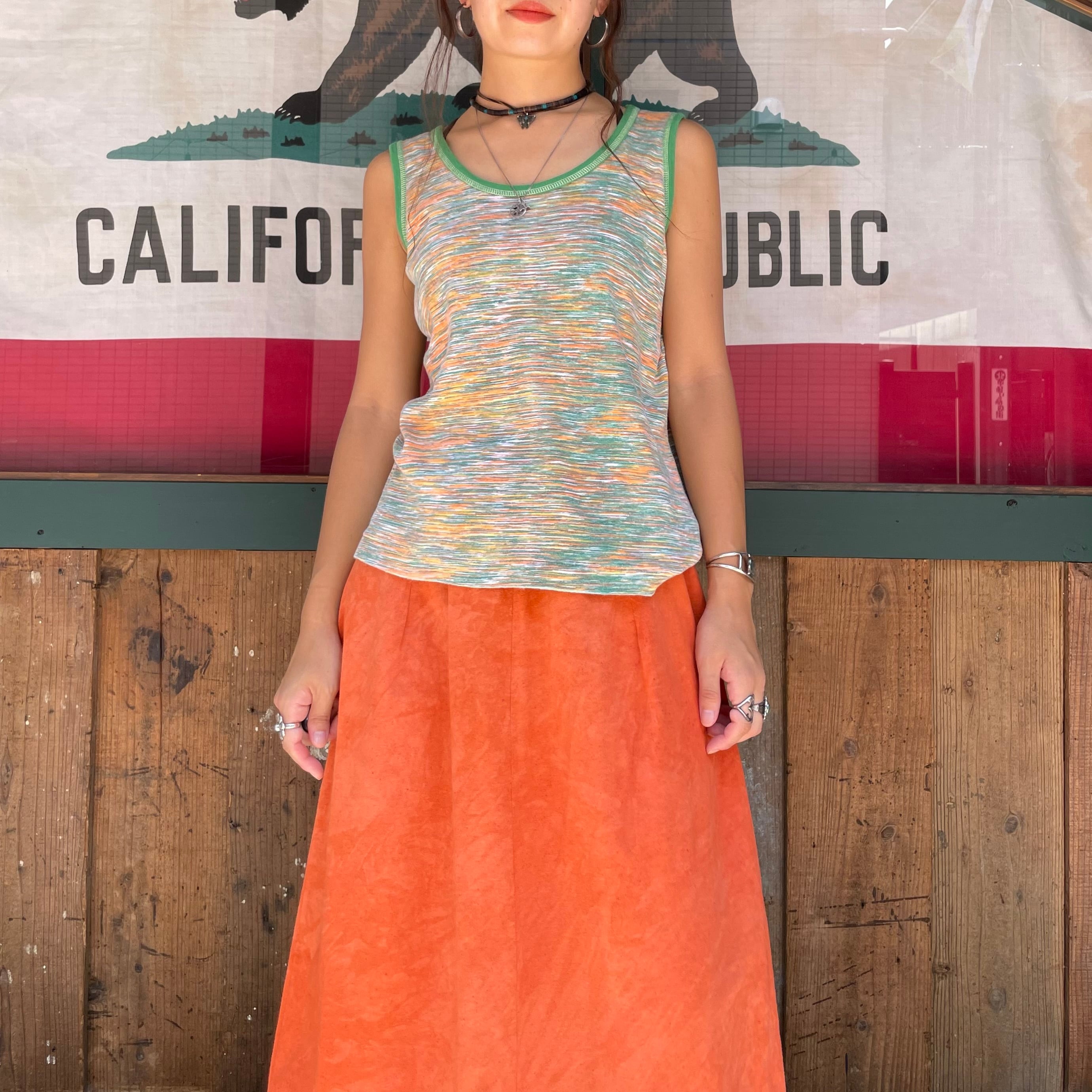緑×オレンジのシュシュっと混ざり合った模様がかわいい70年代頃のタンクトップです。