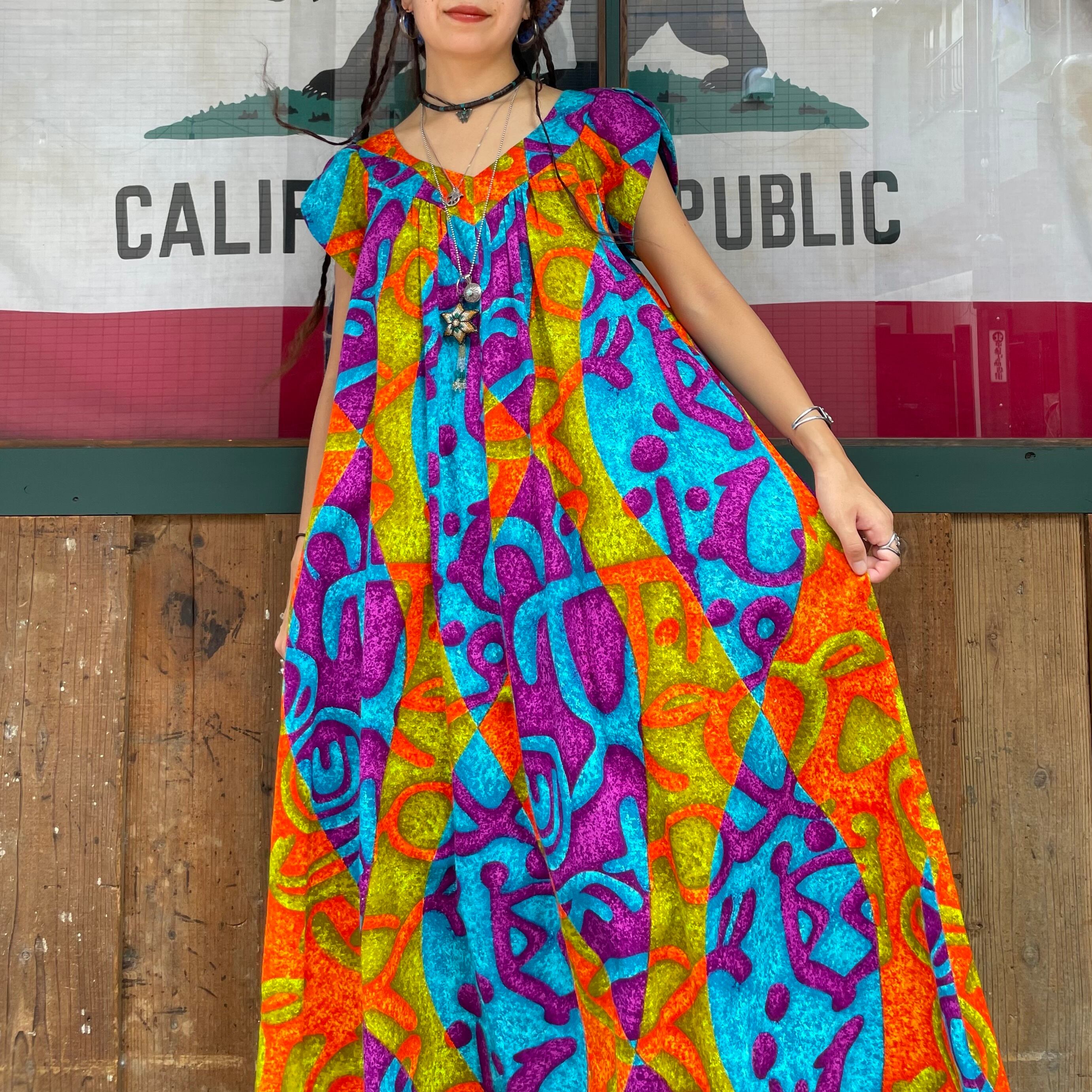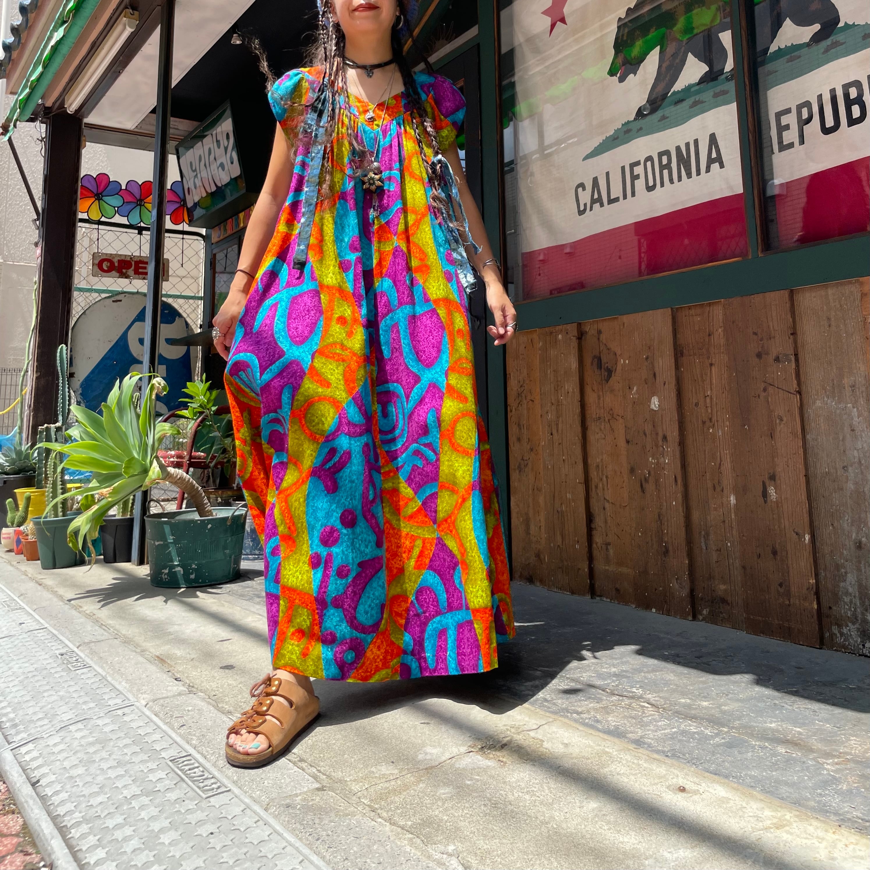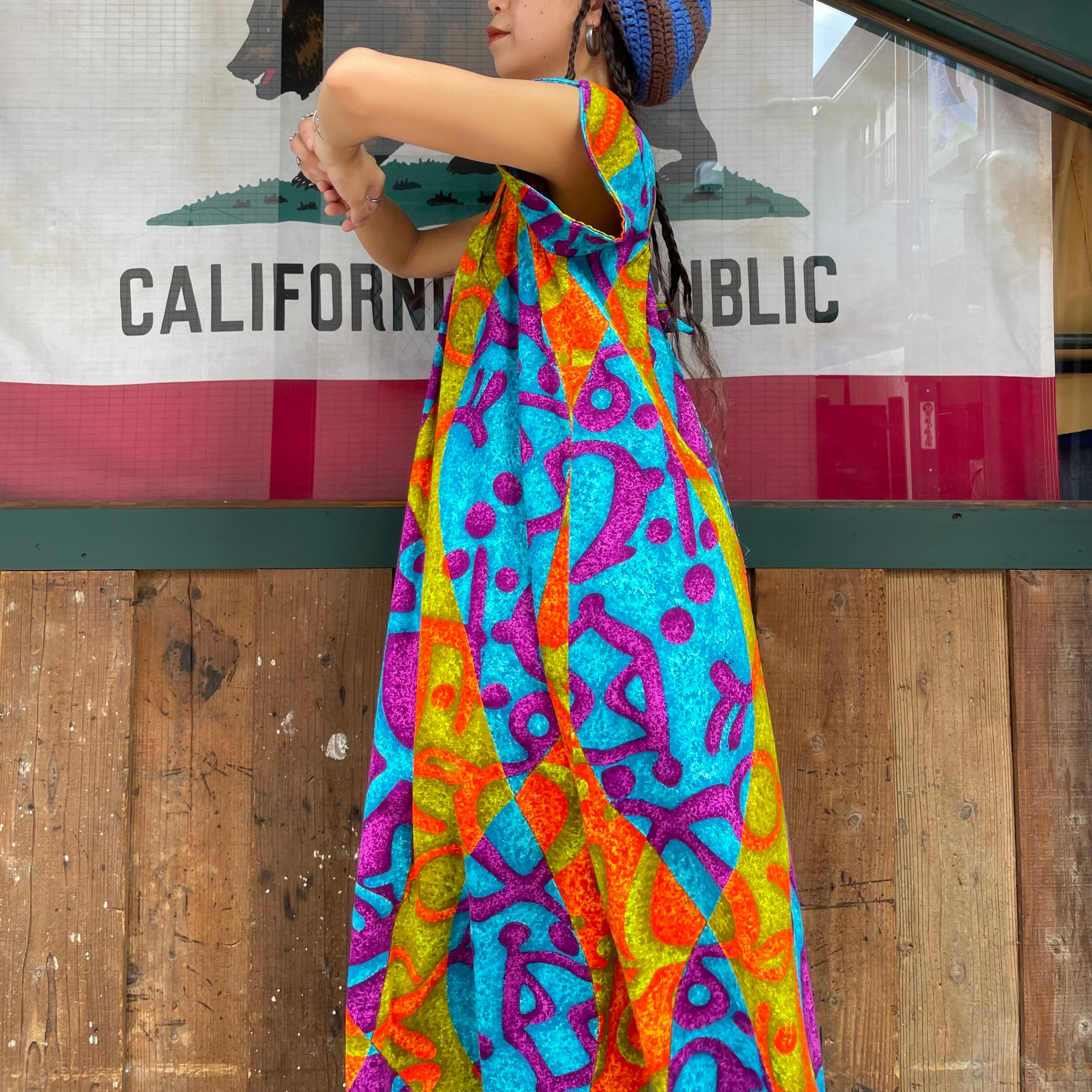 サイケデリックなカラーリングとハワイアンな模様がかっこいい70年代頃のワンピースです。
