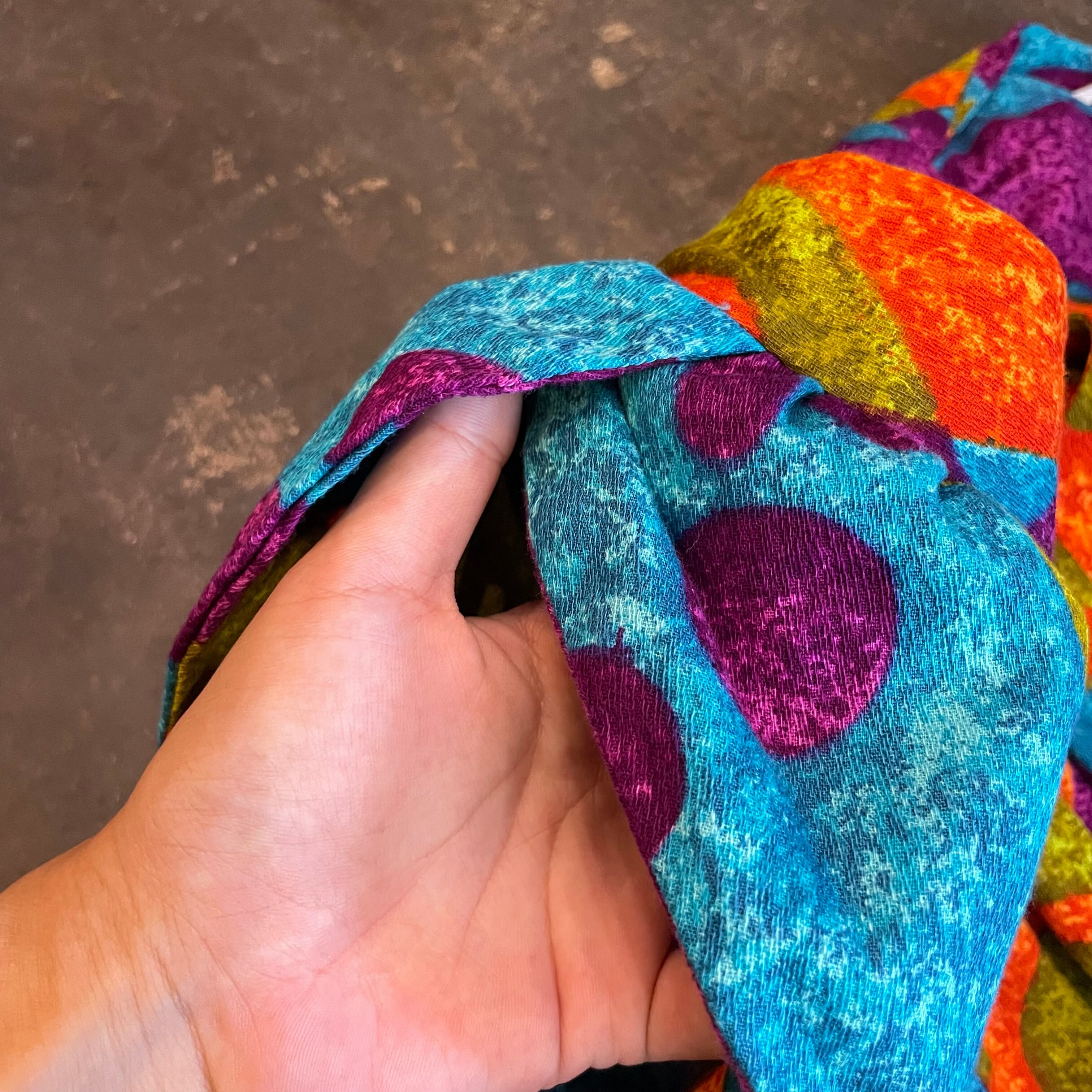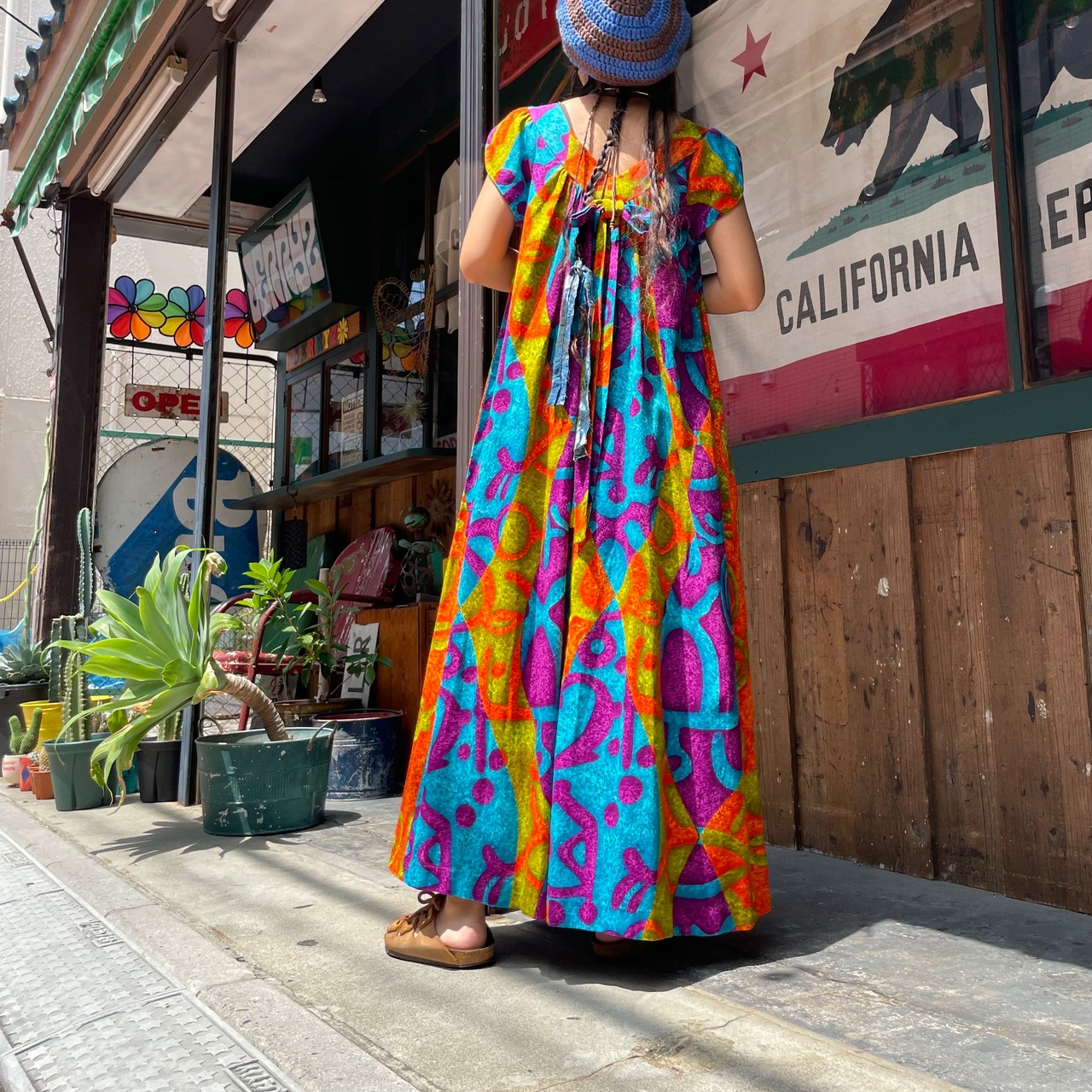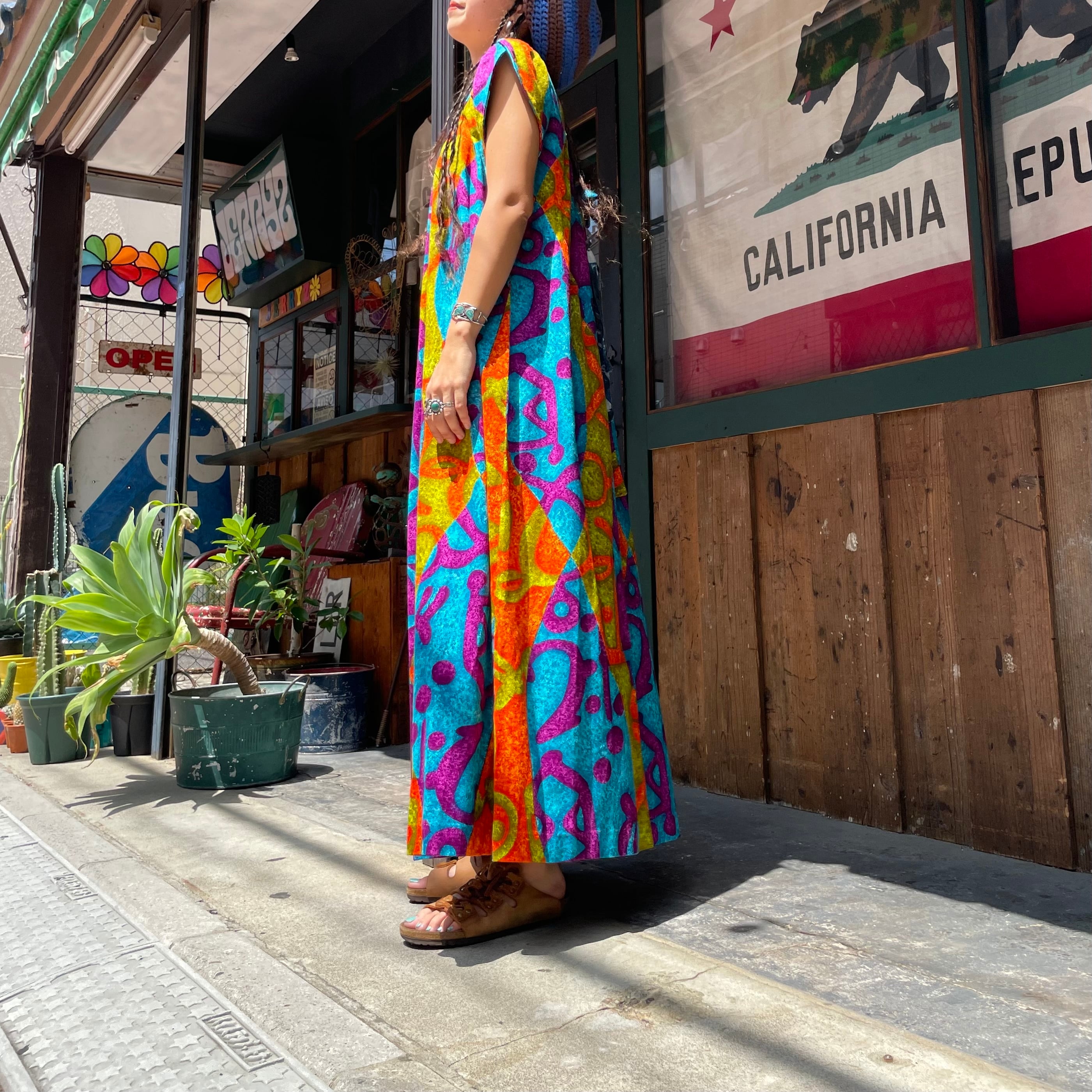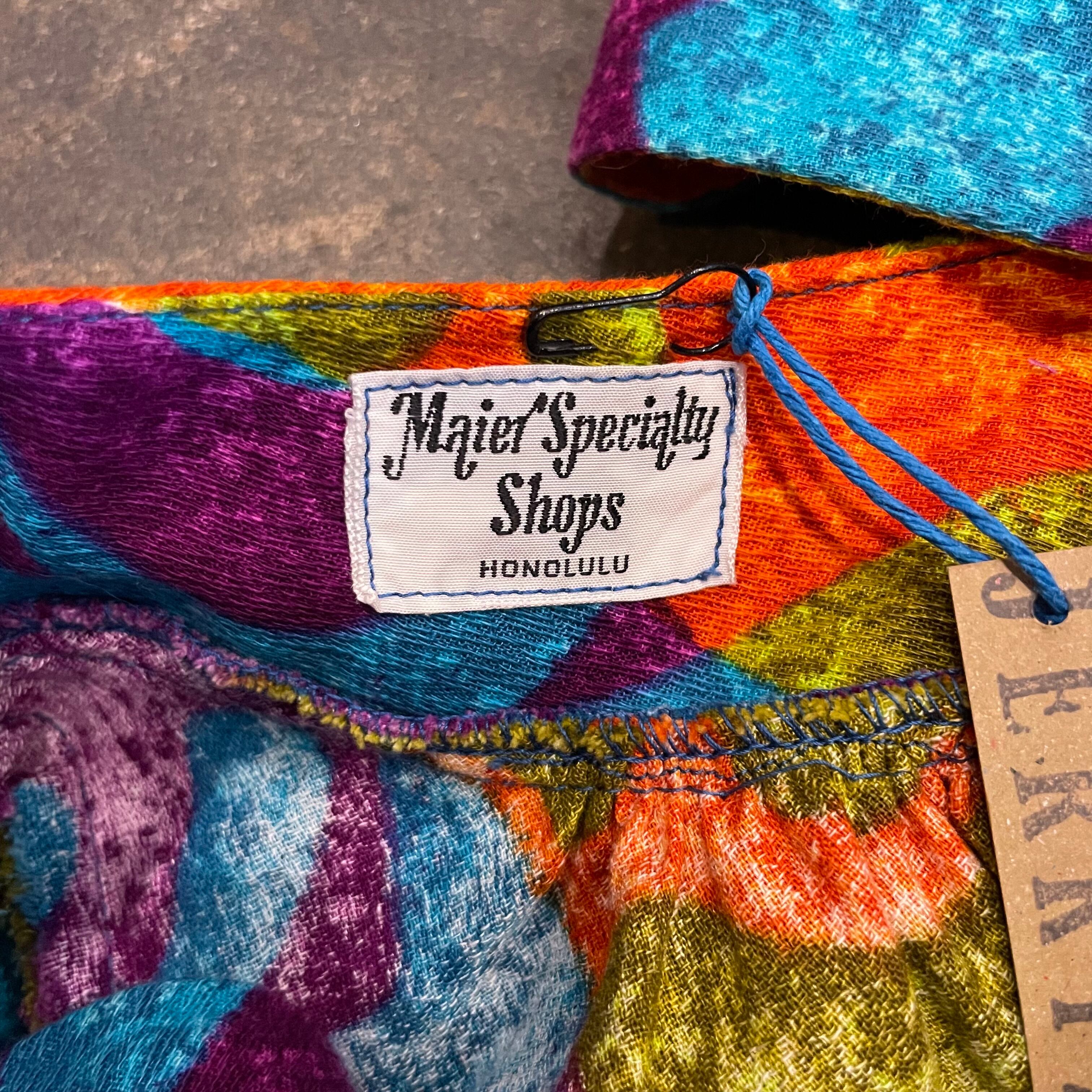 サイケデリックなカラーリングとハワイアンな模様がかっこいい70年代頃のワンピースです。