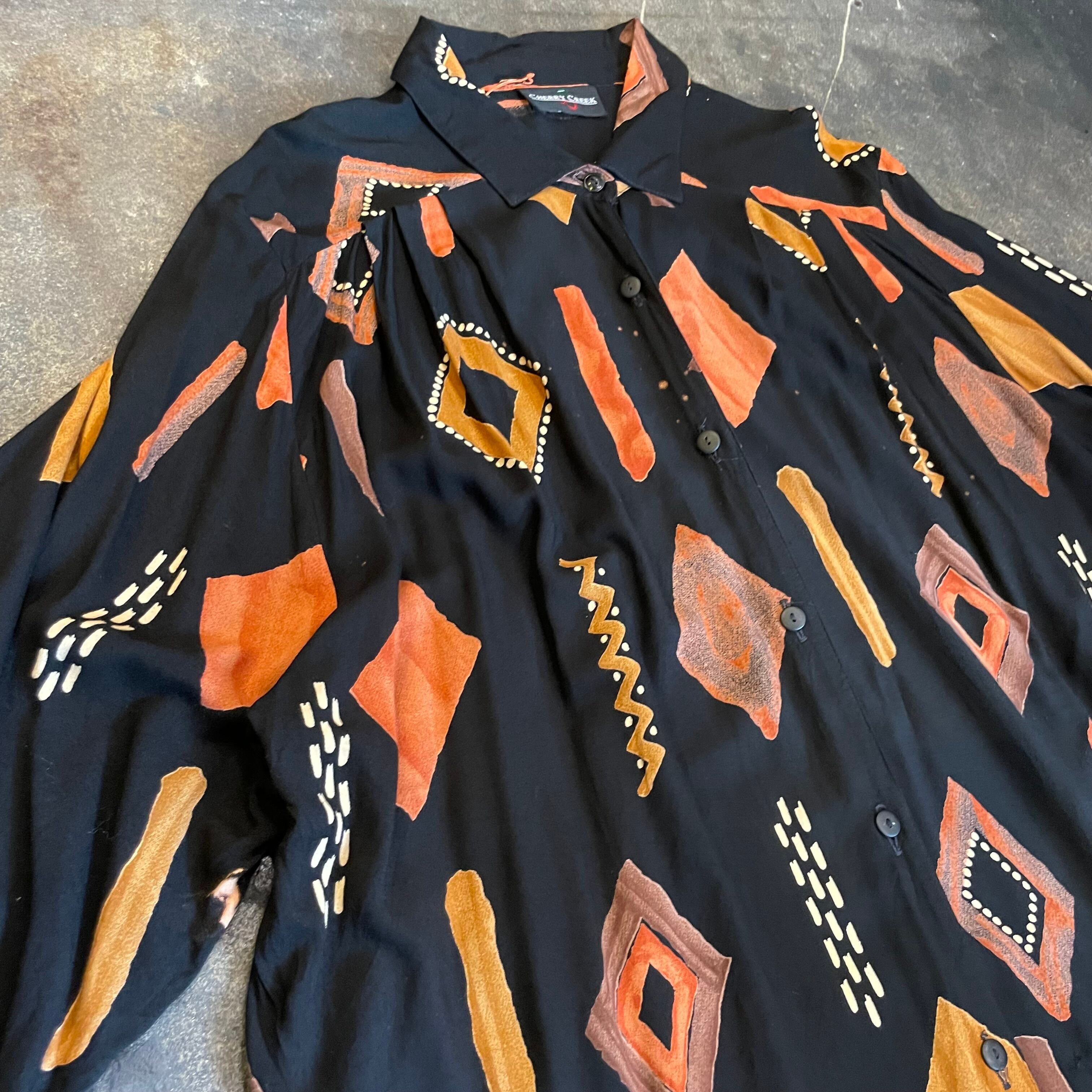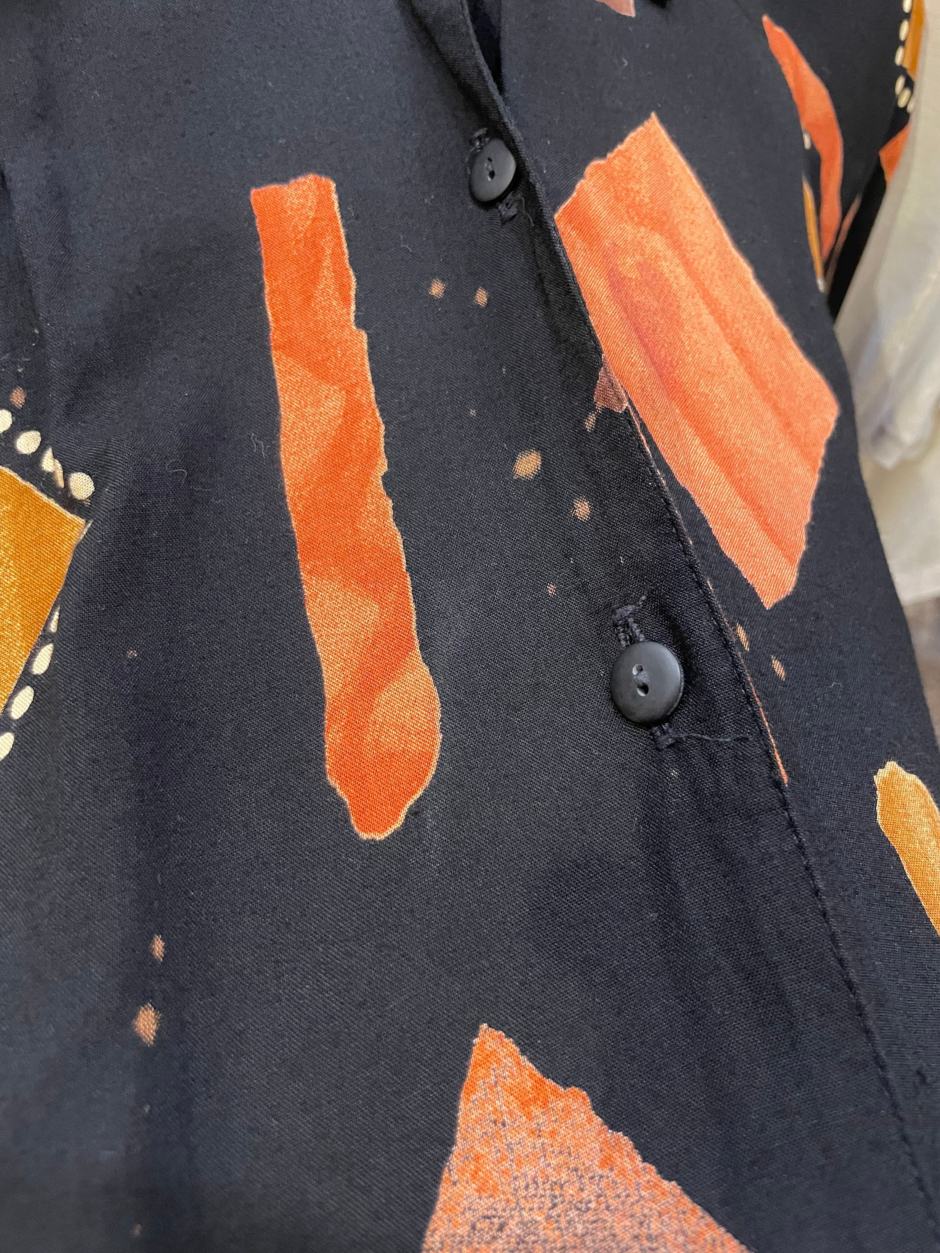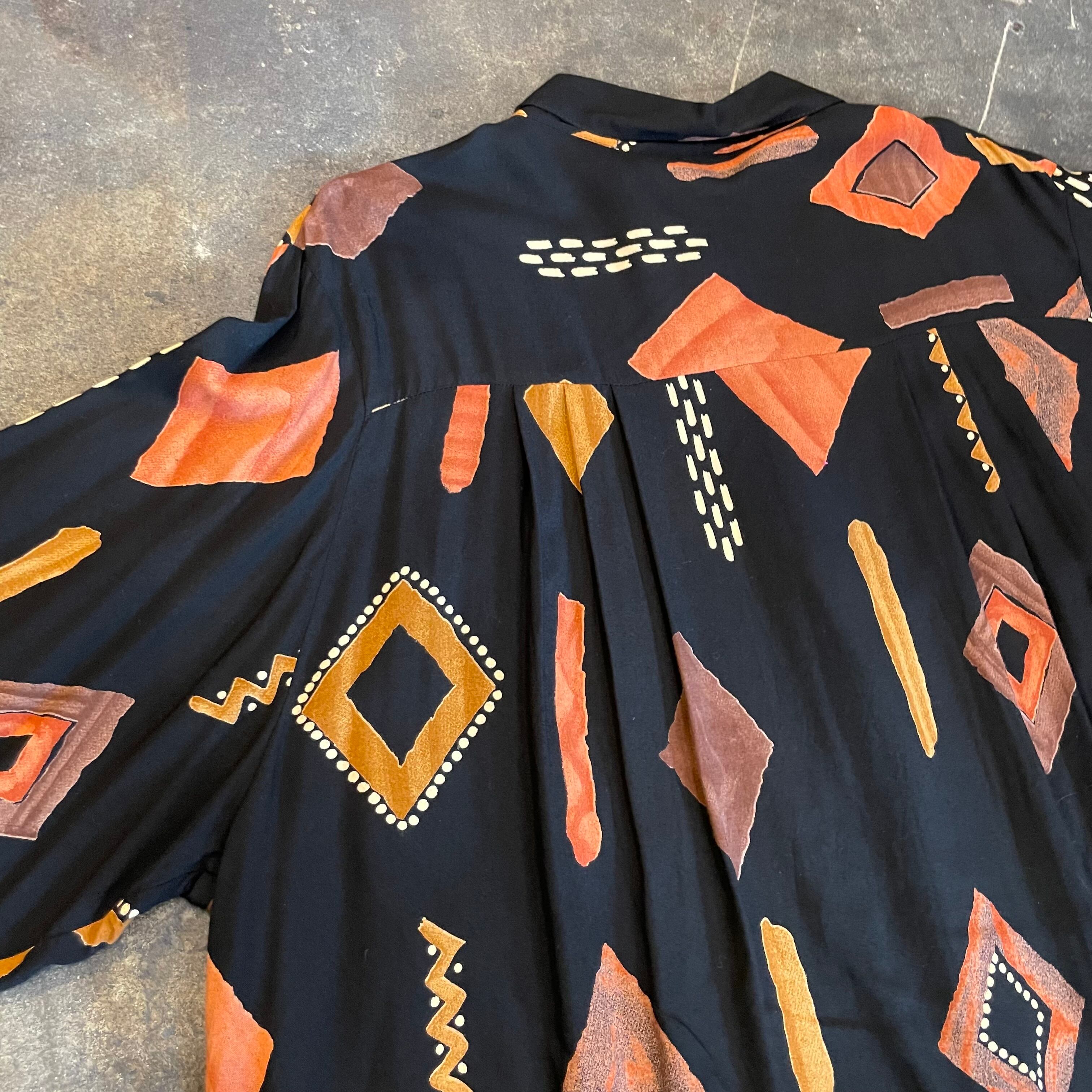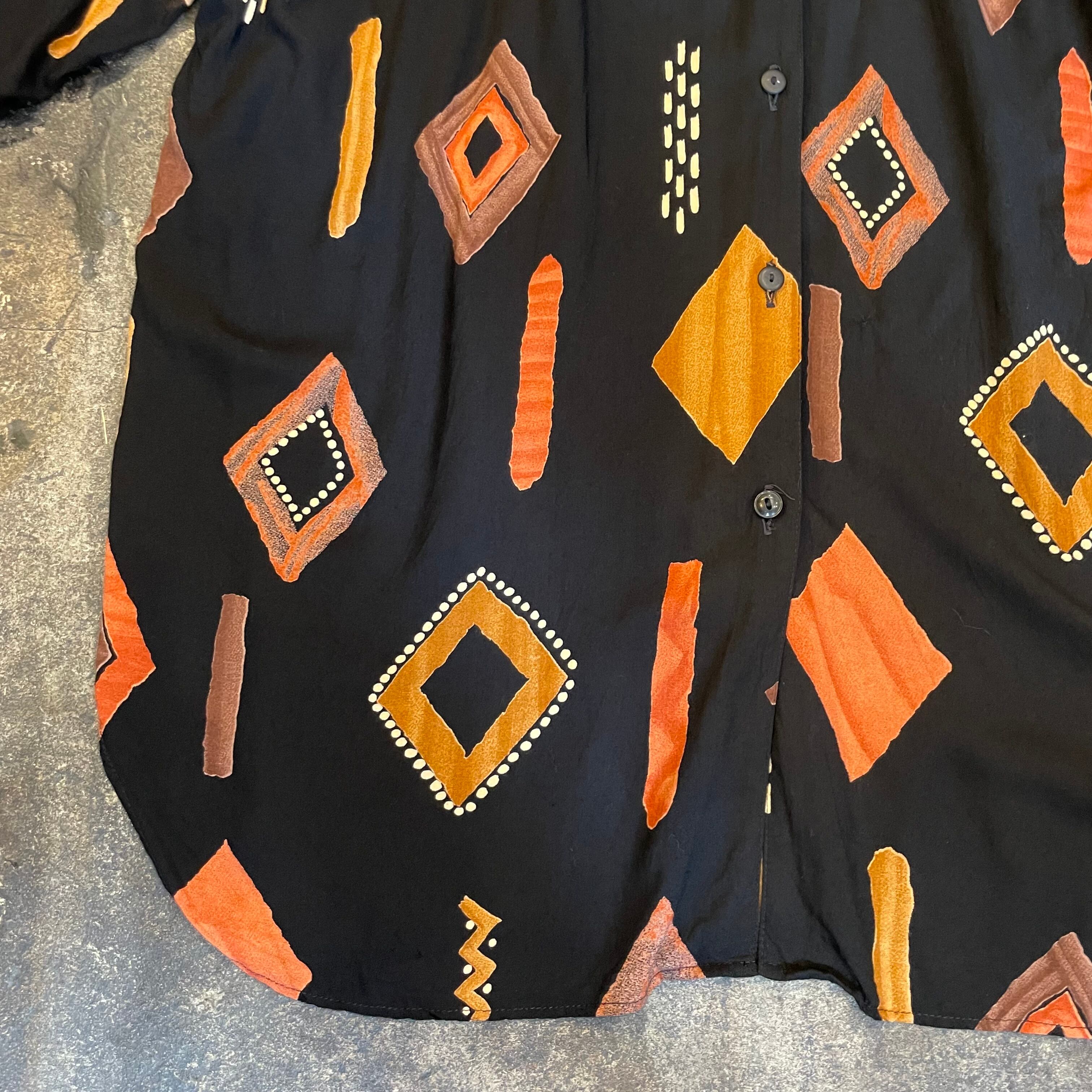 黒地に赤土系の色の模様が素敵なレーヨン素材のシャツです。