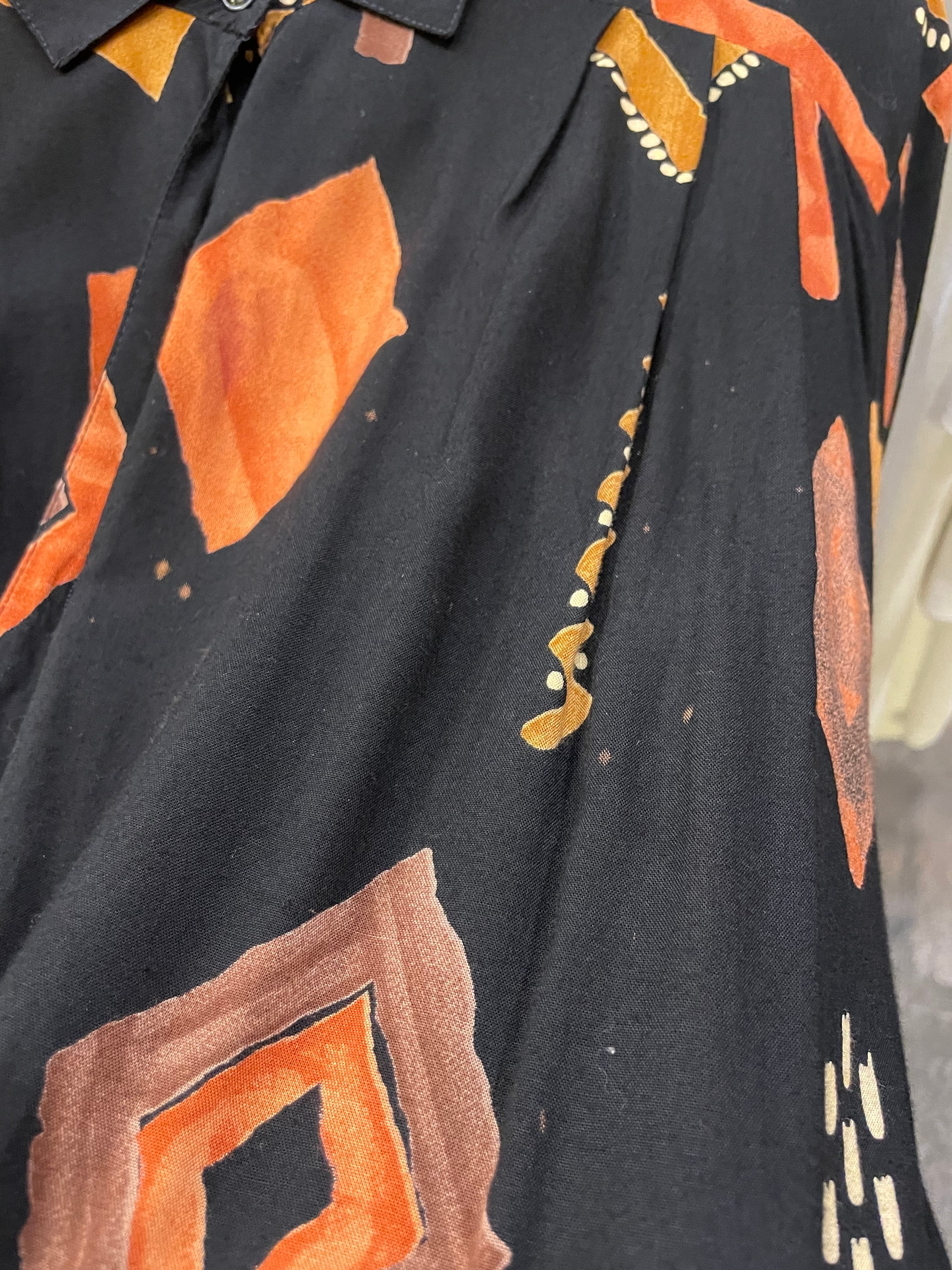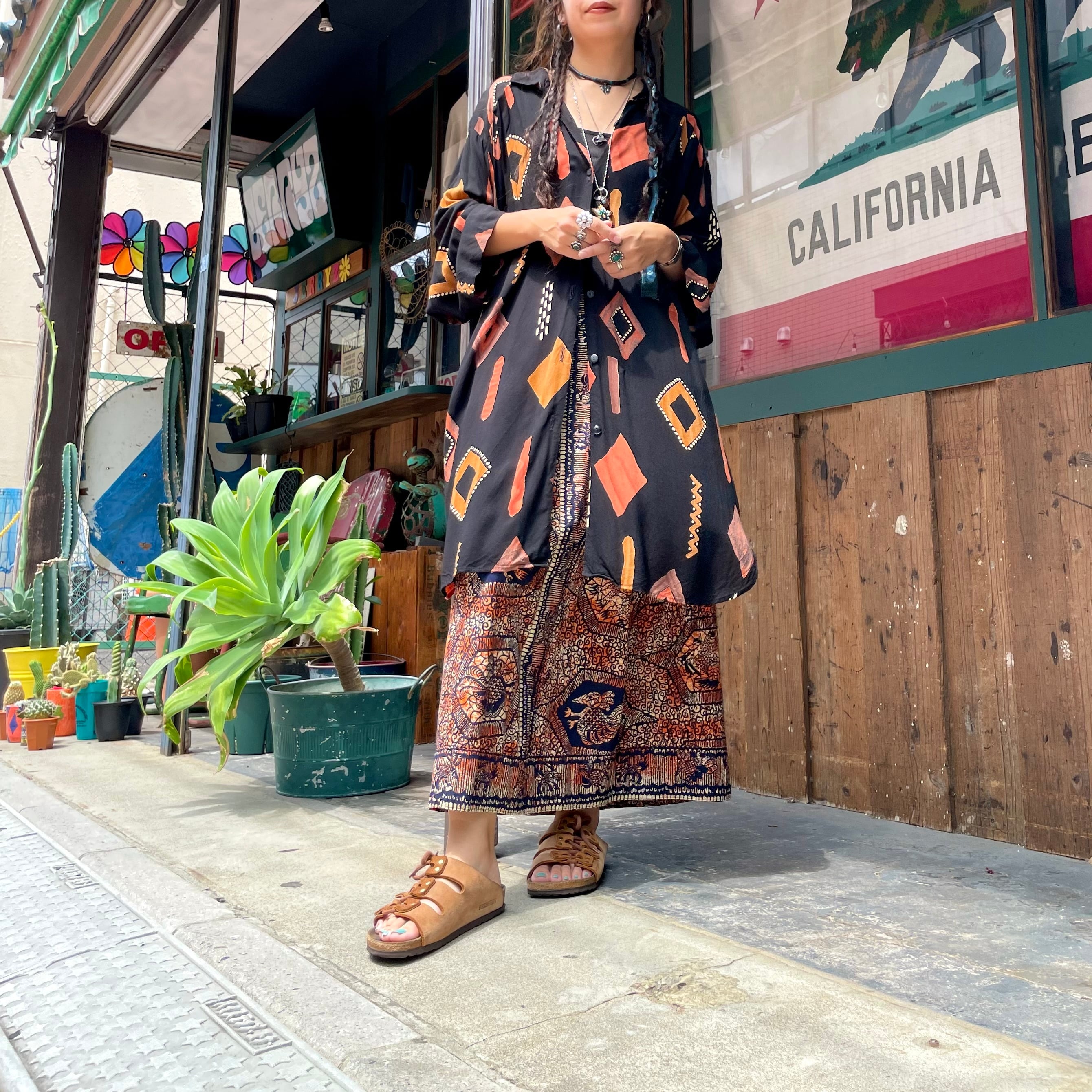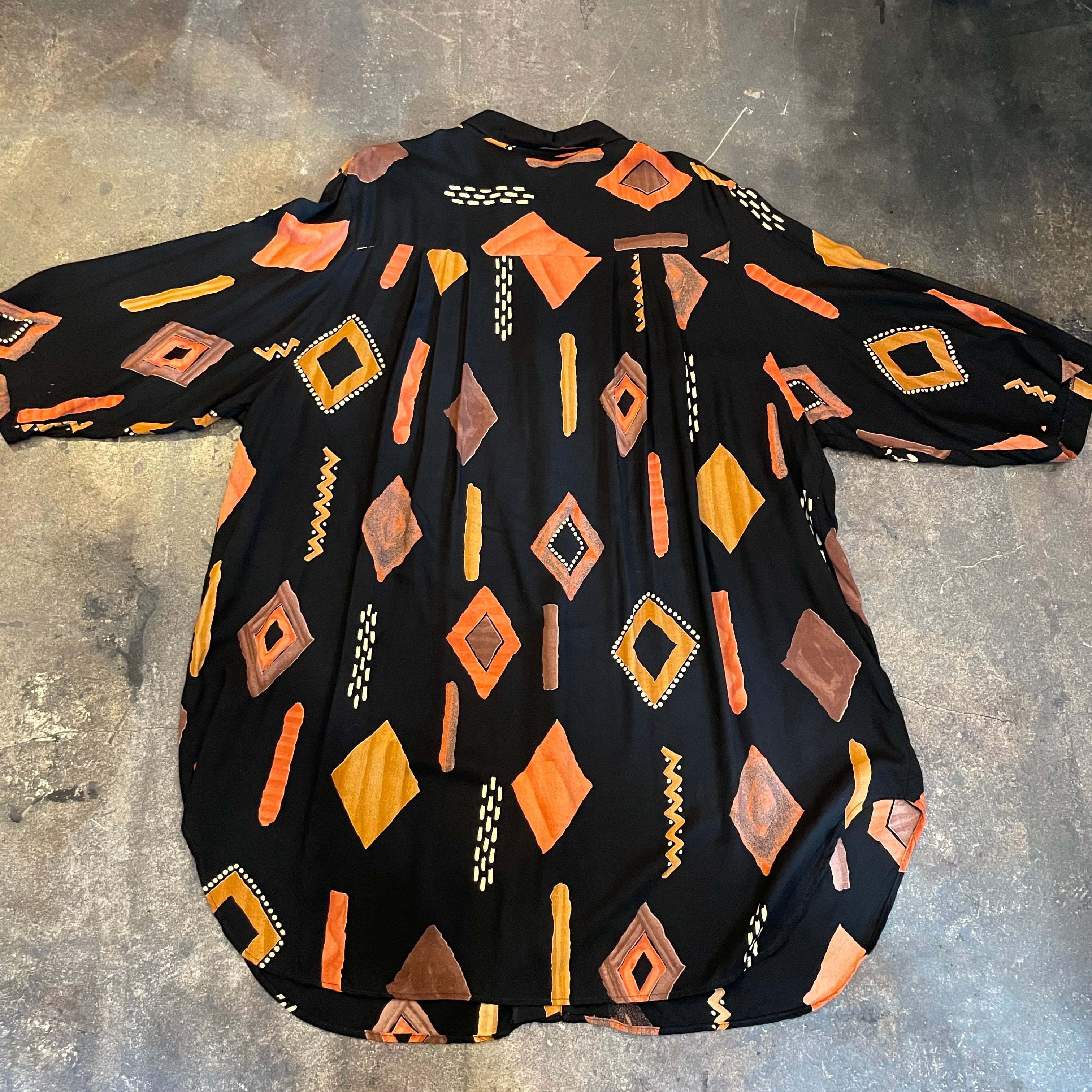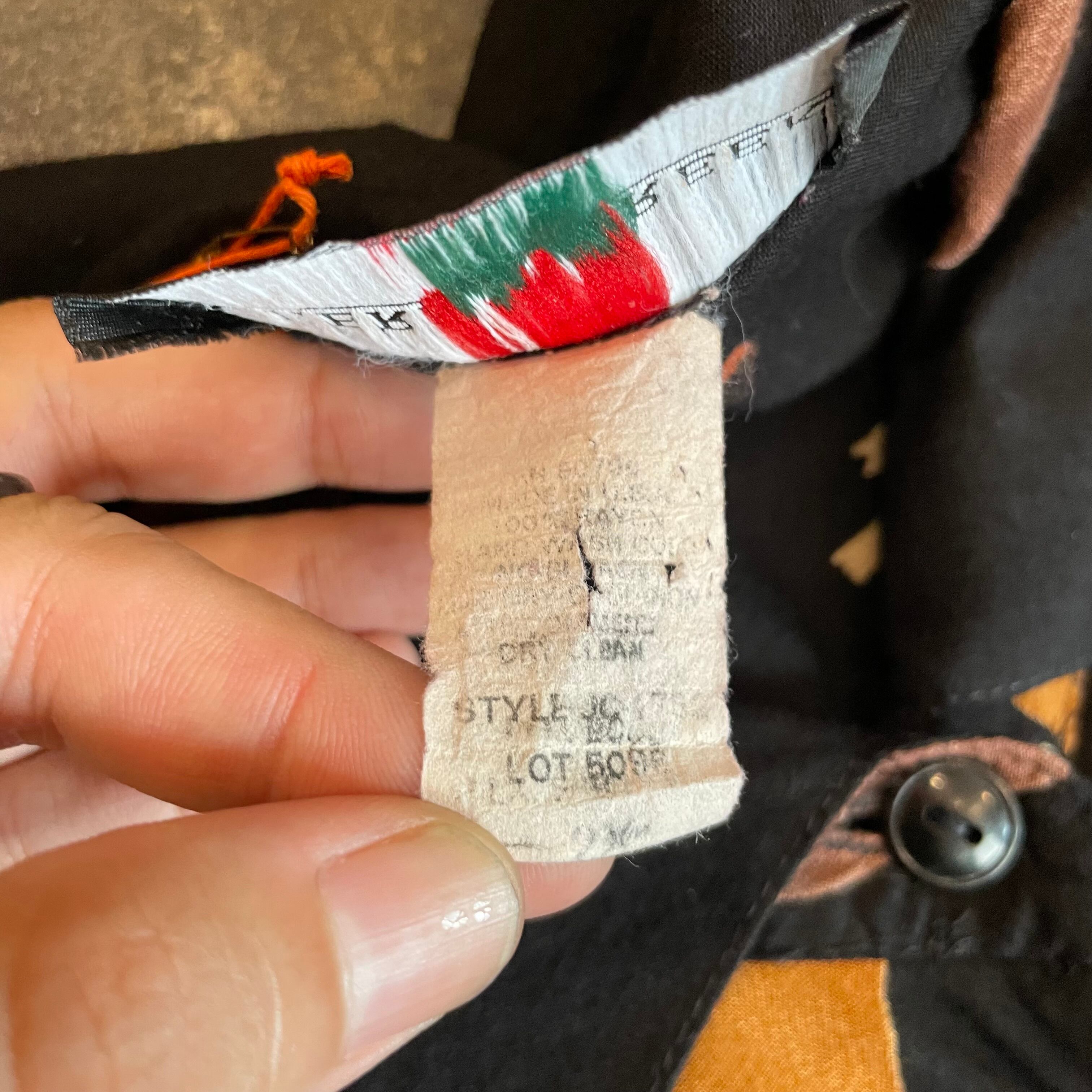 黒地に赤土系の色の模様が素敵なレーヨン素材のシャツです。