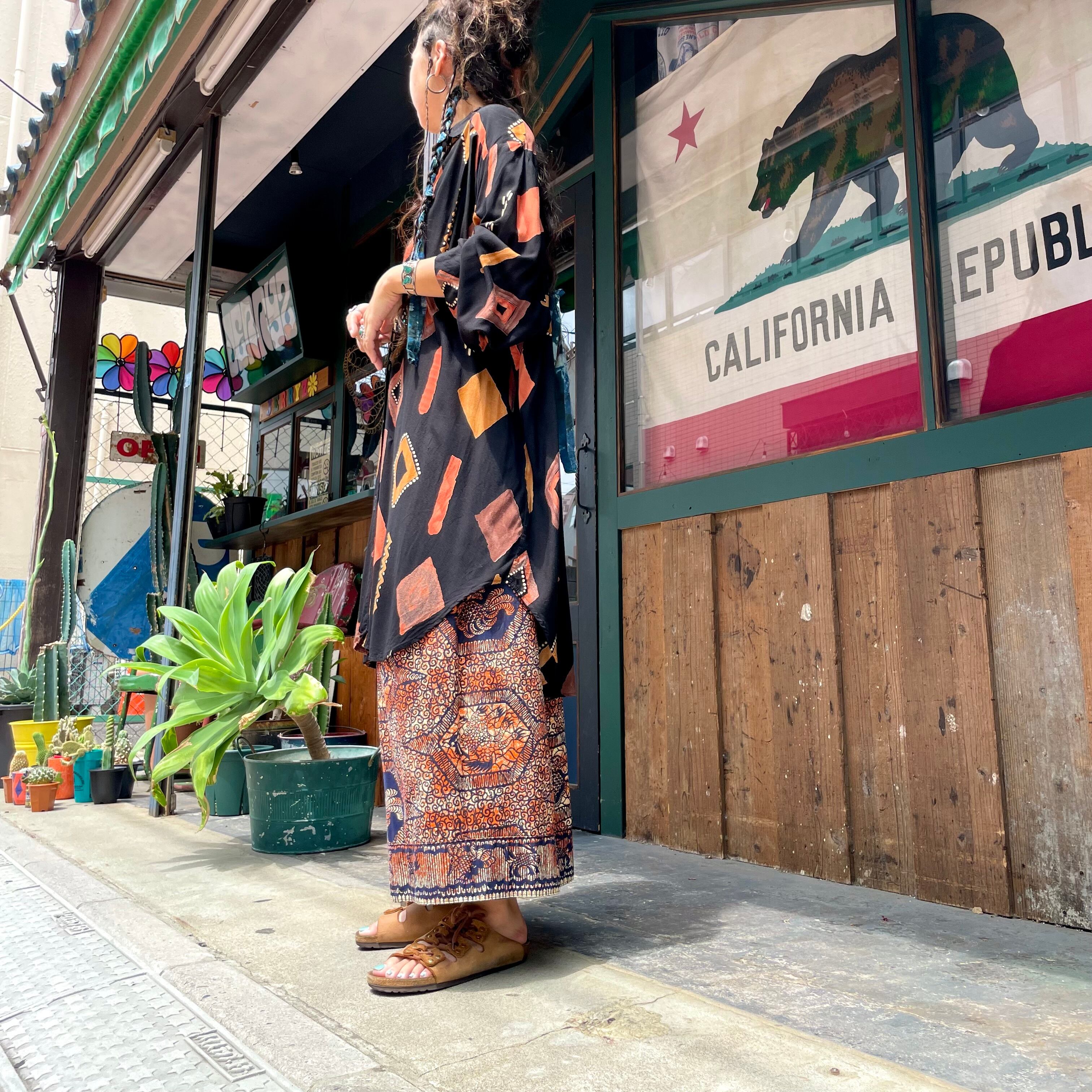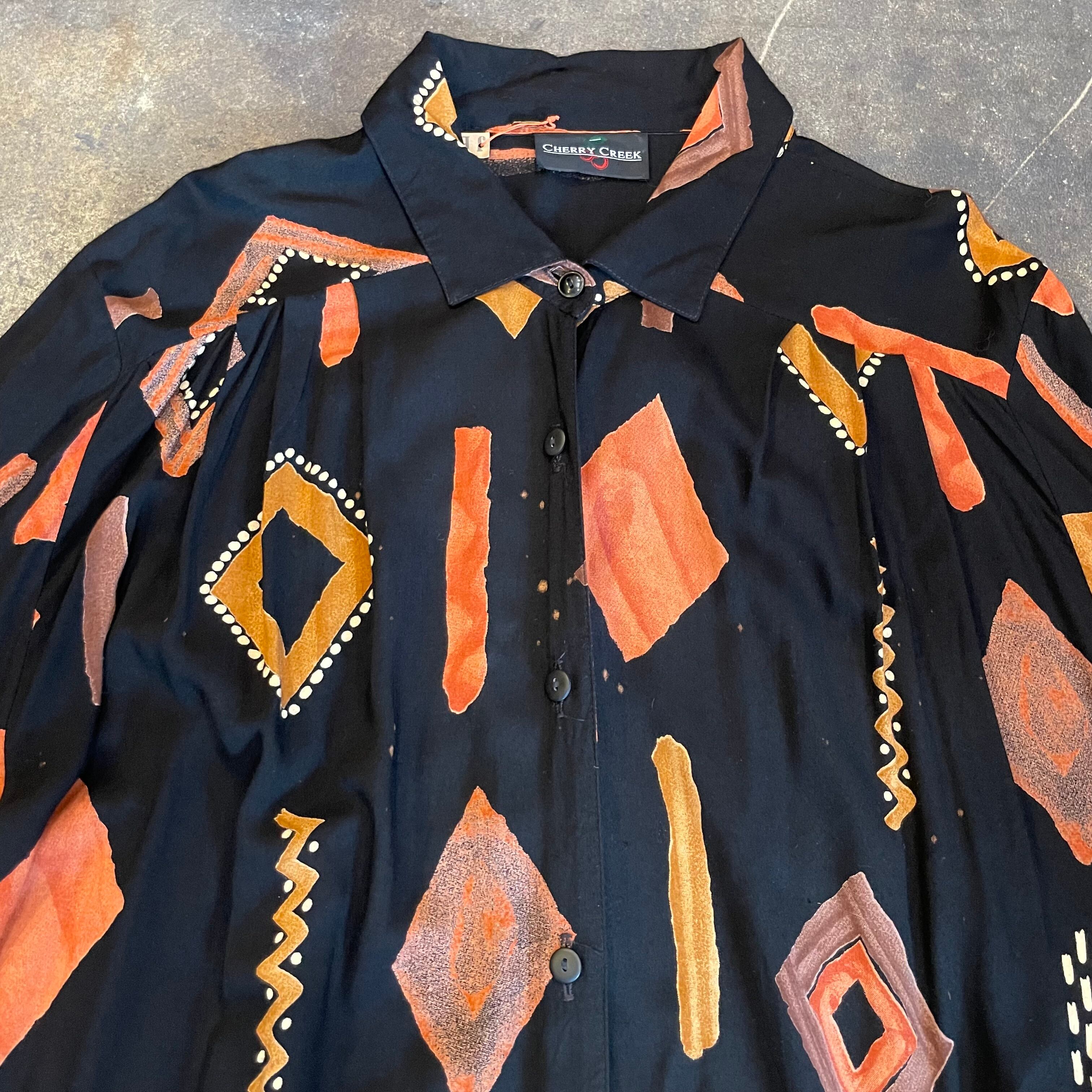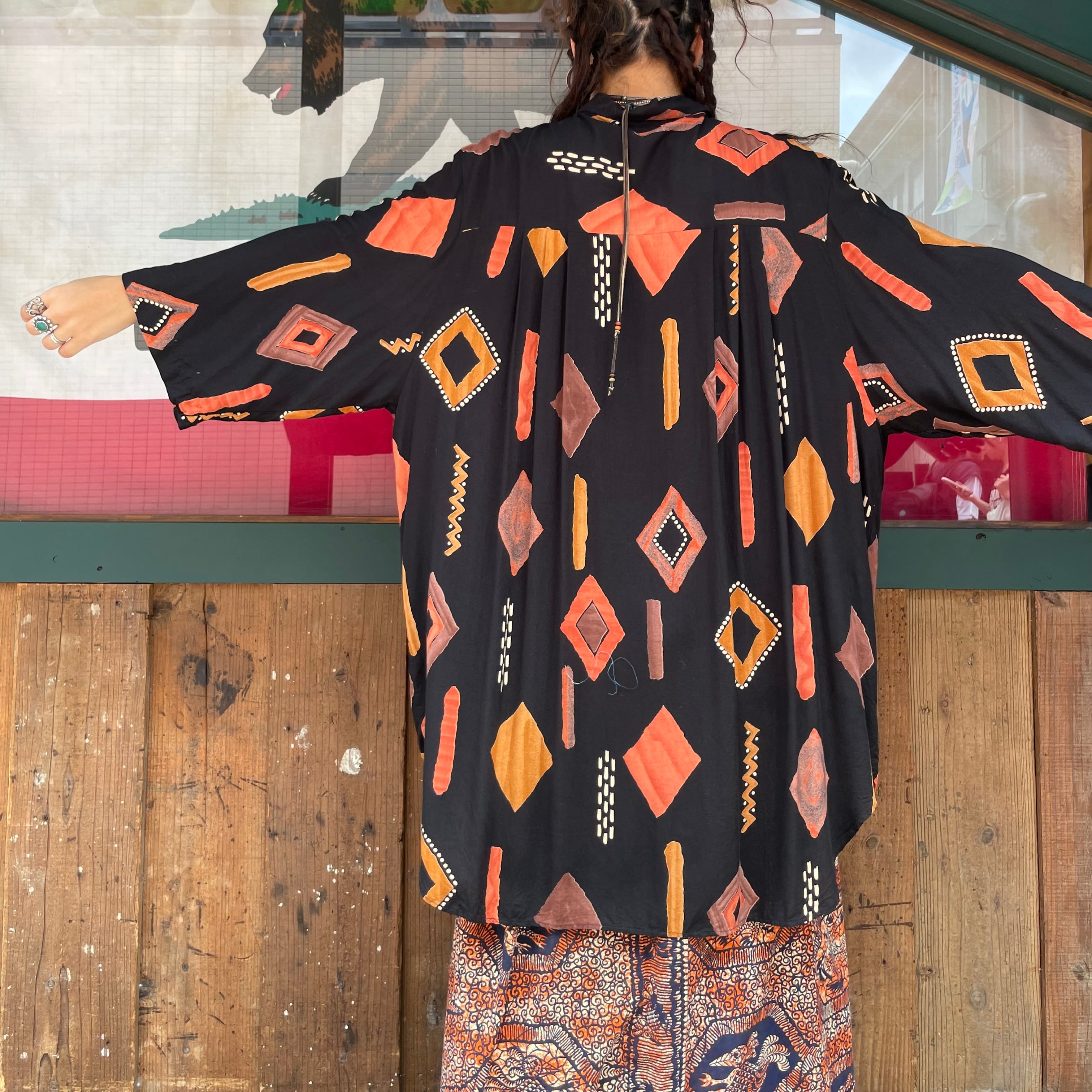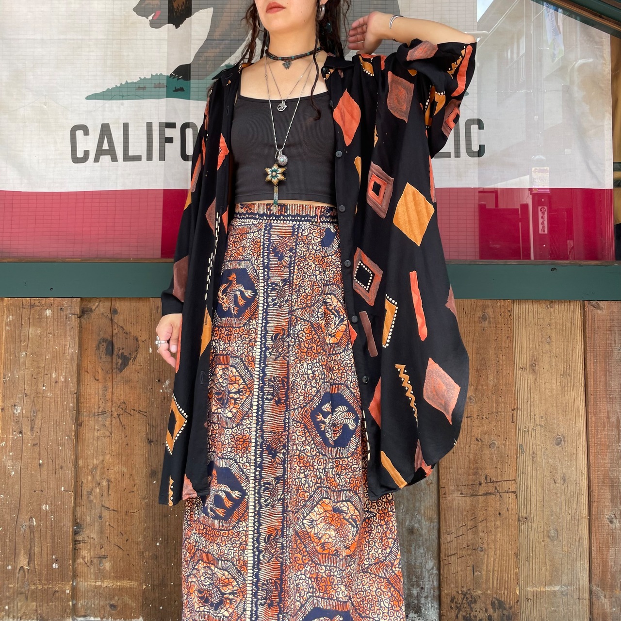 黒地に赤土系の色の模様が素敵なレーヨン素材のシャツです。