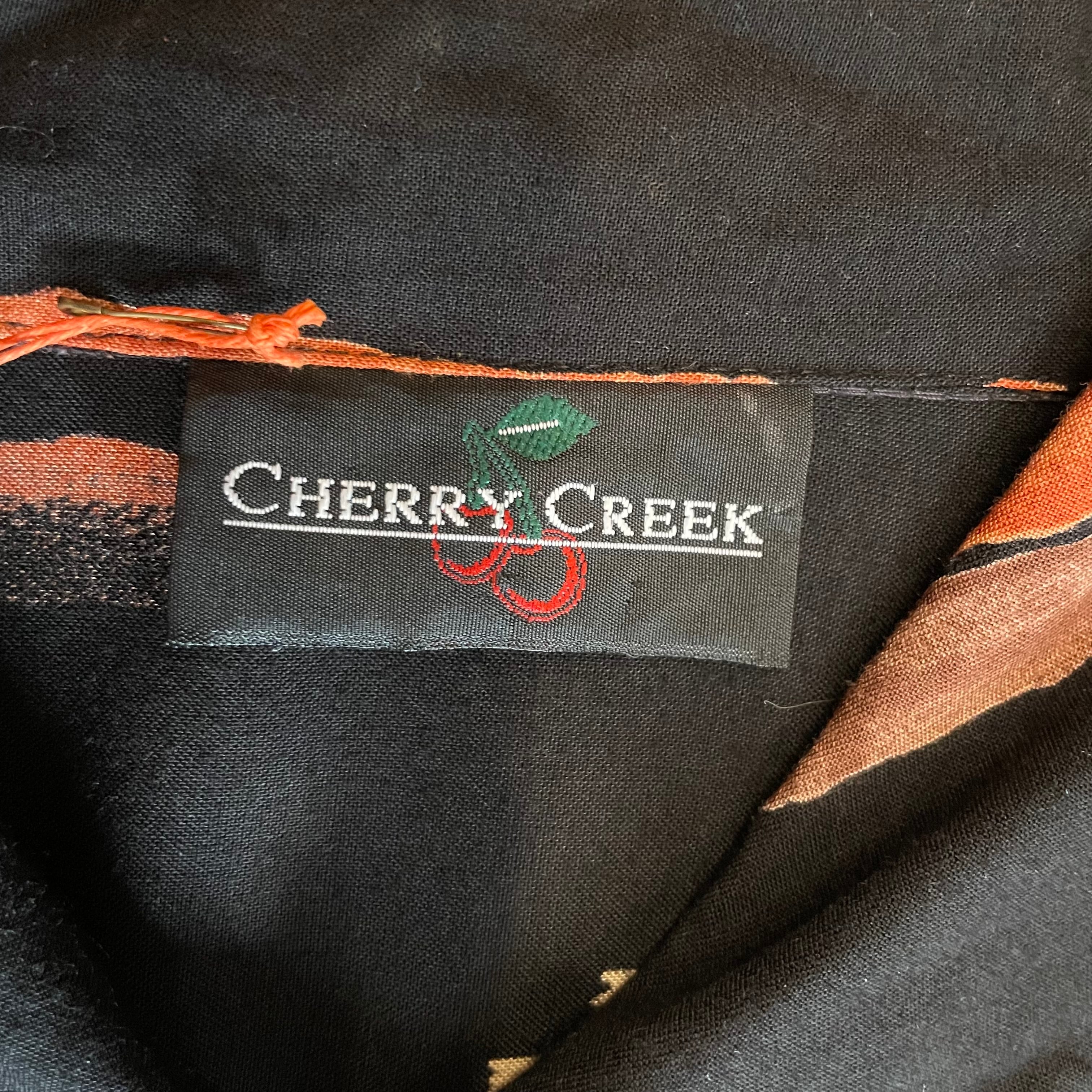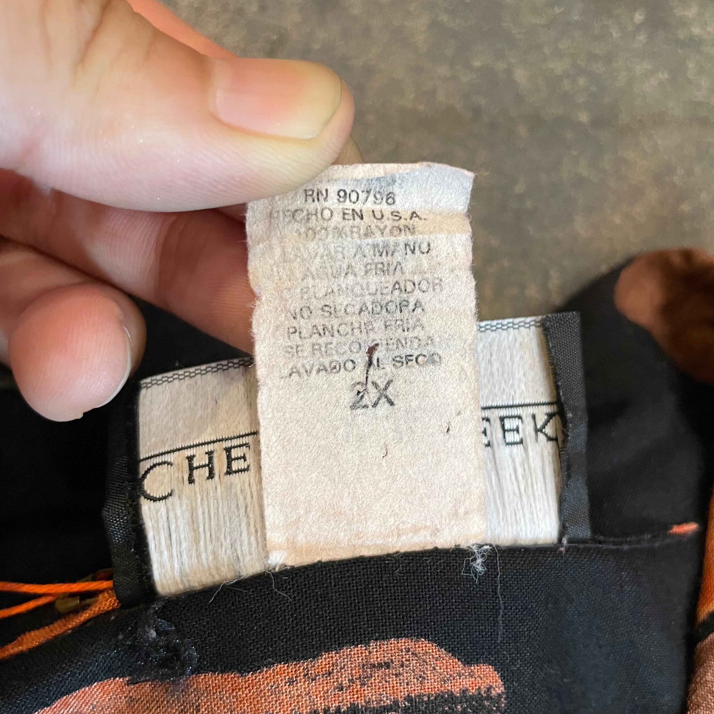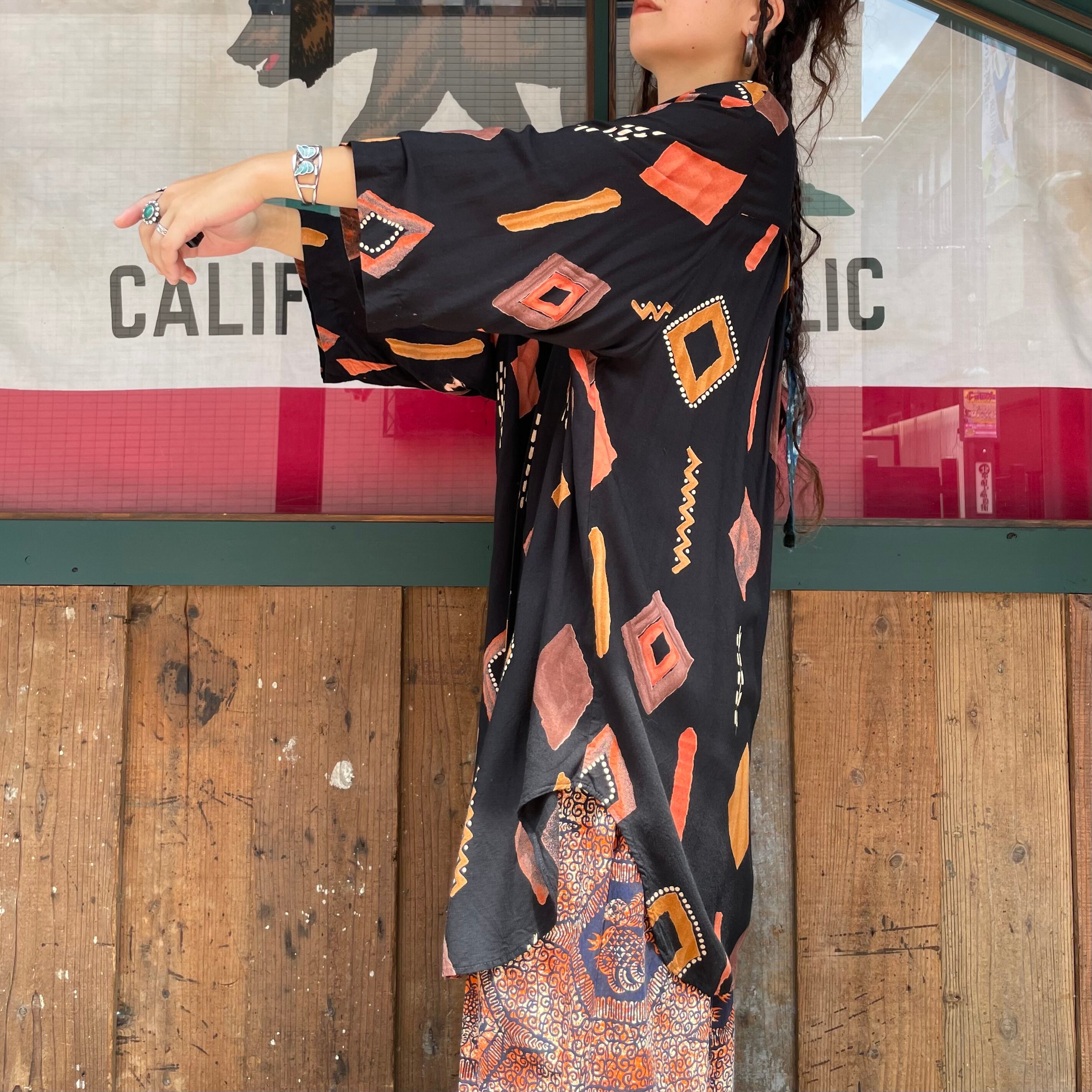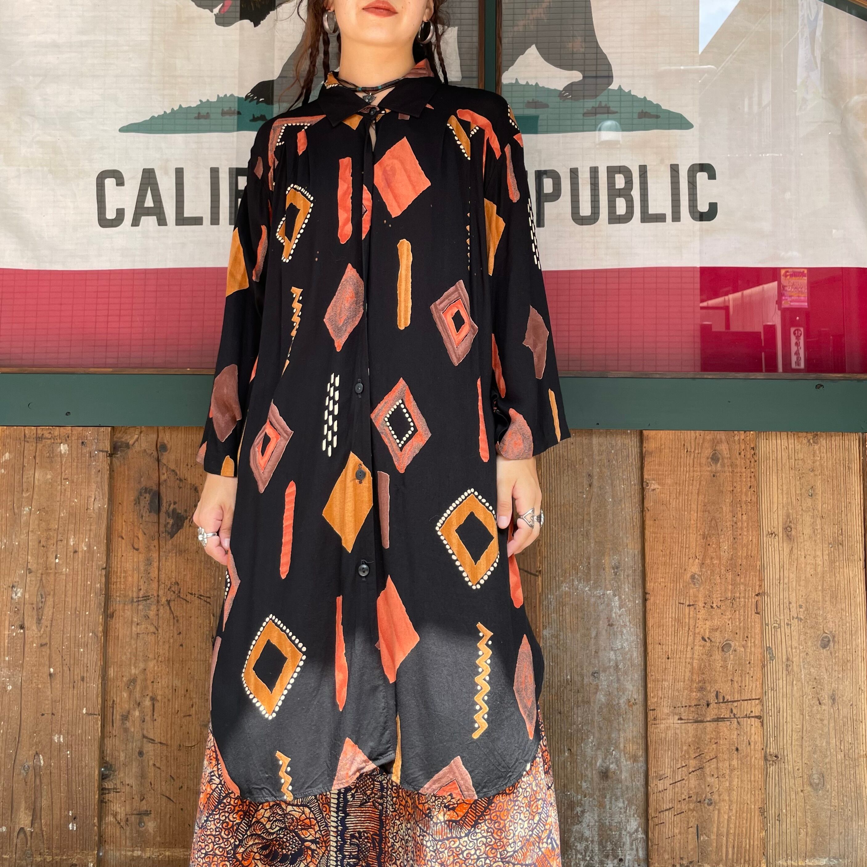黒地に赤土系の色の模様が素敵なレーヨン素材のシャツです。