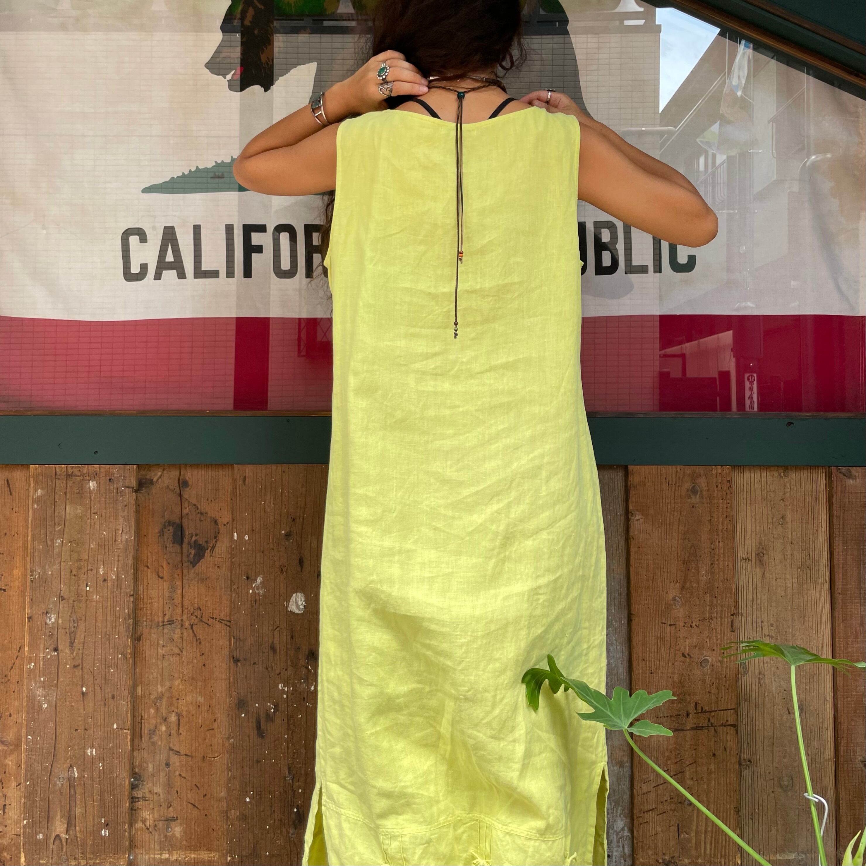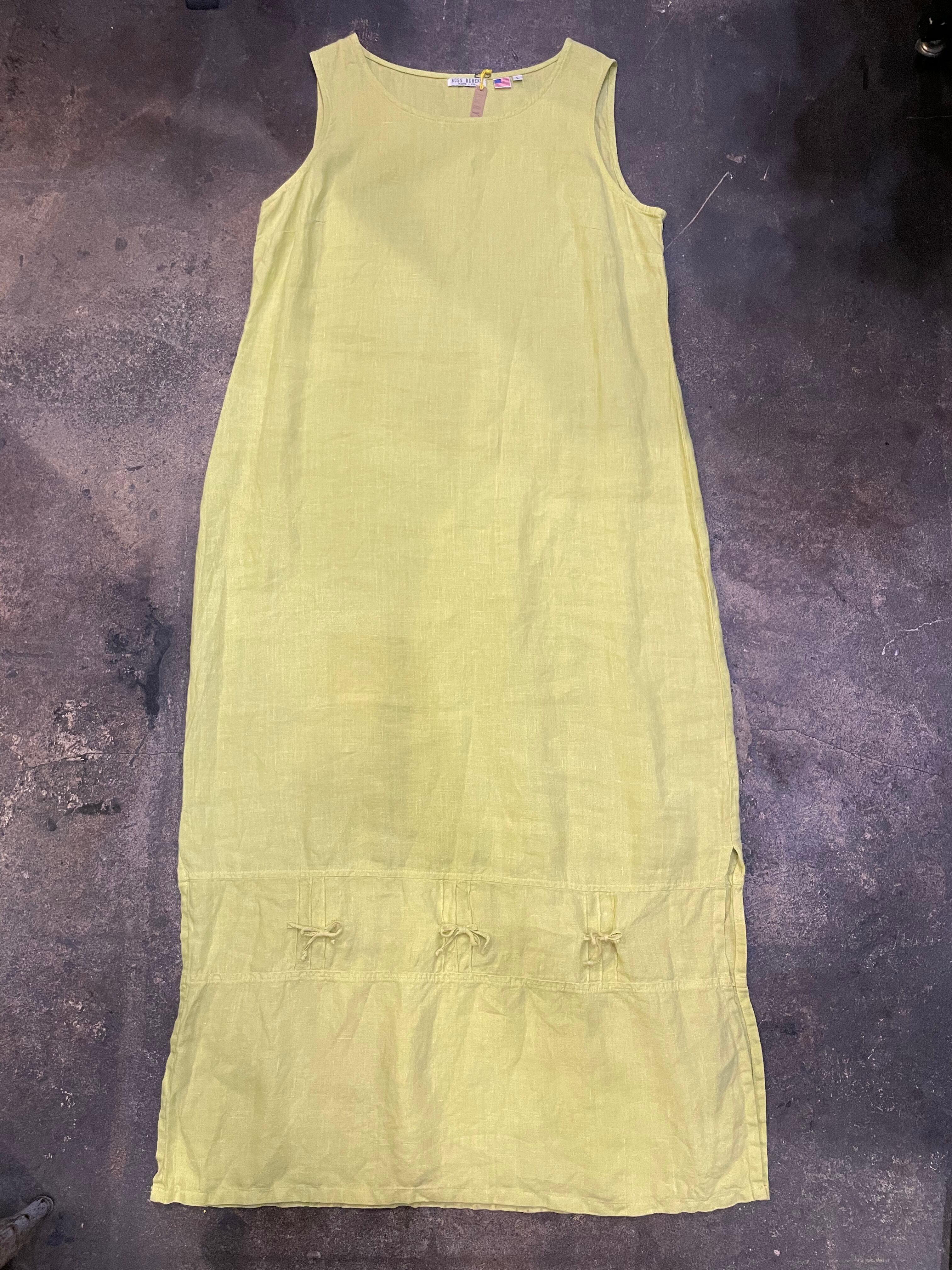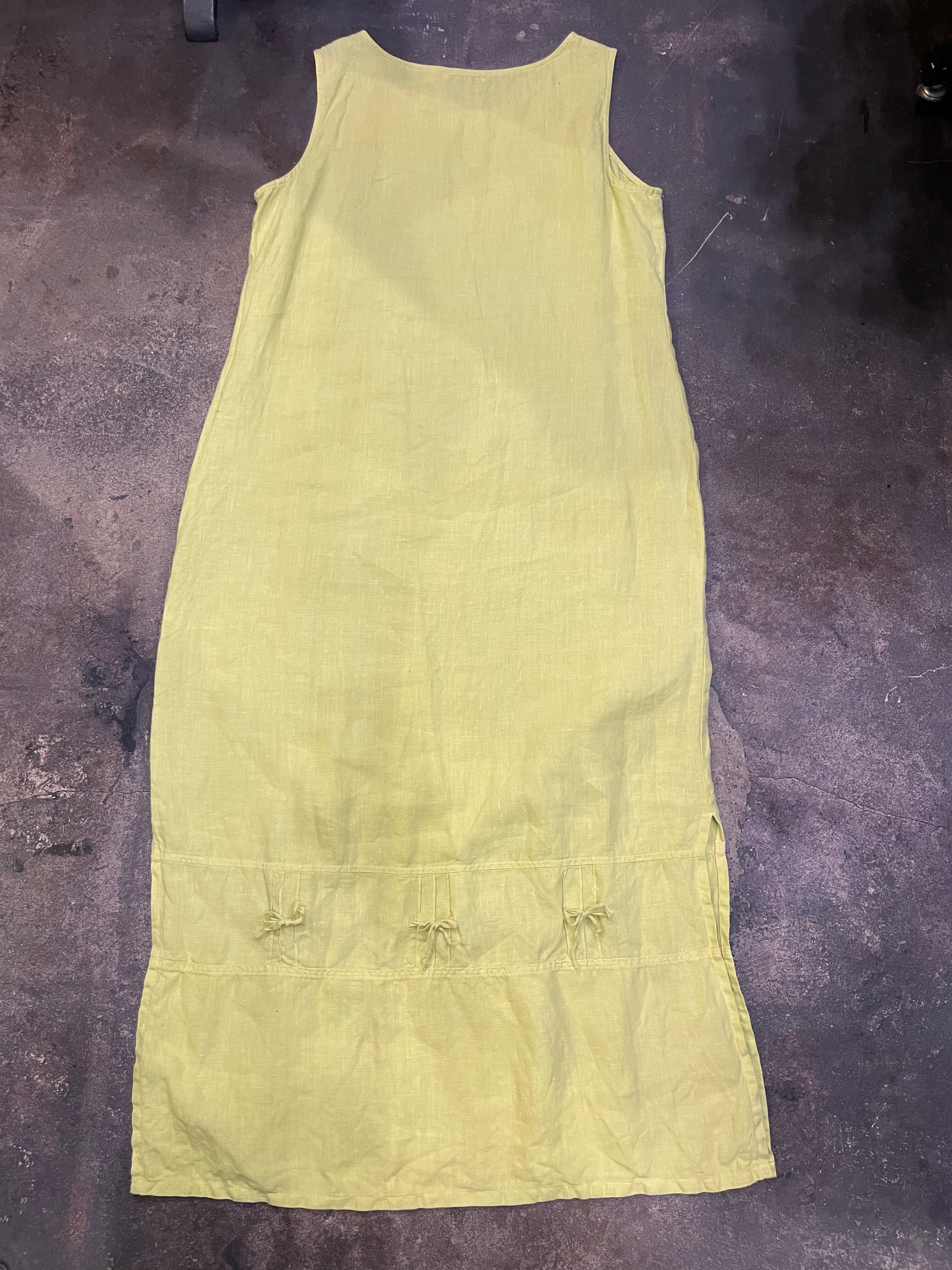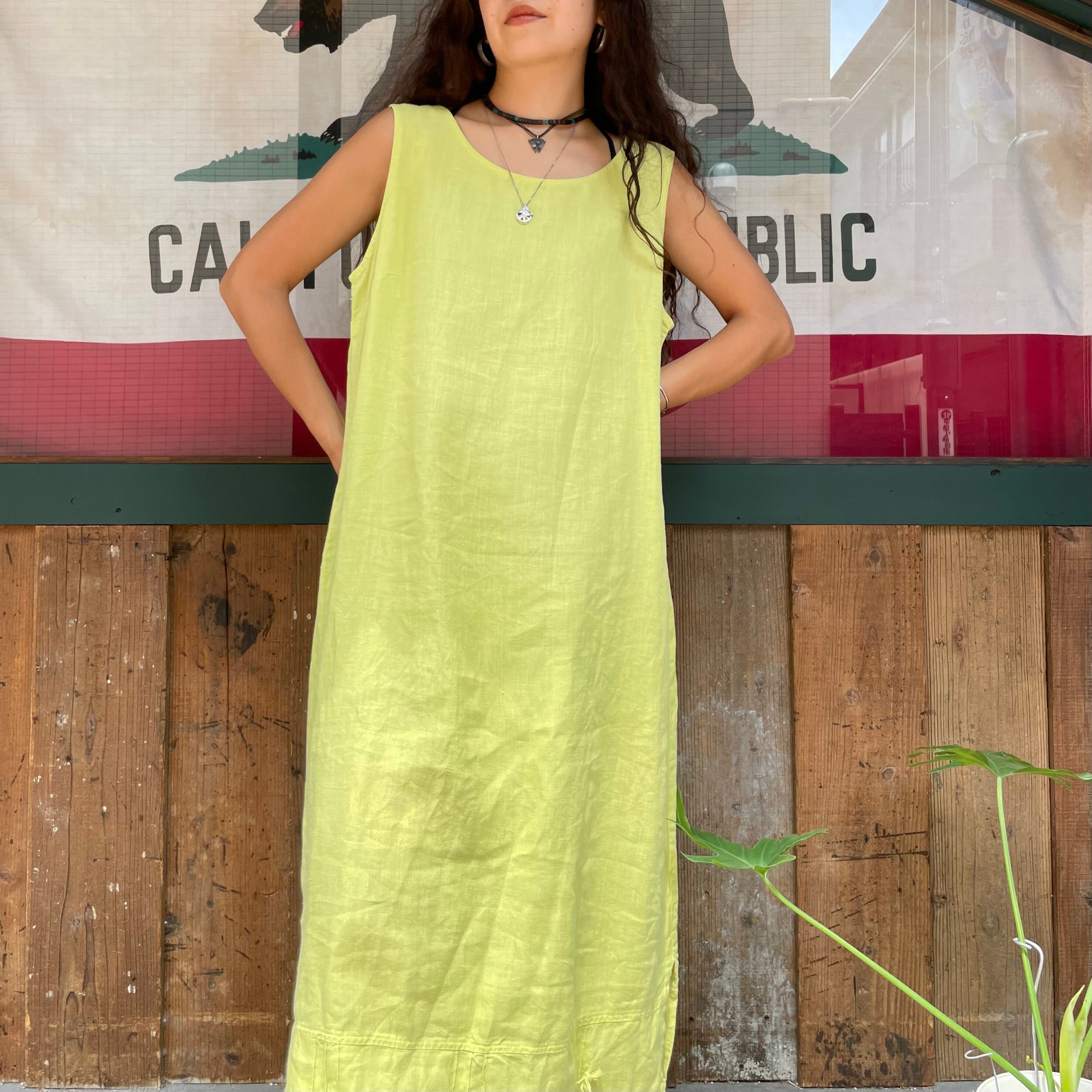 明るいライムグリーンが華やかでかわいいノースリーブのワンピースです。