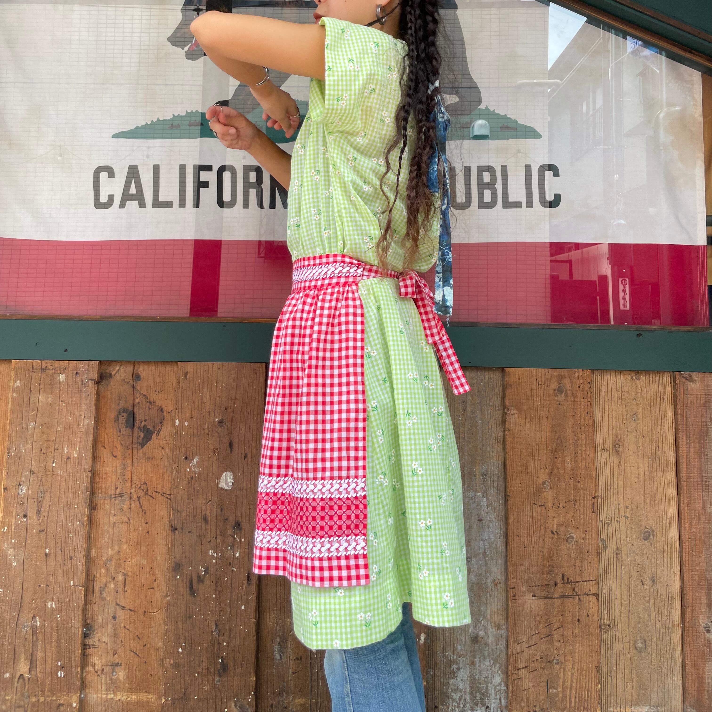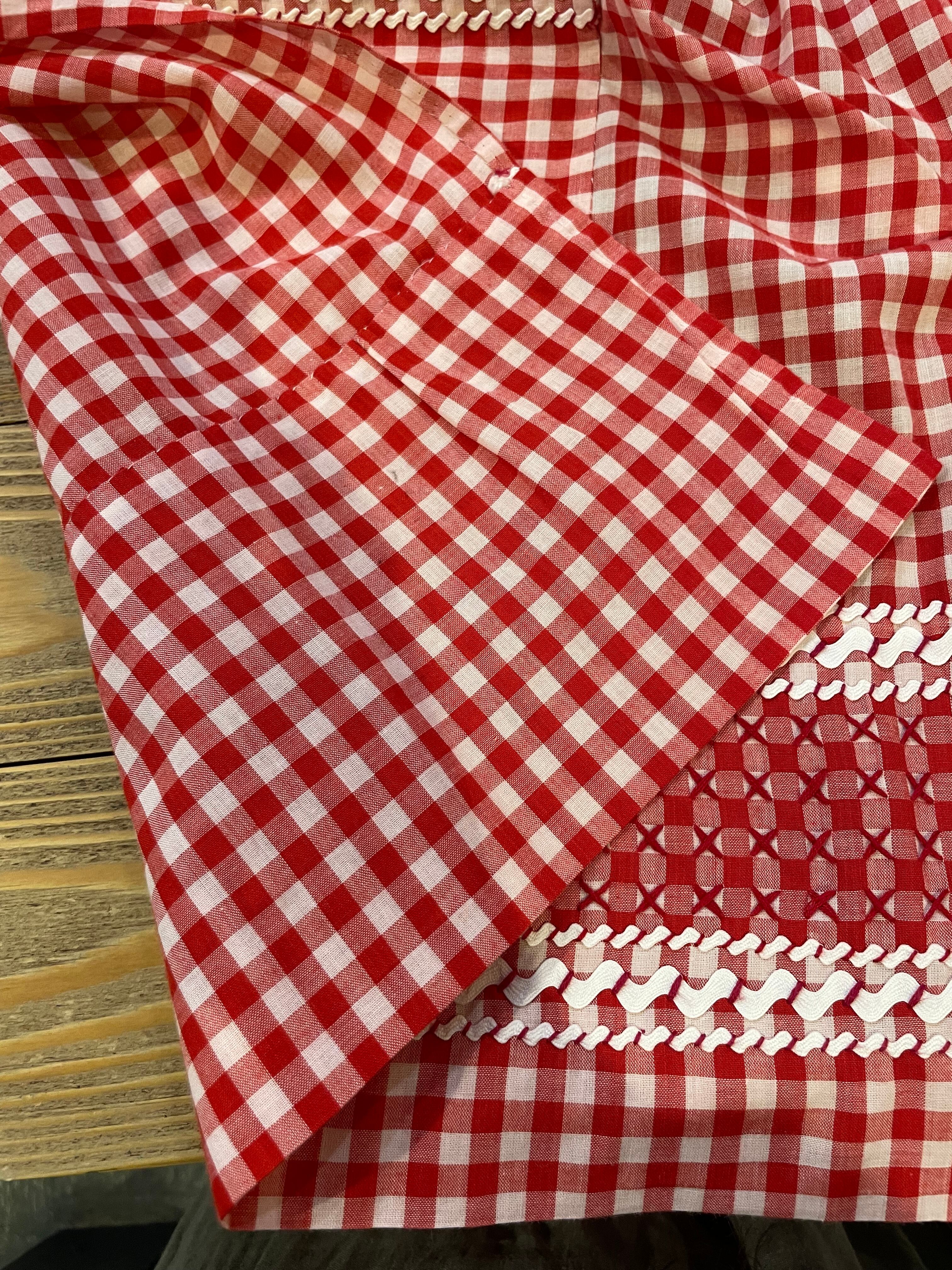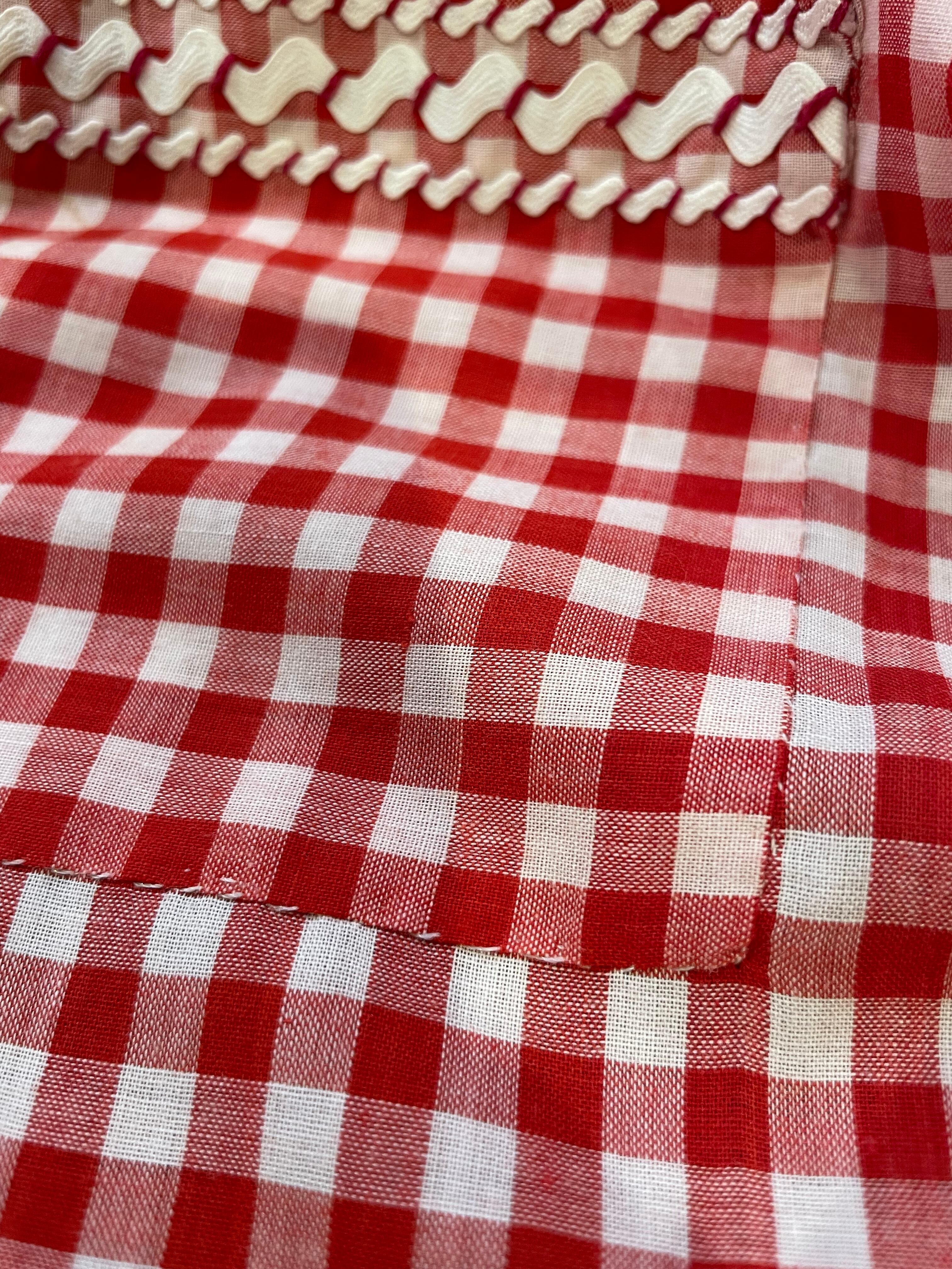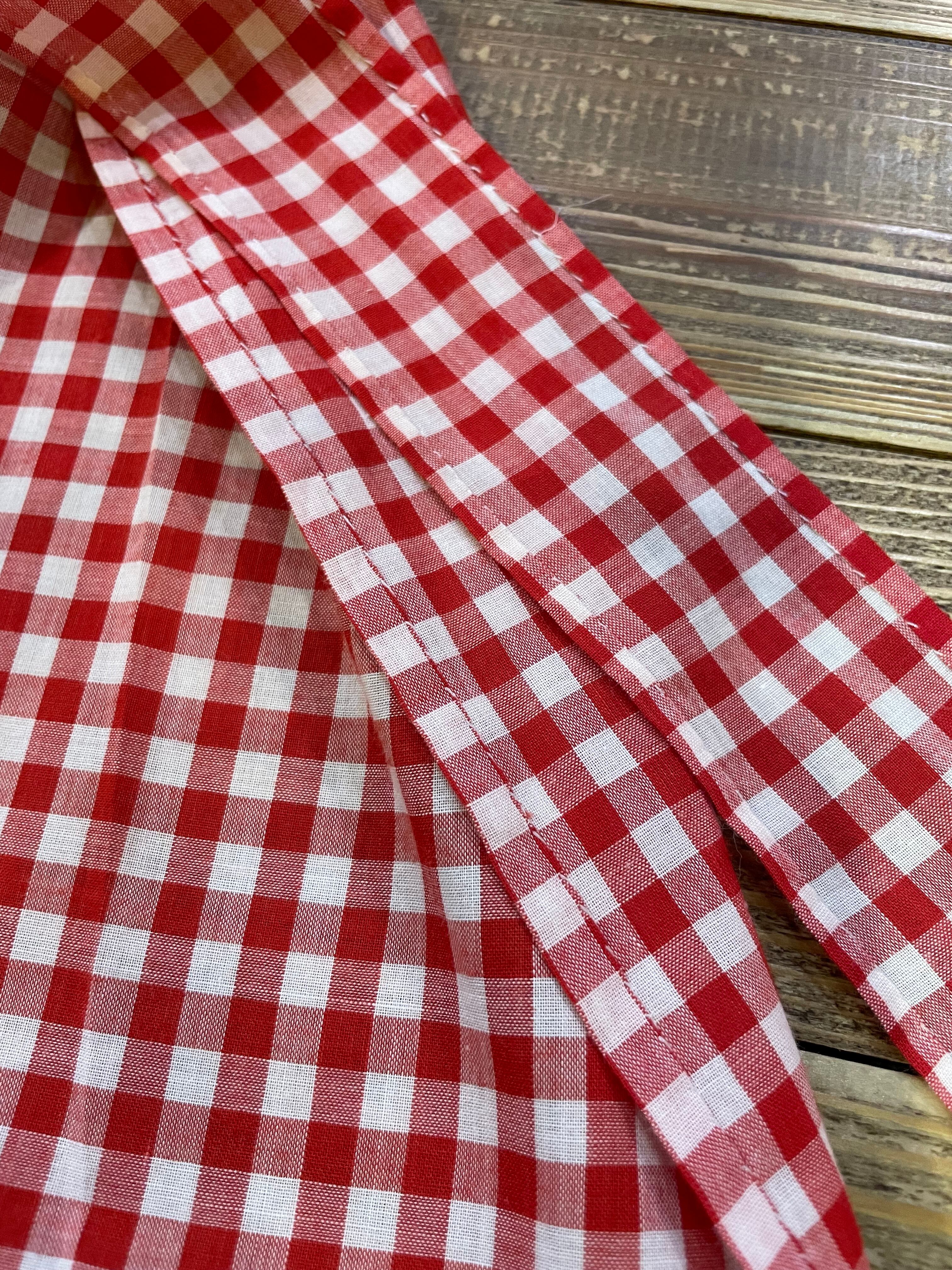 ギンガムチェックの柄に合わせてハンドクロスステッチが施されていたり、山道テープを手縫いで固定していたり、とても手が混んでいてかわいい一枚です。