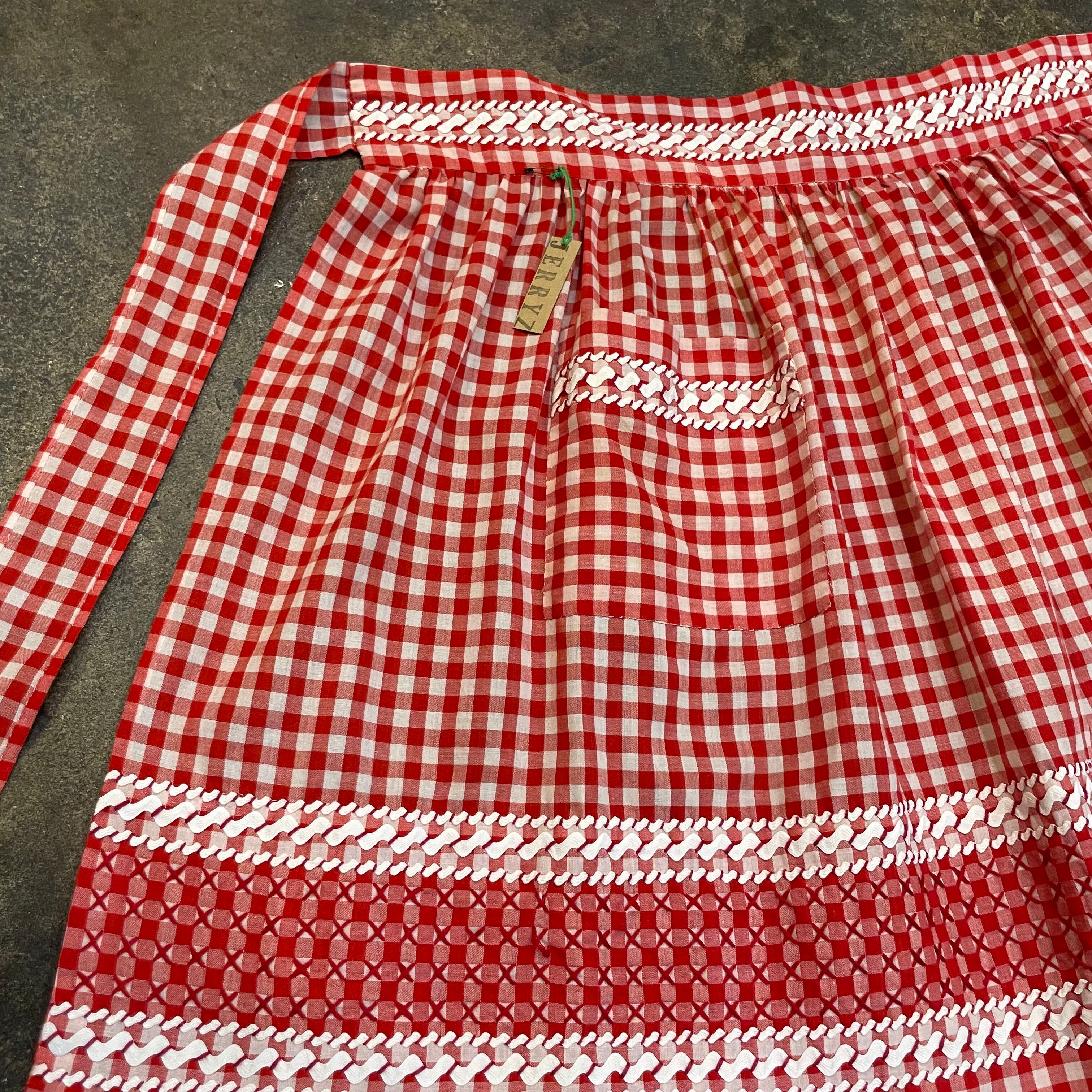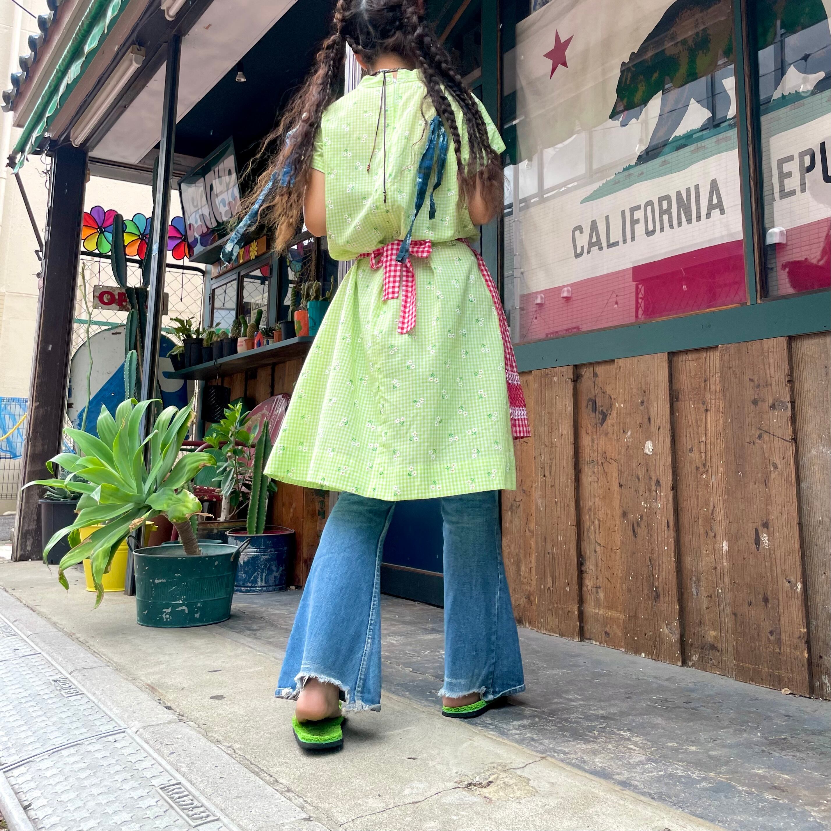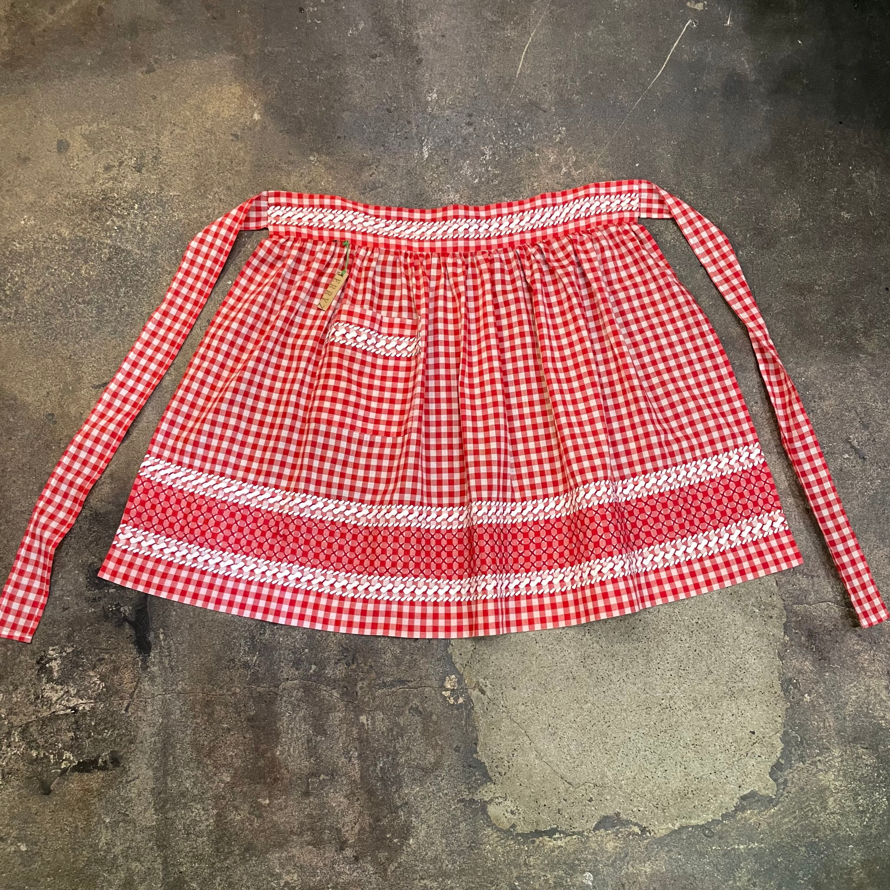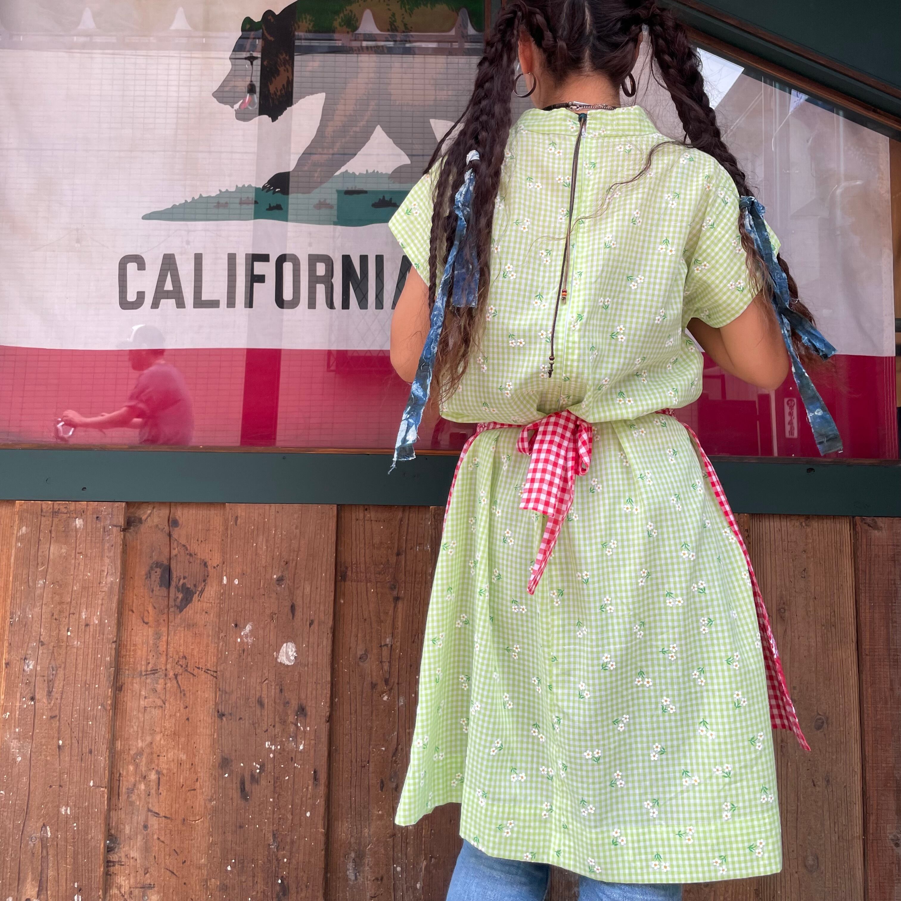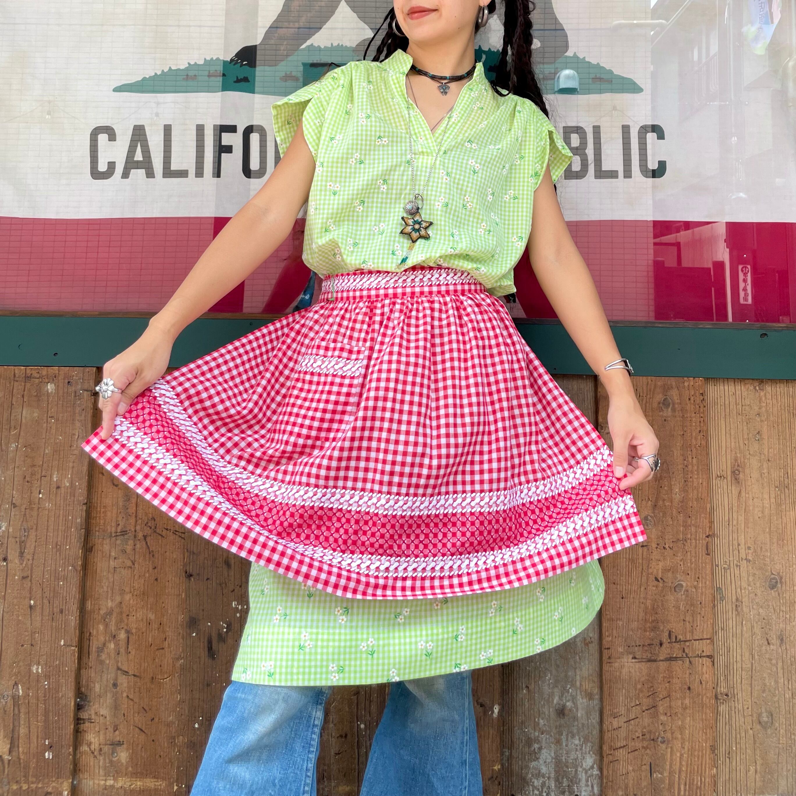 ギンガムチェックの柄に合わせてハンドクロスステッチが施されていたり、山道テープを手縫いで固定していたり、とても手が混んでいてかわいい一枚です。