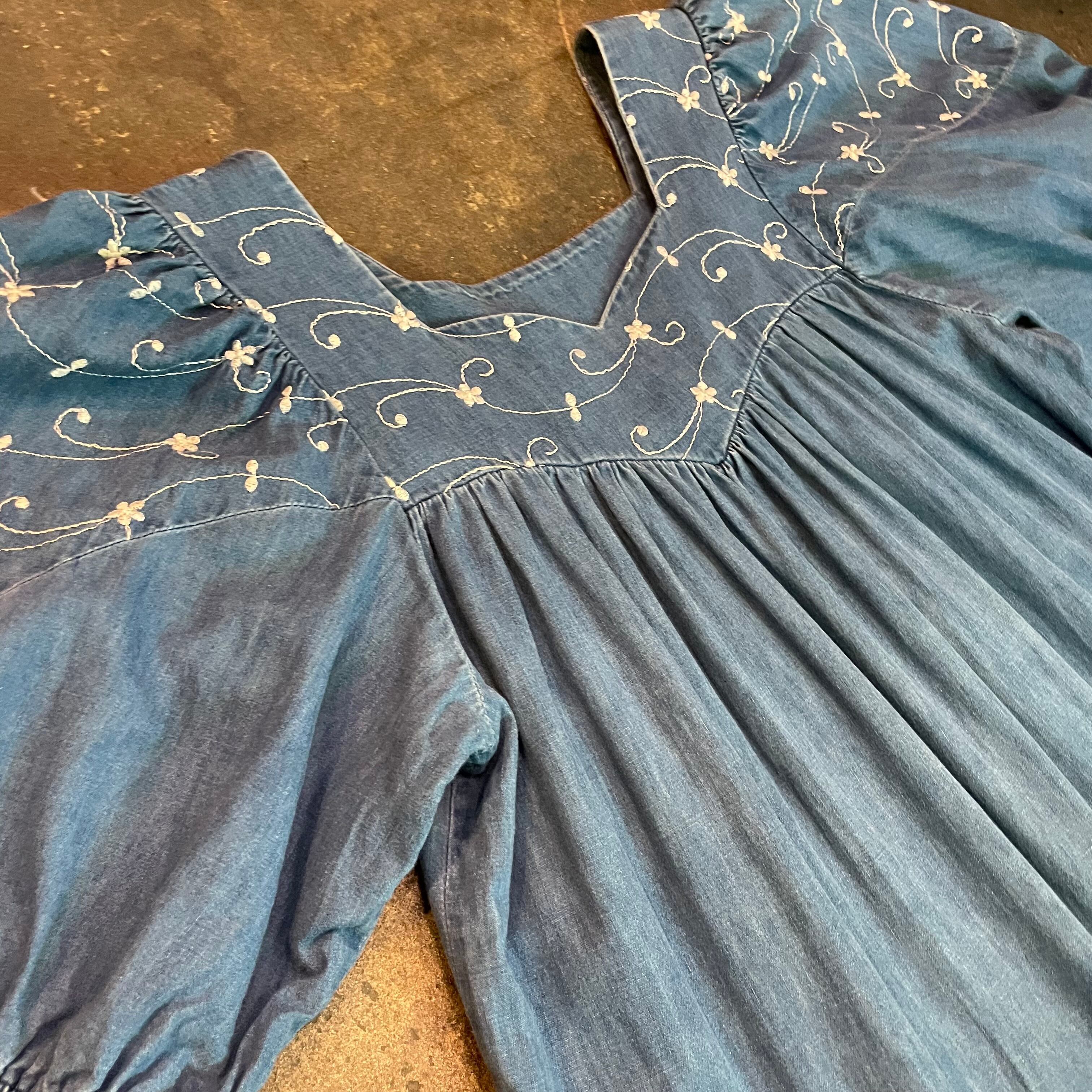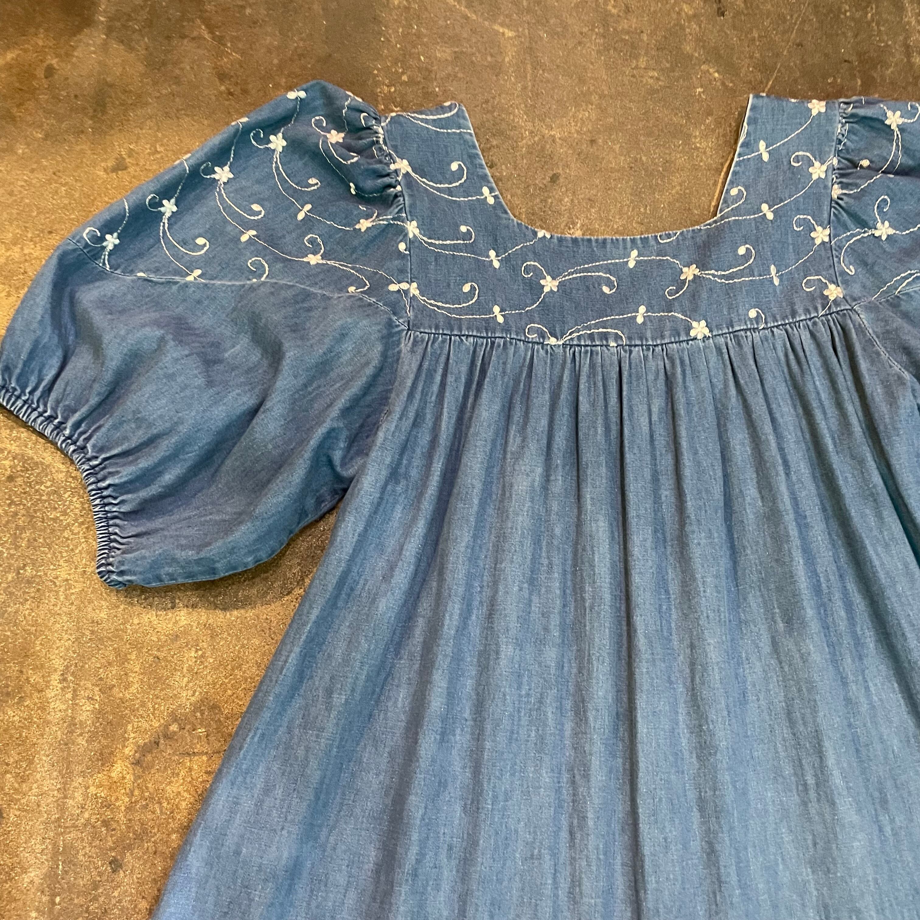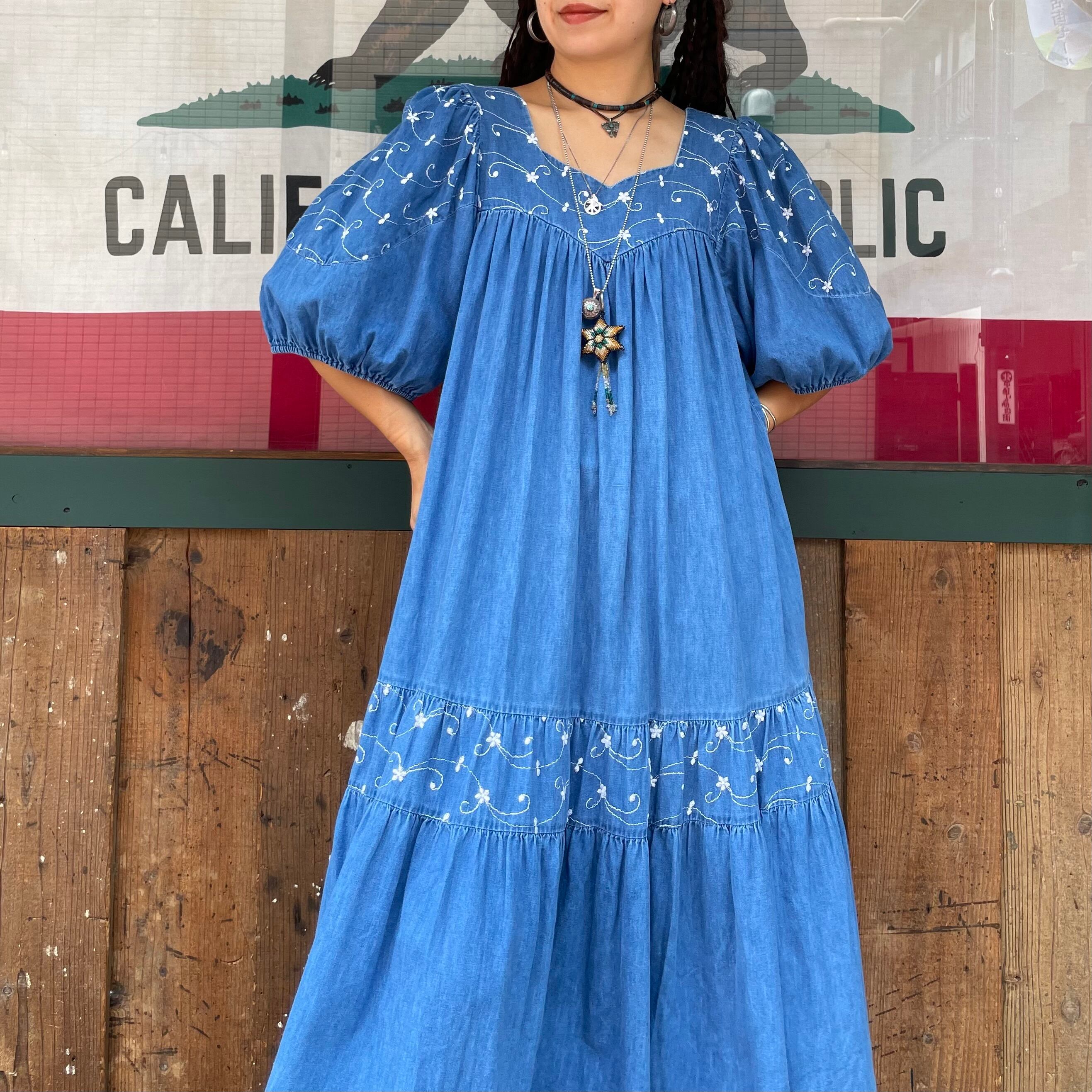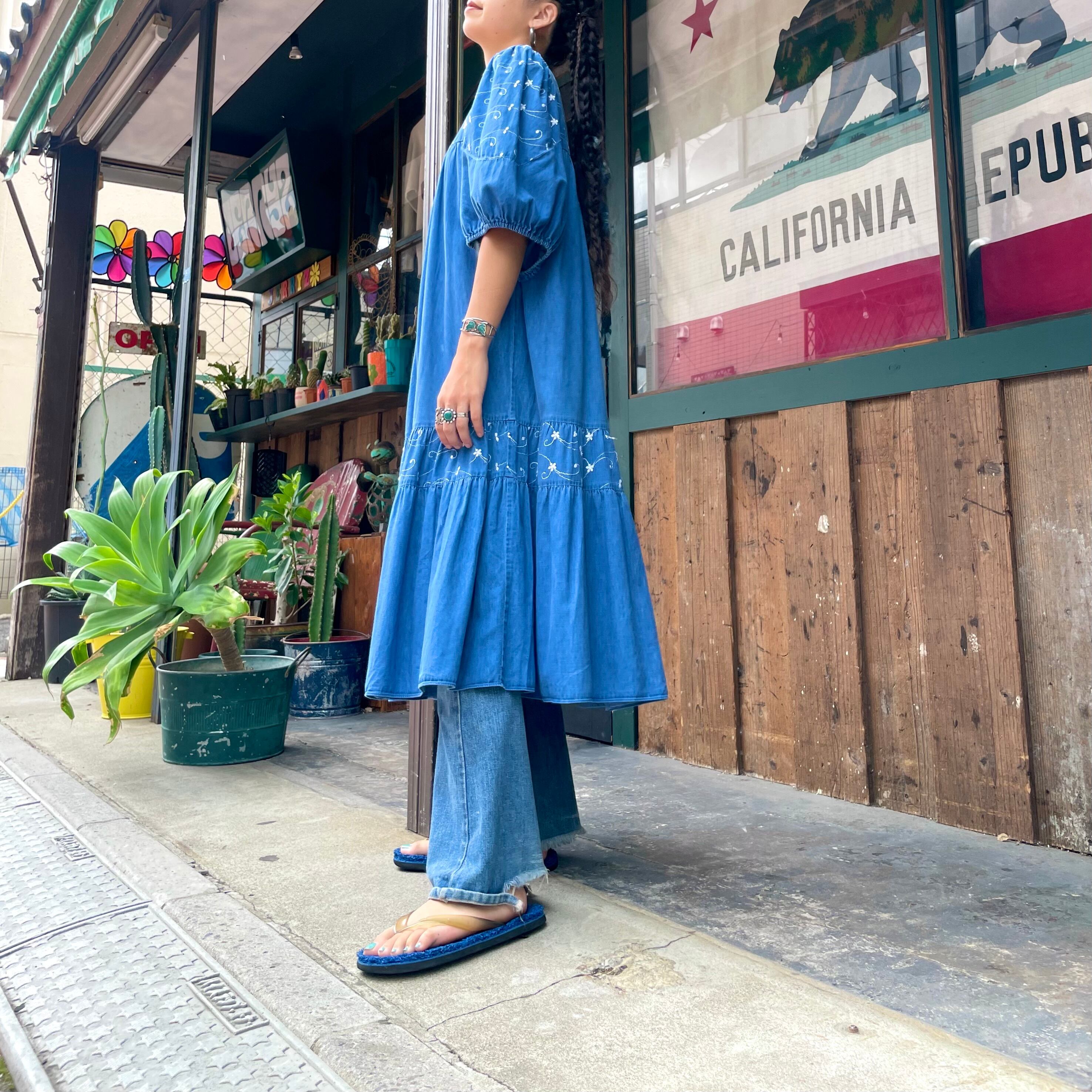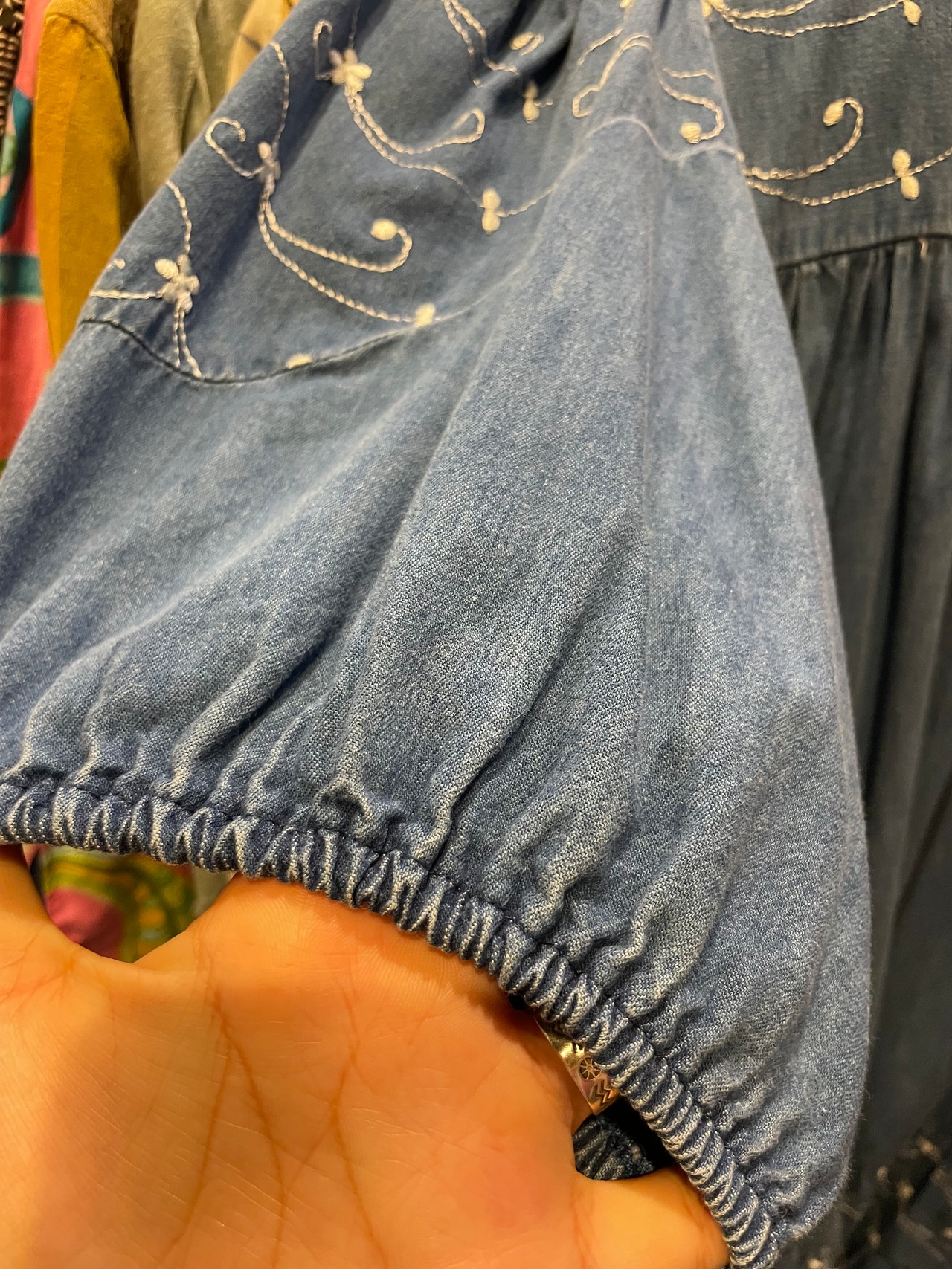 薄めの色味のデニムが柔らかい雰囲気のワンピースです。ポワッと大きめなパフスリーブが印象的でかわいいですし、とても大きなパフスリーブなので可愛らしくなり過ぎず、ゆるっとした雰囲気もあってかわいいと思います。