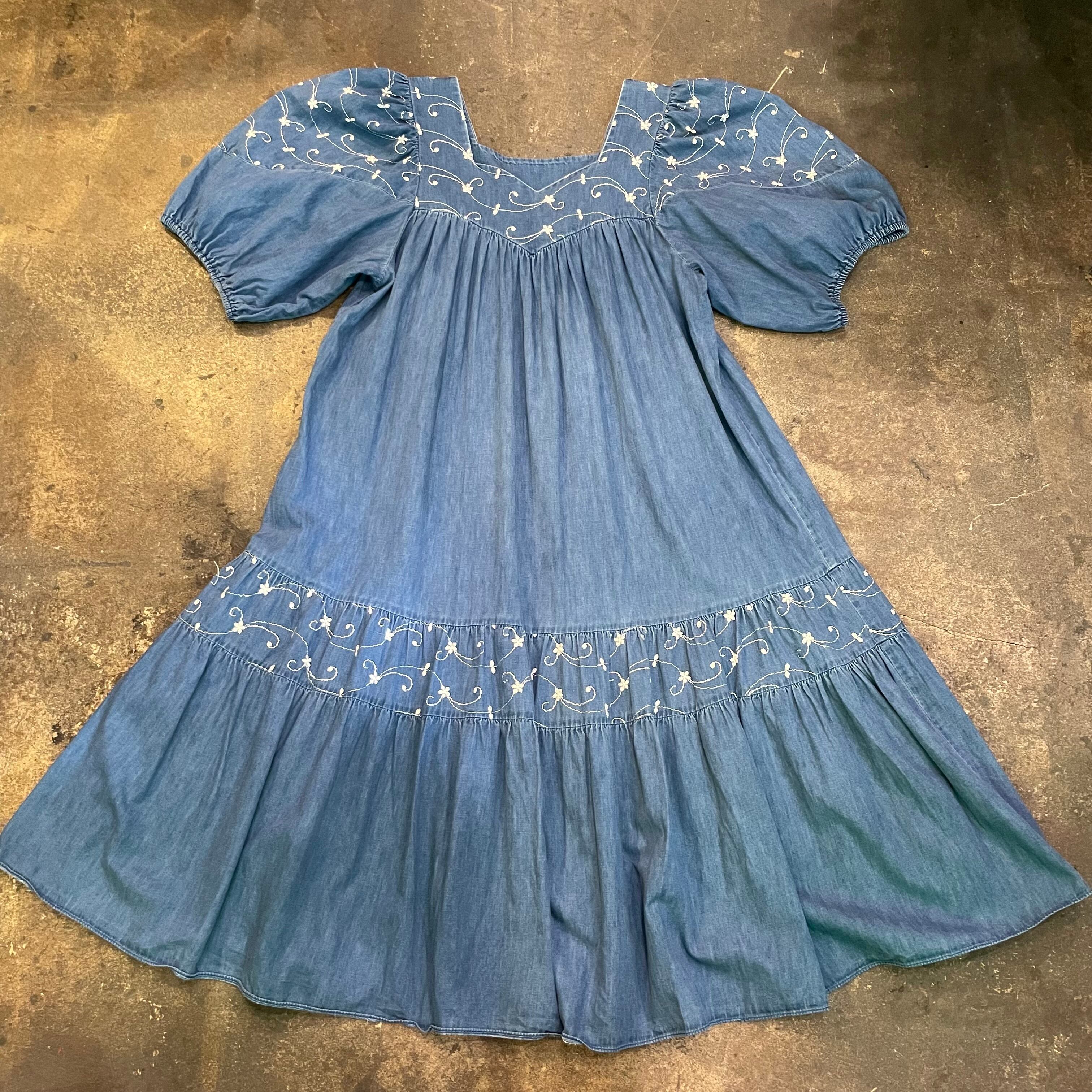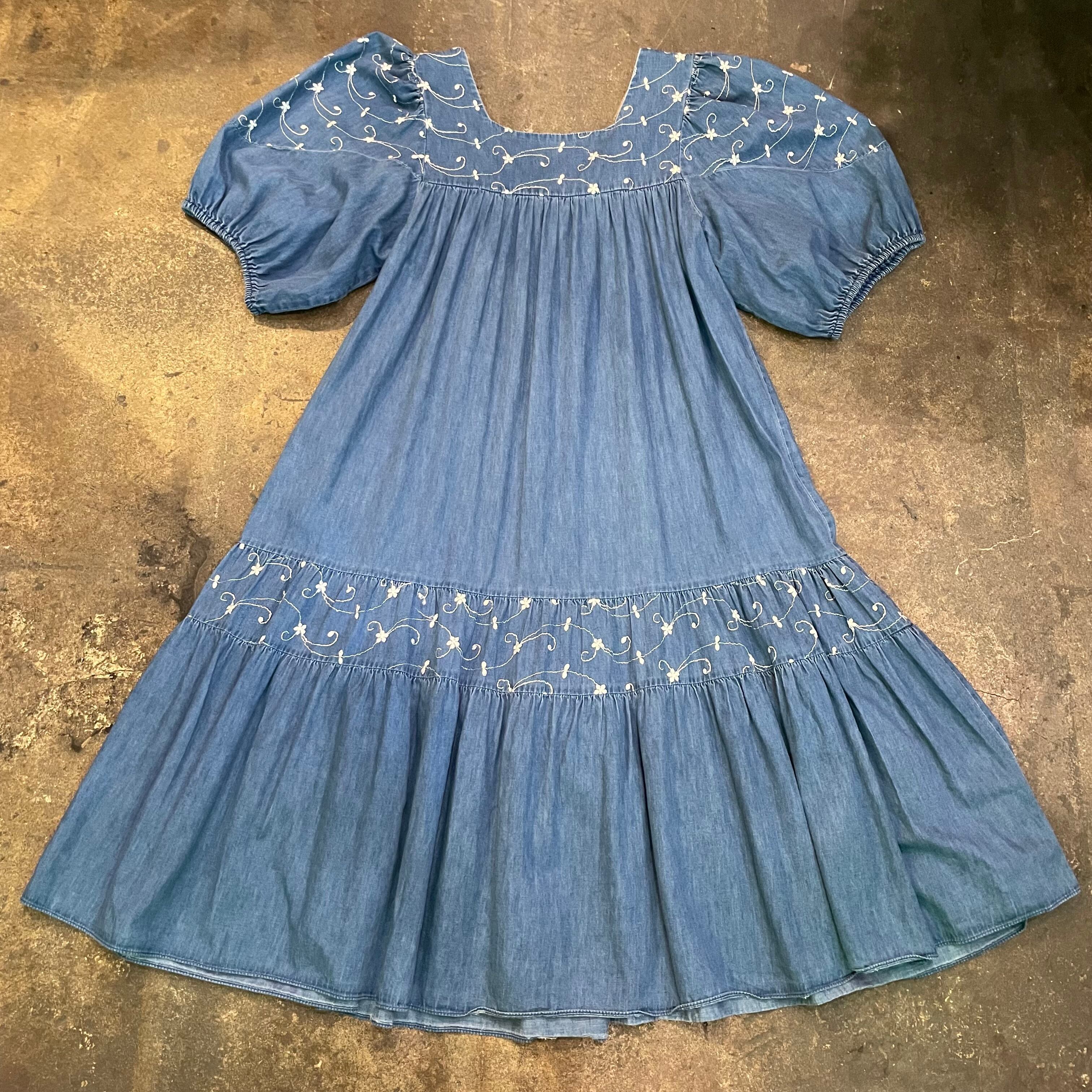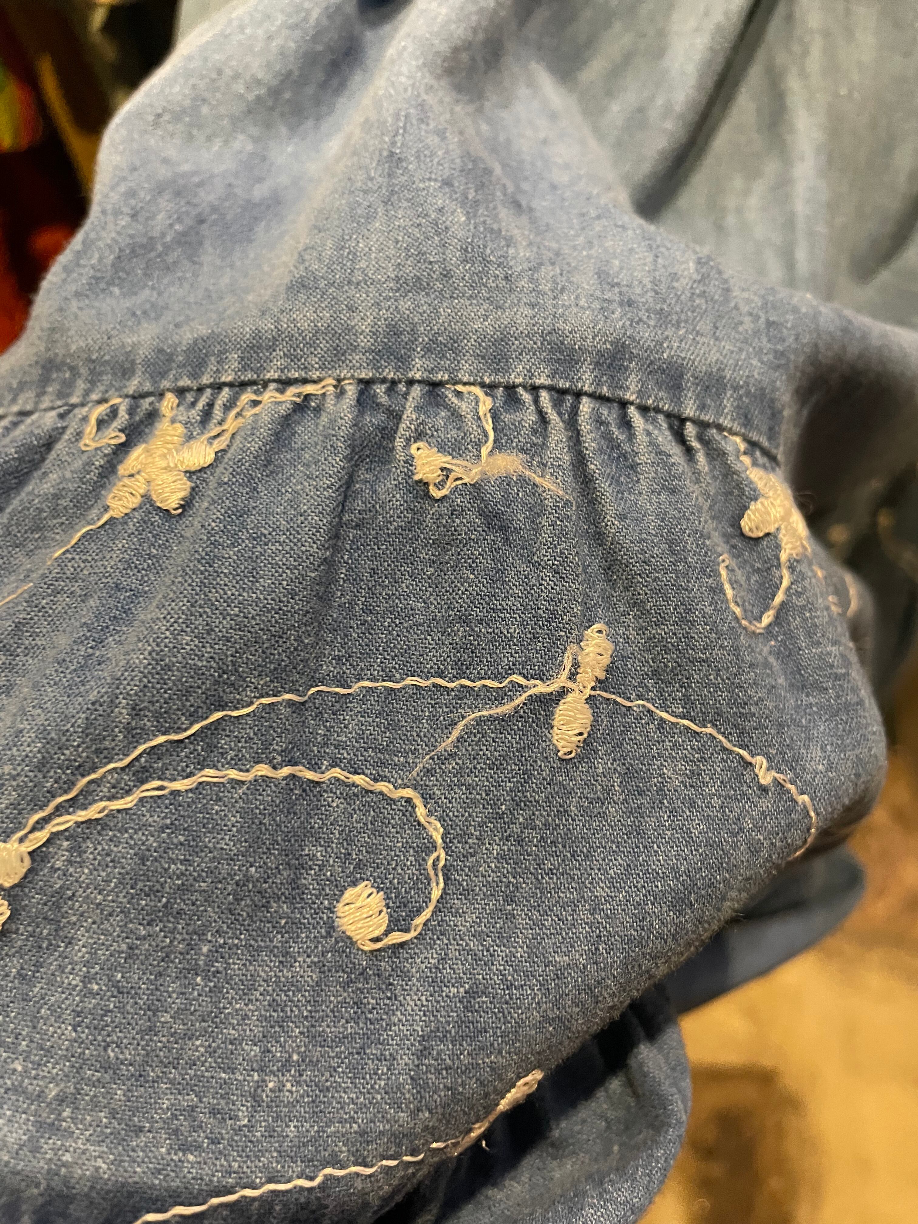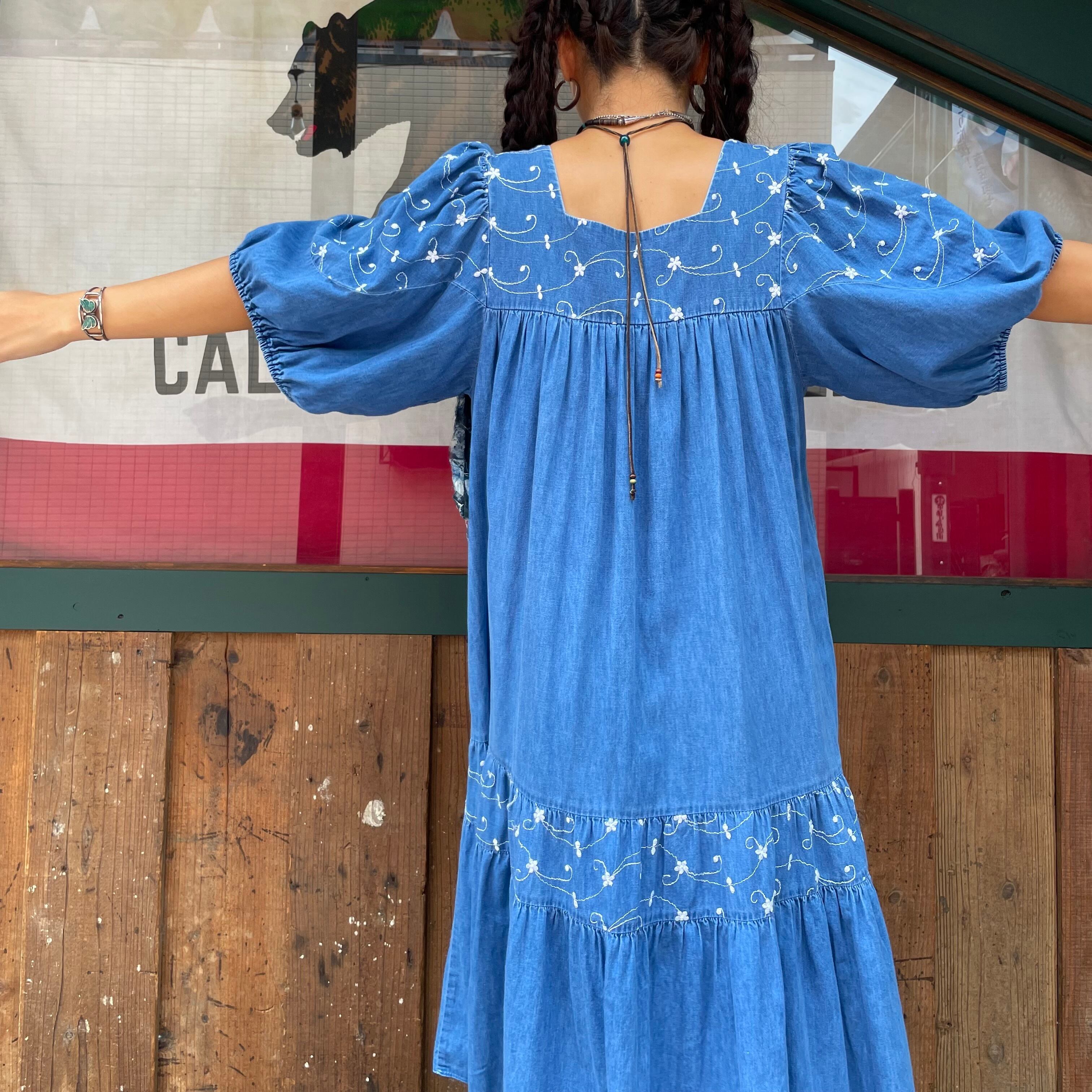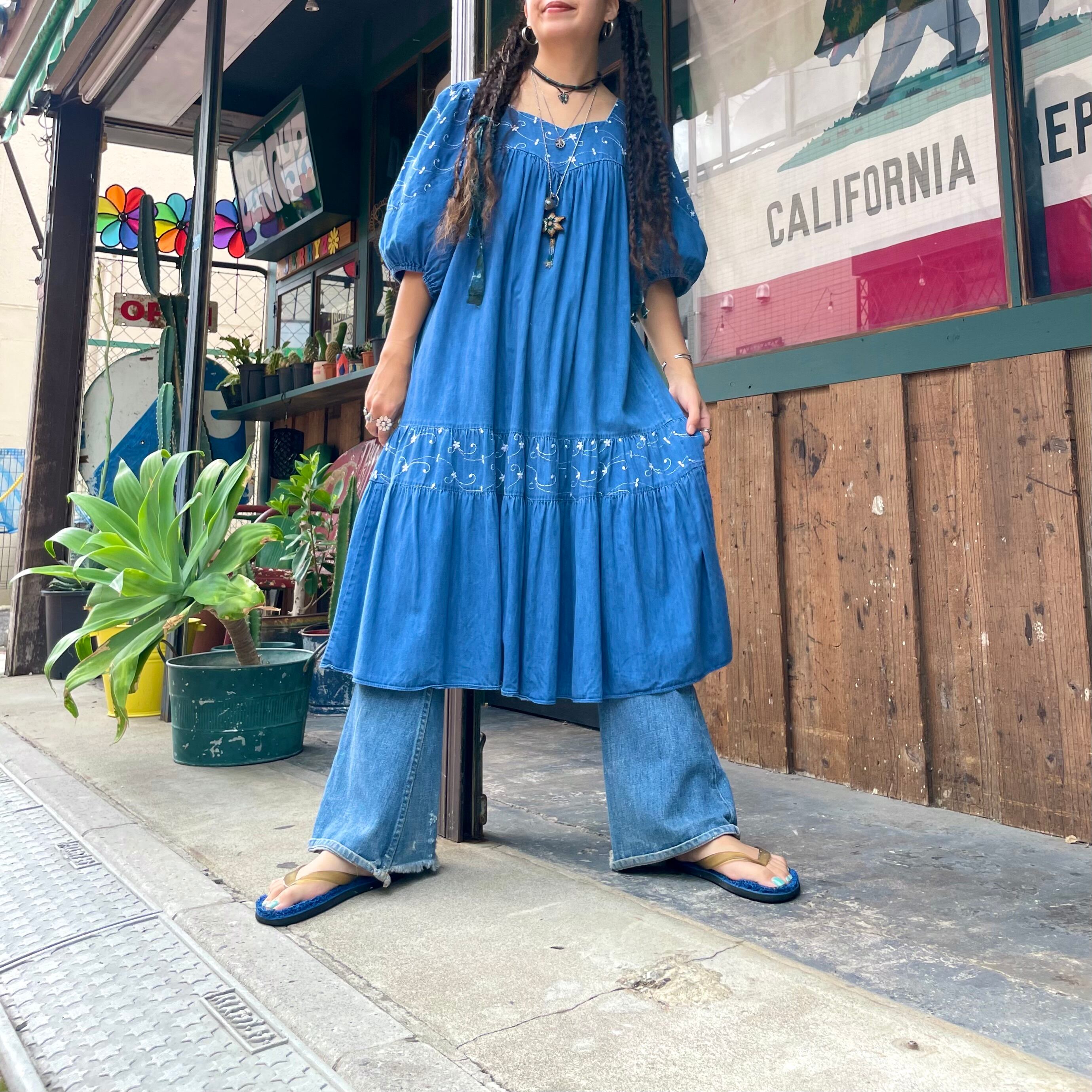 薄めの色味のデニムが柔らかい雰囲気のワンピースです。ポワッと大きめなパフスリーブが印象的でかわいいですし、とても大きなパフスリーブなので可愛らしくなり過ぎず、ゆるっとした雰囲気もあってかわいいと思います。